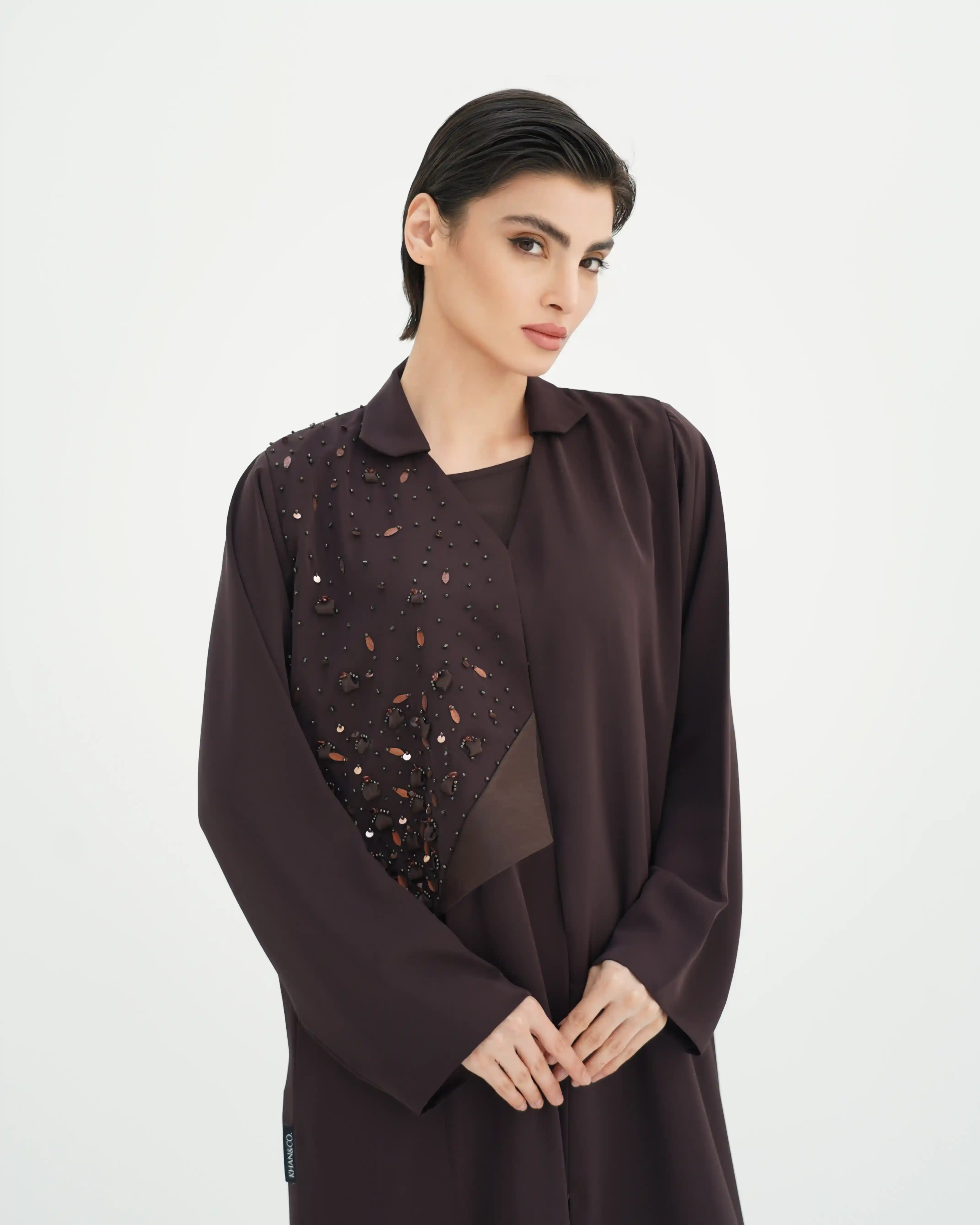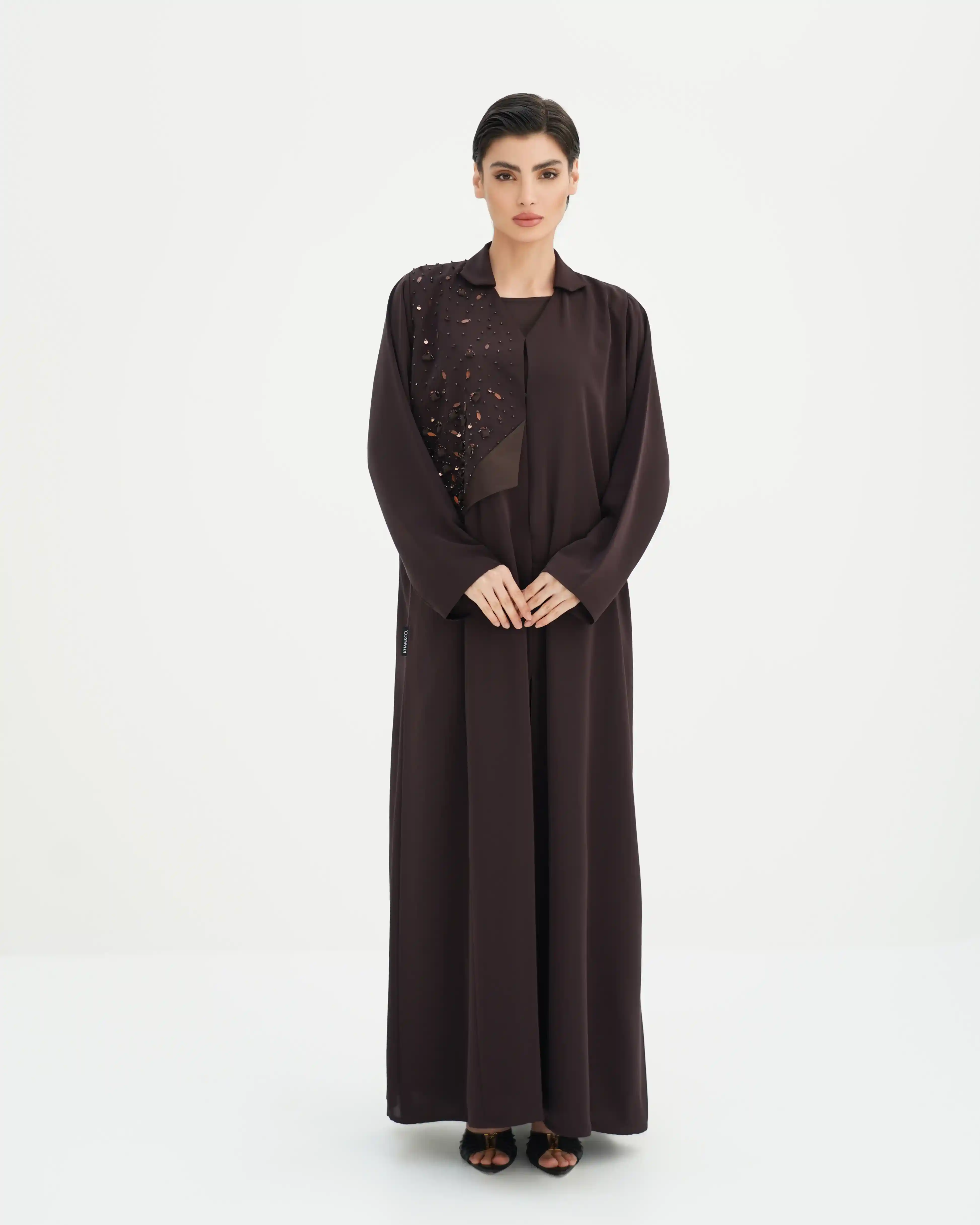 عباية تجسّد توازنًا دقيقًا بين الصفاء والبريق، بقصة انسيابية ناعمة تنسدل بخفة على القوام، من قماش البريميوم كريب تأتي بقصة رقبة متداخلة على شكل V ناعم تعزّز طول القوام، مع لوحة أمامية مشتغلة بتطريز يدوي من الخرز والترتر والكريستال وسيتان بتوزيع متدرّج يوحي ببريق تكون الألماس. الأكمام مستقيمة وهادئة لتوازن ثراء التفاصيل، مع طرحة من نفس لون العباية تنسدل بخفة وتكمّل الإطلالة بطابع فخم متزن. مشتغلة بالخرز وكرستال في طرف، هوية تعكس توقيع KHAN&CO المعاصر بروح دار أزياء عالمية.