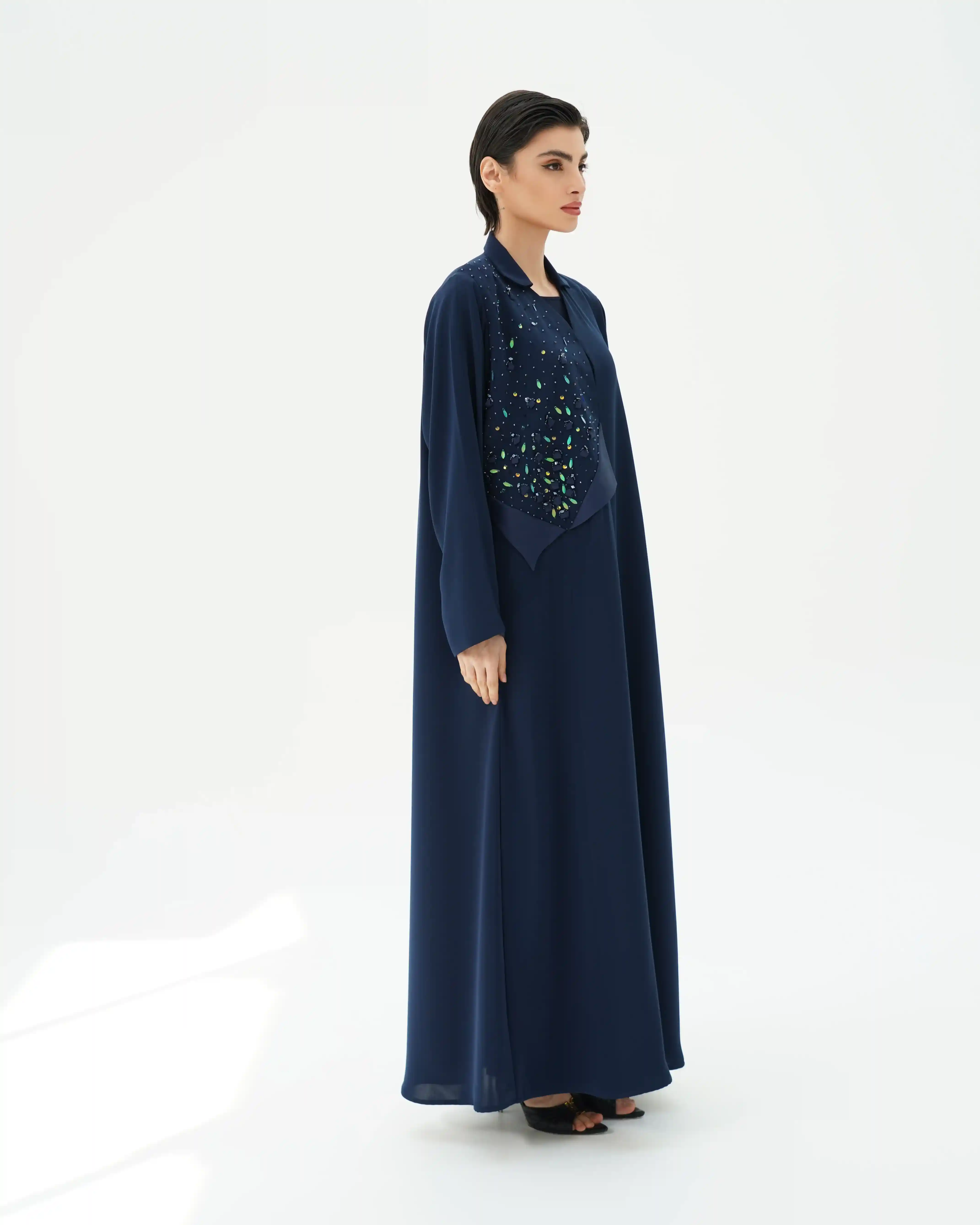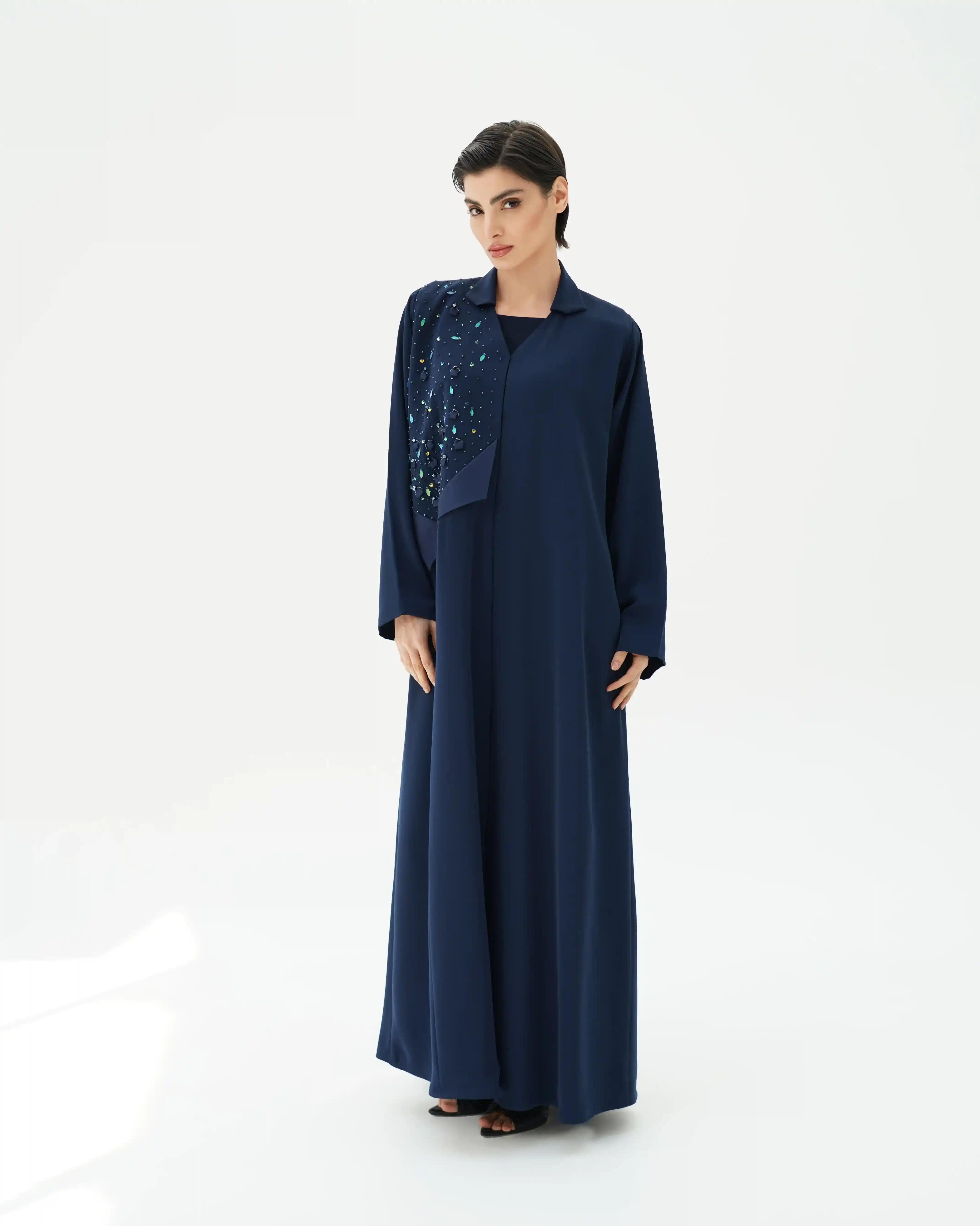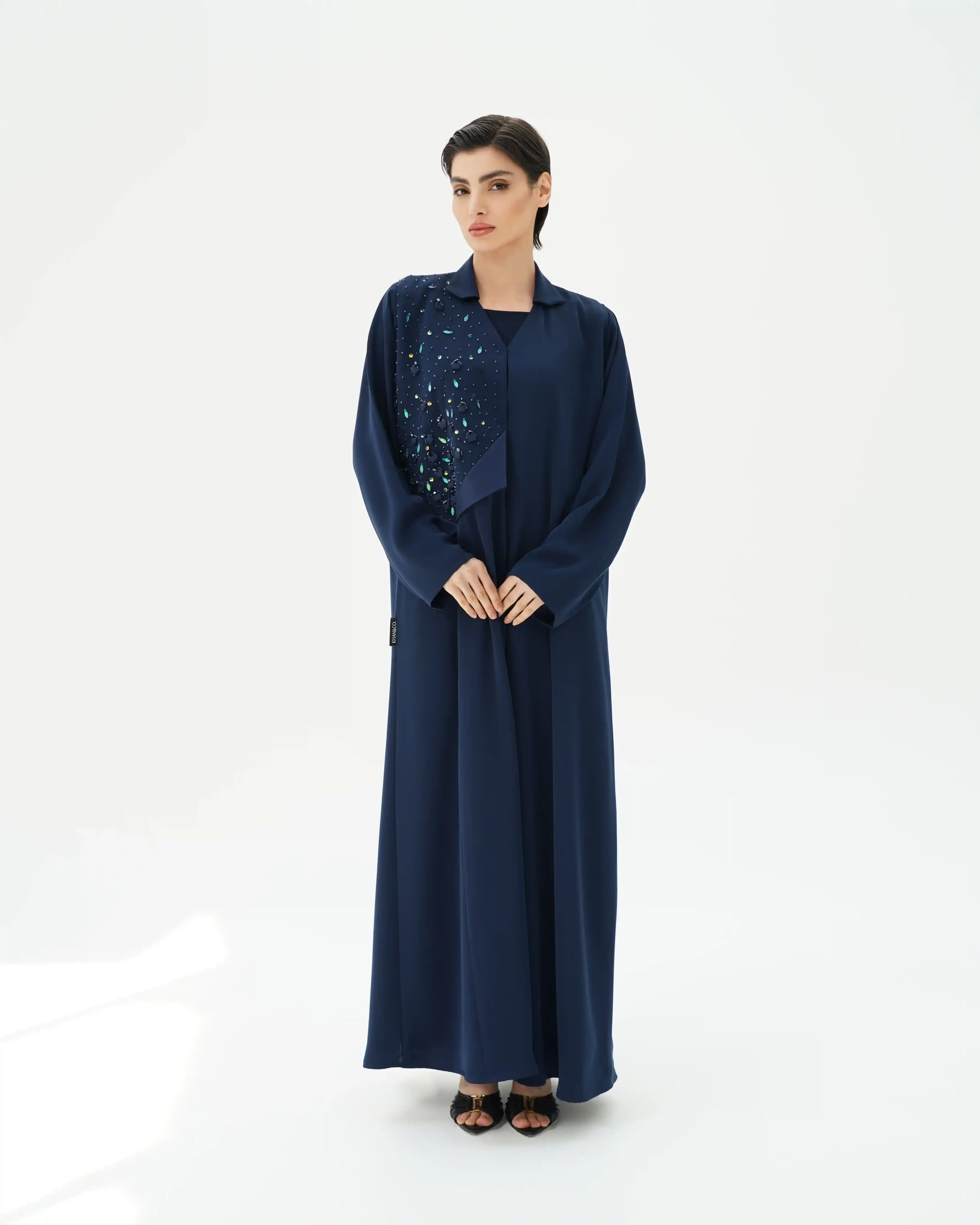 عباية تجسّد توازنًا دقيقًا بين الصفاء والبريق، بقصة انسيابية ناعمة تنسدل بخفة على القوام، من قماش البريميوم كريب تأتي بقصة رقبة متداخلة على شكل V ناعم تعزّز طول القوام، مع لوحة أمامية مشتغلة بتطريز يدوي من الخرز والترتر والكريستال وسيتان بتوزيع متدرّج يوحي ببريق تكون الألماس. الأكمام مستقيمة وهادئة لتوازن ثراء التفاصيل، مع طرحة من نفس لون العباية تنسدل بخفة وتكمّل الإطلالة بطابع فخم متزن. مشتغلة بالخرز وكرستال في طرف، هوية تعكس توقيع KHAN&CO المعاصر بروح دار أزياء عالمية.