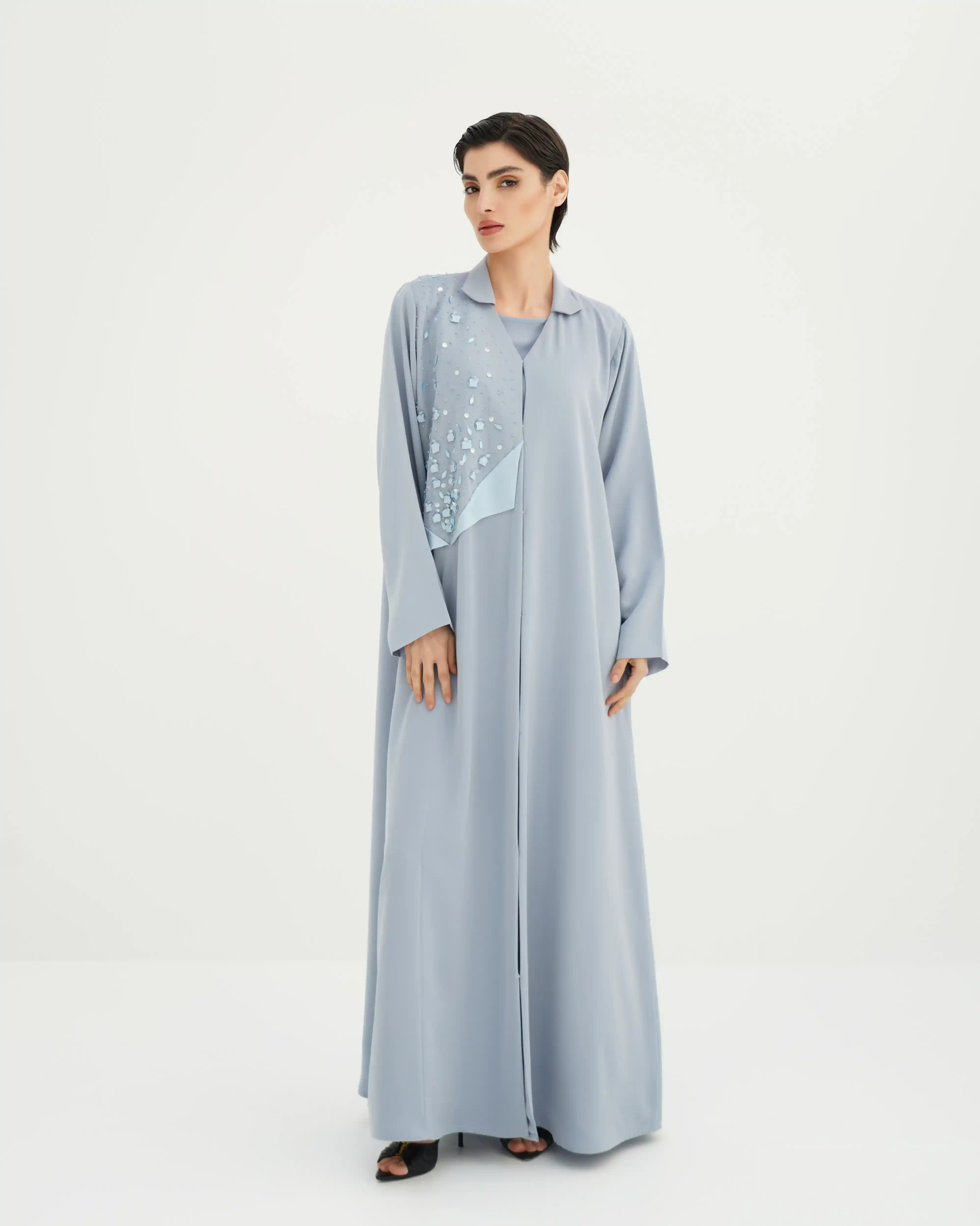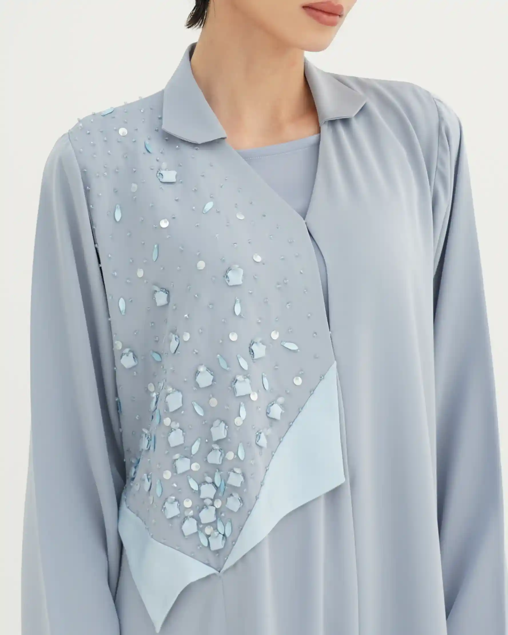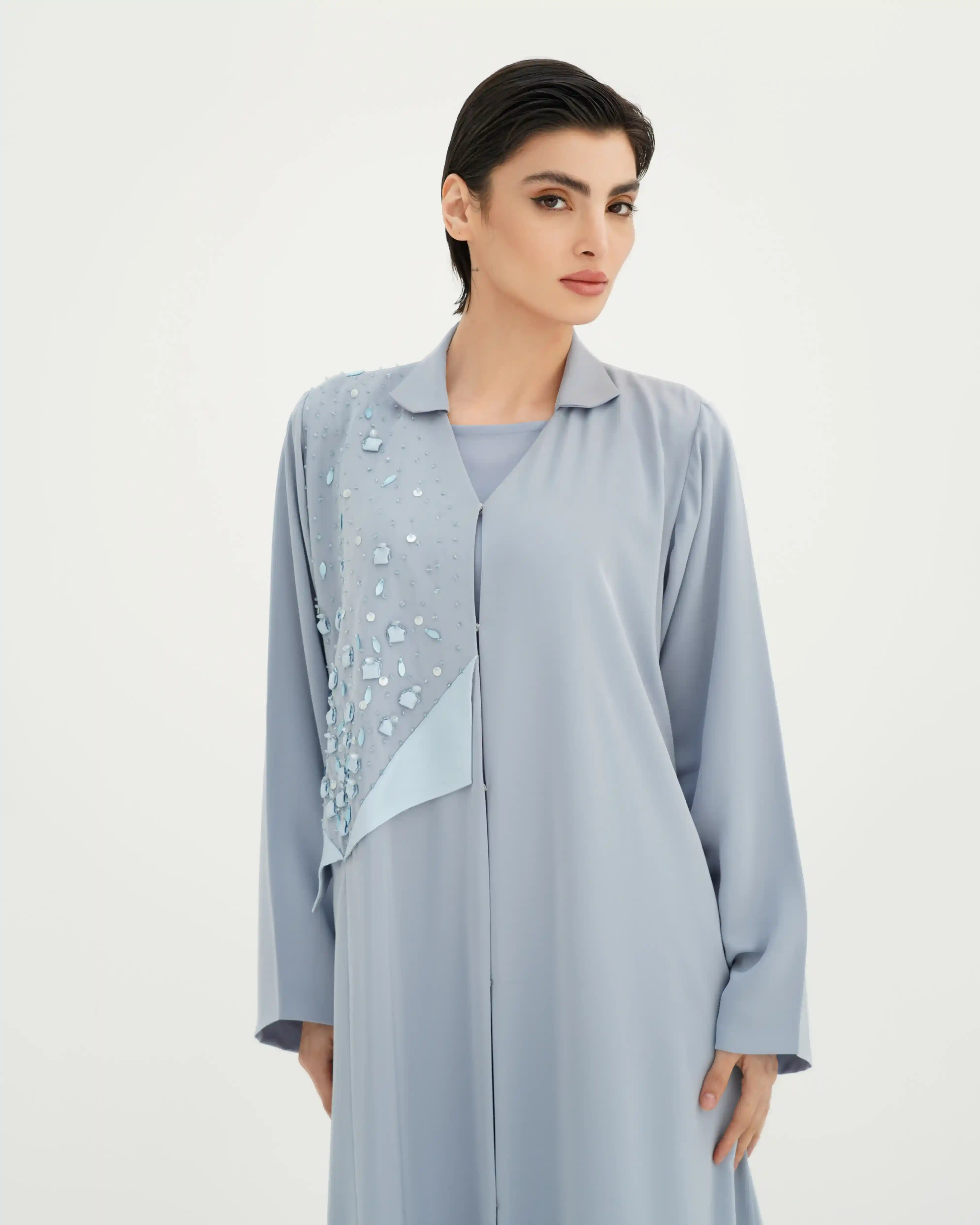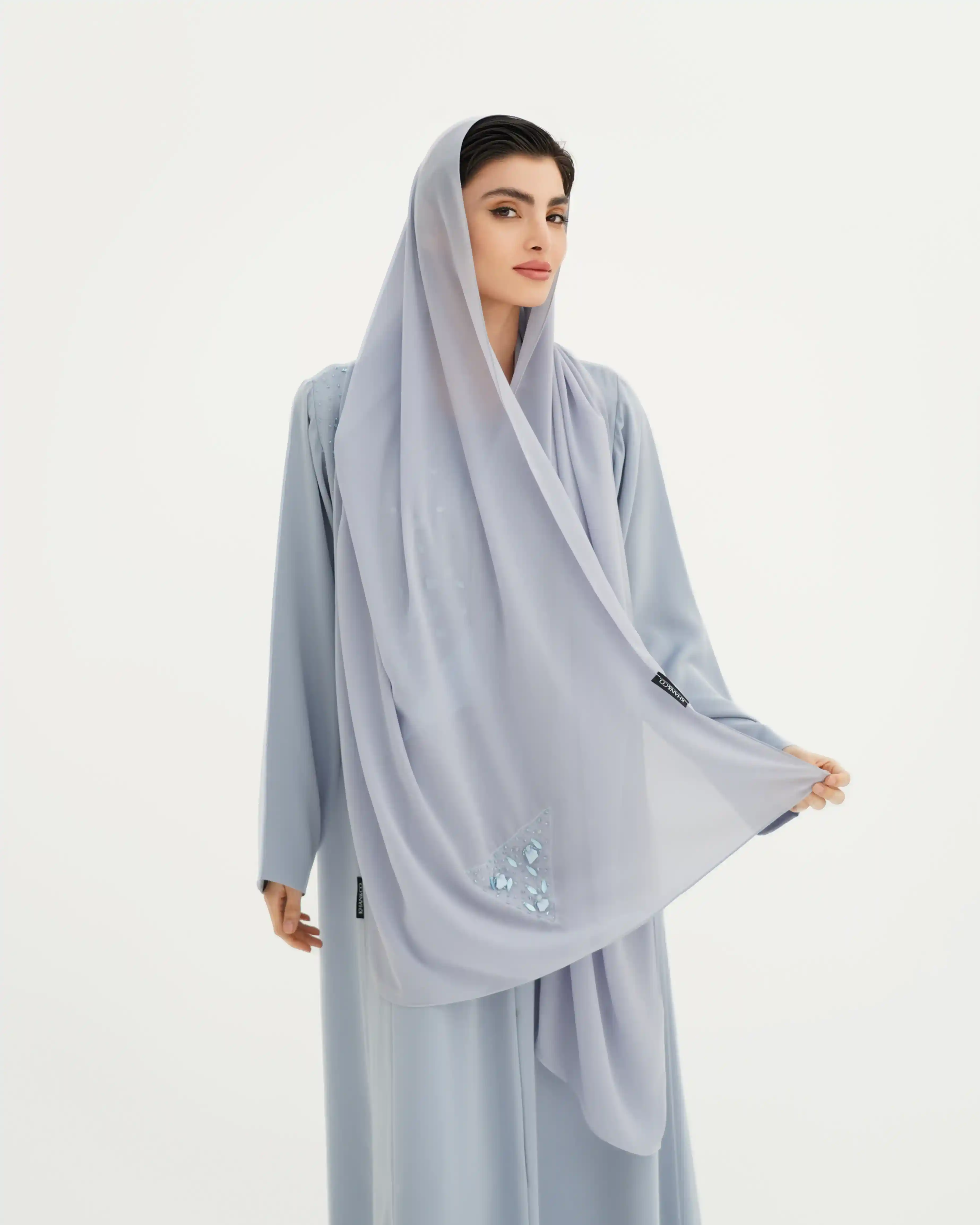 عباية تجسّد توازنًا دقيقًا بين الصفاء والبريق، بقصة انسيابية ناعمة تنسدل بخفة على القوام، من قماش البريميوم كريب تأتي بقصة رقبة متداخلة على شكل V ناعم تعزّز طول القوام، مع لوحة أمامية مشتغلة بتطريز يدوي من الخرز والترتر والكريستال وسيتان بتوزيع متدرّج يوحي ببريق تكون الألماس. الأكمام مستقيمة وهادئة لتوازن ثراء التفاصيل، مع طرحة من نفس لون العباية تنسدل بخفة وتكمّل الإطلالة بطابع فخم متزن. مشتغلة بالخرز وكرستال في طرف، هوية تعكس توقيع KHAN&CO المعاصر بروح دار أزياء عالمية.
