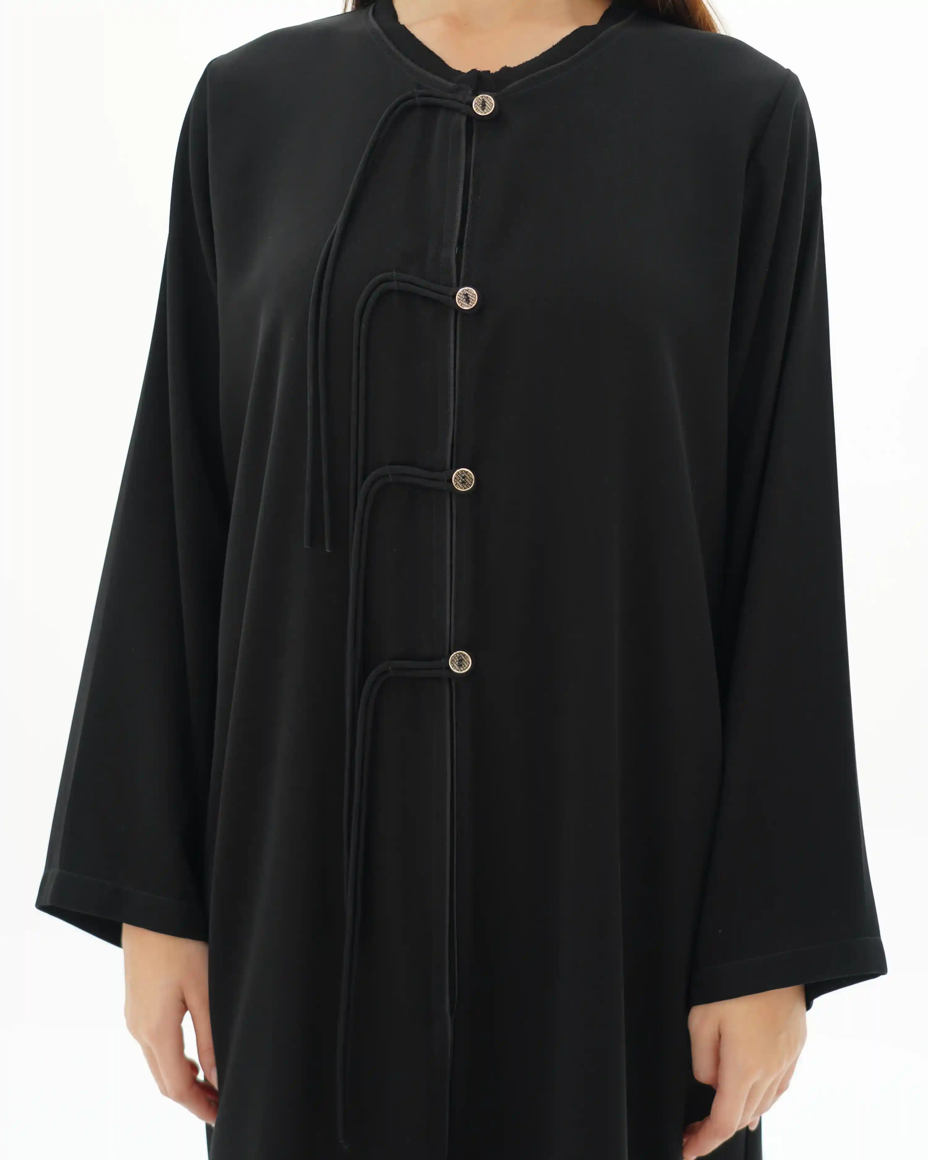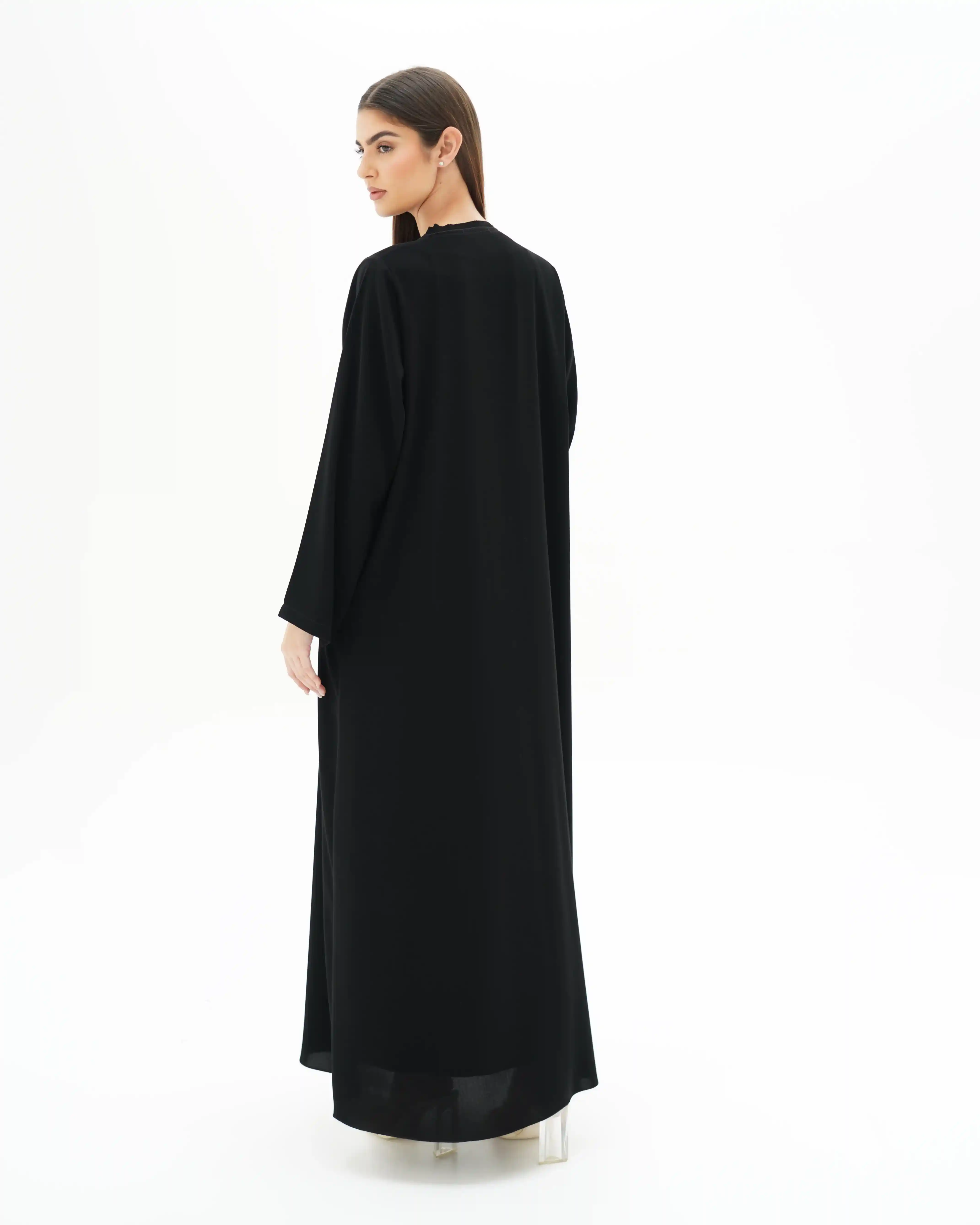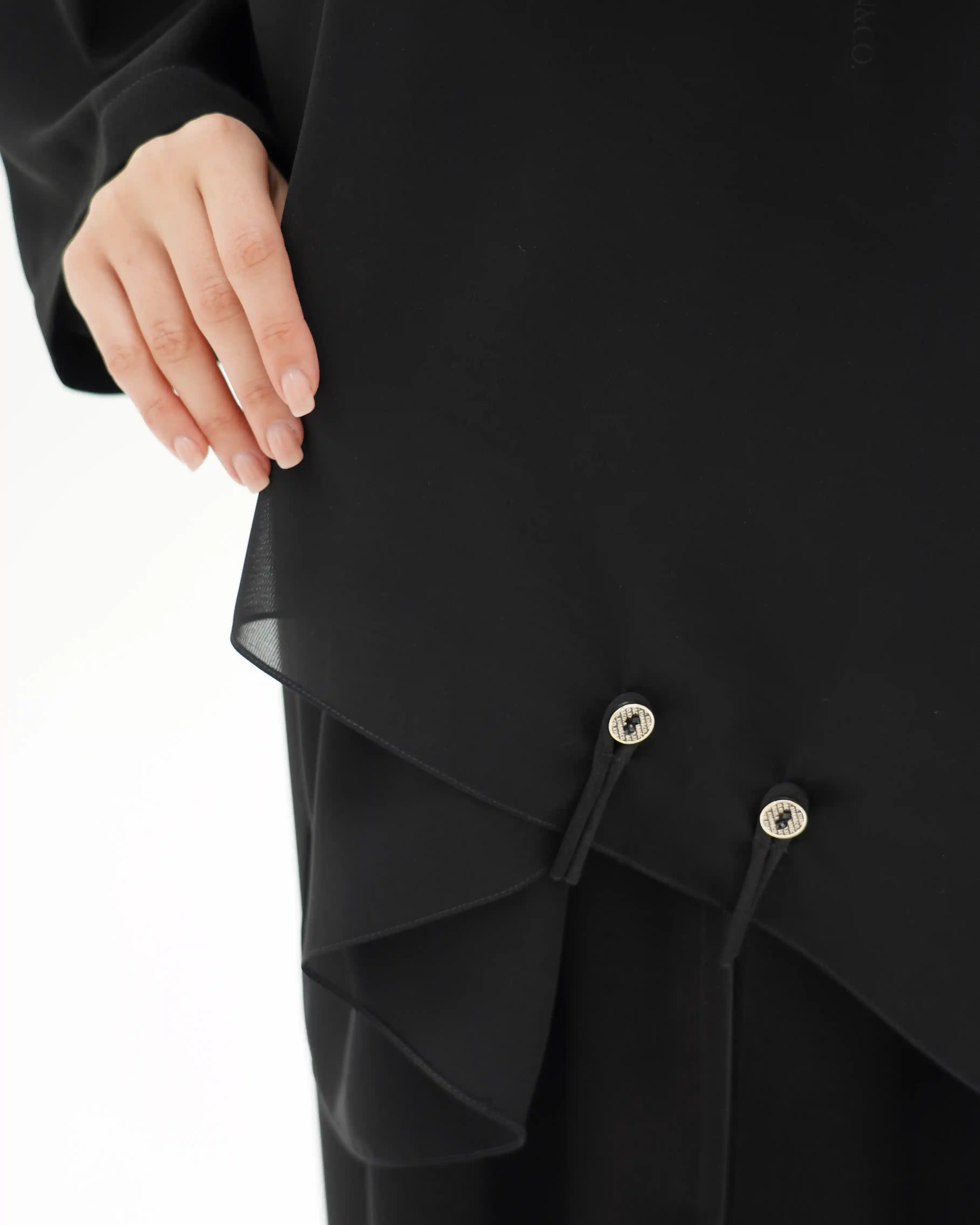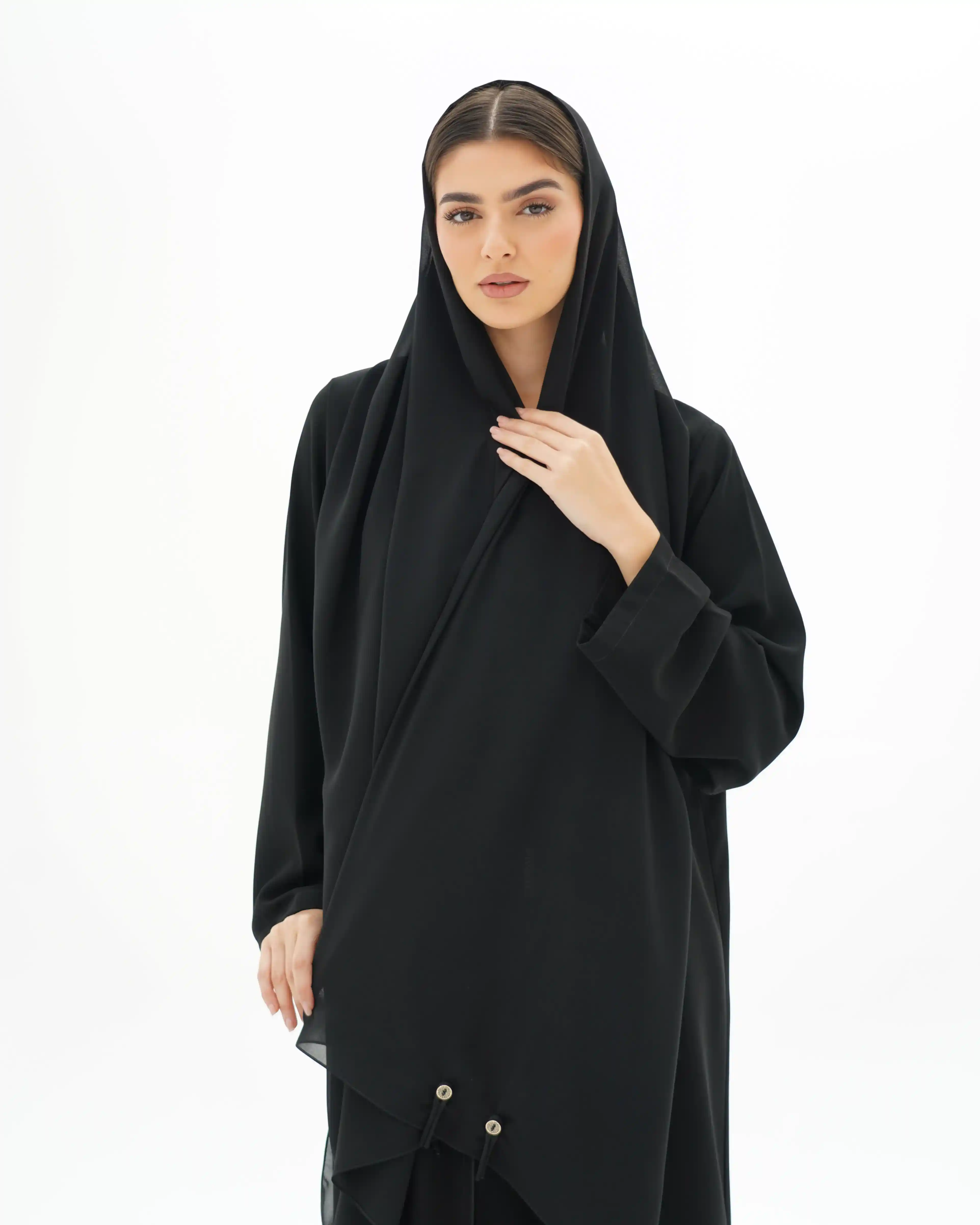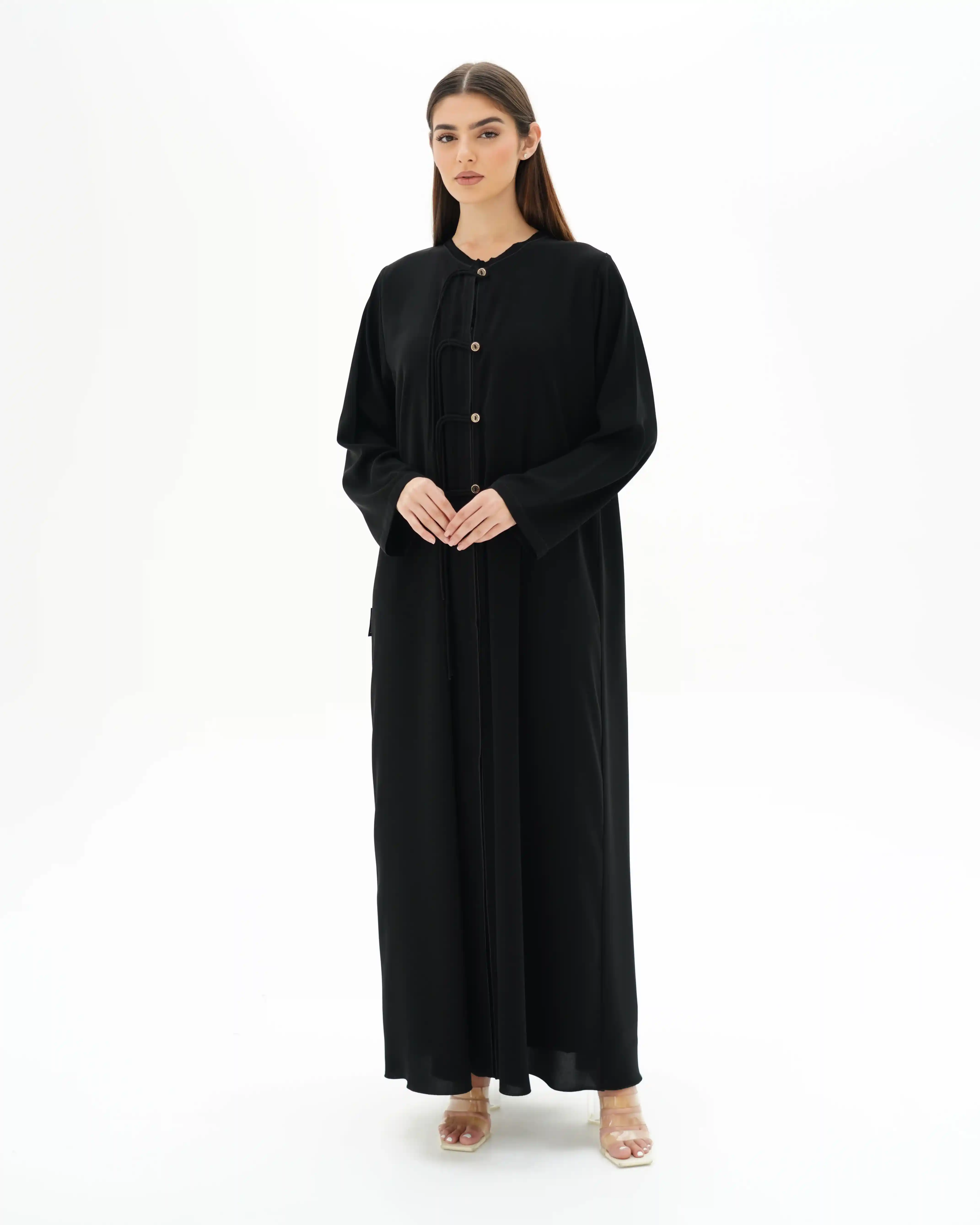 عباية بقصّة مستقيمة منسدلة، من قماش سلكتف كريب بملمس ناعم وانسيابية متزنة. يأتي الإغلاق الأمامي بطقطق مخفي بالكامل ليحافظ على نقاء الخط البصري، بينما تبرز ثلاث أزرار ذهبية صغيرة تحمل شعار .KHAN&CO لوتمنح القطعة إحساس الربط اليدوي القديم. إغلاق بتفصيل نصف عقدة من شريط منسدل يشبك بأسلوب أنيق، مضيفًا بعدًا بصريًا مبتكرًا يوازن بين البساطة والتميّز. الياقة السادة محددة بحواف بارزة وخياطة محكمه تمتد بانسياب على طول الخط الأمامي المستقيم, في انسجام يعكس دقة التفاصيل. تكتمل الإطلالة بطرحة متناغمة مزدانة بشريط إغلاق مبتكر يتوسطه زران ذهبيان يحملان شعار .KHAN&CO، ليمنحا الطقم طابعًا استثنائيًا متكاملًا. تصميم يعبّر عن التوازن بين الأناقة الفائقة والبساطة المطلوبة، بروح معاصرة وهوية واضحة.