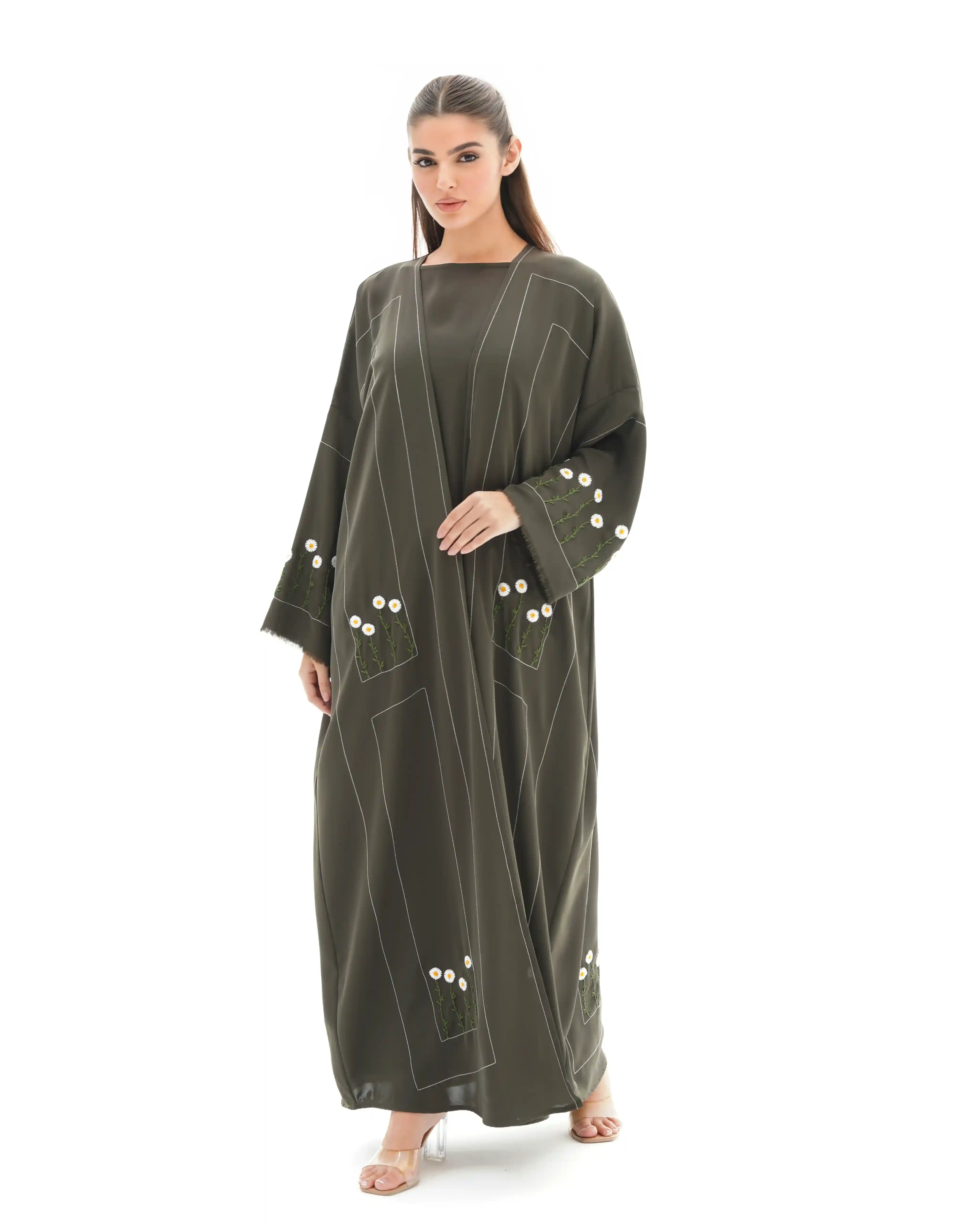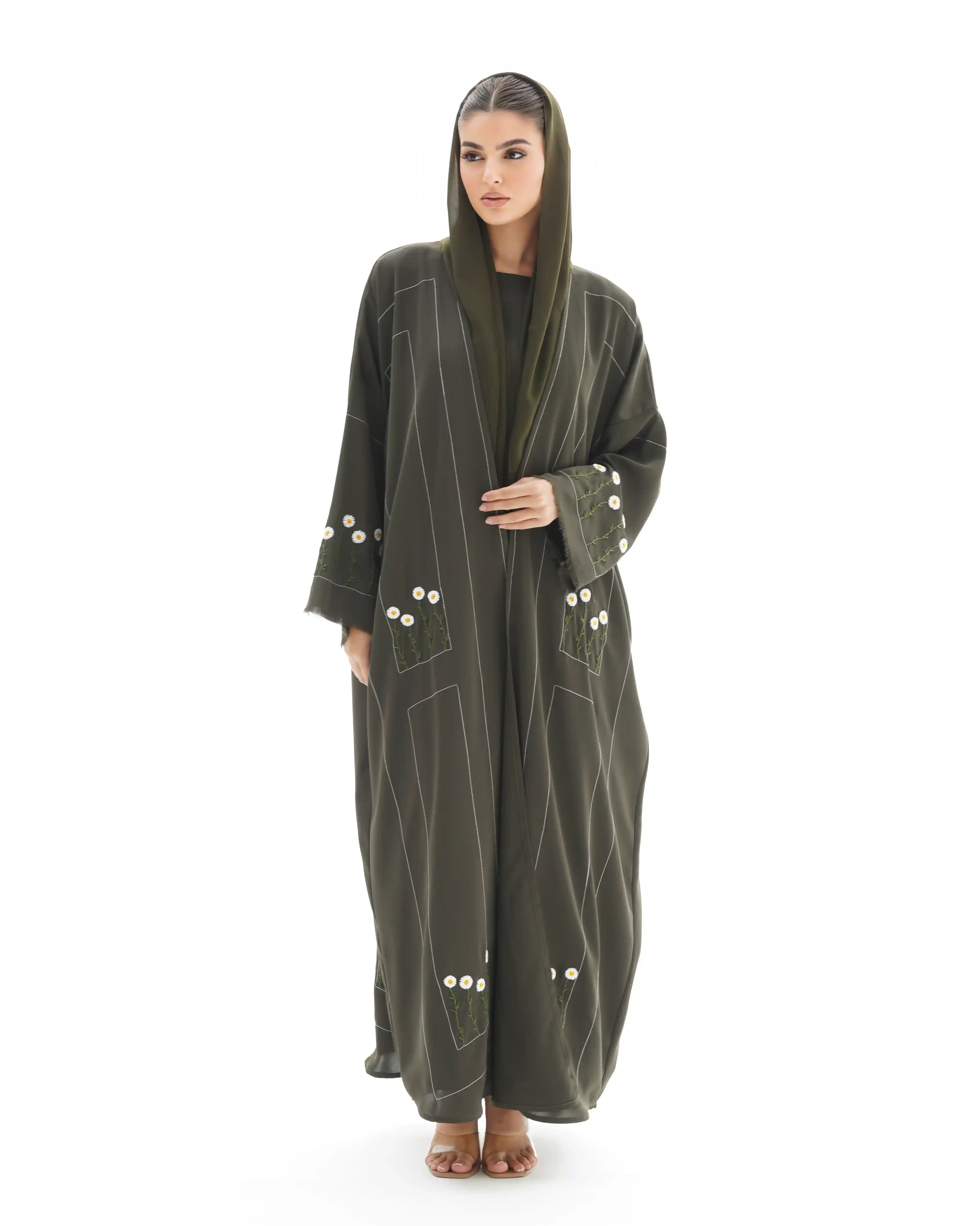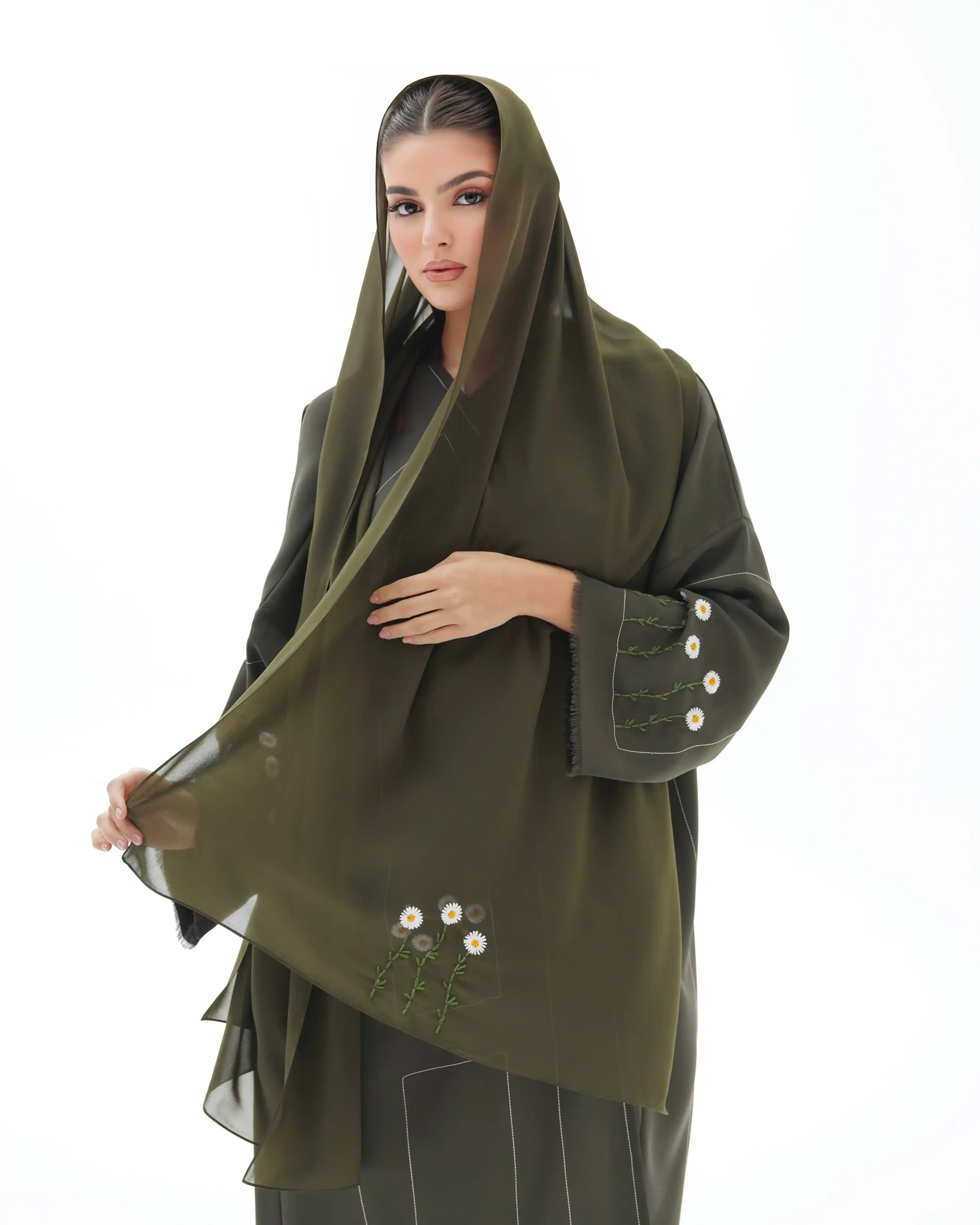 صممت هذه العباية من قماش الكريب الناعم للتمتع بإطلالة مريحة وخفيفة ولتنسجم مع تصميم ازهار الكاموميل الناعمة والمطرزة داخل مربعات هندسية مدروزة بخيط باللون الابيض لتضفي على التصميم دمج بين التصاميم الهندسية  وتصاميم الازهار والتصاميم المشجرة في تصميم واحد.. اما القصة فقد تم تصميمها  بدون طقطق وواسعة عند الصدر لتعطي مساحة قماش كافية ليتم لفها بشكل ساتر وانيق وام اضافة فستان داخلي هدية.