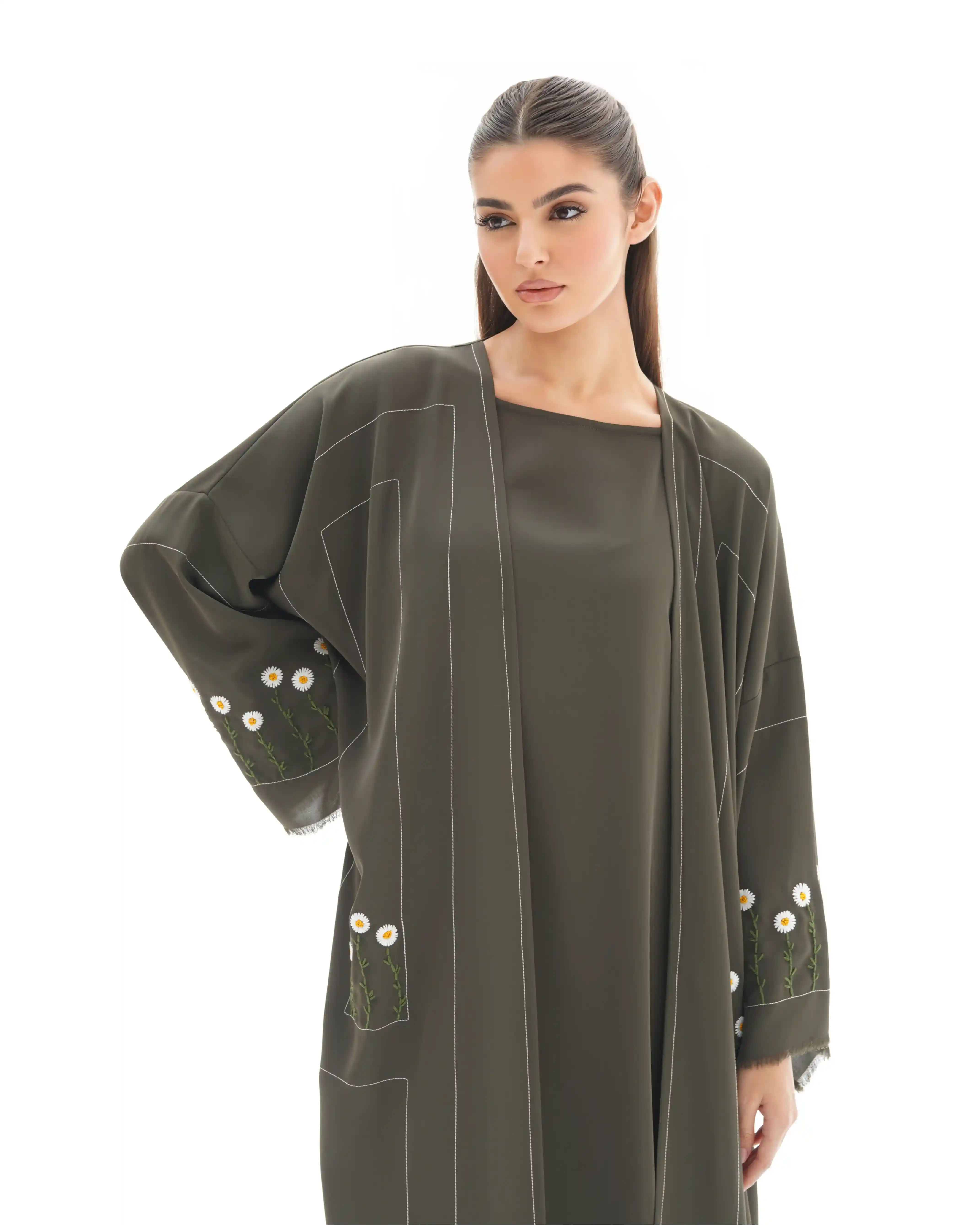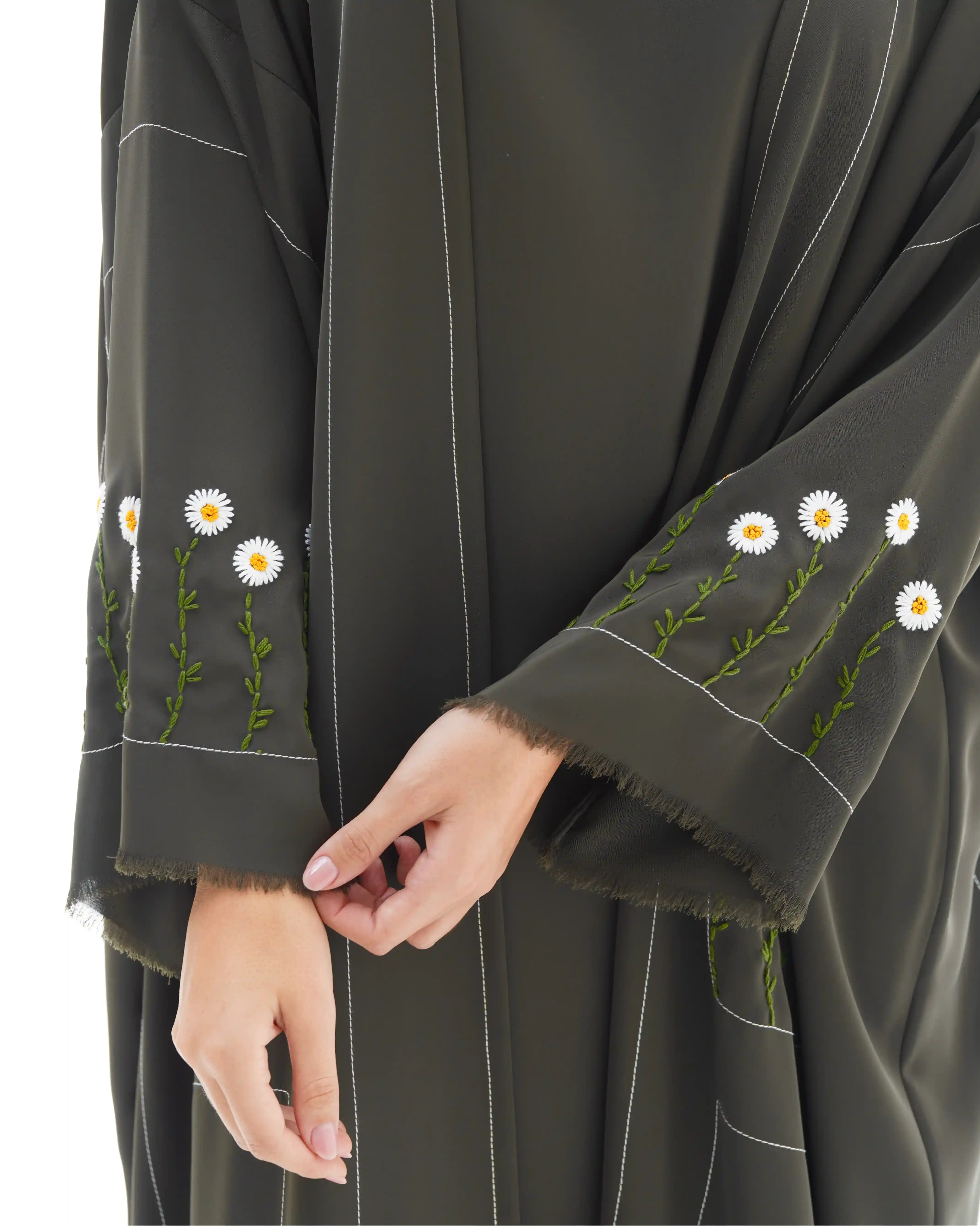 • أكمام واسعة، نبنهاية مزوّدة بحافة مشذبة خفيفة وتطريز ازهار الكاموميل في كامل العباية.