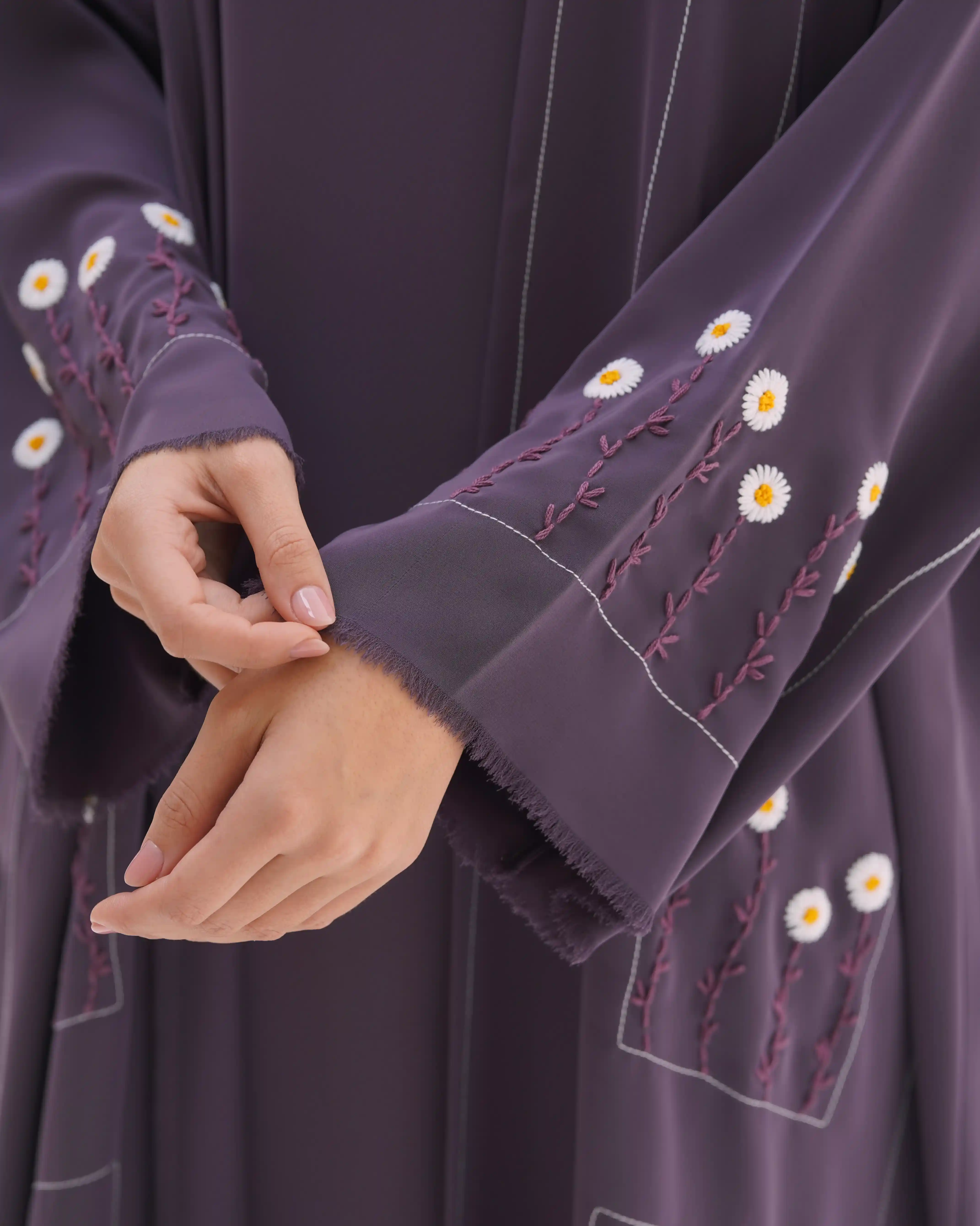 • أكمام واسعة، نبنهاية مزوّدة بحافة مشذبة خفيفة وتطريز ازهار الكاموميل في كامل العباية.