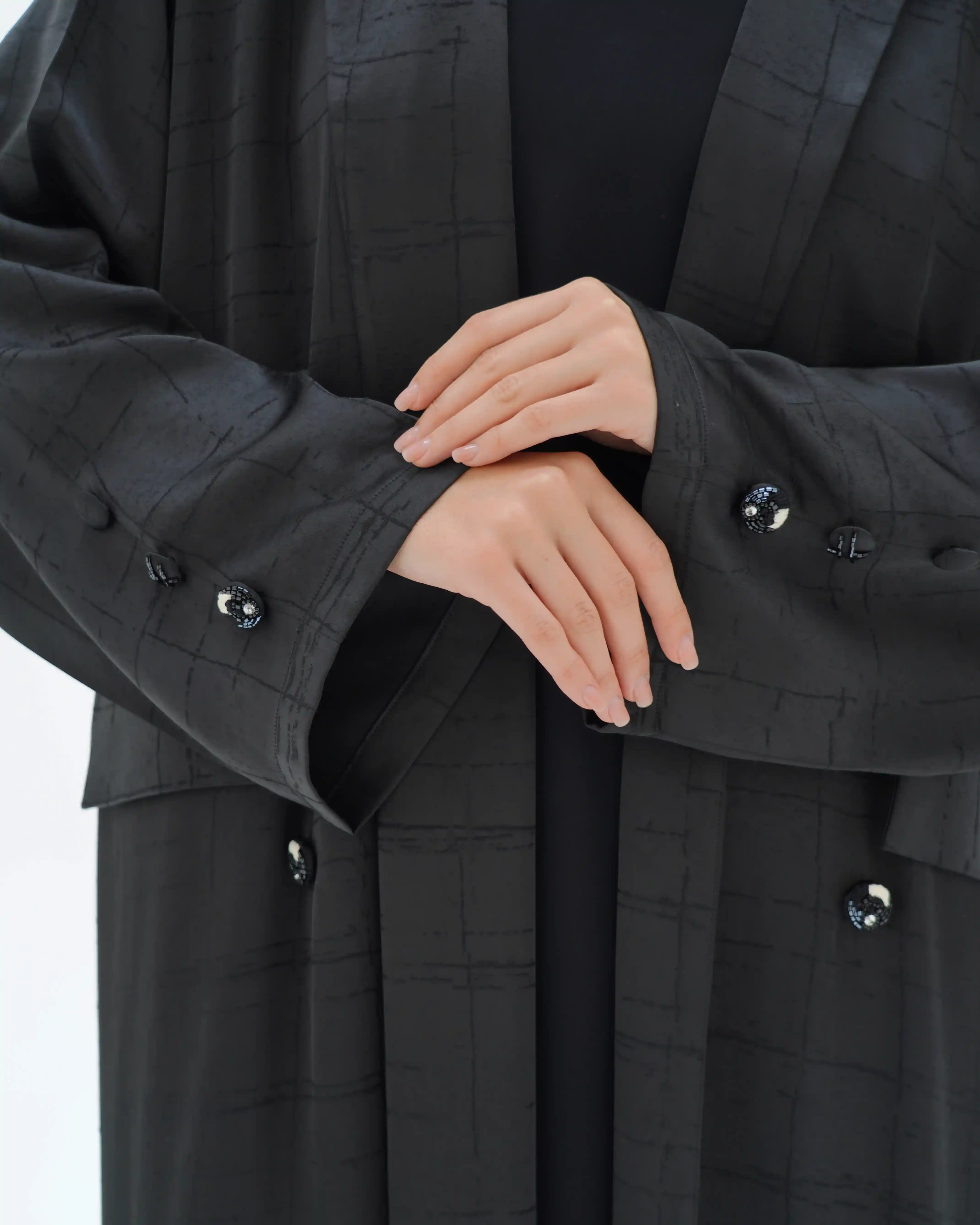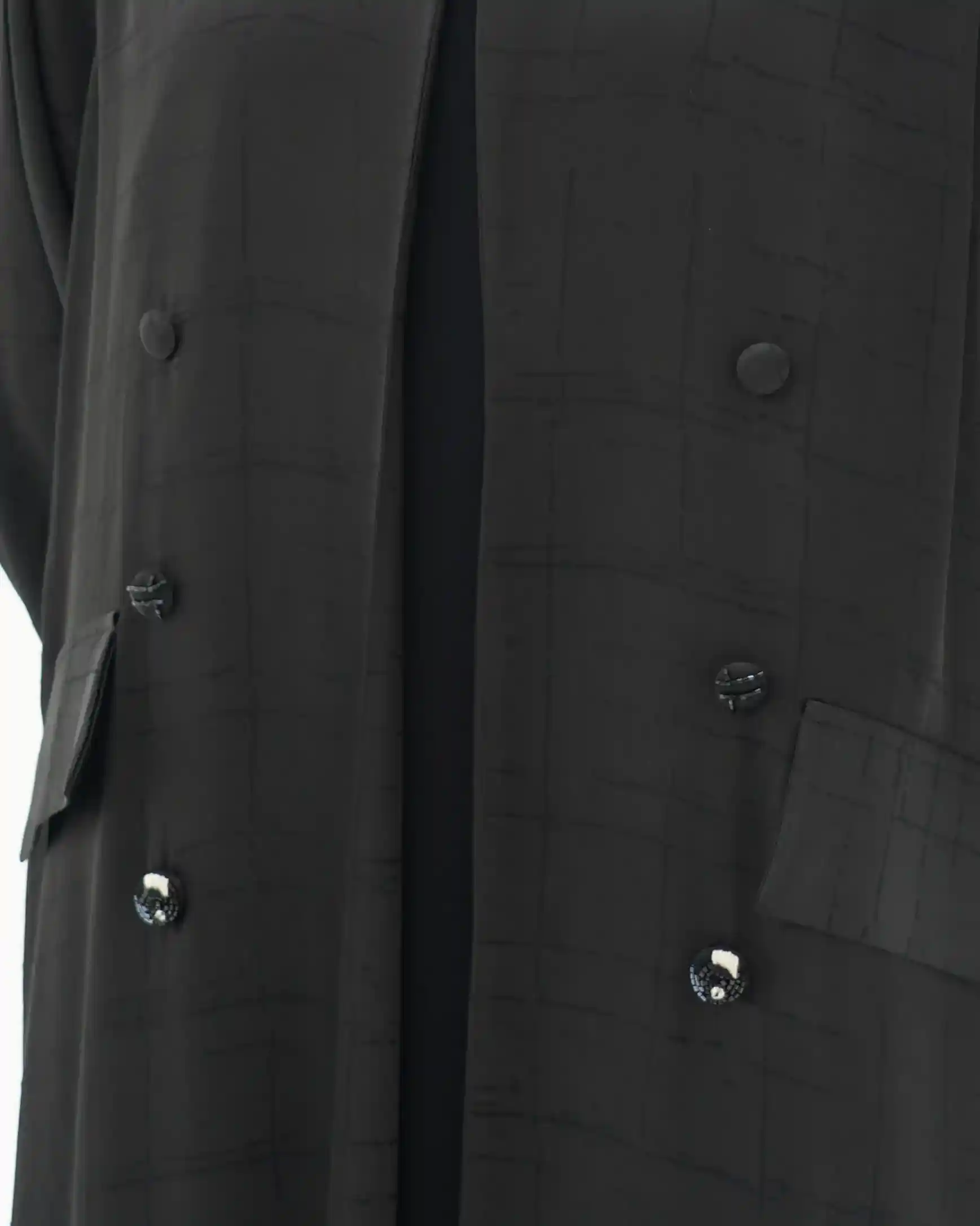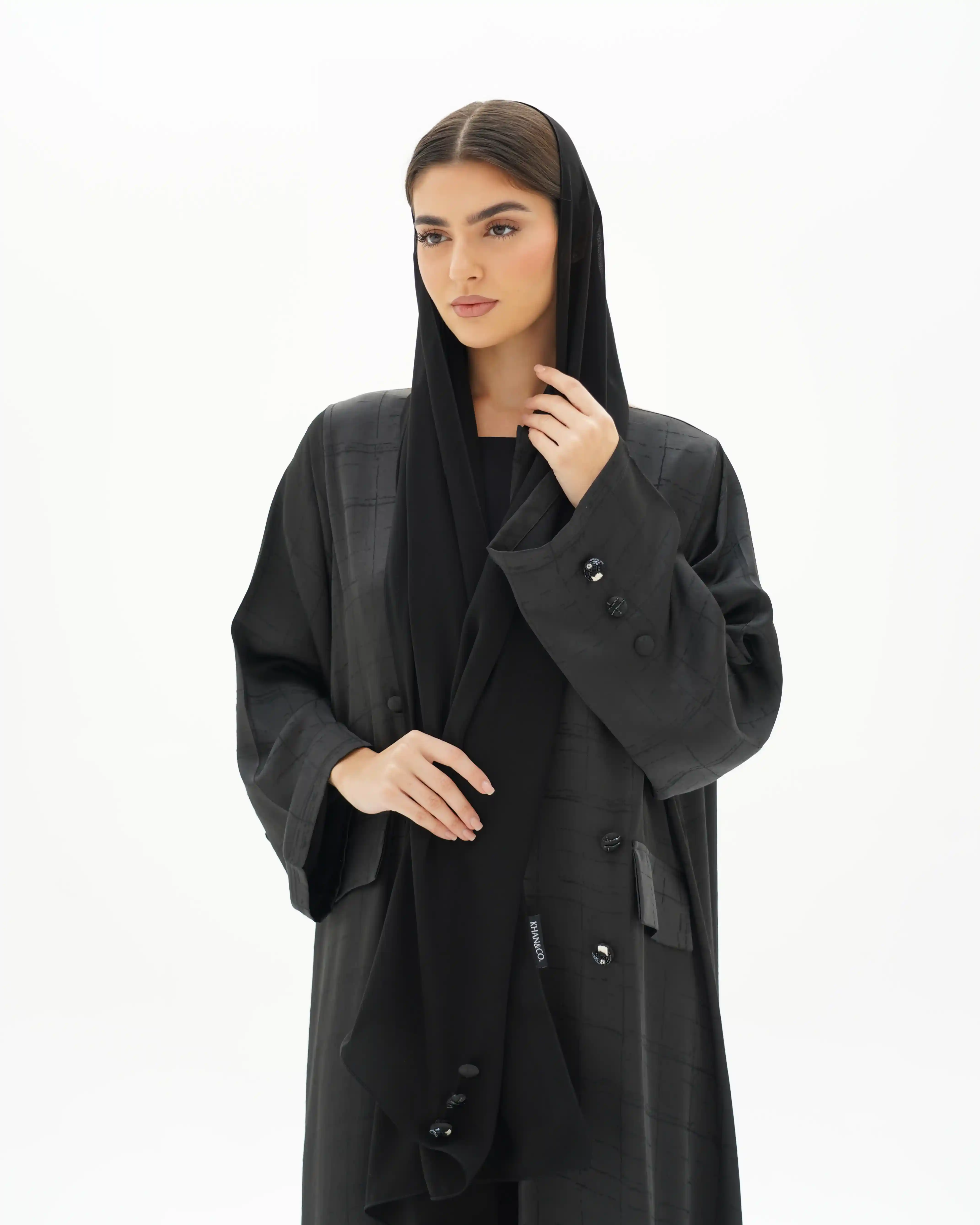 عباية فضفاضة تنبض بهدوء أنيق، بقصّة مستقيمة تمنح حضورًا راقيًا. من قماش كروسفيل جاكارد بملمس ناعم وانسدال متزن يوازن بين الخفة والفخامة. بياقة مبتكرة تُضفي بعدًا عصريًا على التصميم، بينما تتوسطها ثلاثة أزرار فاخرة تشكّل محور التركيز البصري. التفاصيل مستوحاة من فكرة الجيب الجانبي كعنصر بصري فقط دون وجود جيب فعلي، مع ثنية طولية ممتدة من أعلى العباية حتى أسفلها لتعزّز الخط العمودي وتمنح القوام توازنًا هادئًا يعكس بساطة ذكية وأناقة معاصرة. الأكمام سادة مزدانة بثلاثة أزرار مطابقة لتفصيل الصدر, تكتمل الإطلالة بطرحة متناغمة مزدانة بثلاثة أزرار مماثلة عند الأطراف.