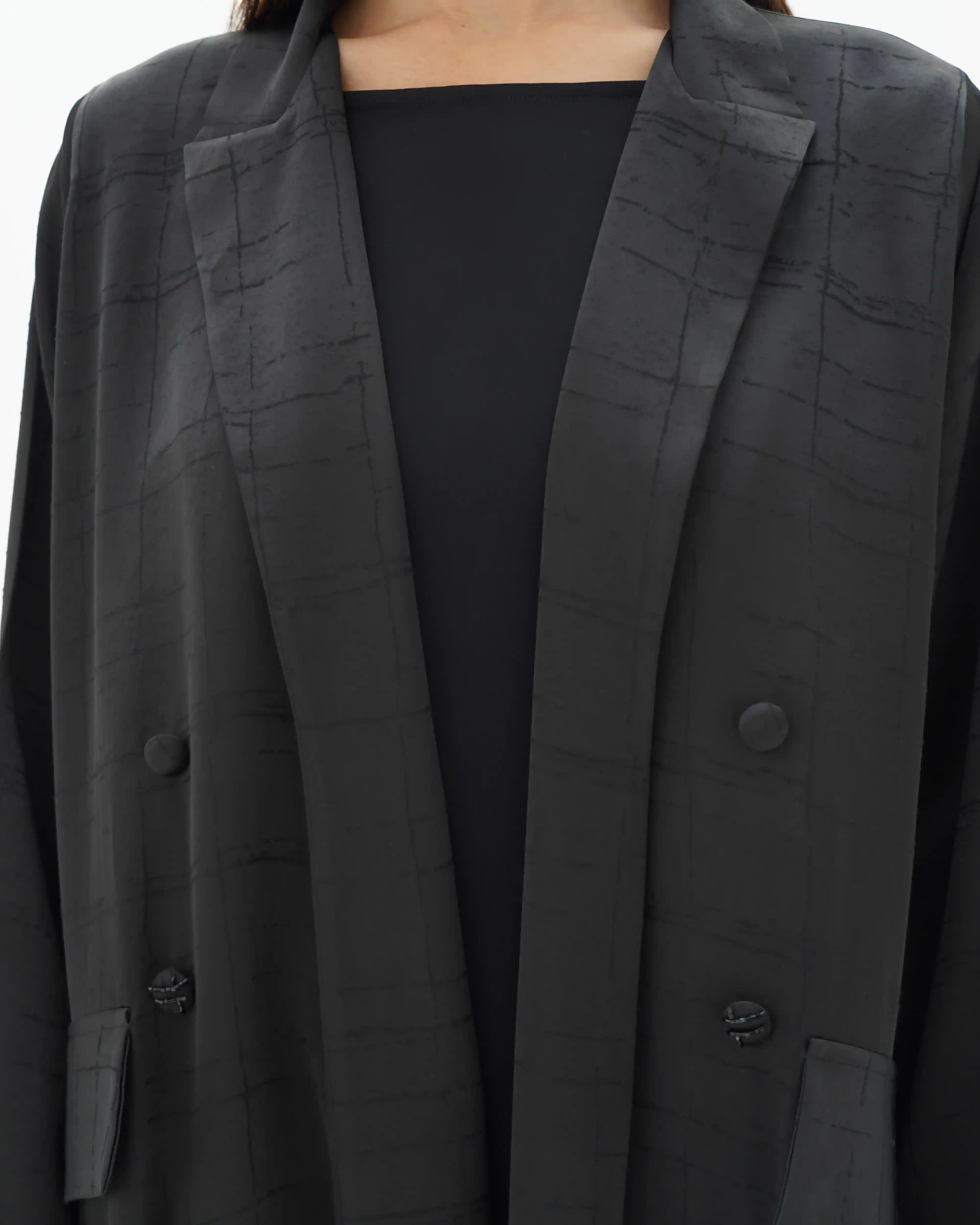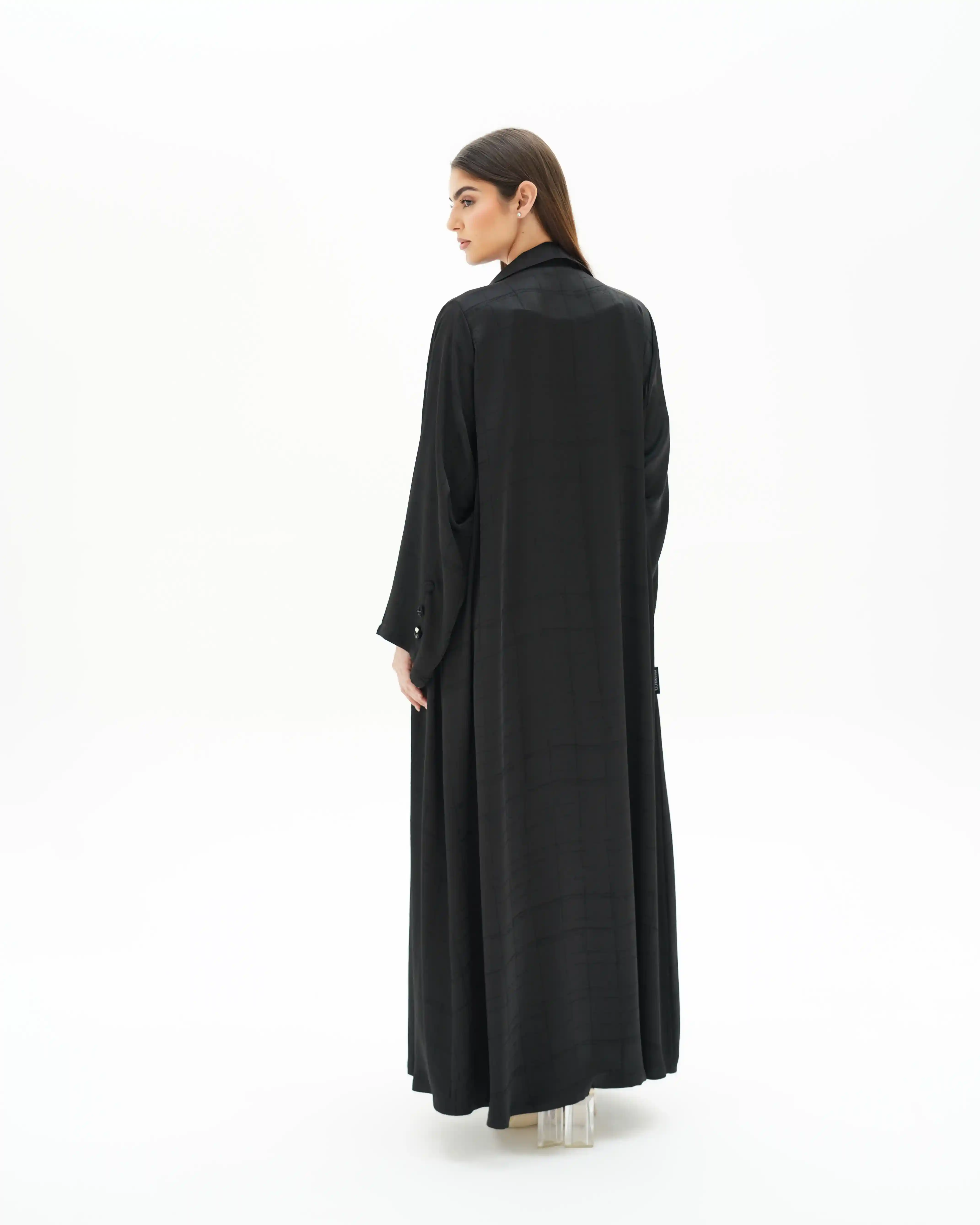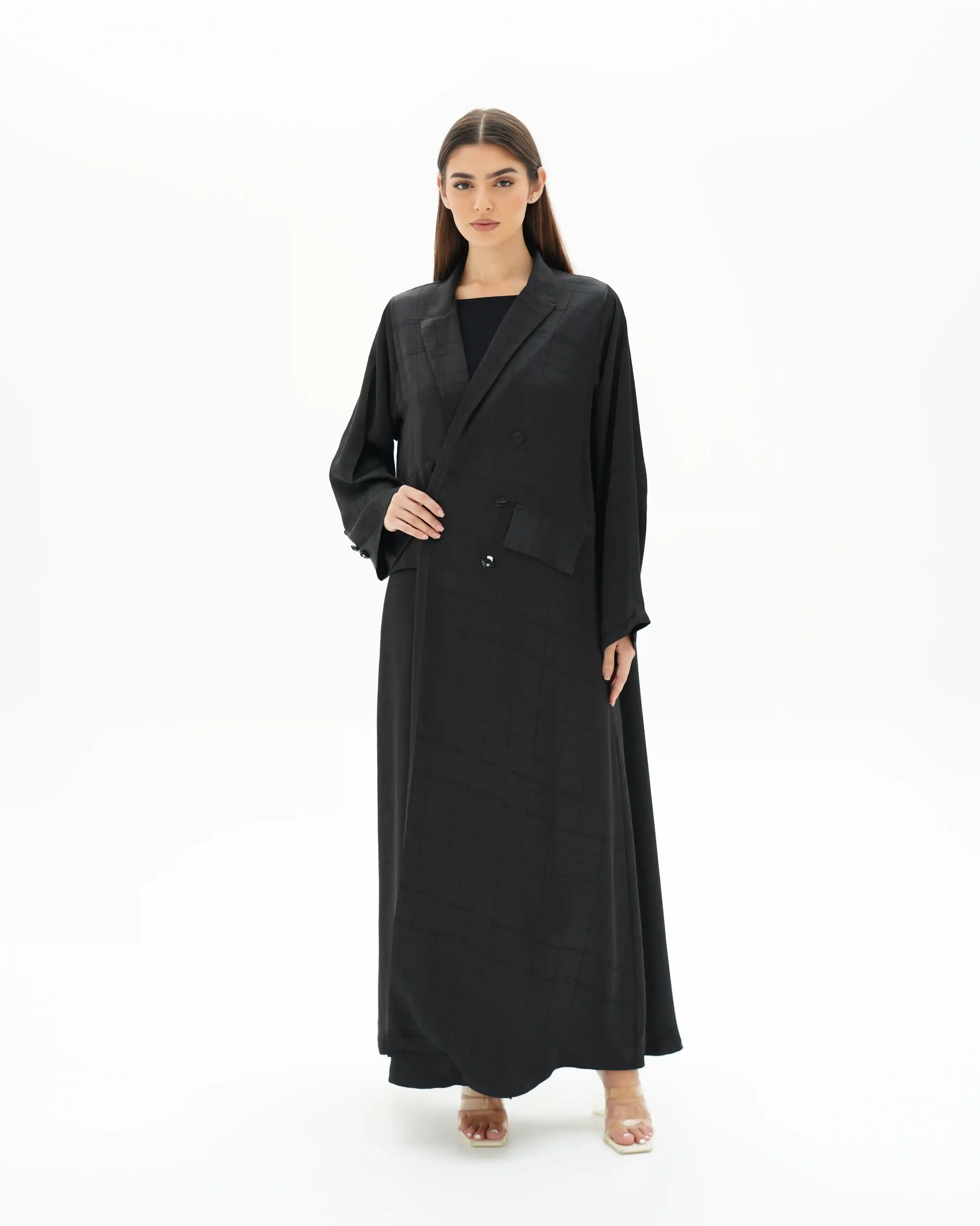 عباية فضفاضة تنبض بهدوء أنيق، بقصّة مستقيمة تمنح حضورًا راقيًا. من قماش كروسفيل جاكارد بملمس ناعم وانسدال متزن يوازن بين الخفة والفخامة. بياقة مبتكرة تُضفي بعدًا عصريًا على التصميم، بينما تتوسطها ثلاثة أزرار فاخرة تشكّل محور التركيز البصري. التفاصيل مستوحاة من فكرة الجيب الجانبي كعنصر بصري فقط دون وجود جيب فعلي، مع ثنية طولية ممتدة من أعلى العباية حتى أسفلها لتعزّز الخط العمودي وتمنح القوام توازنًا هادئًا يعكس بساطة ذكية وأناقة معاصرة. الأكمام سادة مزدانة بثلاثة أزرار مطابقة لتفصيل الصدر, تكتمل الإطلالة بطرحة متناغمة مزدانة بثلاثة أزرار مماثلة عند الأطراف.