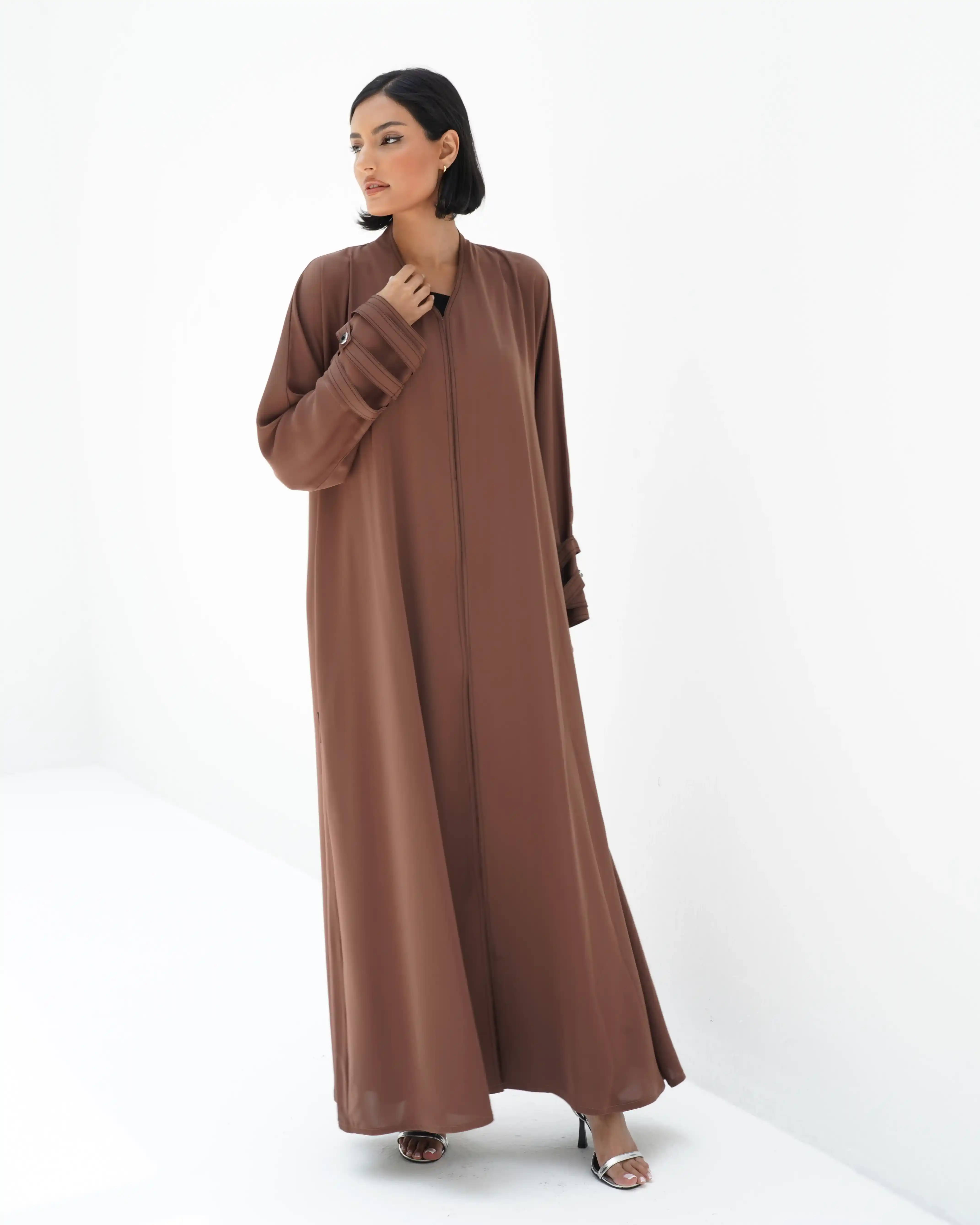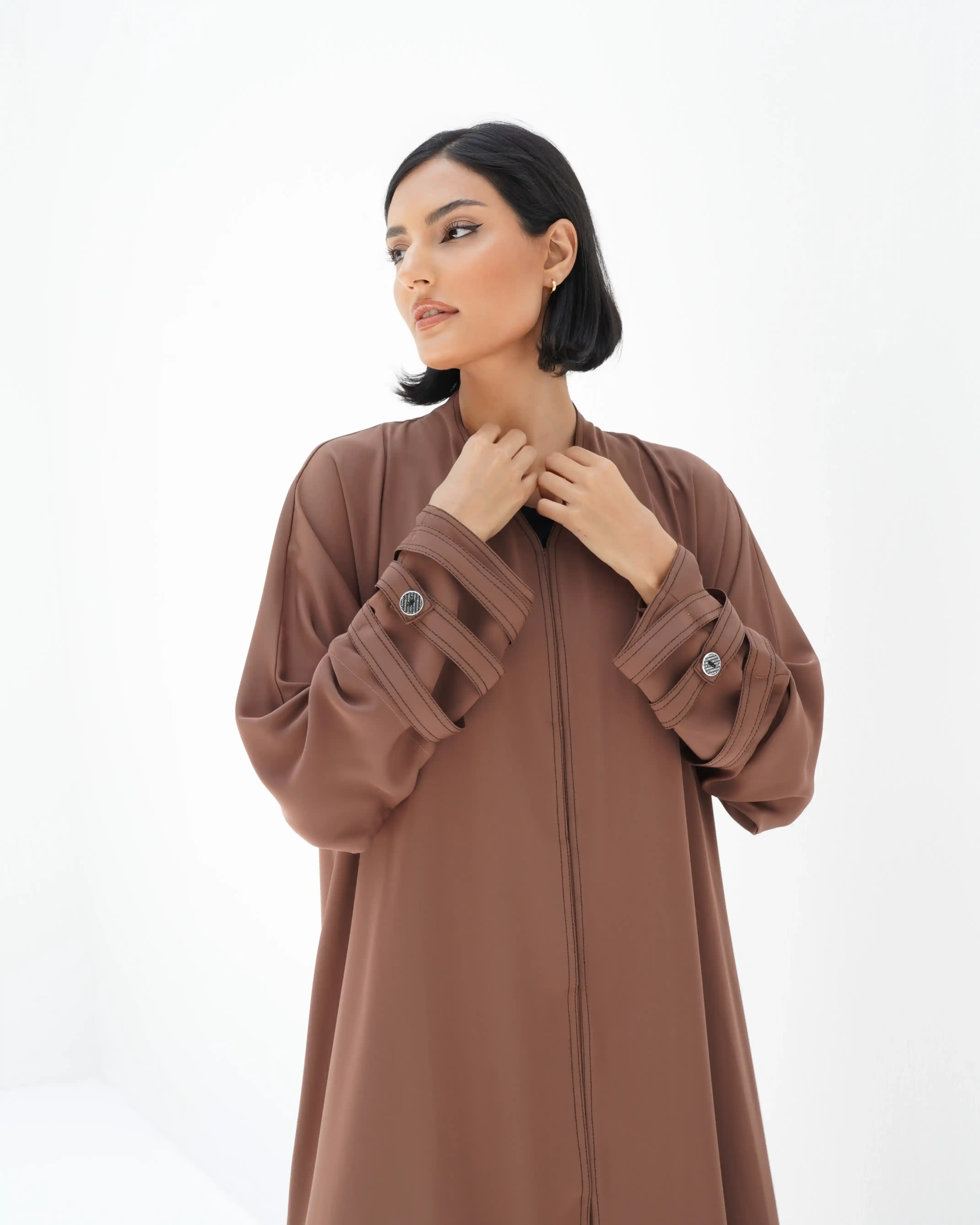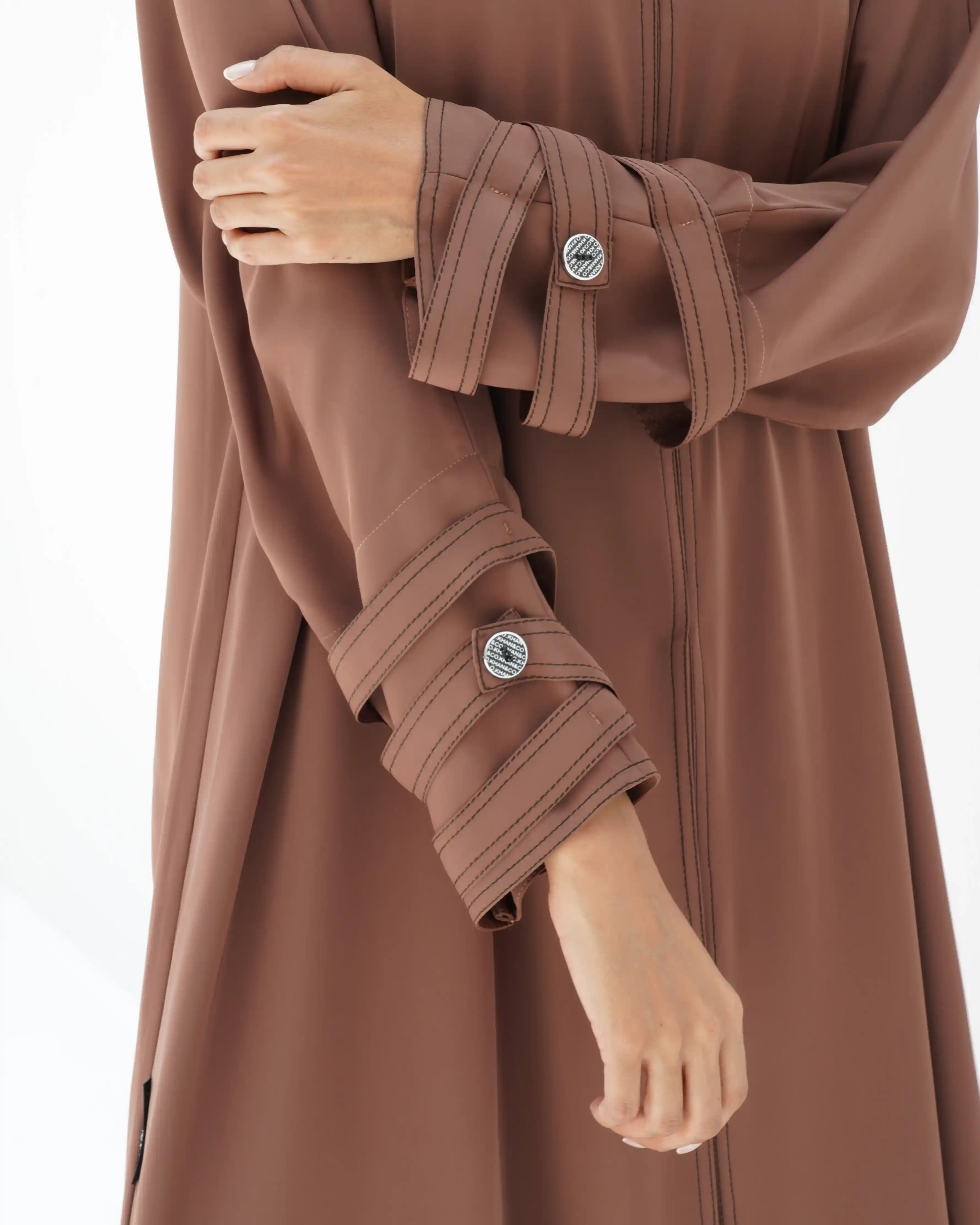 • لون كراميل كامل كامل العباية بخياطة ظاهرة في شرائط الاكمام باللون الاسود.