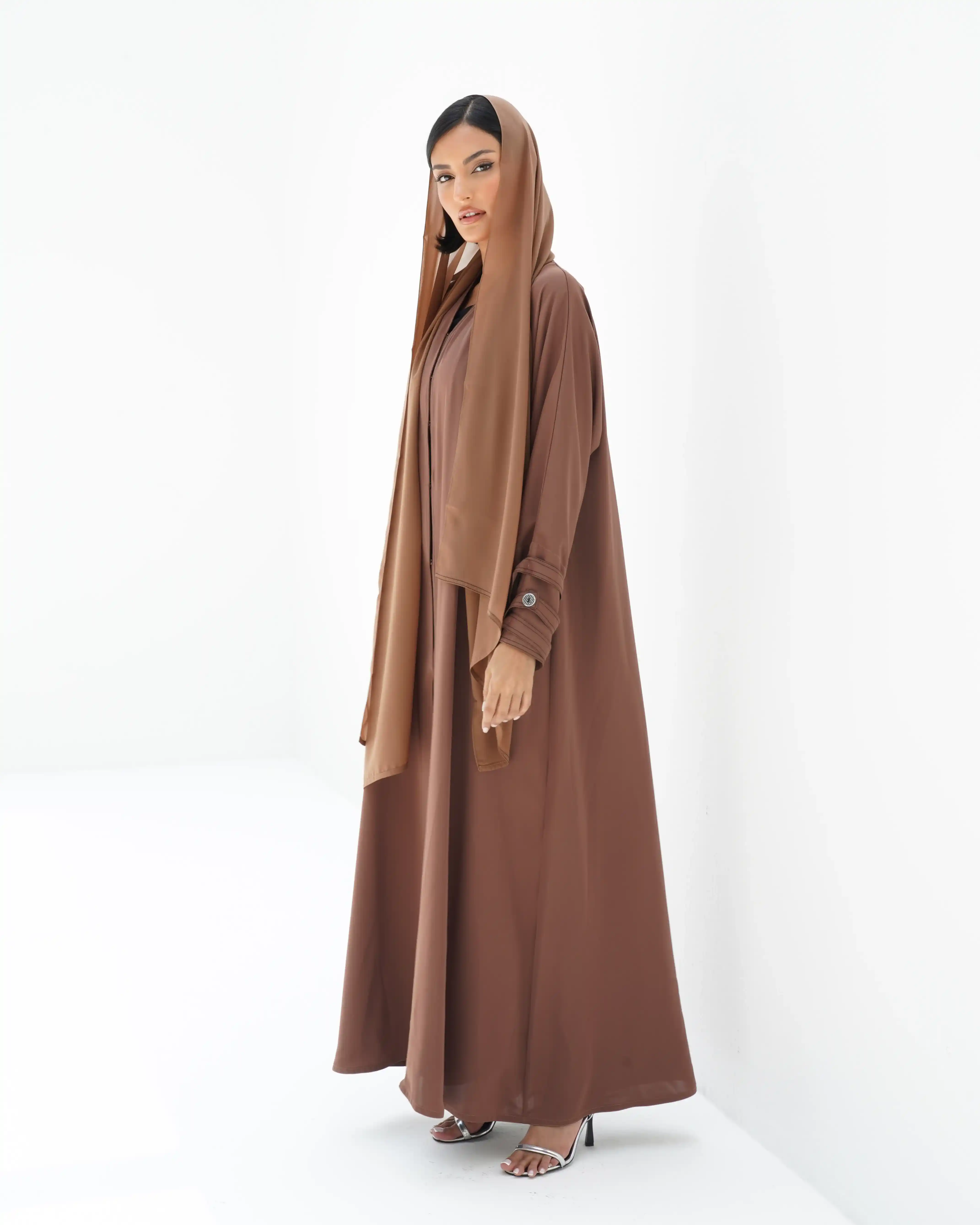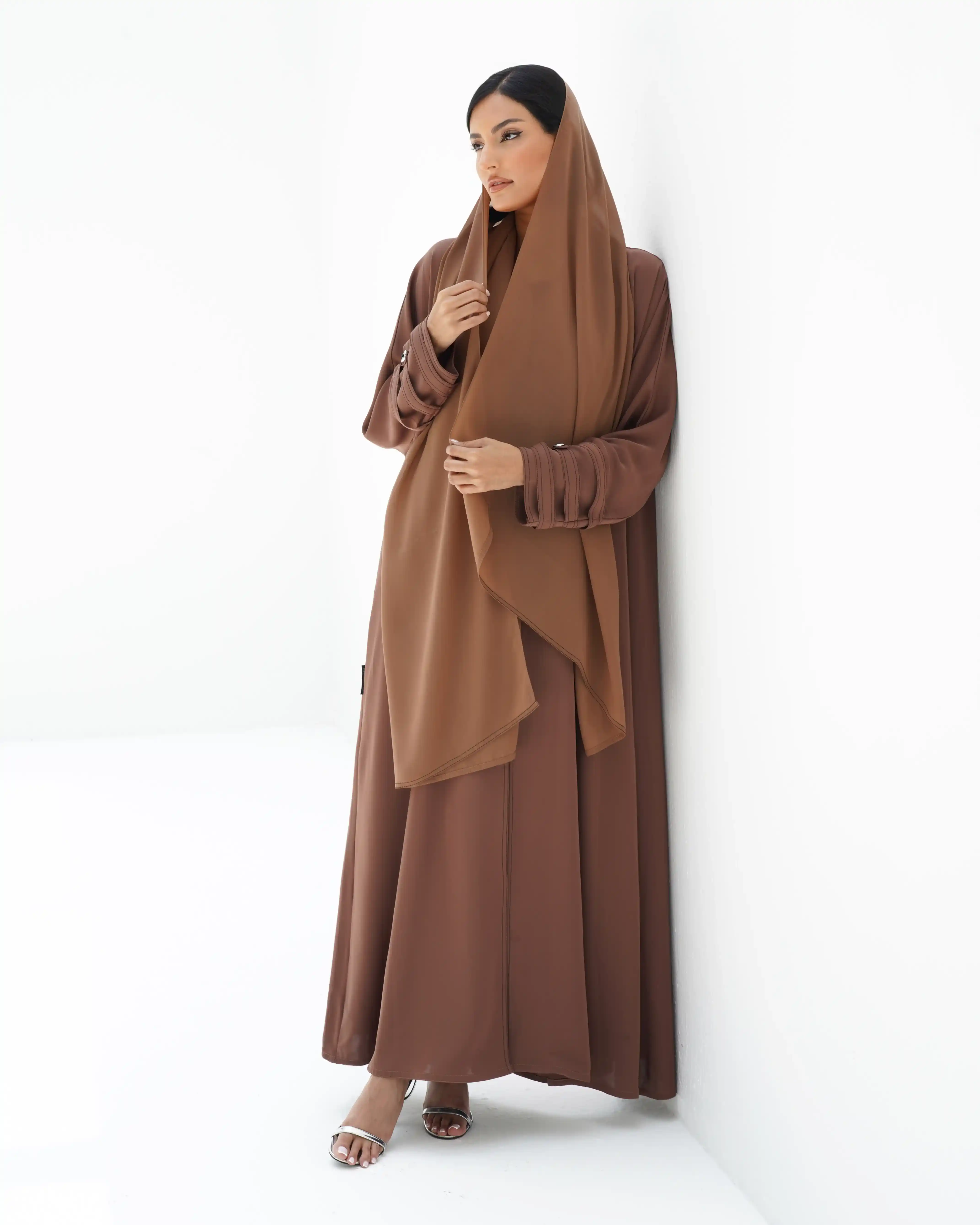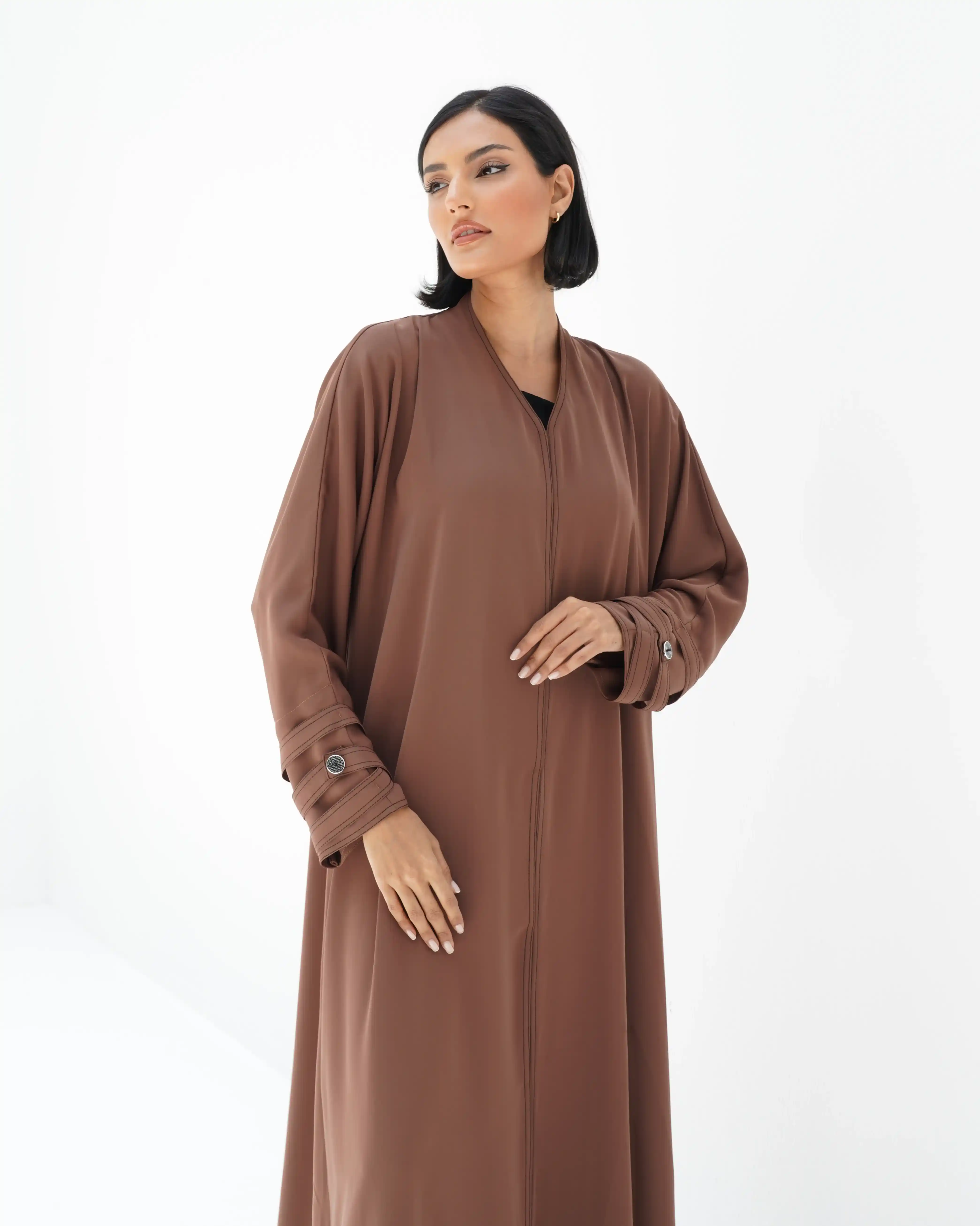• لون كراميل كامل كامل العباية بخياطة ظاهرة في شرائط الاكمام باللون الاسود.
