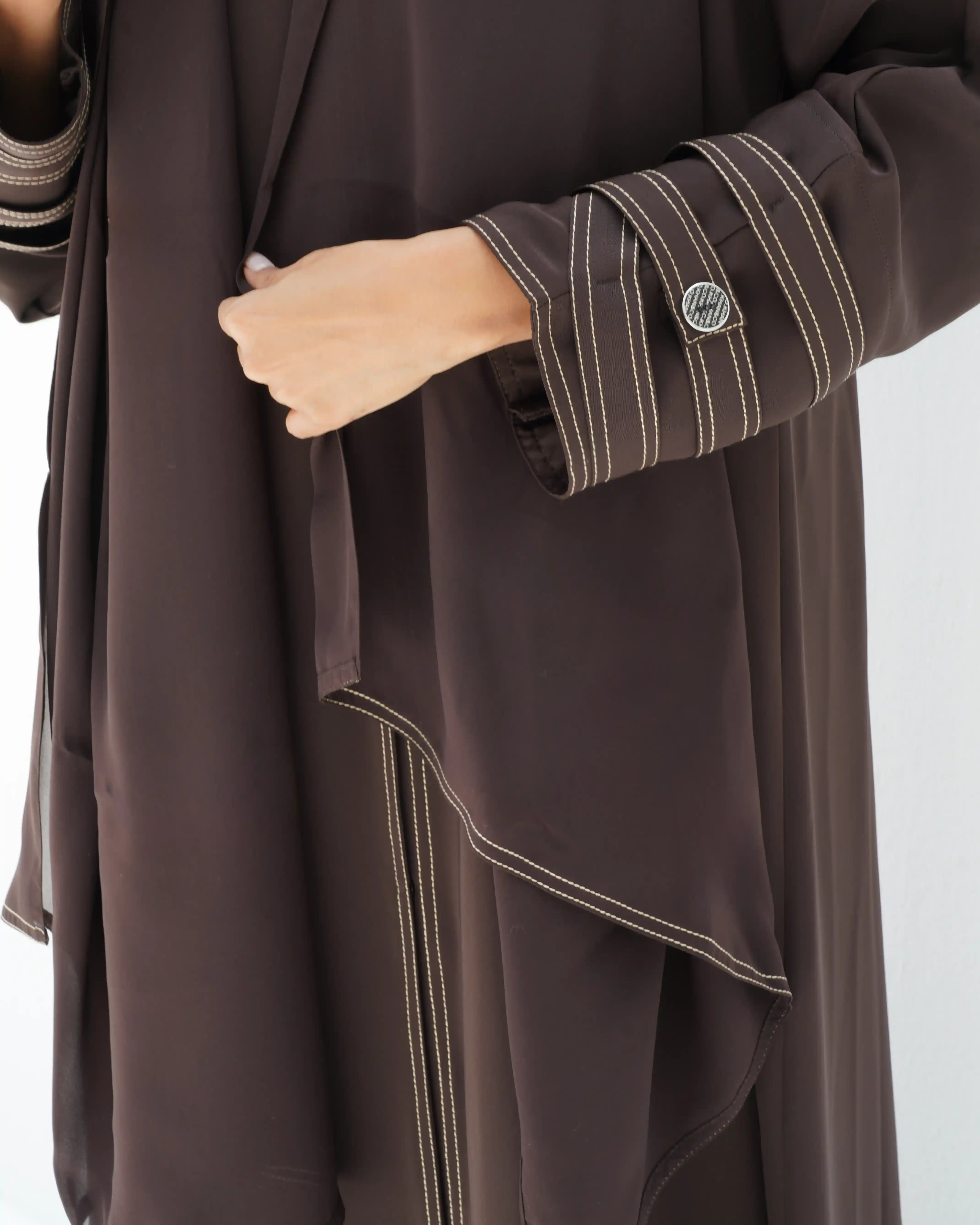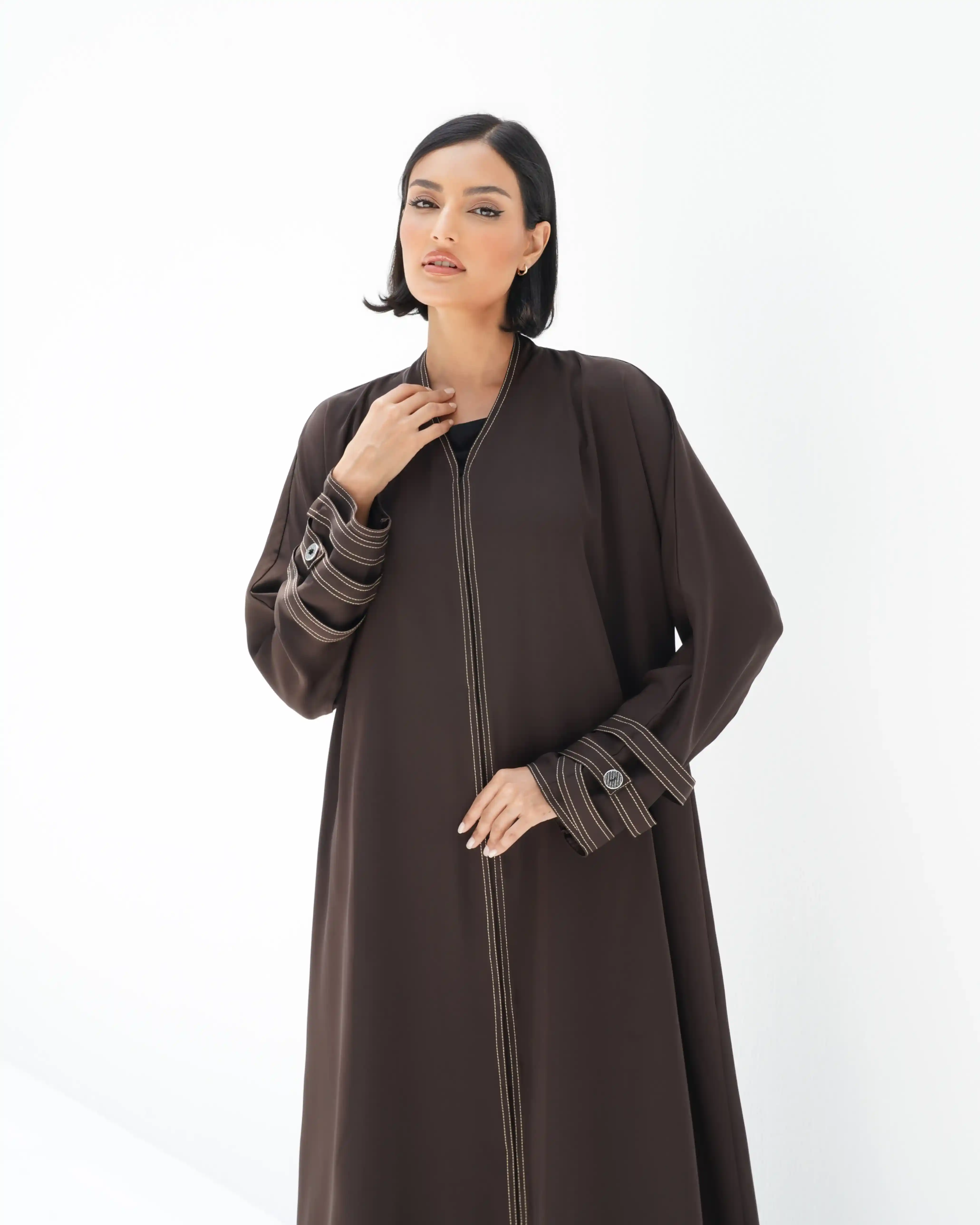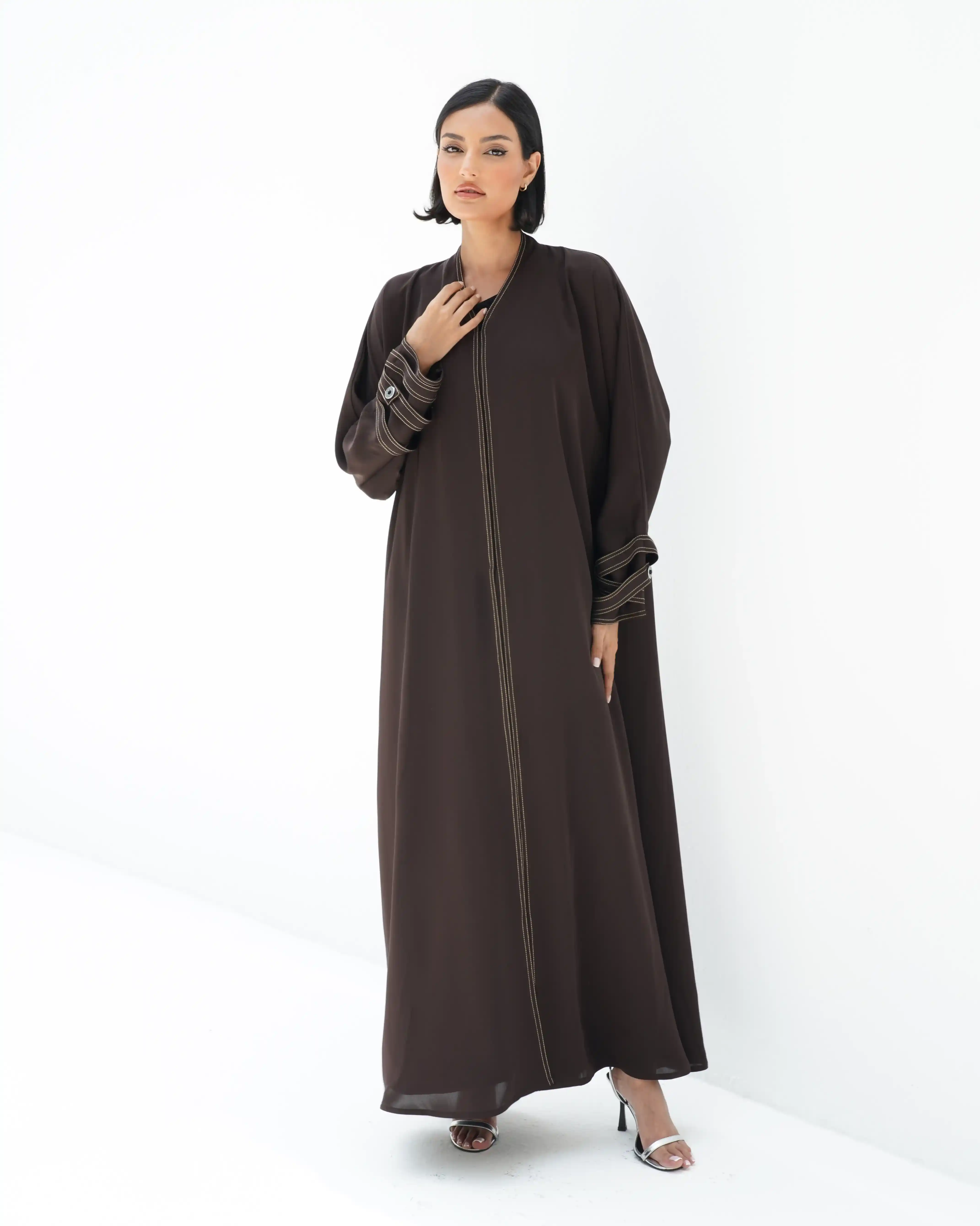 • لون شوكولاته كامل العباية بخياطة ظاهرة في شرائط الاكمام باللون ذهبي.