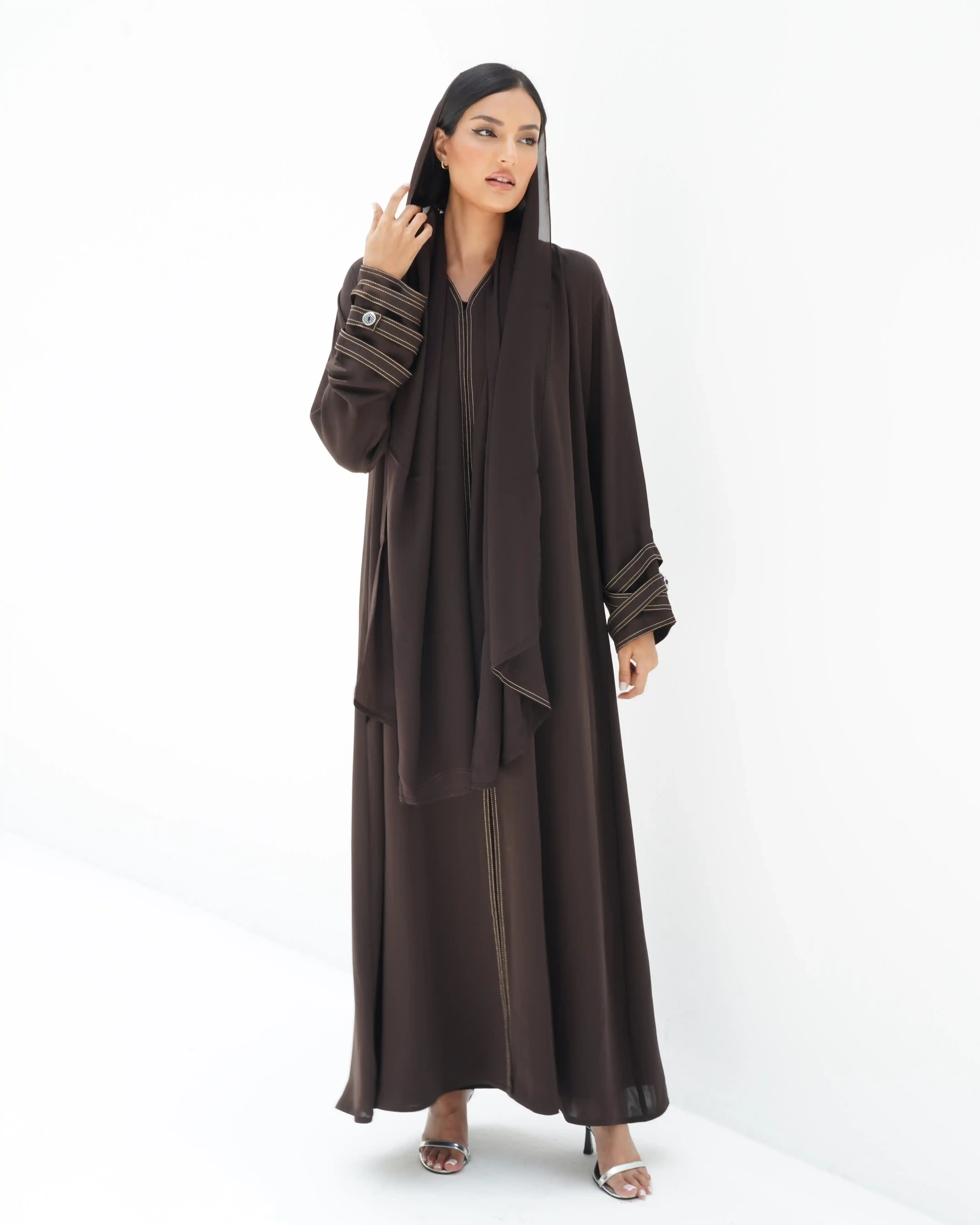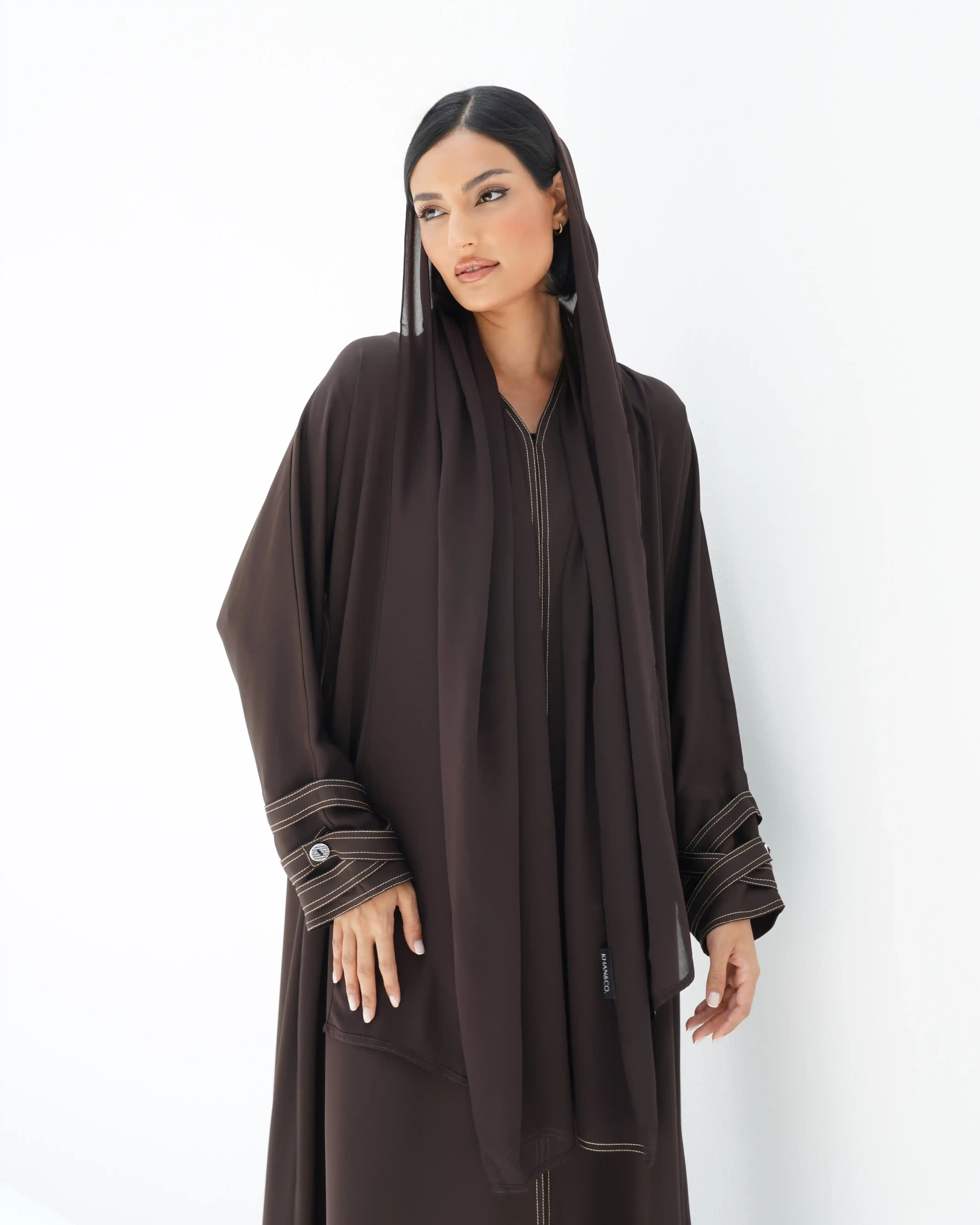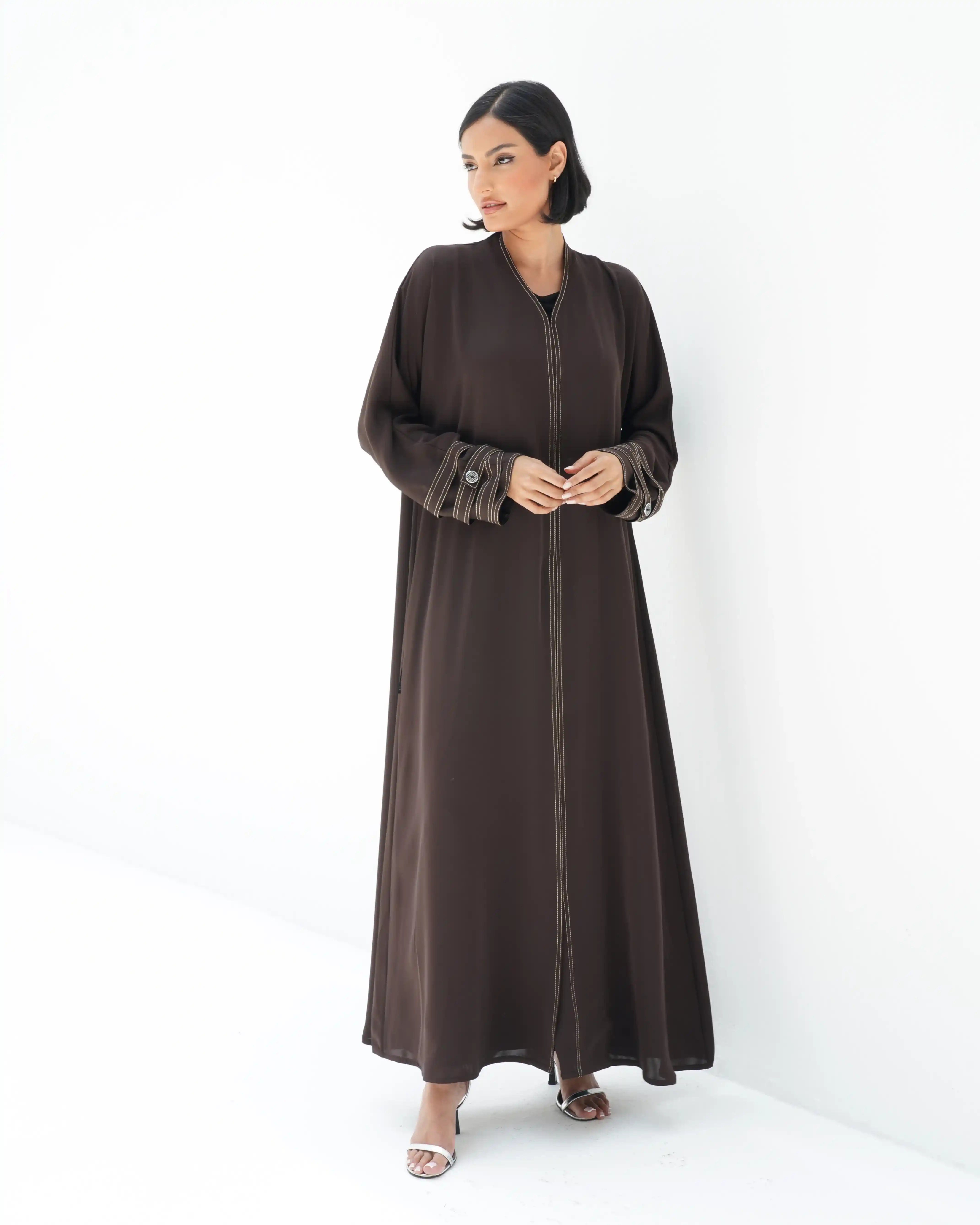 • لون شوكولاته كامل العباية بخياطة ظاهرة في شرائط الاكمام باللون ذهبي.