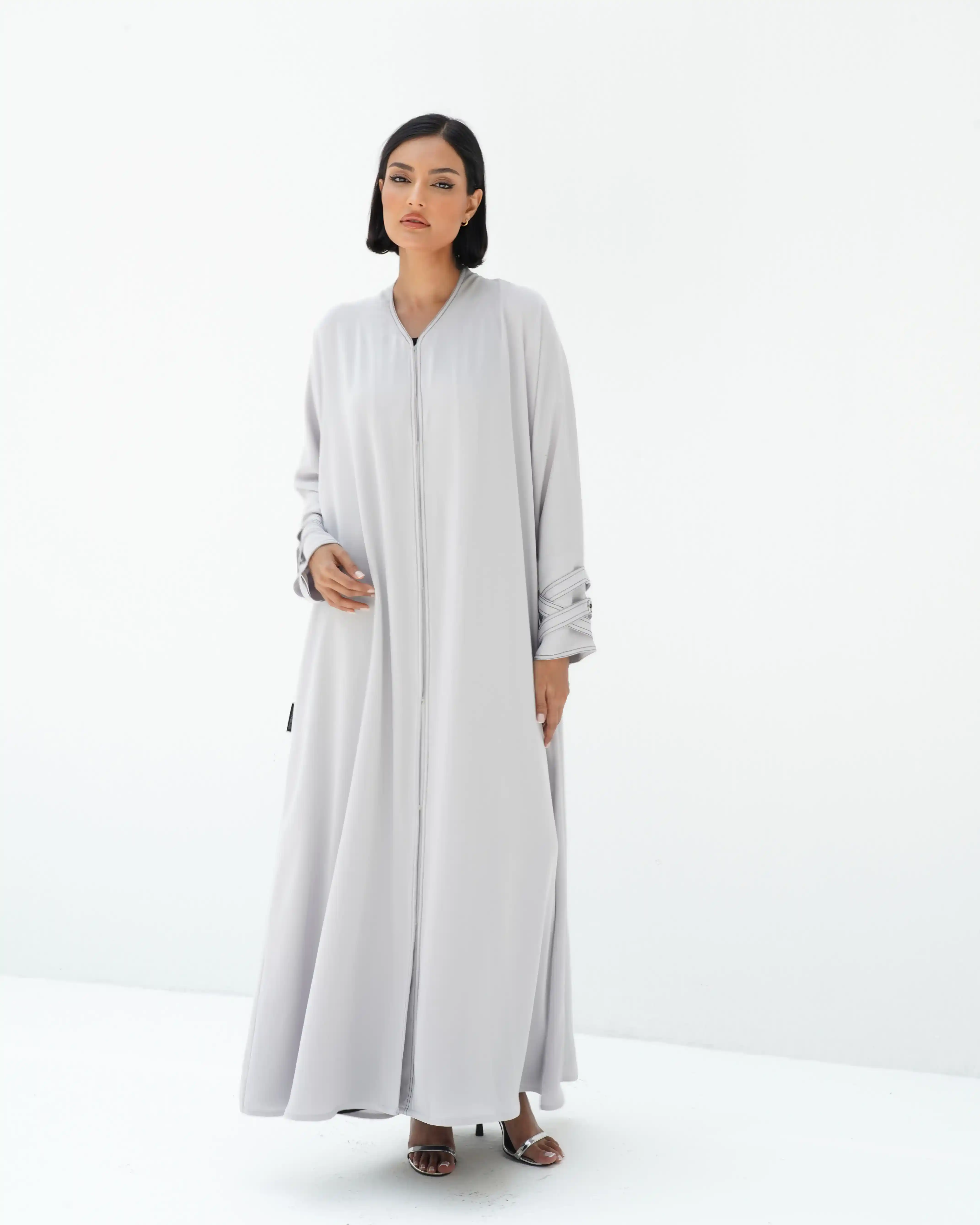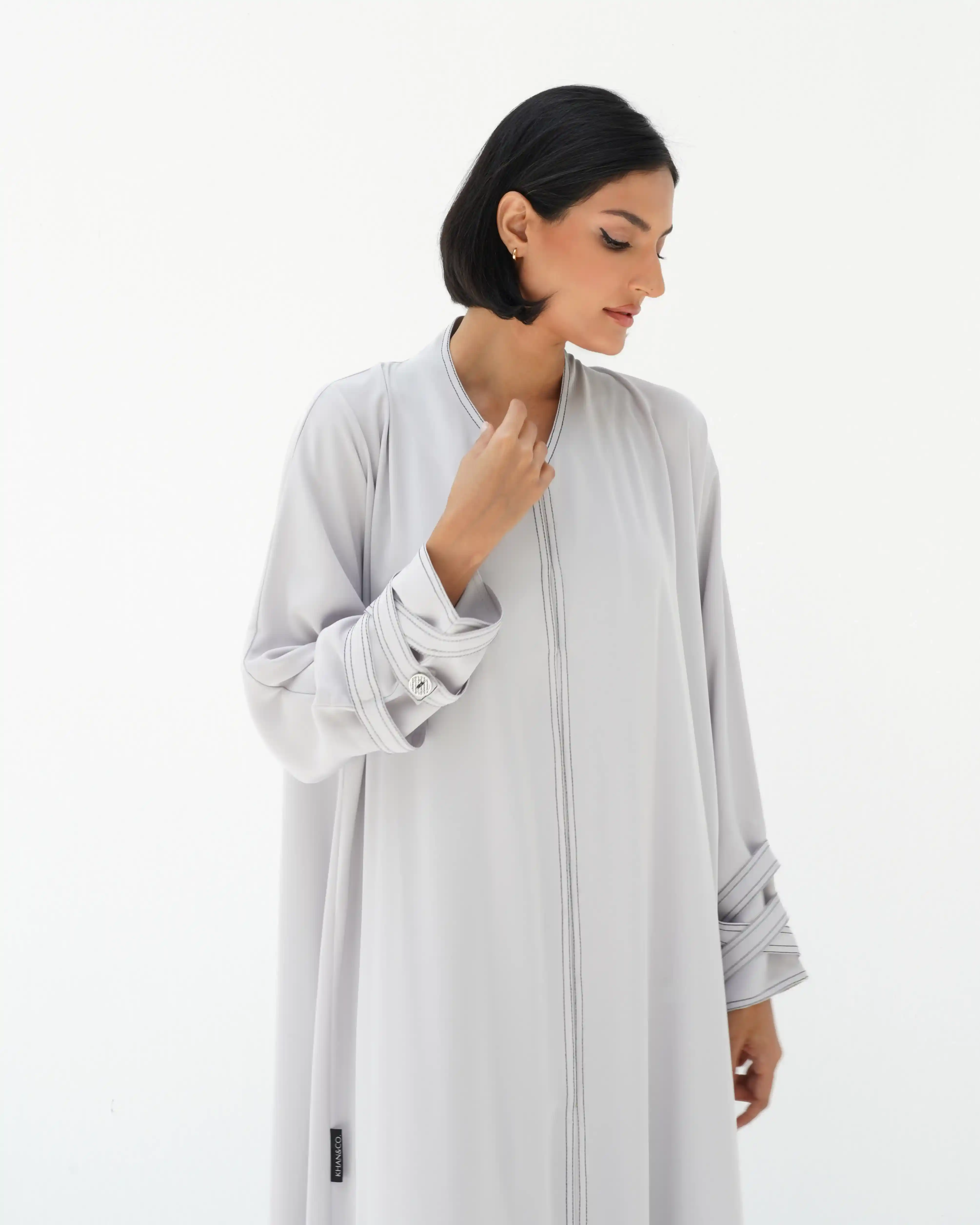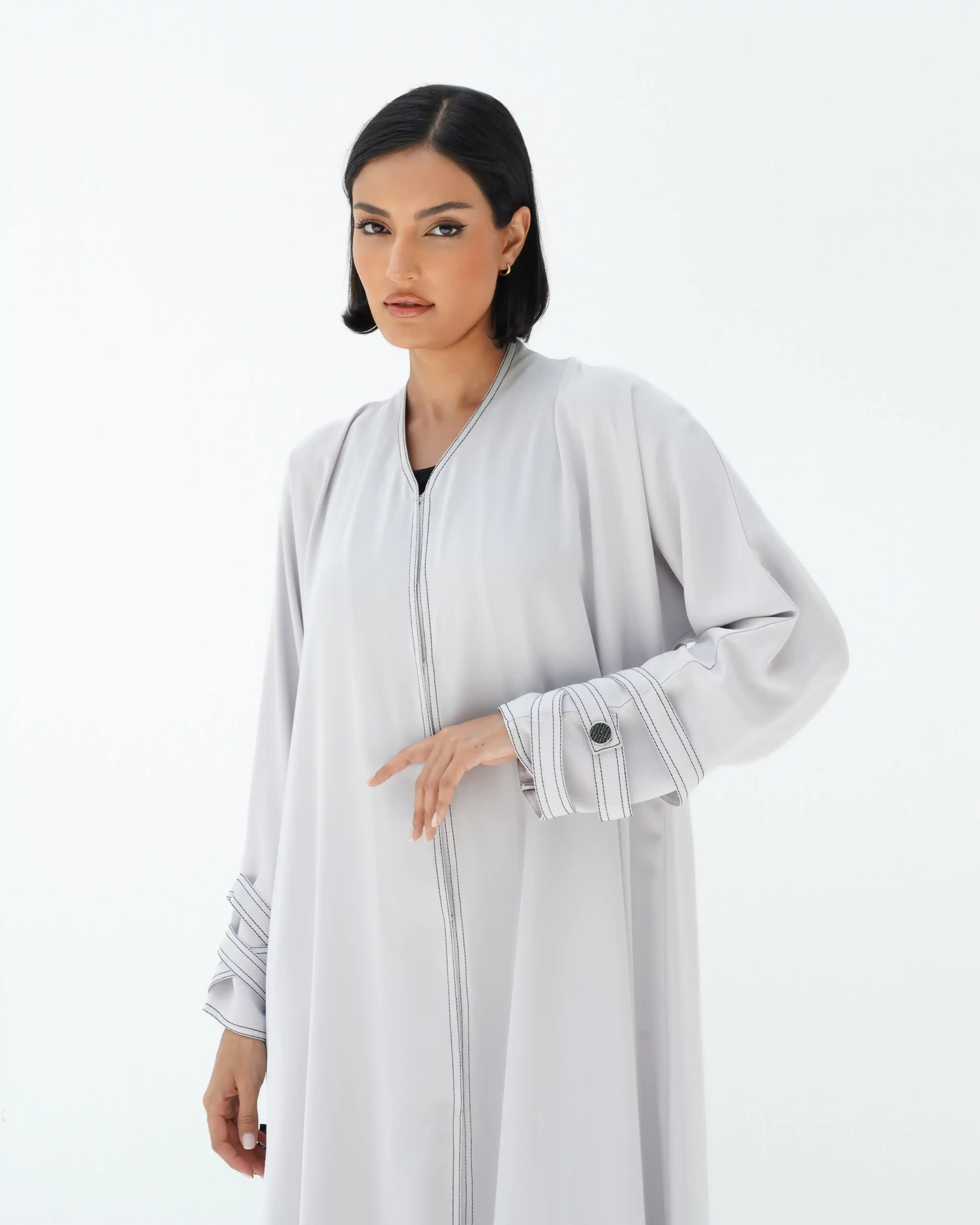 • لون الرمادي الفاتح كامل العباية بخياطة ظاهرة في شرائط الاكمام باللون الاسود.