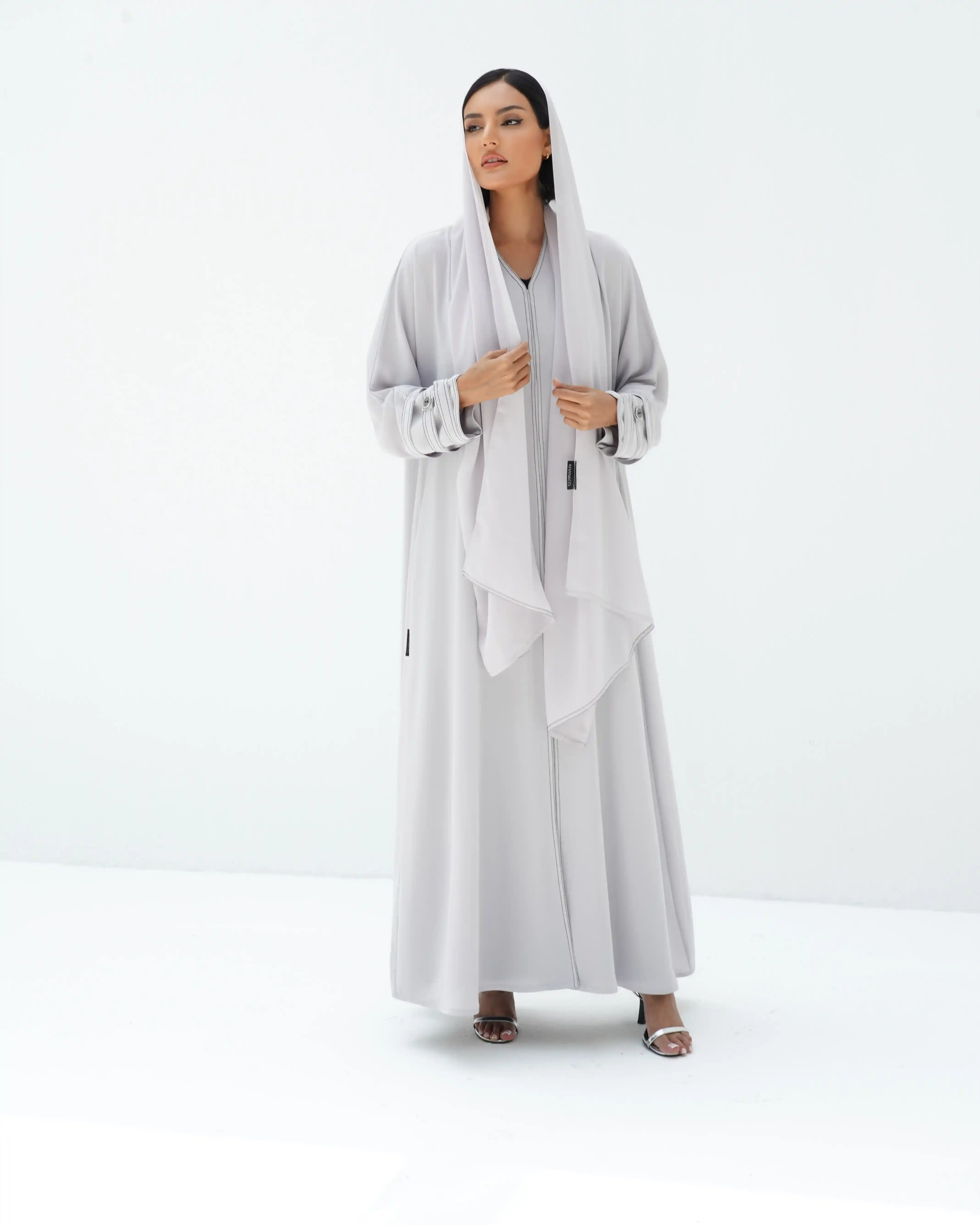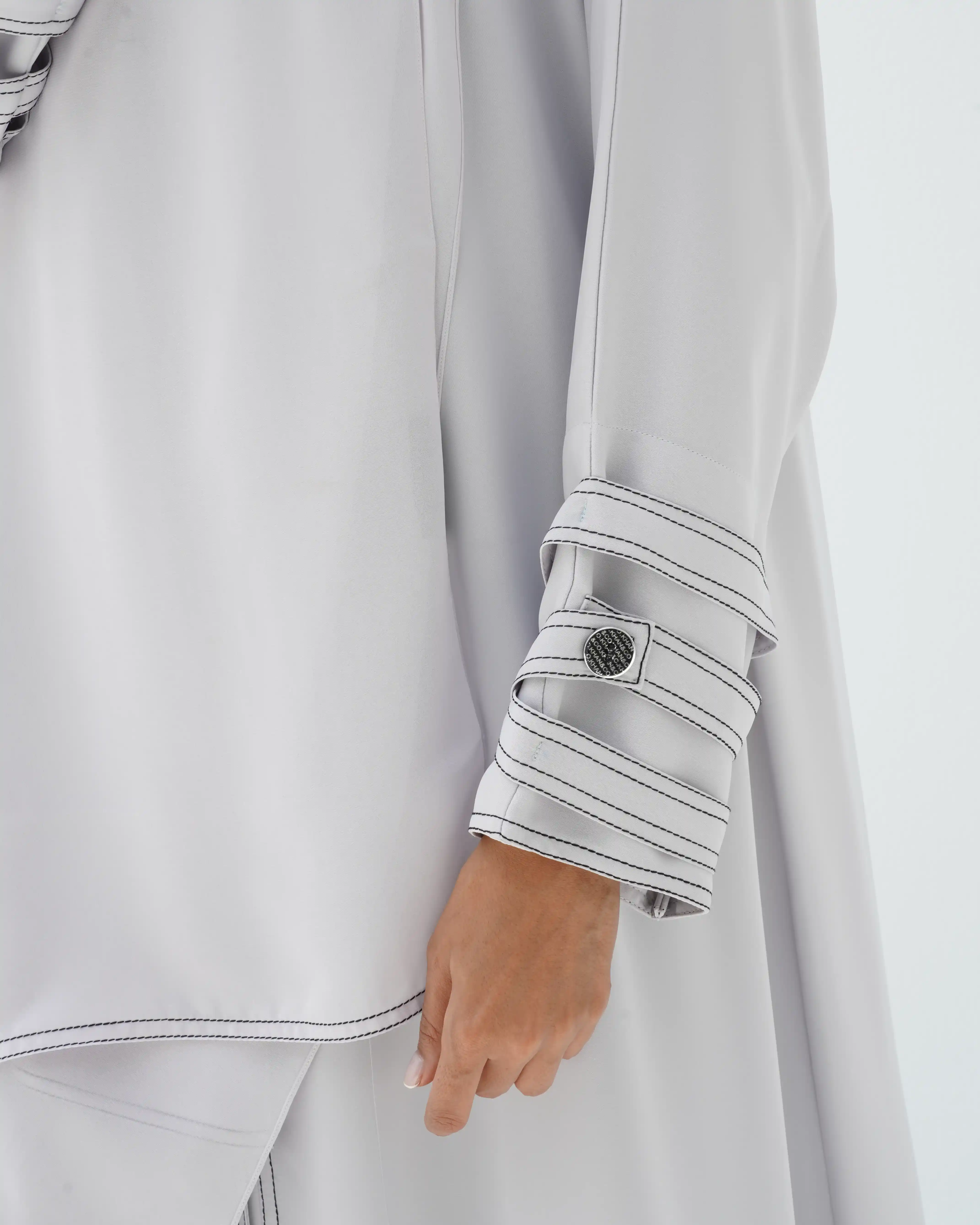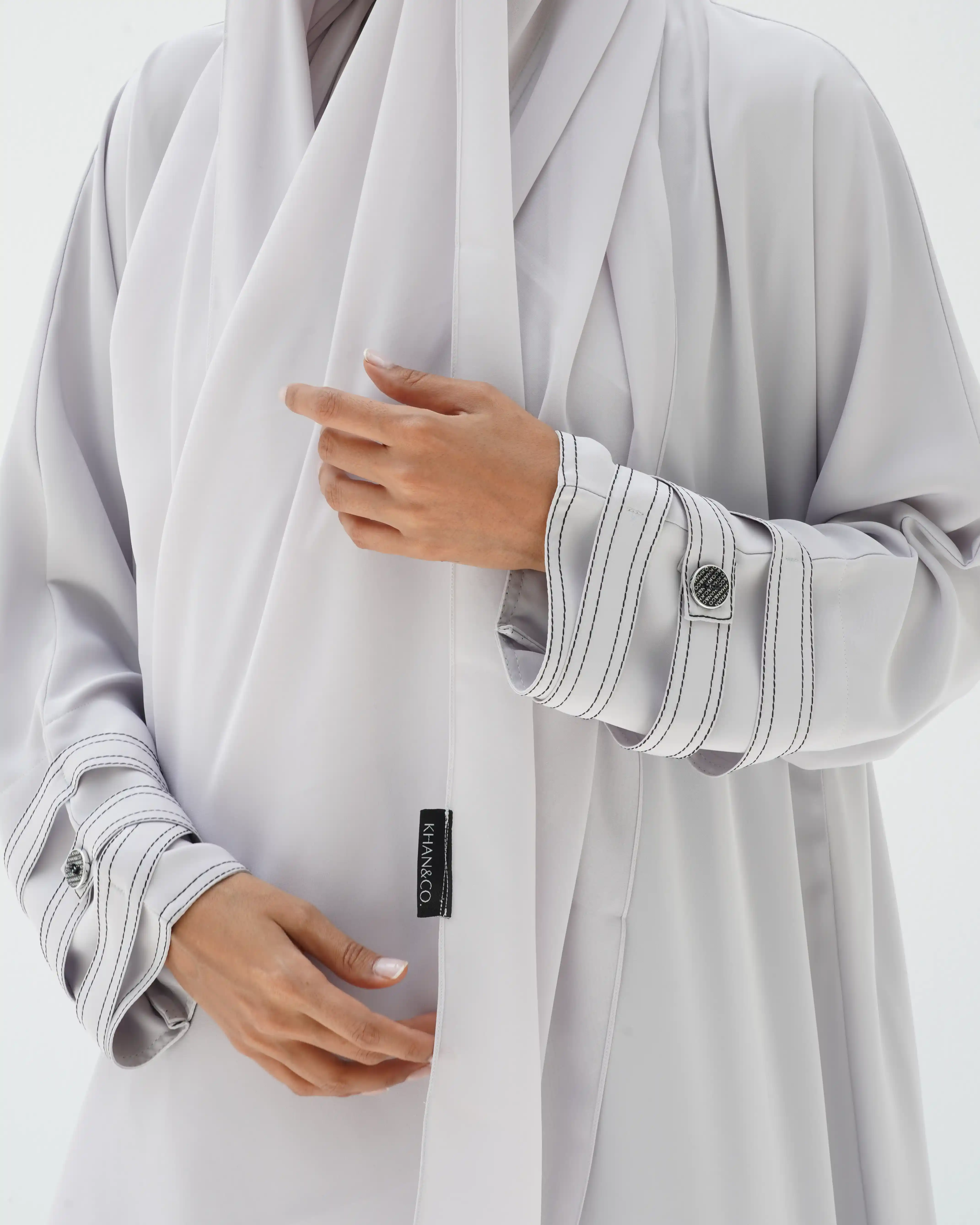 • لون الرمادي الفاتح كامل العباية بخياطة ظاهرة في شرائط الاكمام باللون الاسود.