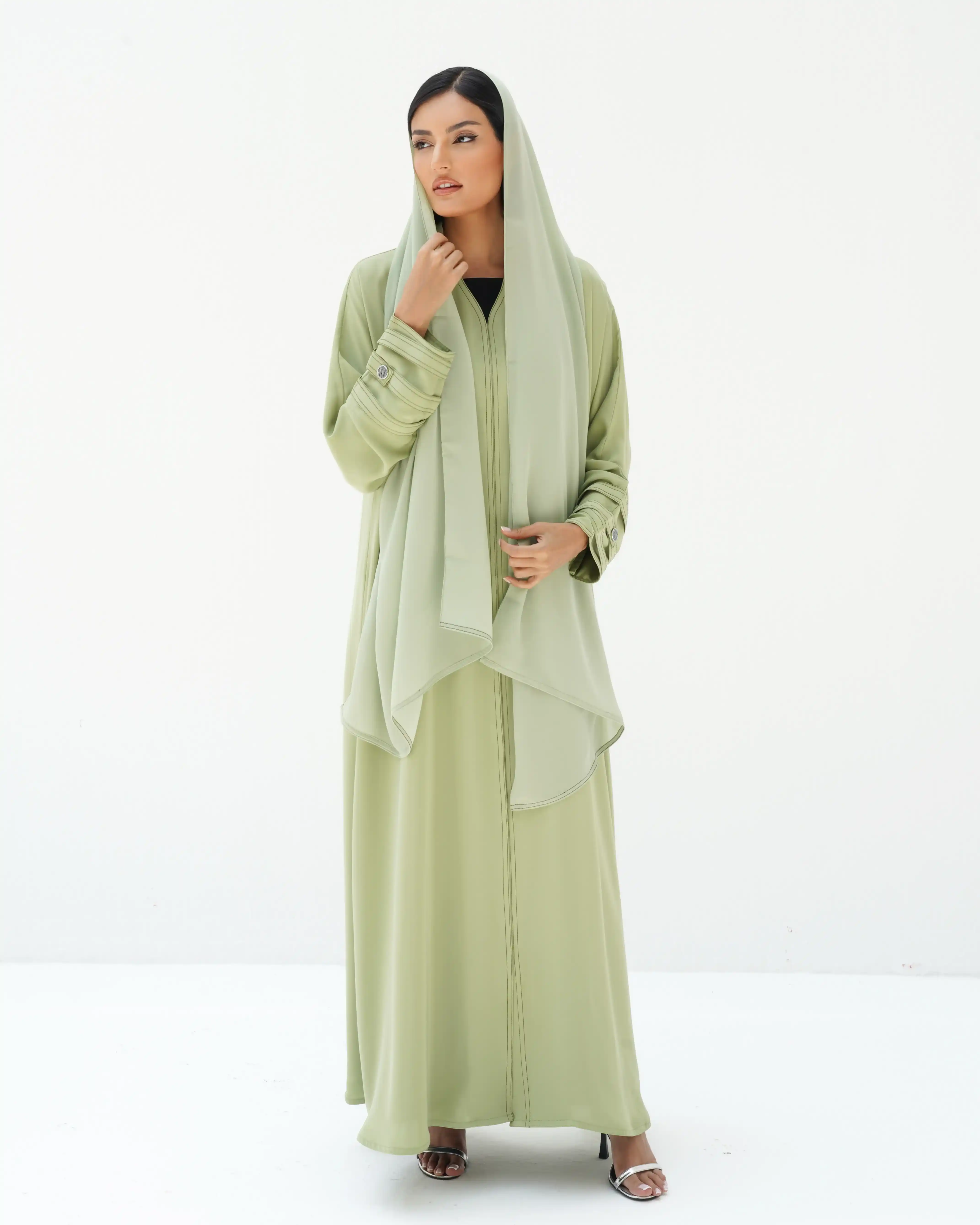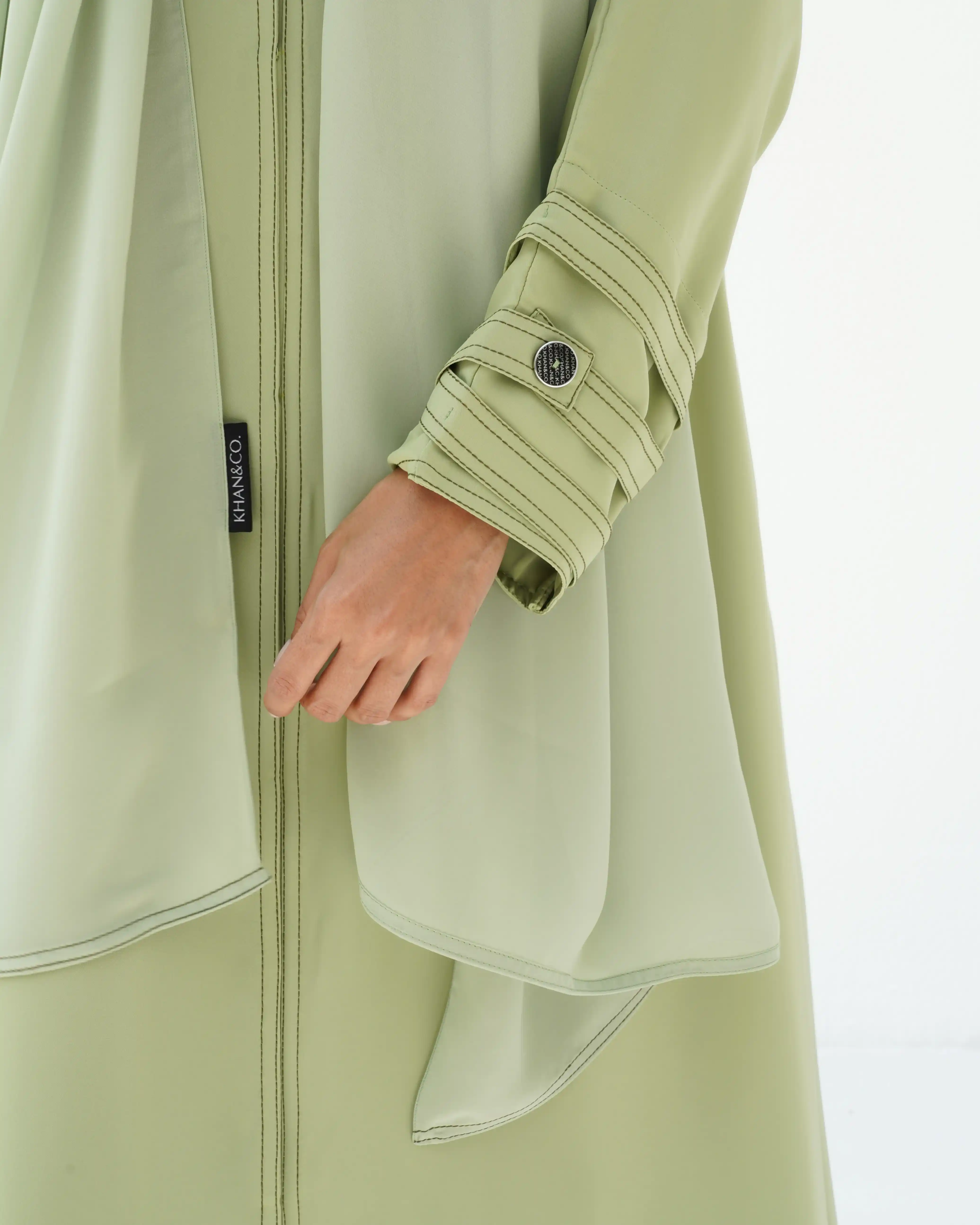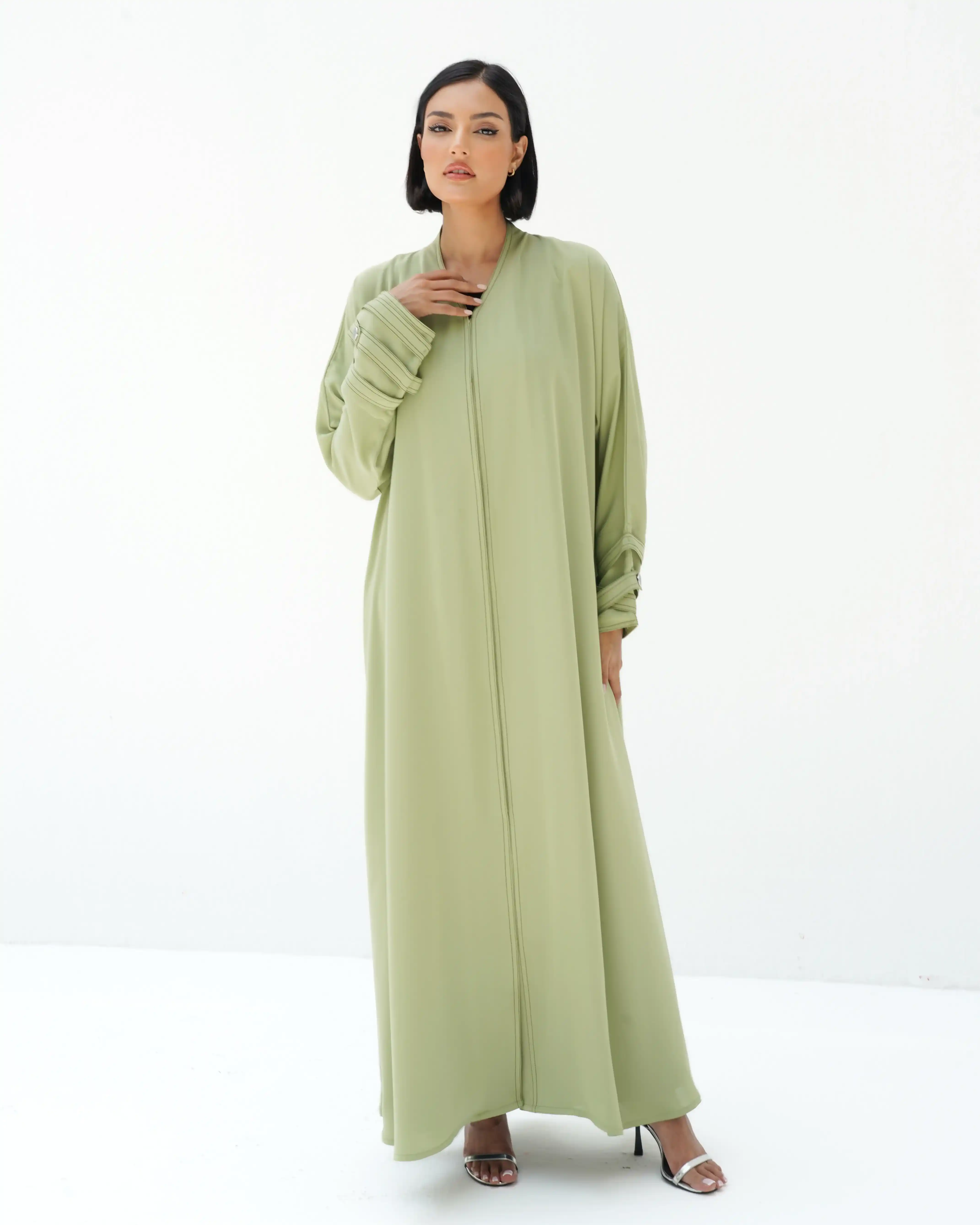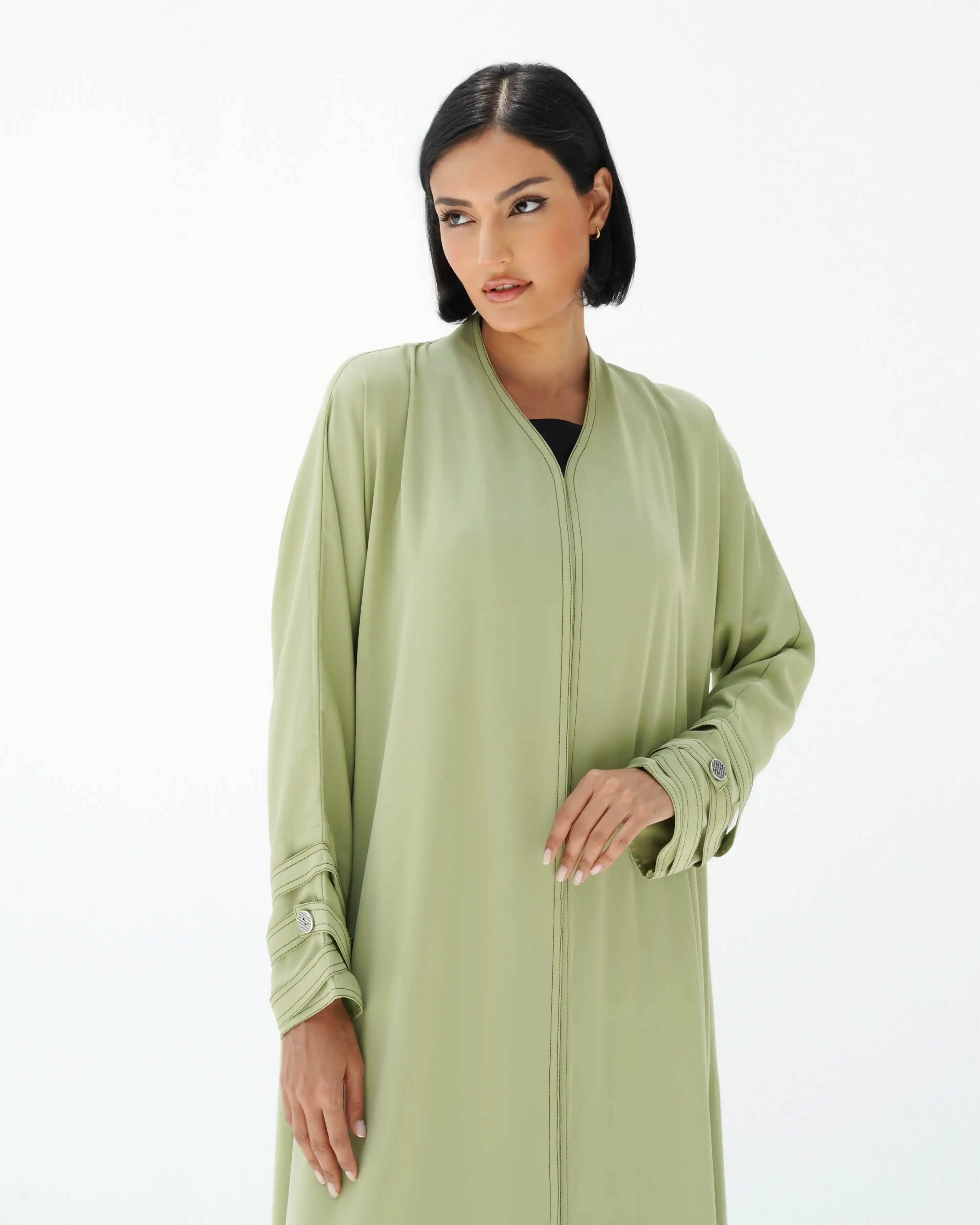 • لون أخضر ماتشا كامل العباية بخياطة ظاهرة في شرائط الاكمام باللون اخضر غامق.
