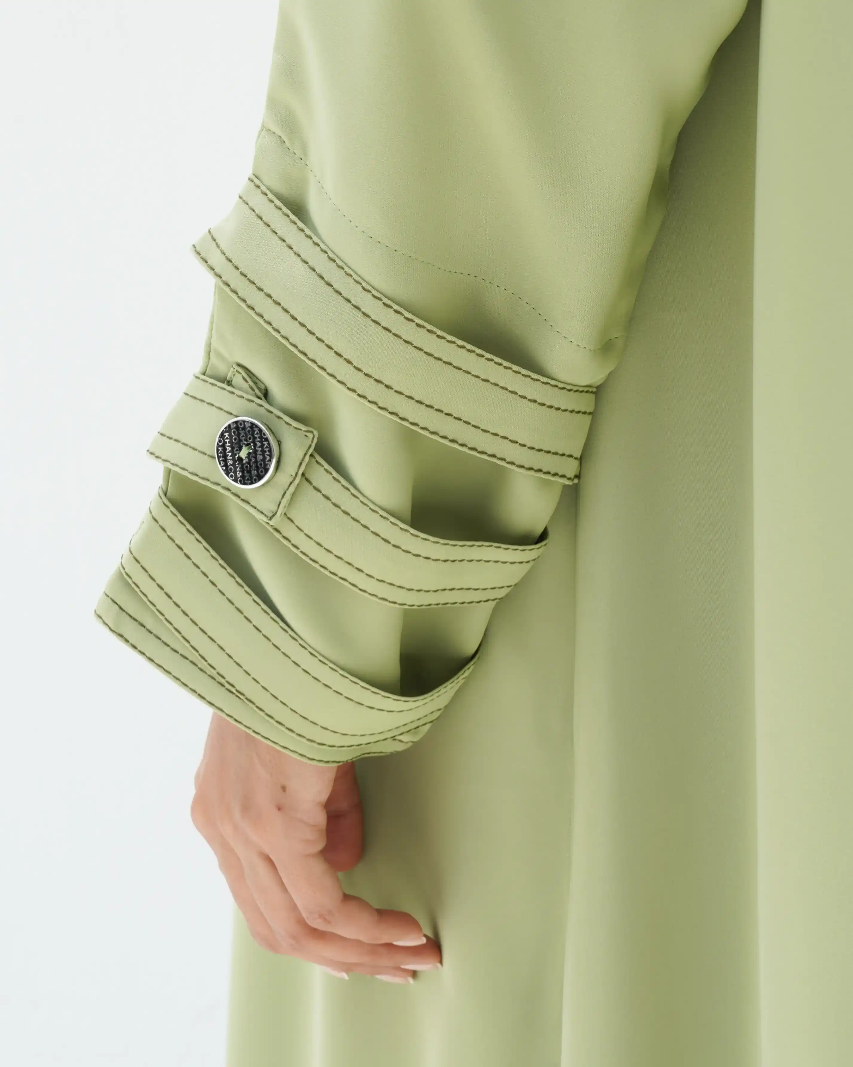 • الأكمام: مزينة بثلاثة أشرطة متتالية، كل شريط مزود بزر معدني دائري يحمل شعار KHAN&CO.، مع تحديد بخياطة باللون اخضر غامق بارزة.