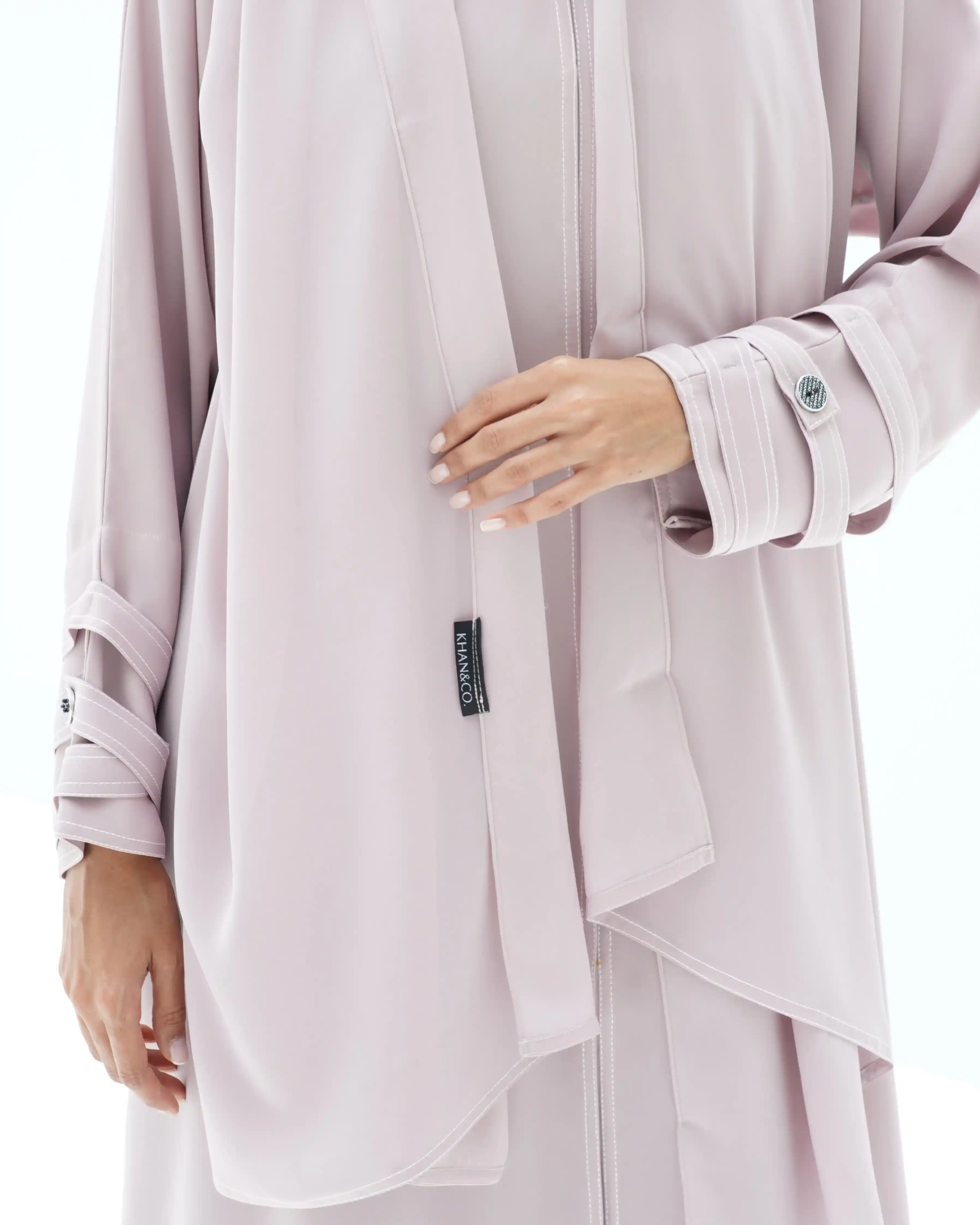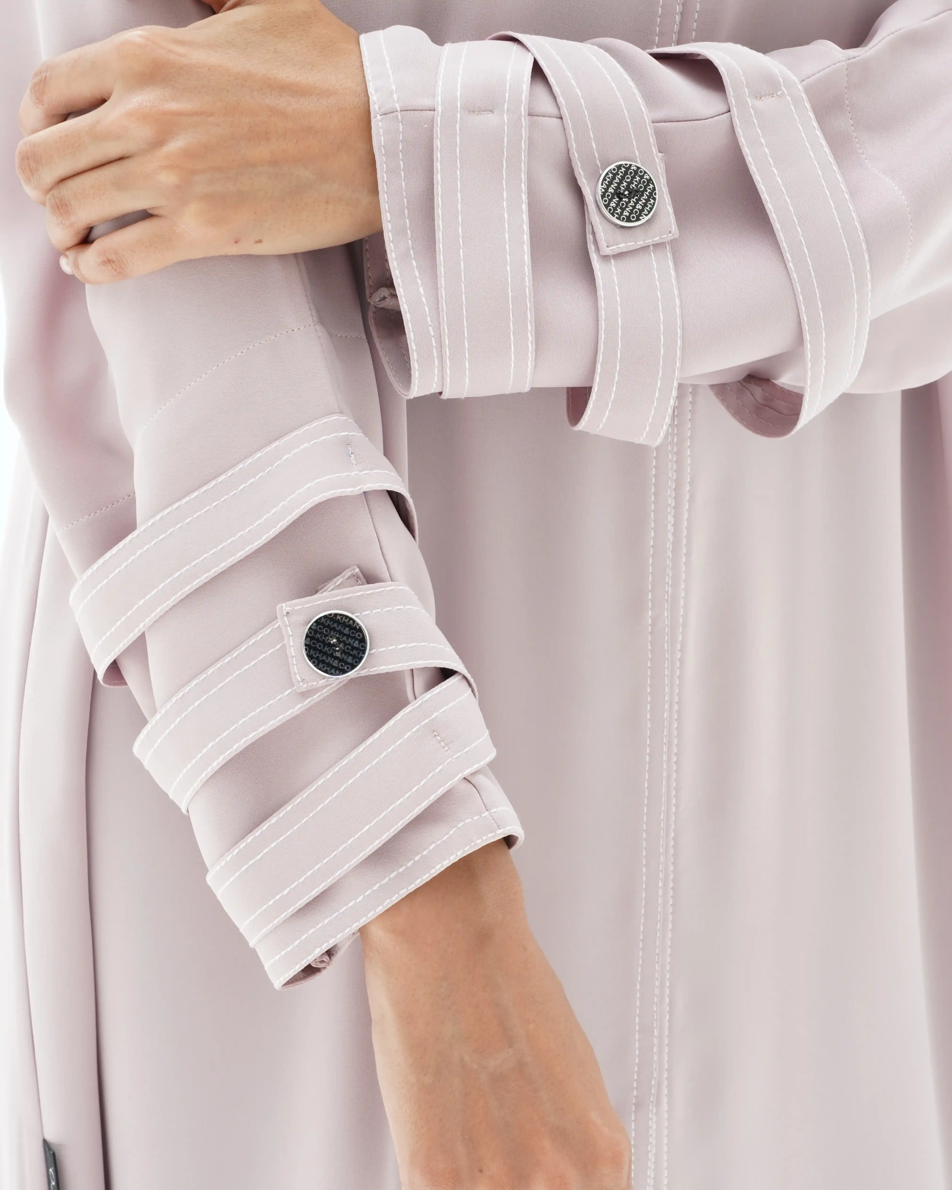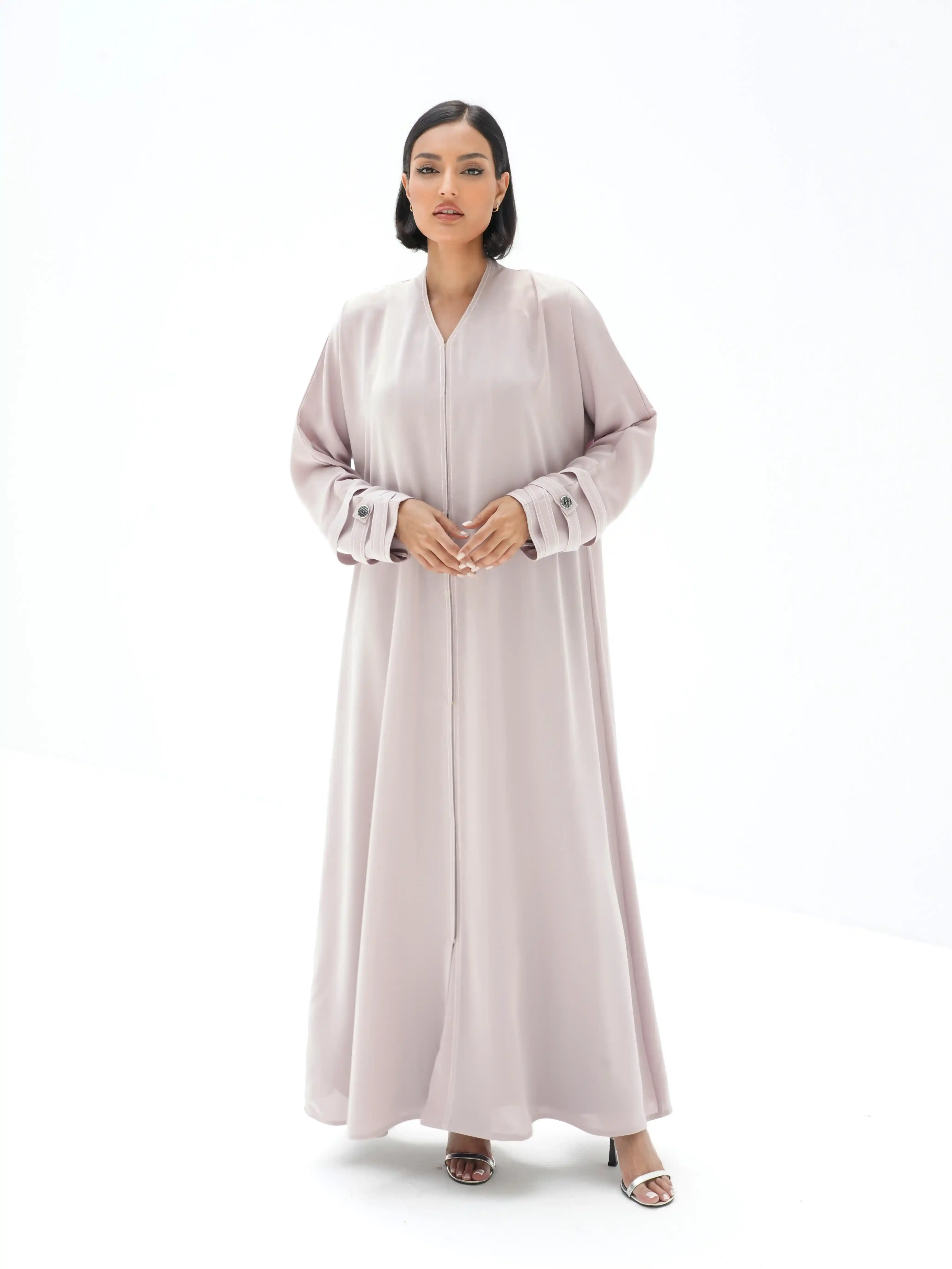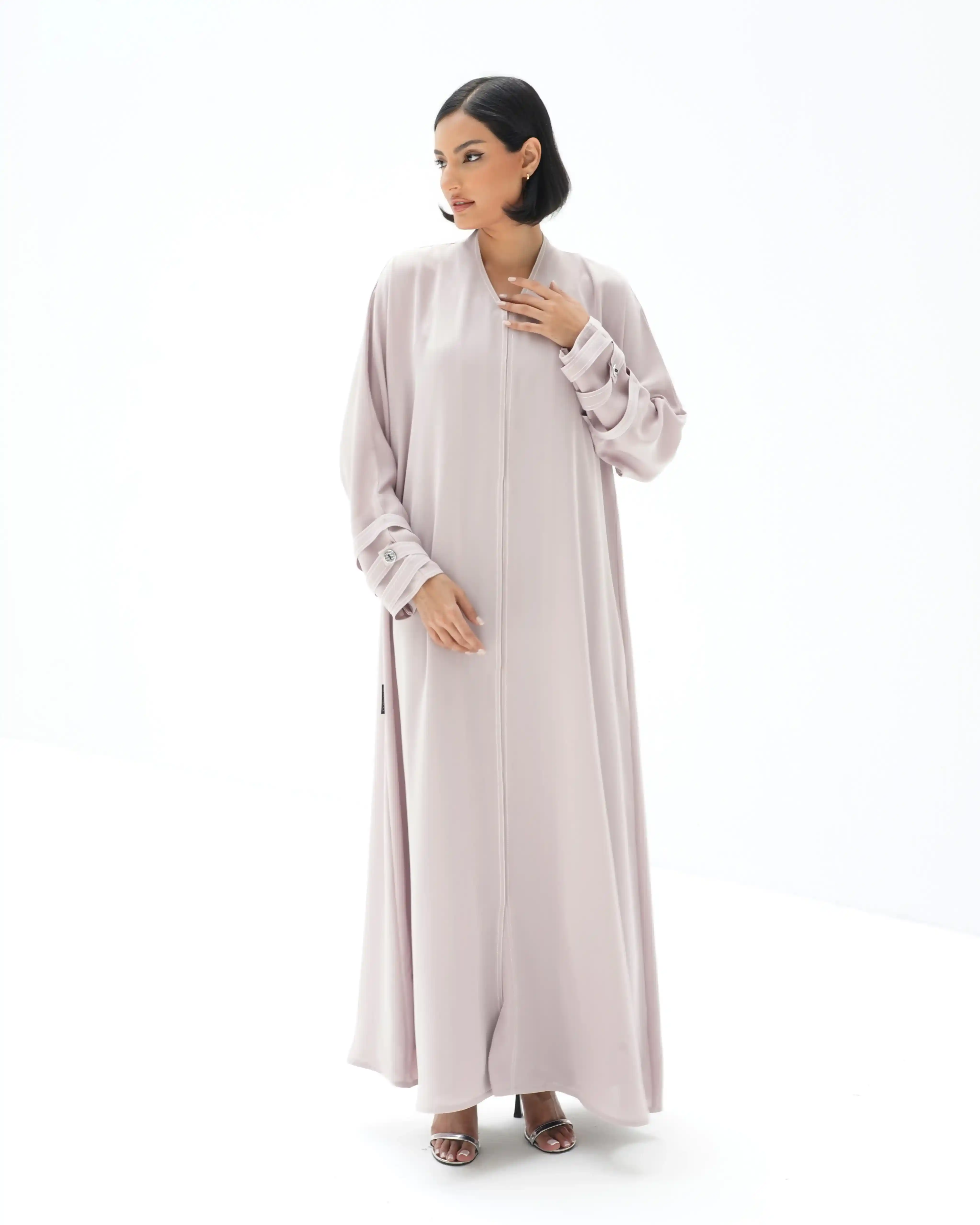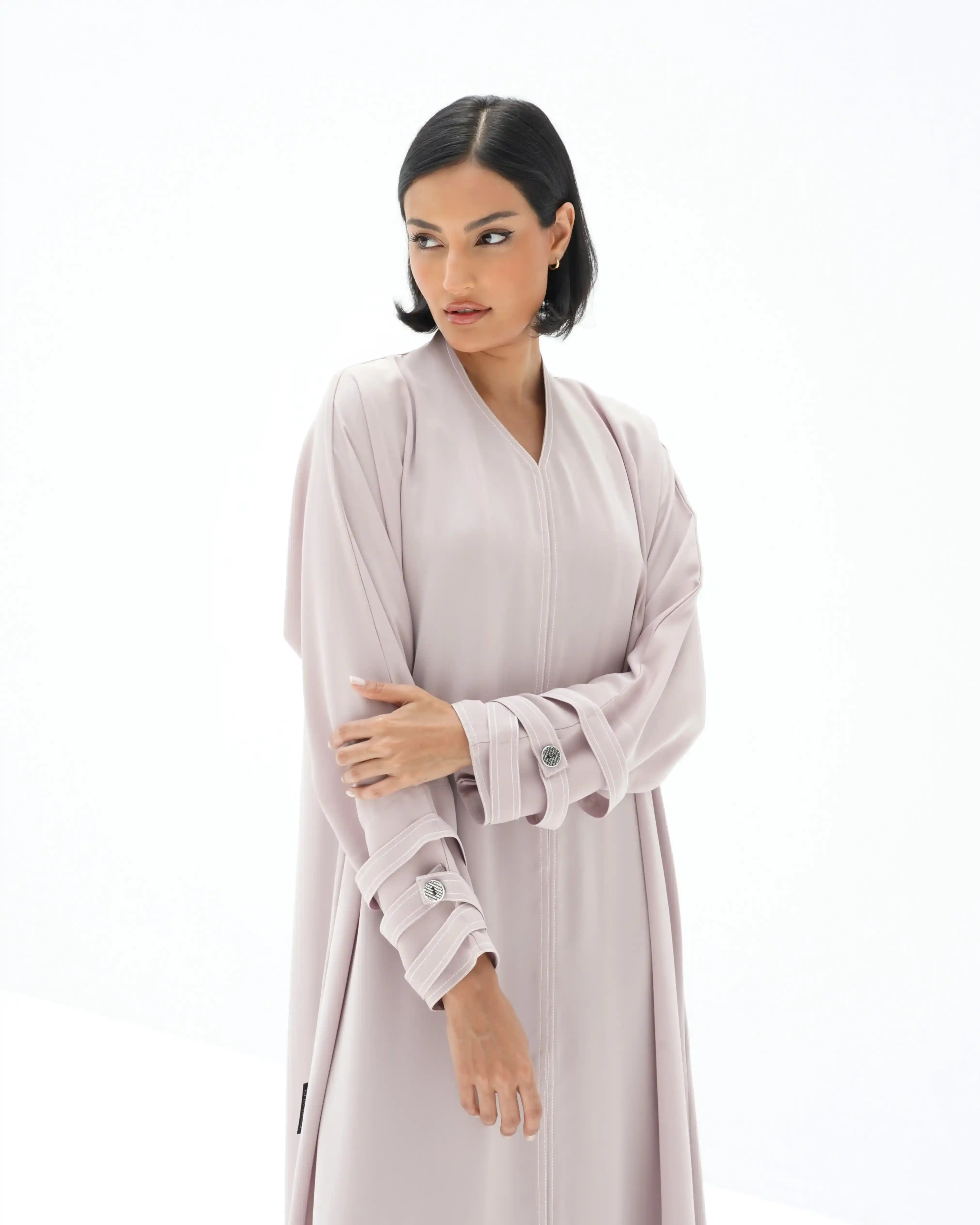 • لون نيود روز كامل العباية بخياطة ظاهرة في شرائط الاكمام باللون الرمادي.