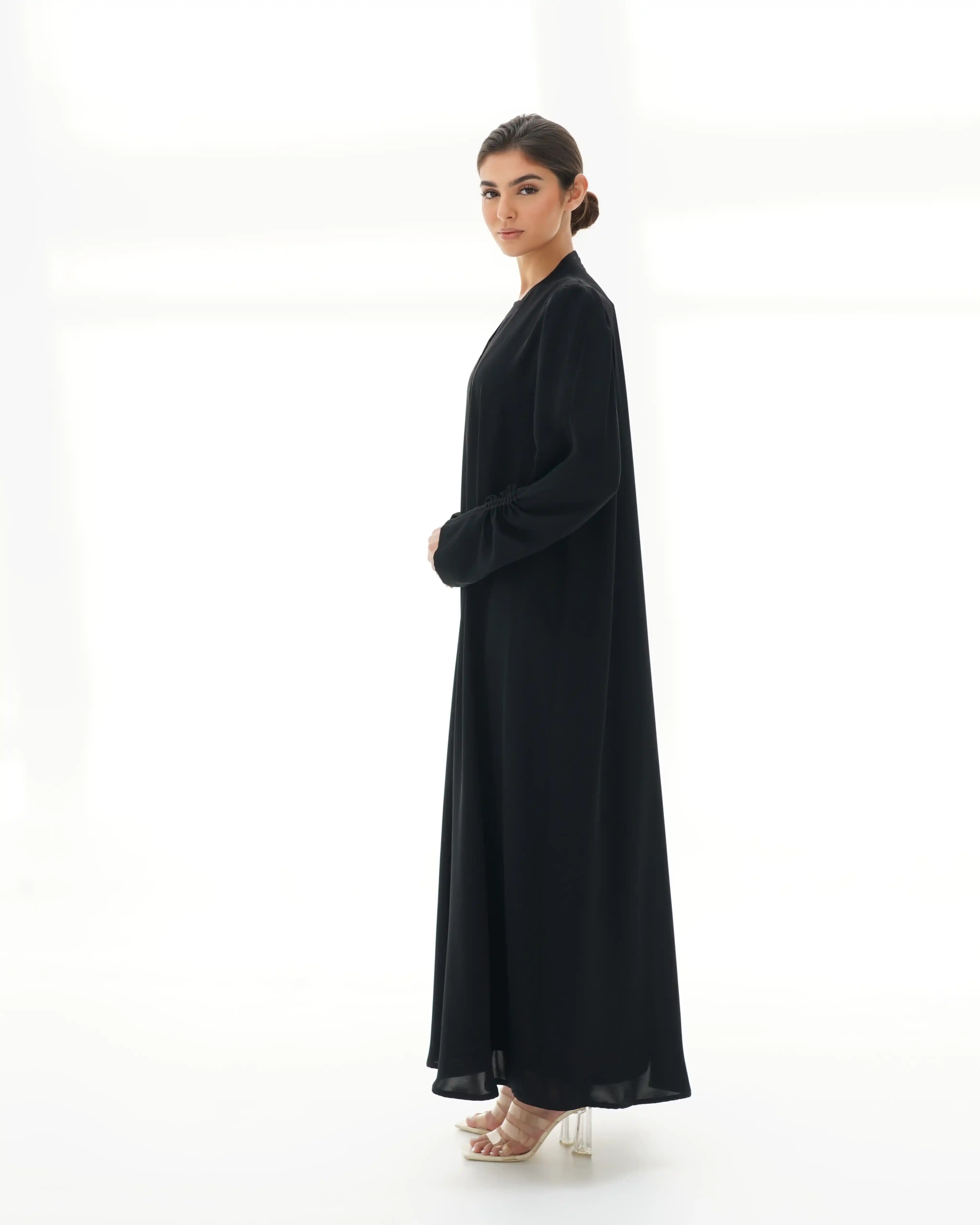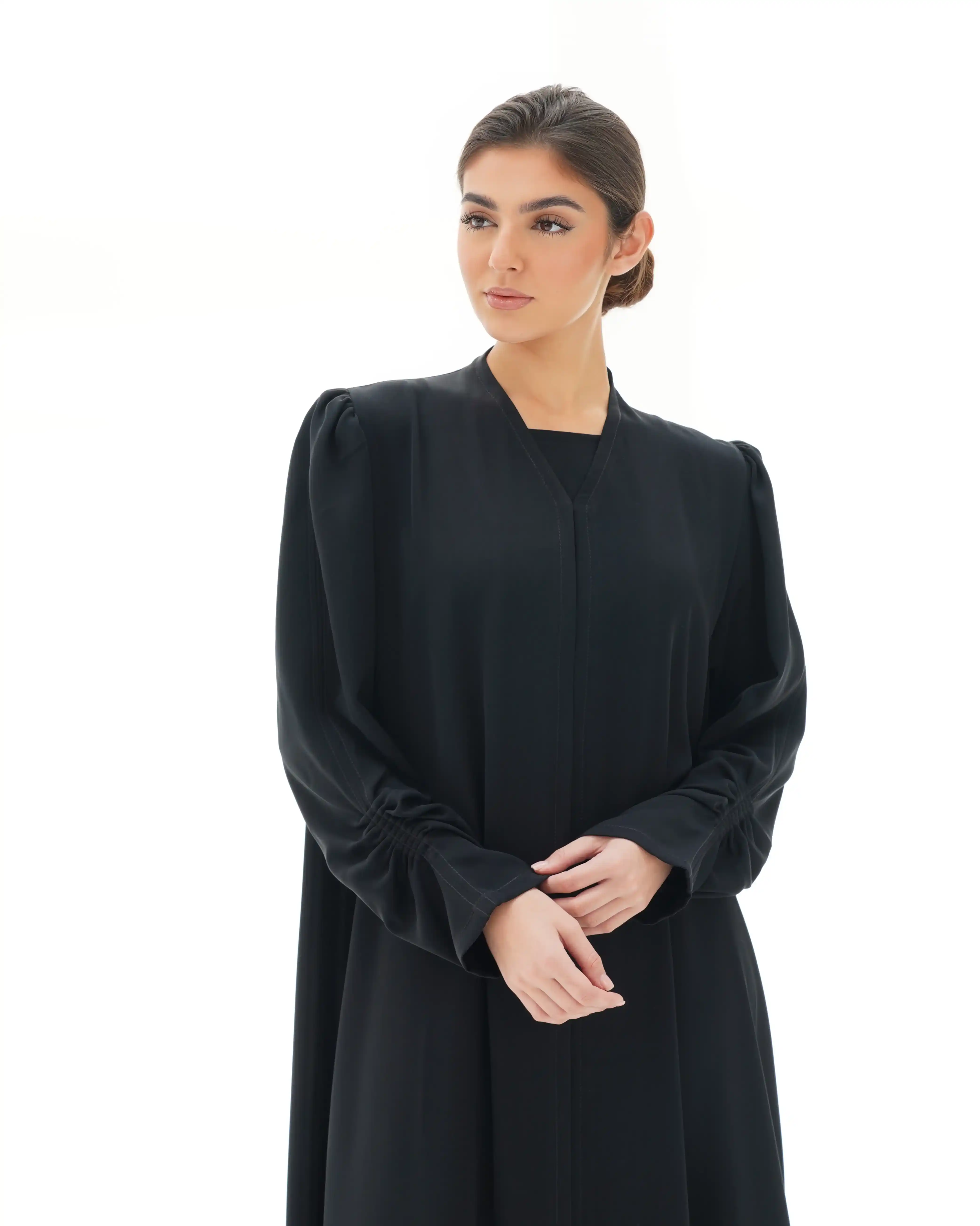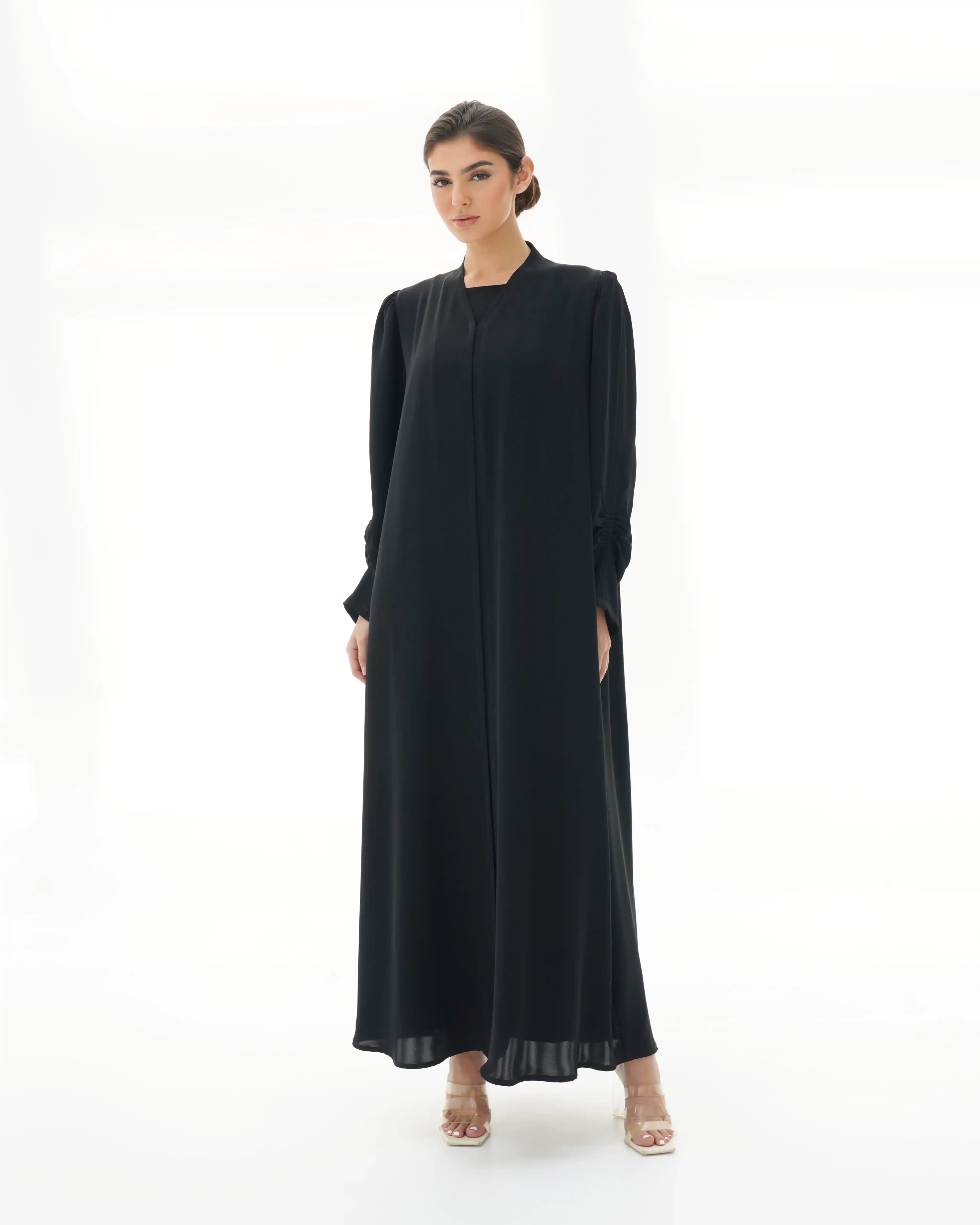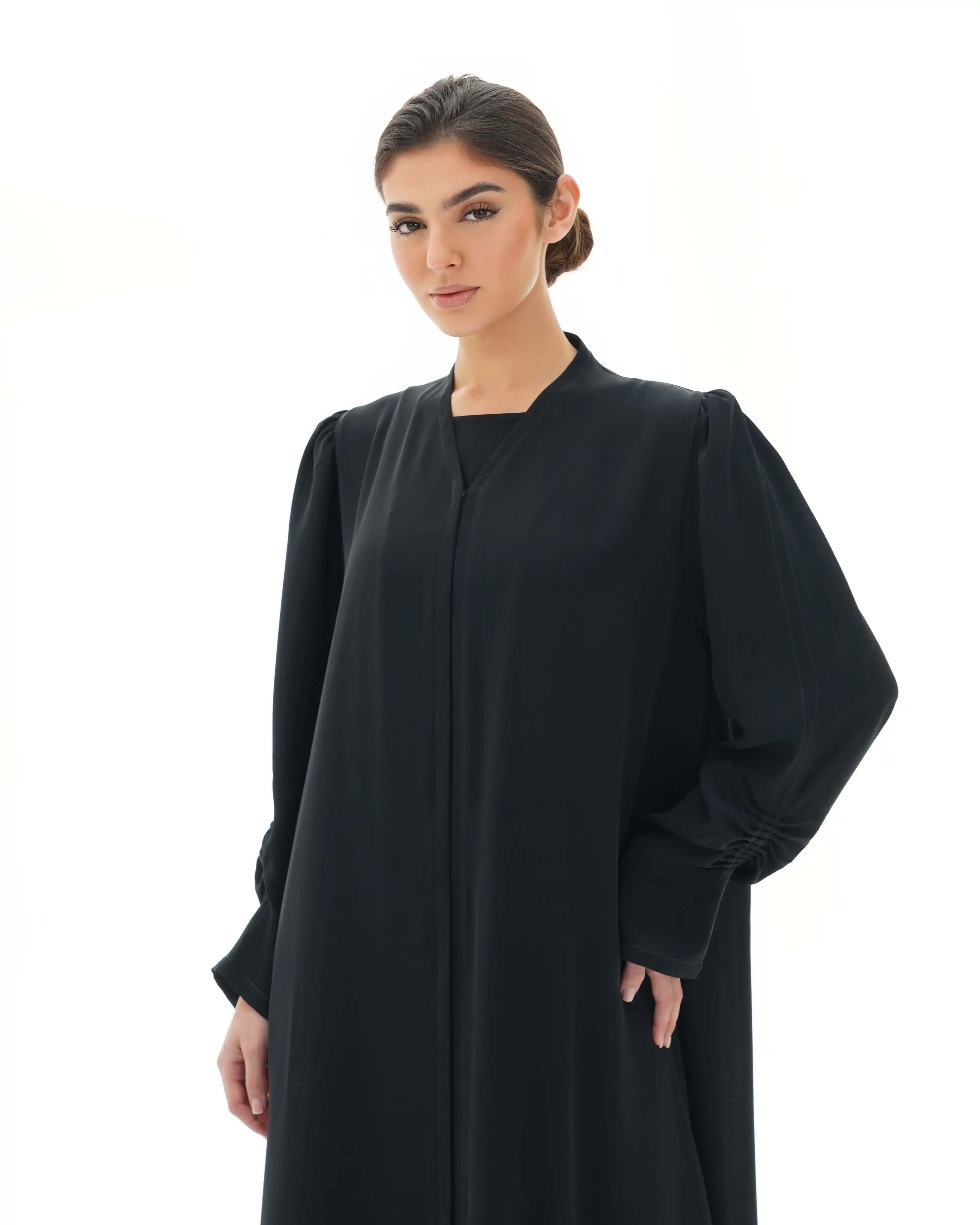 عباية مستقيمة منسدلة بتصميم نقي يعكس أناقة هادئة، من قماش البريميوم كريب بملمس ناعم وانسيابية متزنة. تبرز بياقة V بسيطة مع خياطة بارزة ممتدة من الأعلى حتى أسفل العباية لتعزّز الطول وتمنح القوام حضورًا متوازنًا. في بداية الأكمام، يظهر تجمع تدريجي ناعم عند منطقة الكتف يمنحها استقامة راقية مستوحاة من خطوط البليزر، بينما يتكرر التجمع في منتصف الكم كتموّج خفيف يضيف بعدًا حركيًا أنثويًا هادئًا. تعتمد العباية على إغلاق كامل مخفي بنظام طقطق، وتكتمل بطرحة سادة متناغمة بنفس اللون.