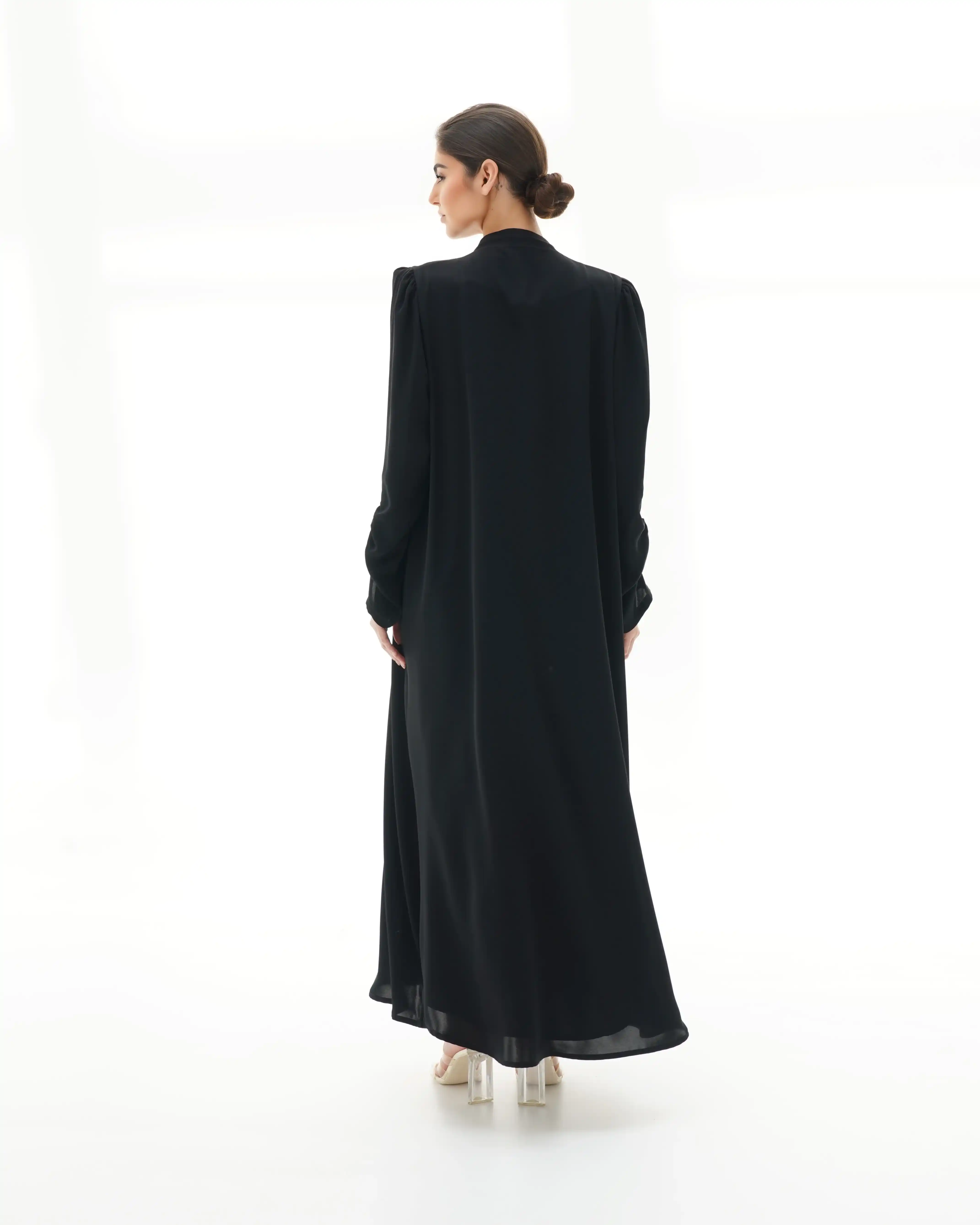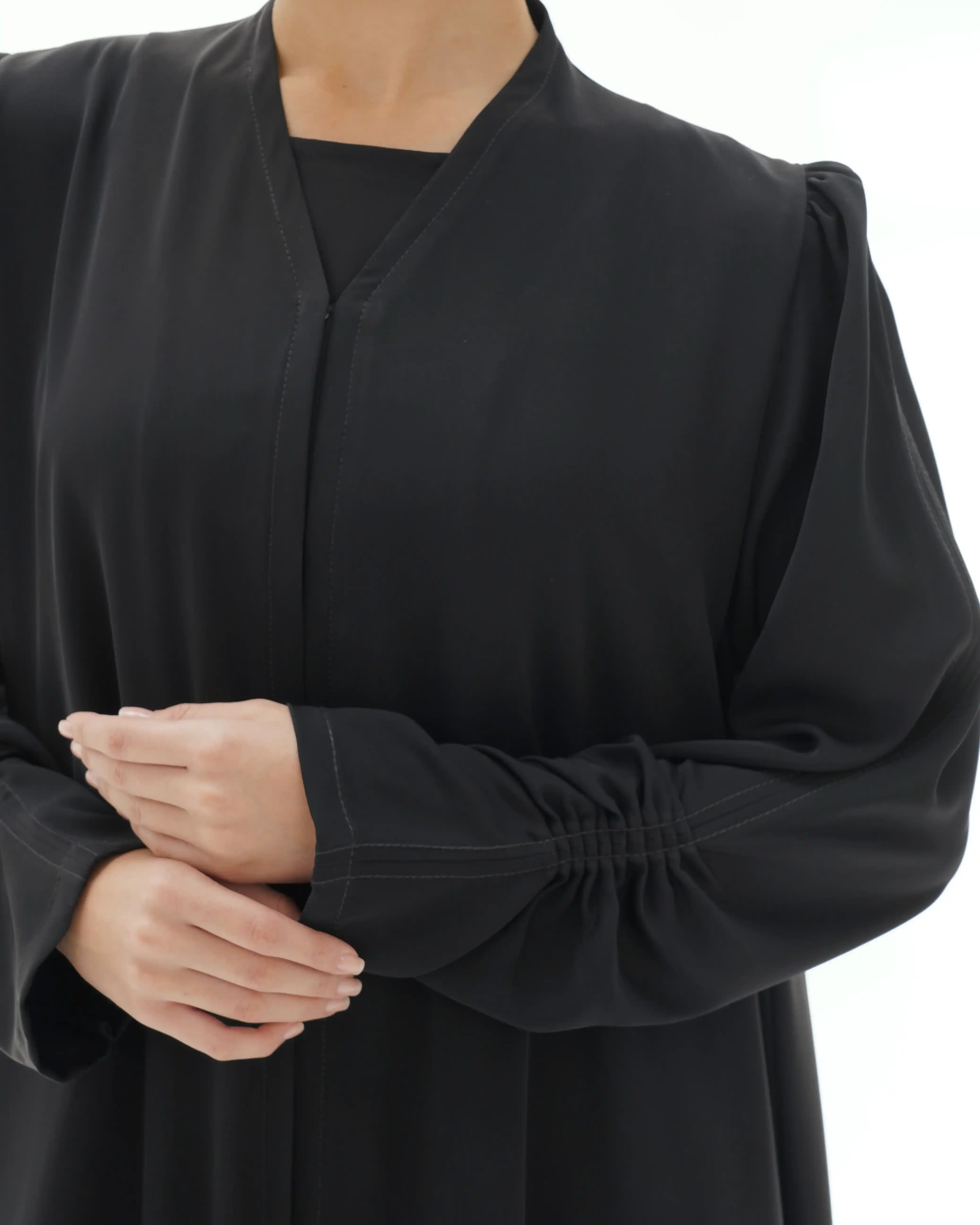 • لون اسود كامل العباية بخياطة ظاهرة باللون اسود.