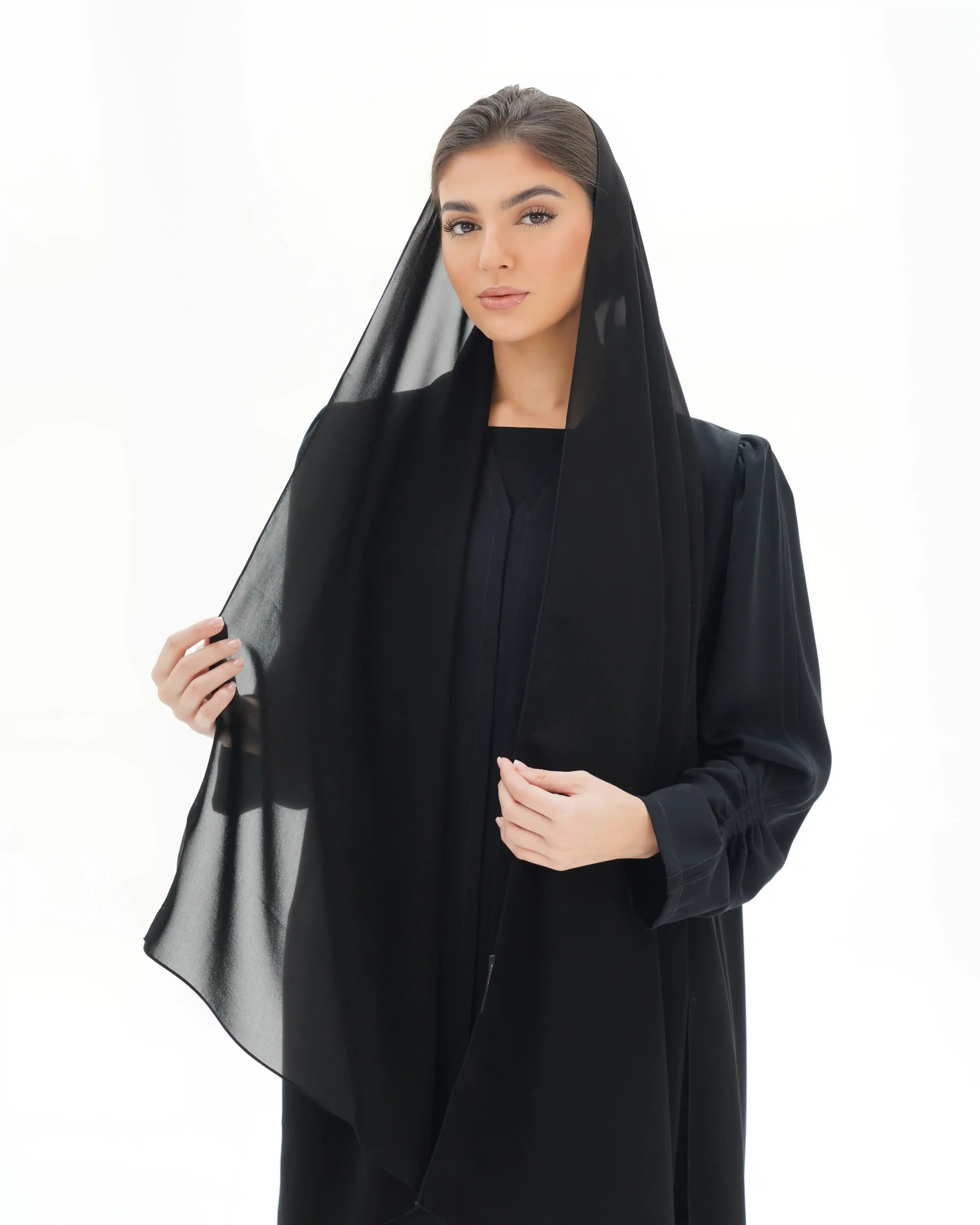 • طرحة سادة متناغمة بنفس لون العباية.