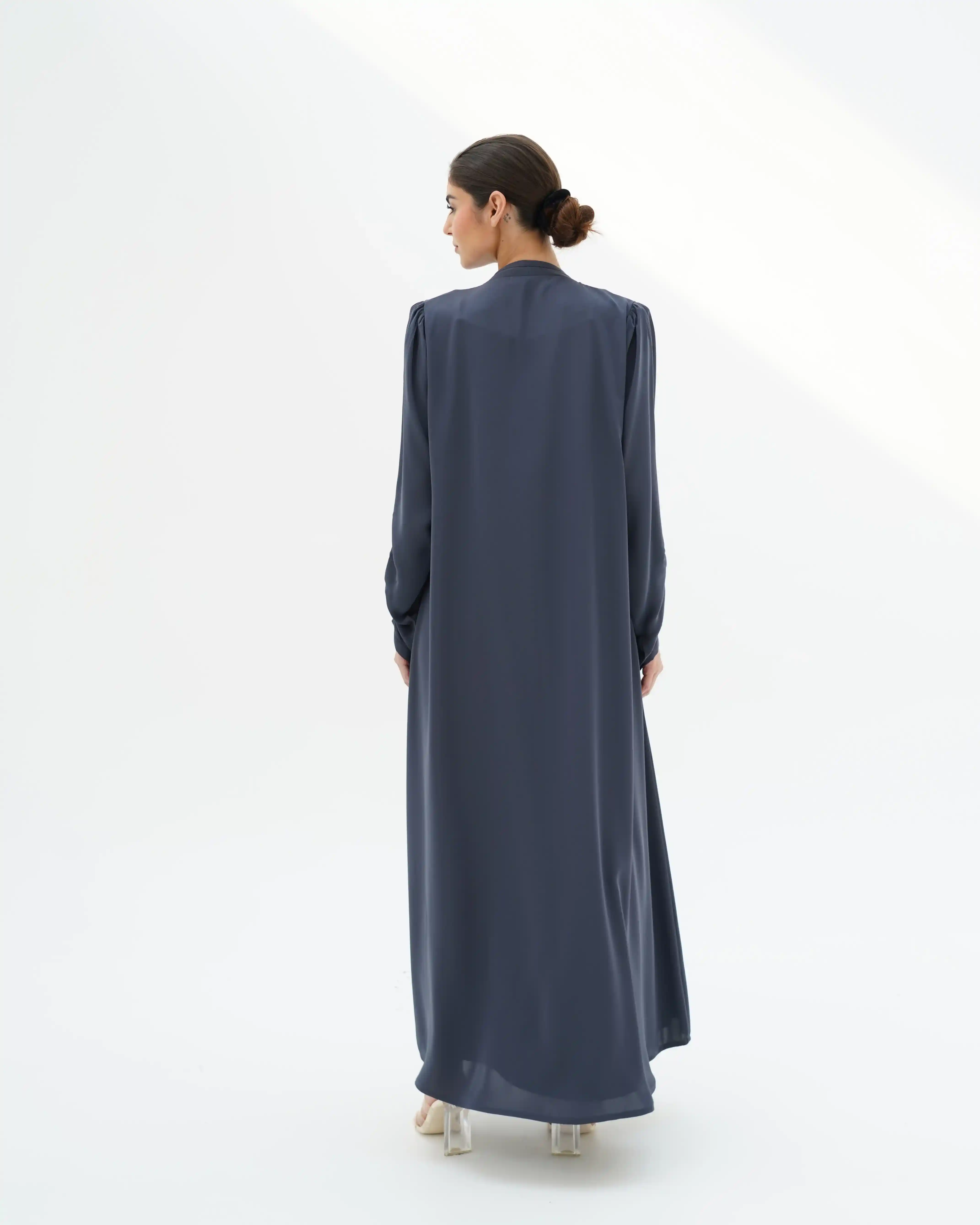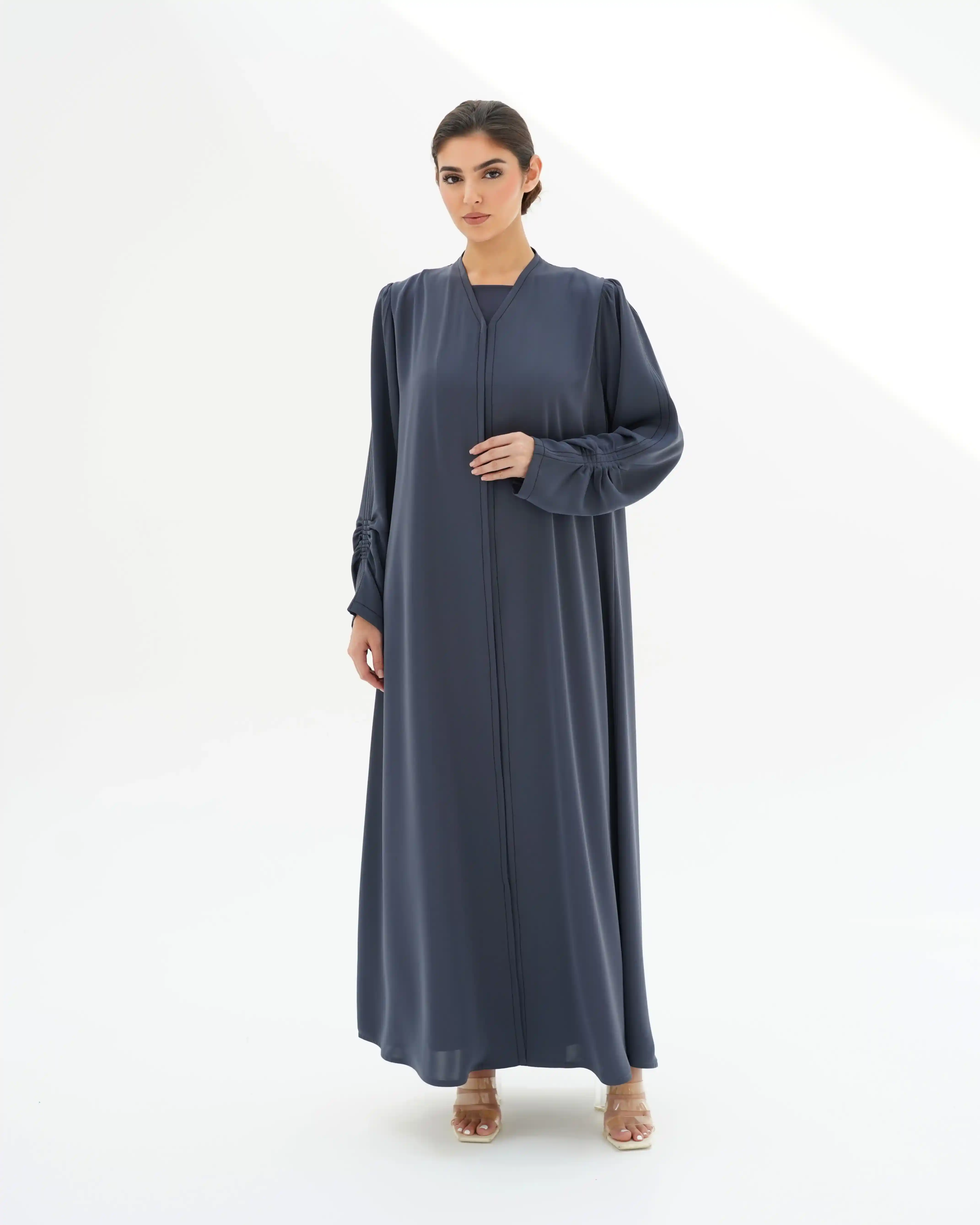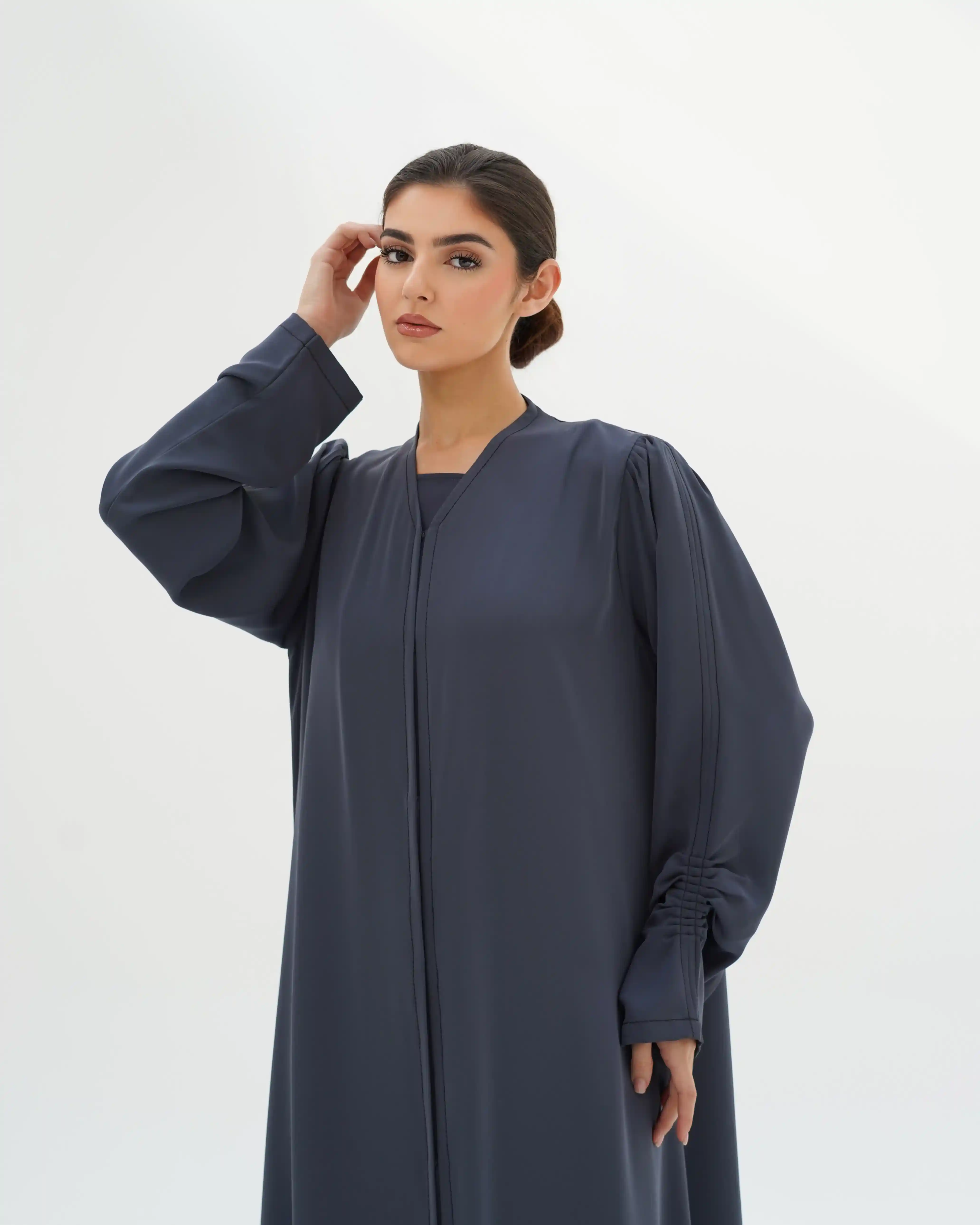 عباية مستقيمة منسدلة بتصميم نقي يعكس أناقة هادئة، من قماش البريميوم كريب بملمس ناعم وانسيابية متزنة. تبرز بياقة V بسيطة مع خياطة بارزة ممتدة من الأعلى حتى أسفل العباية لتعزّز الطول وتمنح القوام حضورًا متوازنًا. في بداية الأكمام، يظهر تجمع تدريجي ناعم عند منطقة الكتف يمنحها استقامة راقية مستوحاة من خطوط البليزر، بينما يتكرر التجمع في منتصف الكم كتموّج خفيف يضيف بعدًا حركيًا أنثويًا هادئًا. تعتمد العباية على إغلاق كامل مخفي بنظام طقطق، وتكتمل بطرحة سادة متناغمة بنفس اللون.