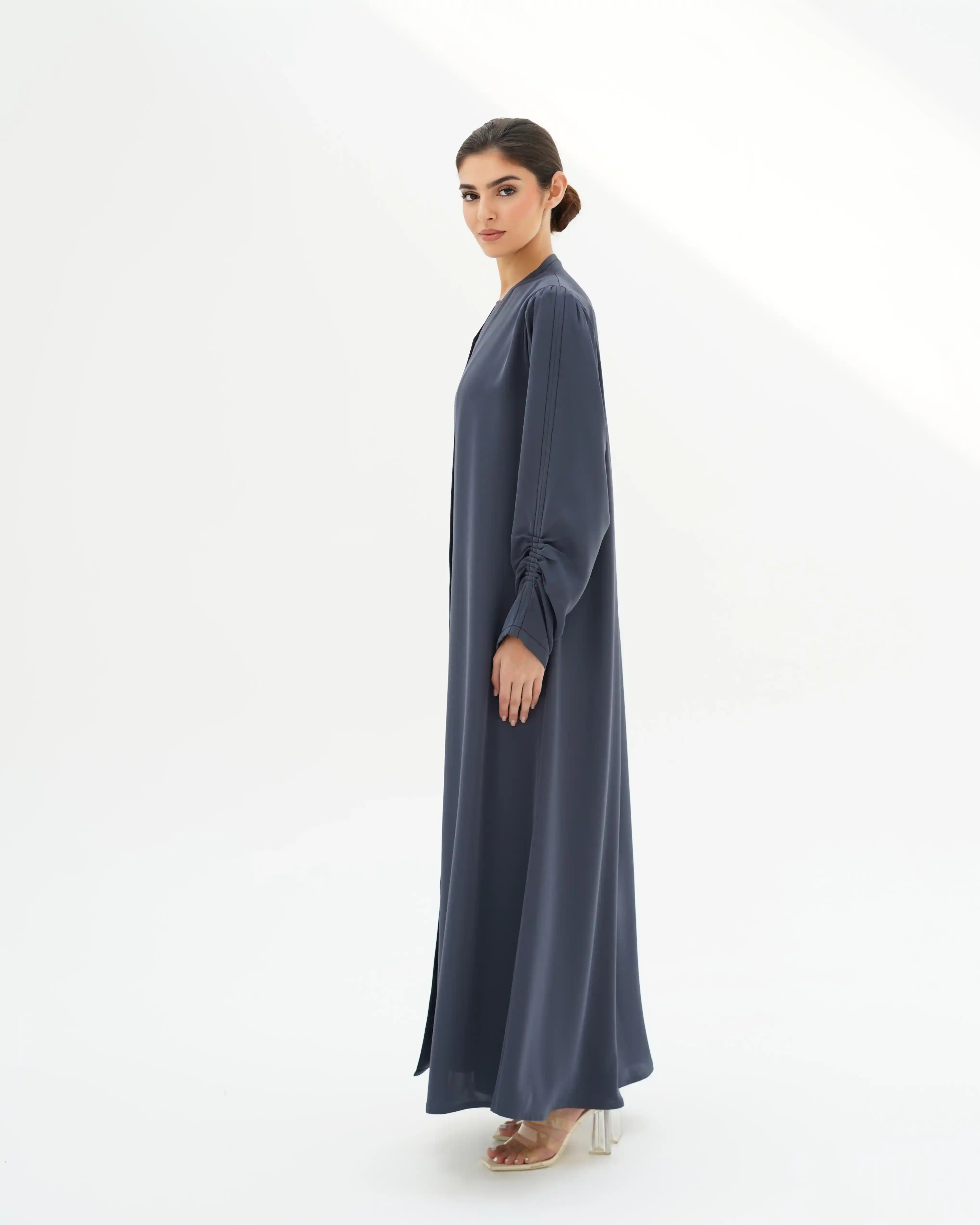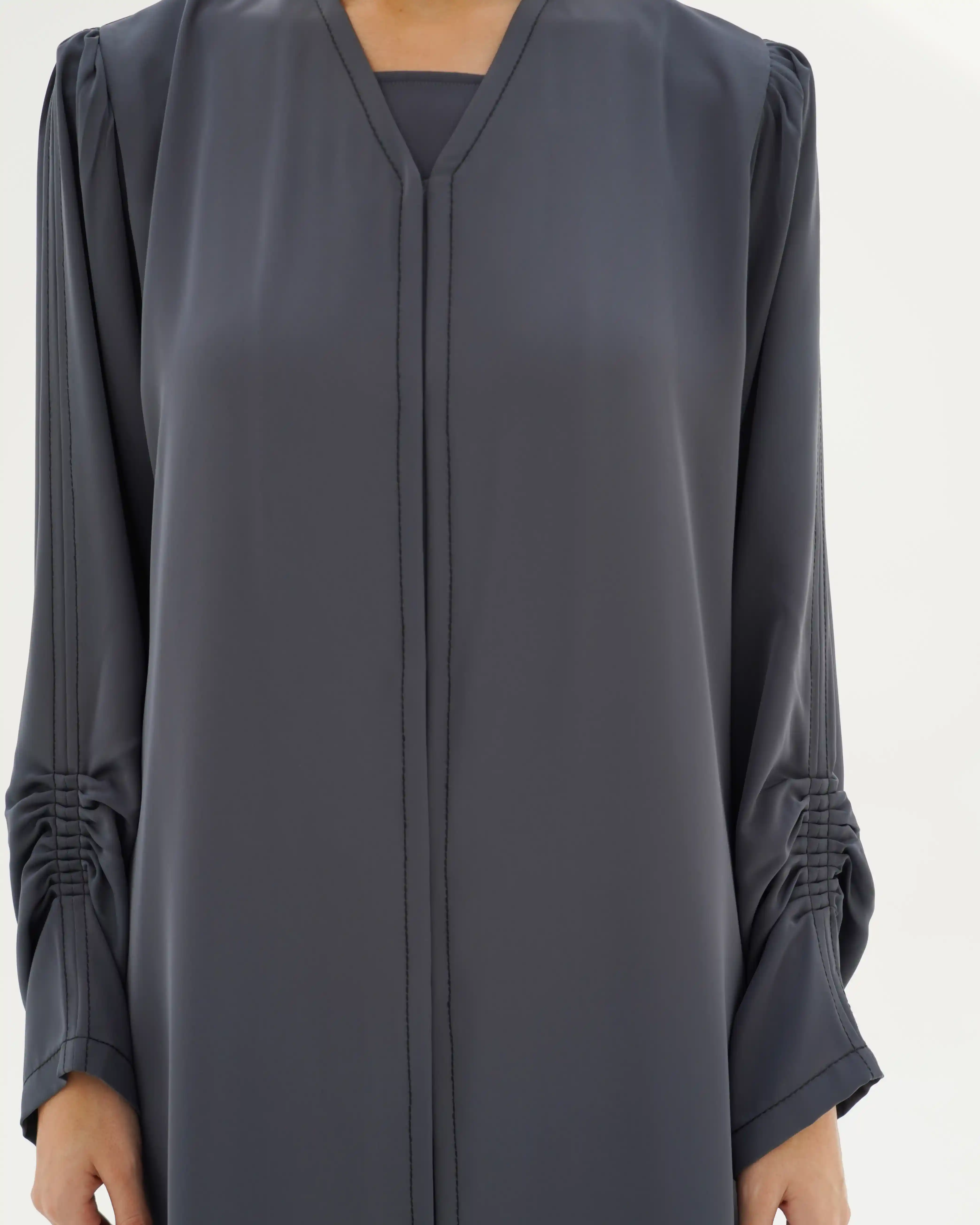 • لون رمادي كامل العباية بخياطة ظاهرة باللون اسود.
