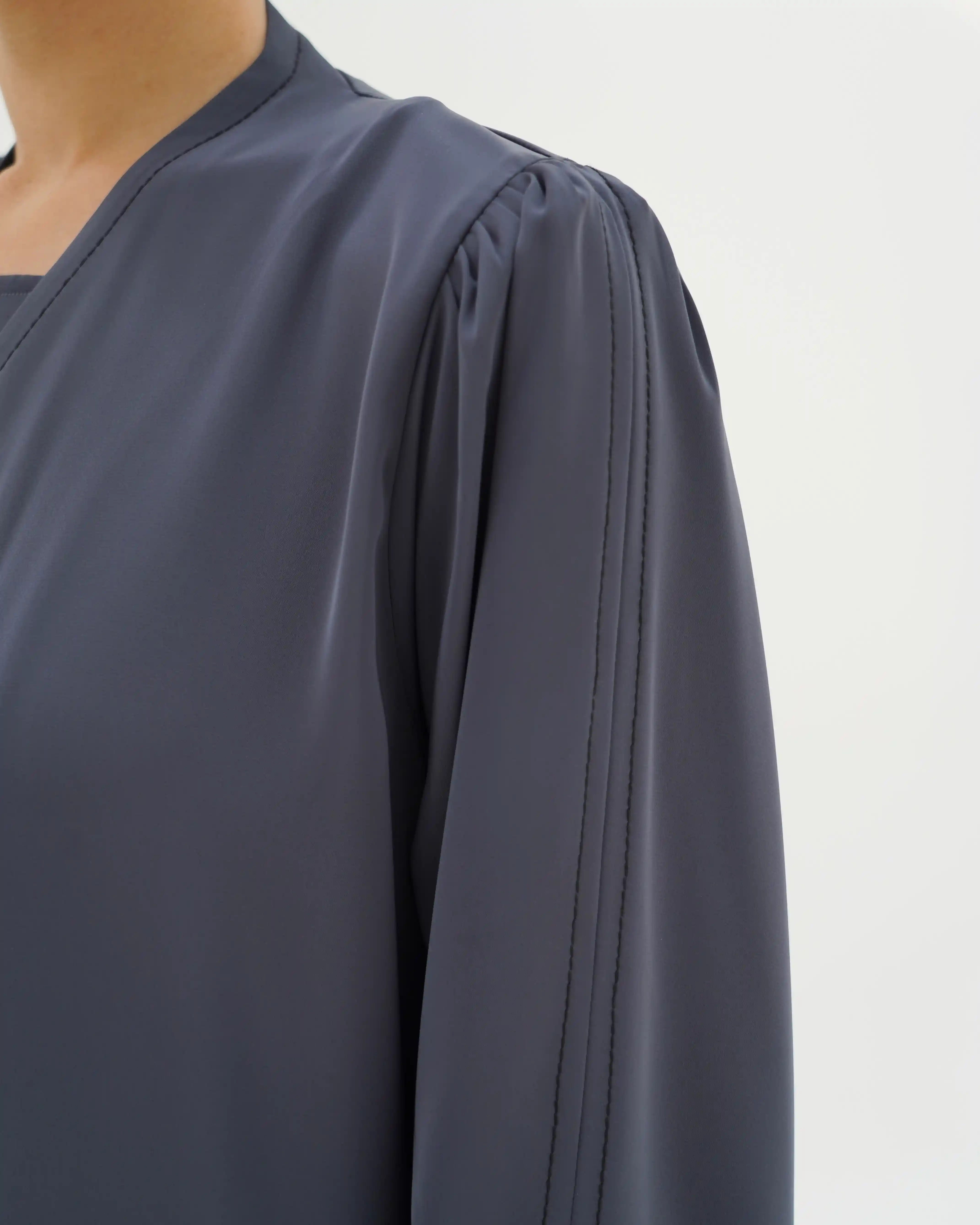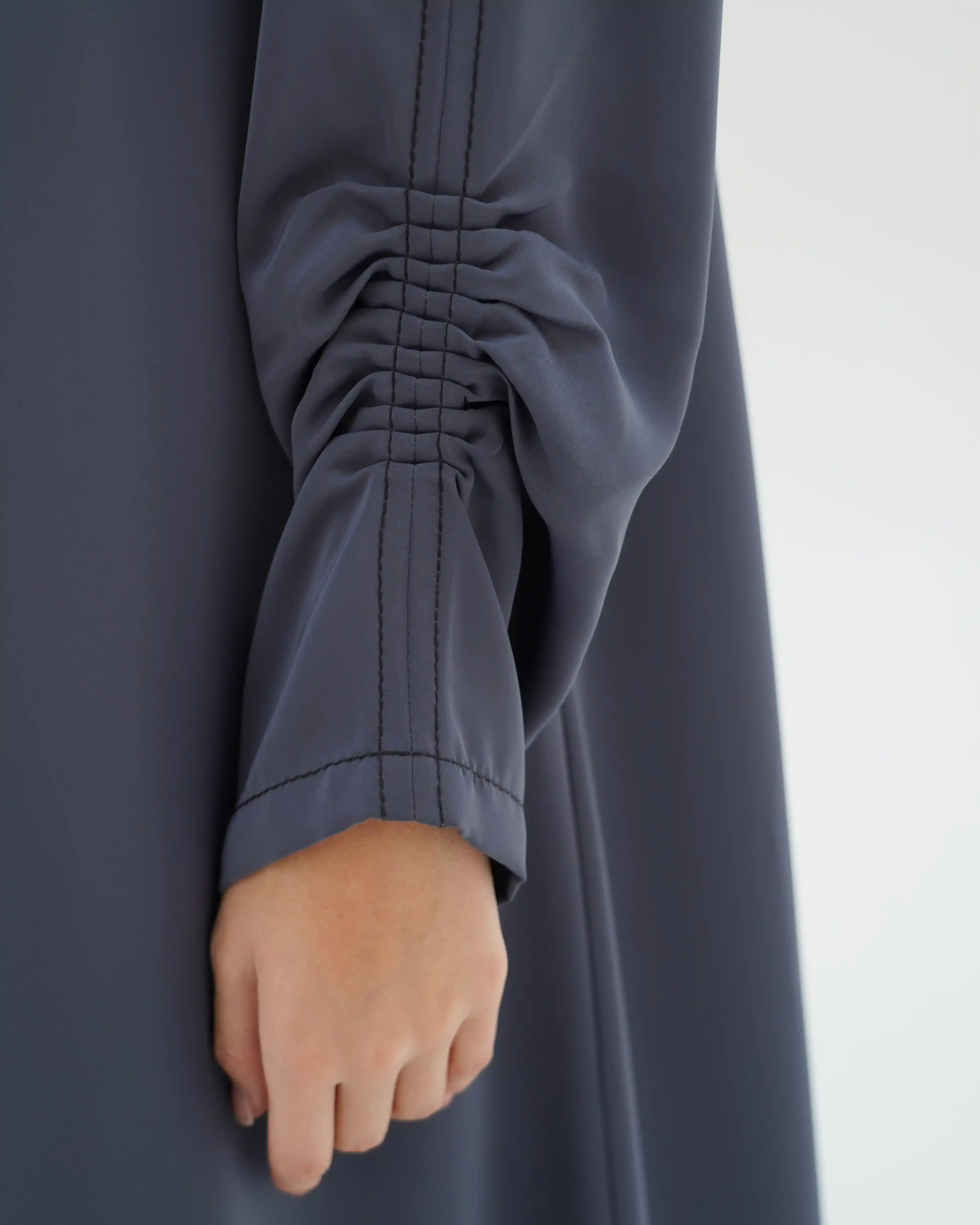 • تجمع ناعم في منتصف الأكمام يخلق تموّجًا أنثويًا هادئًا.