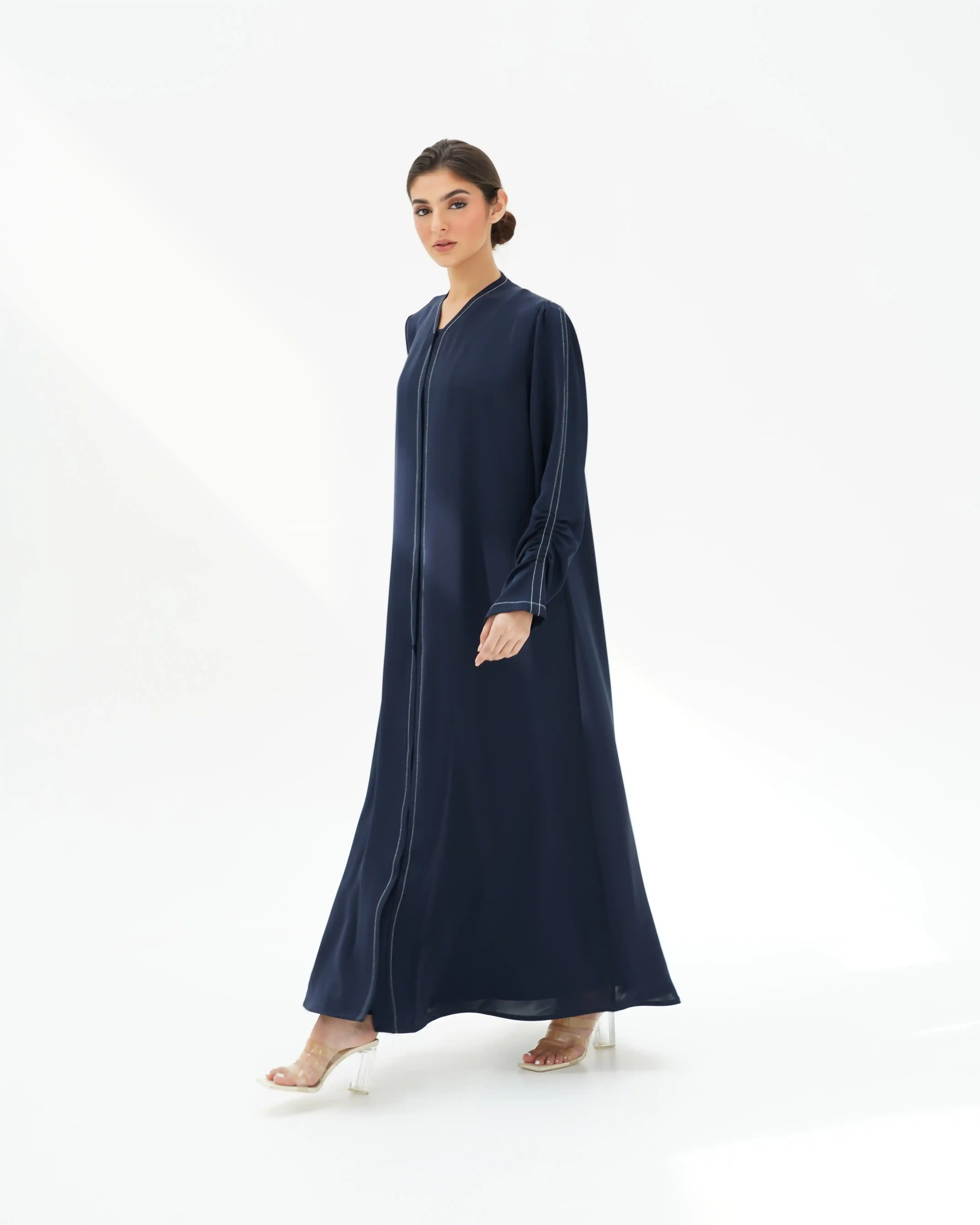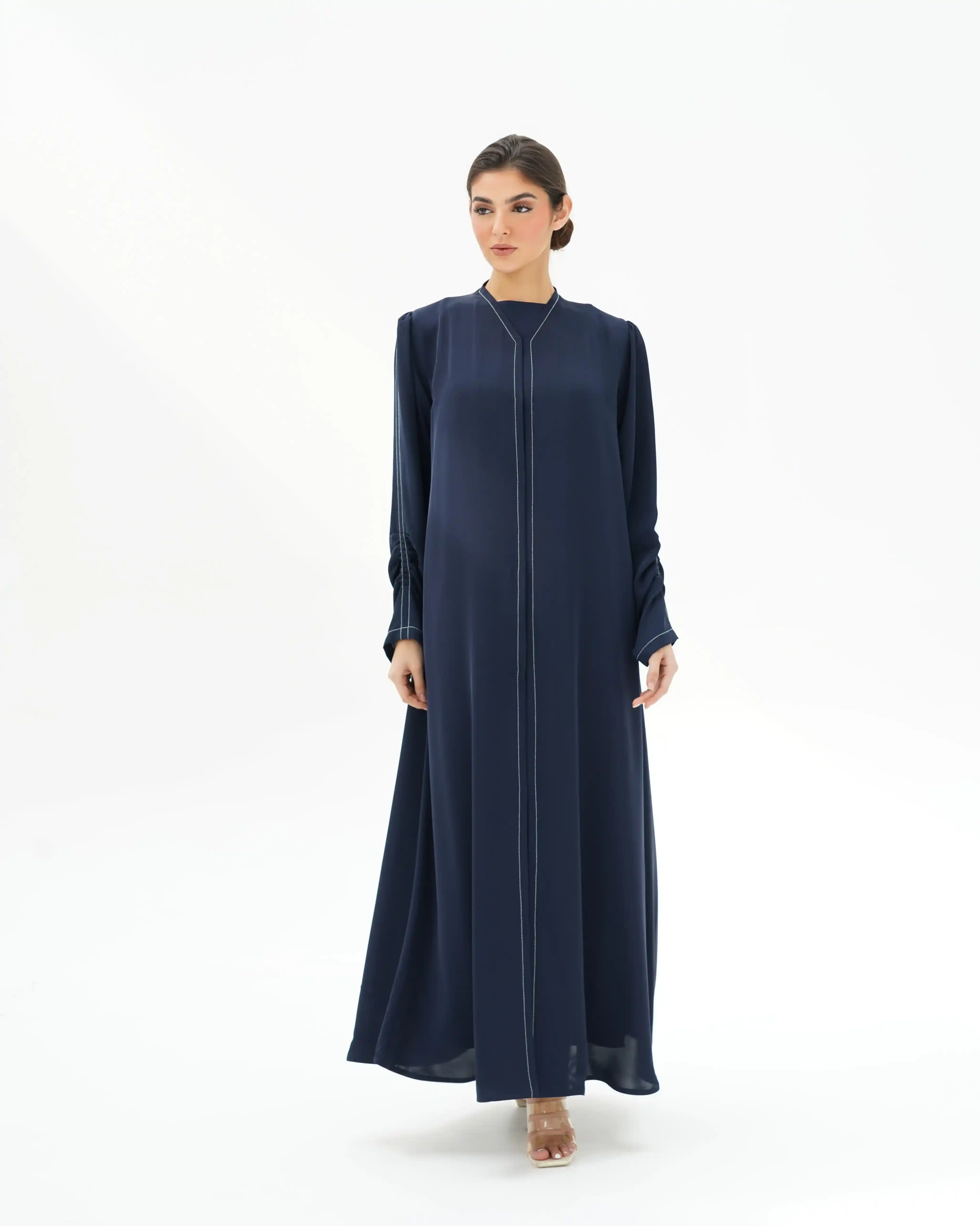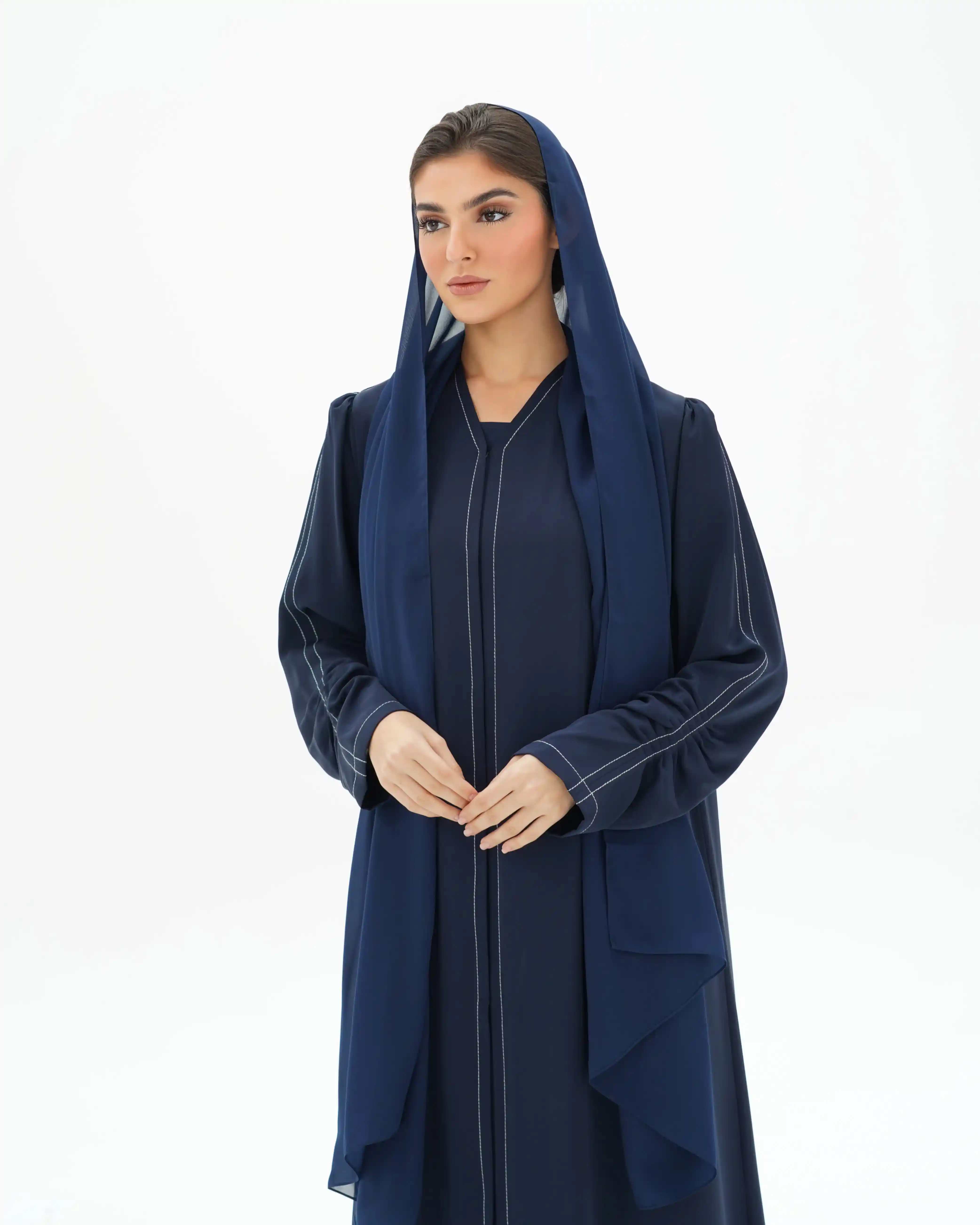 عباية مستقيمة منسدلة بتصميم نقي يعكس أناقة هادئة، من قماش البريميوم كريب بملمس ناعم وانسيابية متزنة. تبرز بياقة V بسيطة مع خياطة بارزة ممتدة من الأعلى حتى أسفل العباية لتعزّز الطول وتمنح القوام حضورًا متوازنًا. في بداية الأكمام، يظهر تجمع تدريجي ناعم عند منطقة الكتف يمنحها استقامة راقية مستوحاة من خطوط البليزر، بينما يتكرر التجمع في منتصف الكم كتموّج خفيف يضيف بعدًا حركيًا أنثويًا هادئًا. تعتمد العباية على إغلاق كامل مخفي بنظام طقطق، وتكتمل بطرحة سادة متناغمة بنفس اللون.