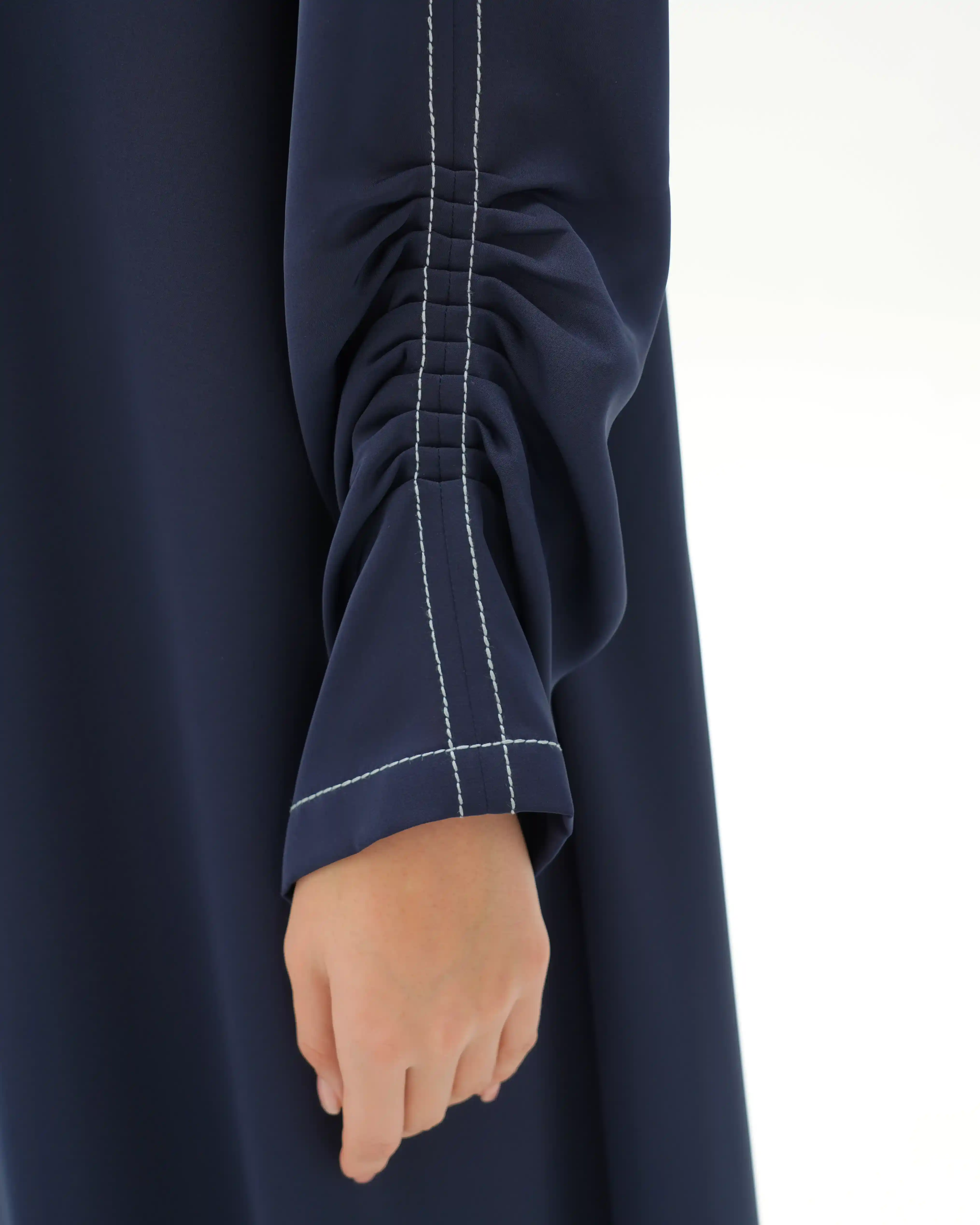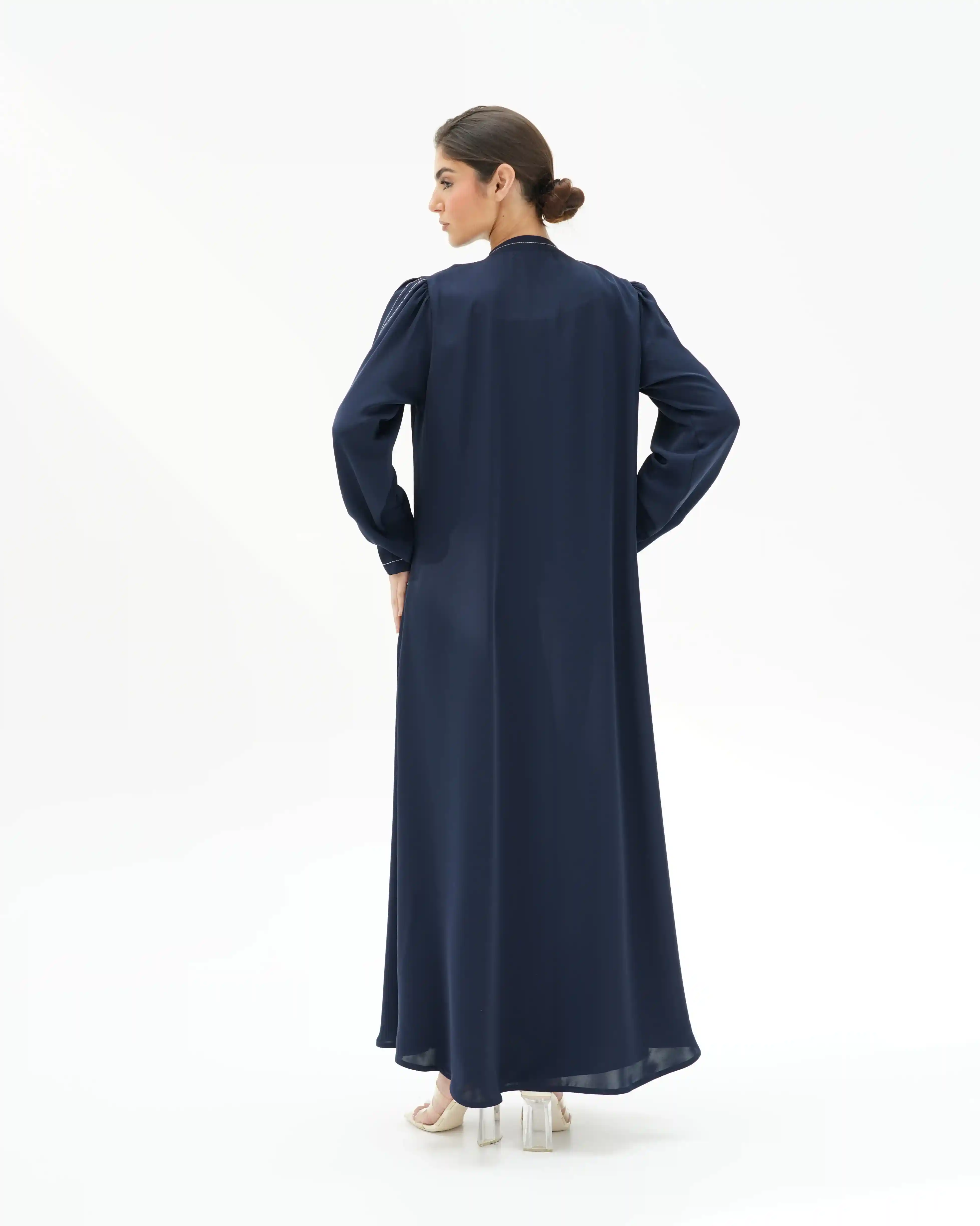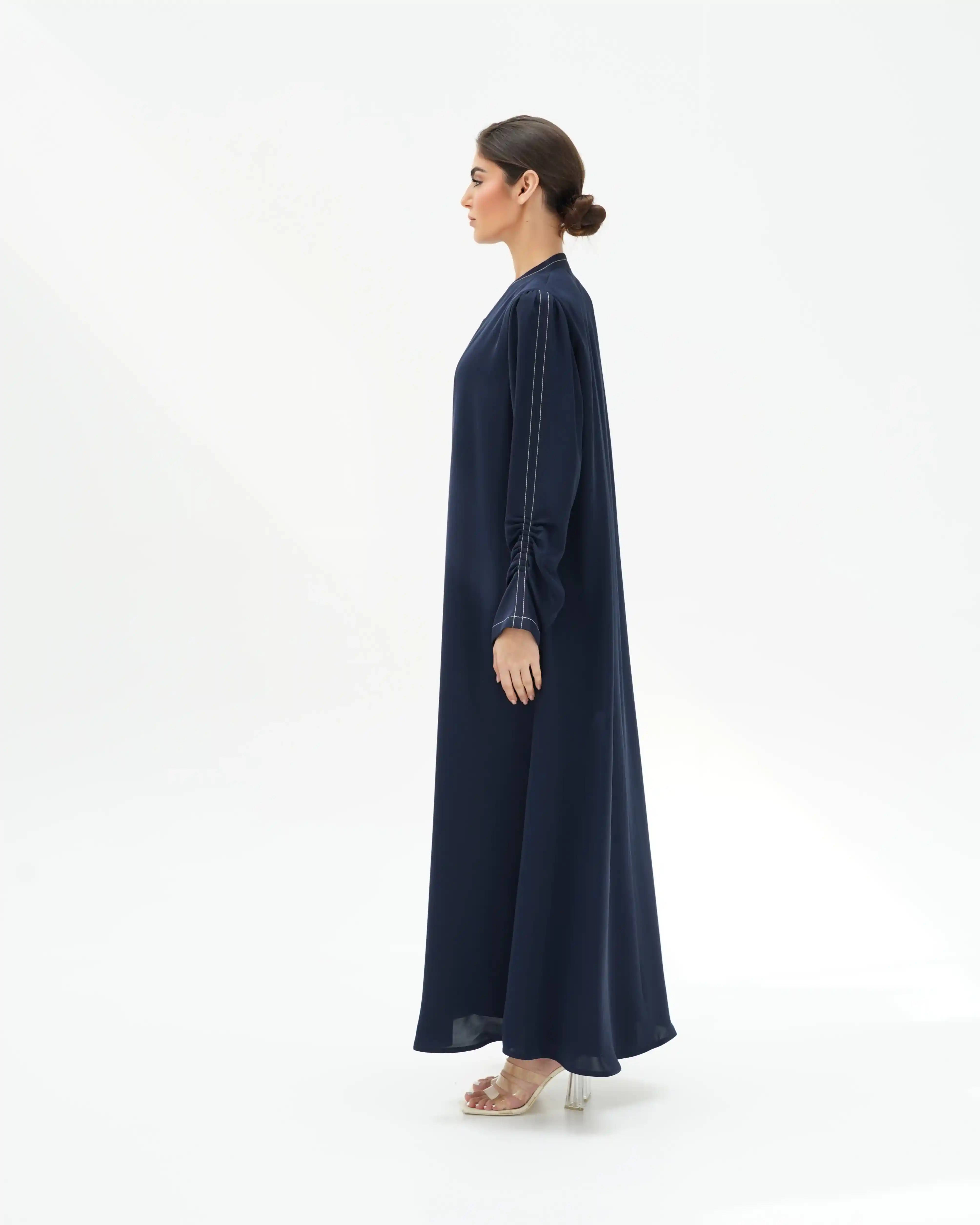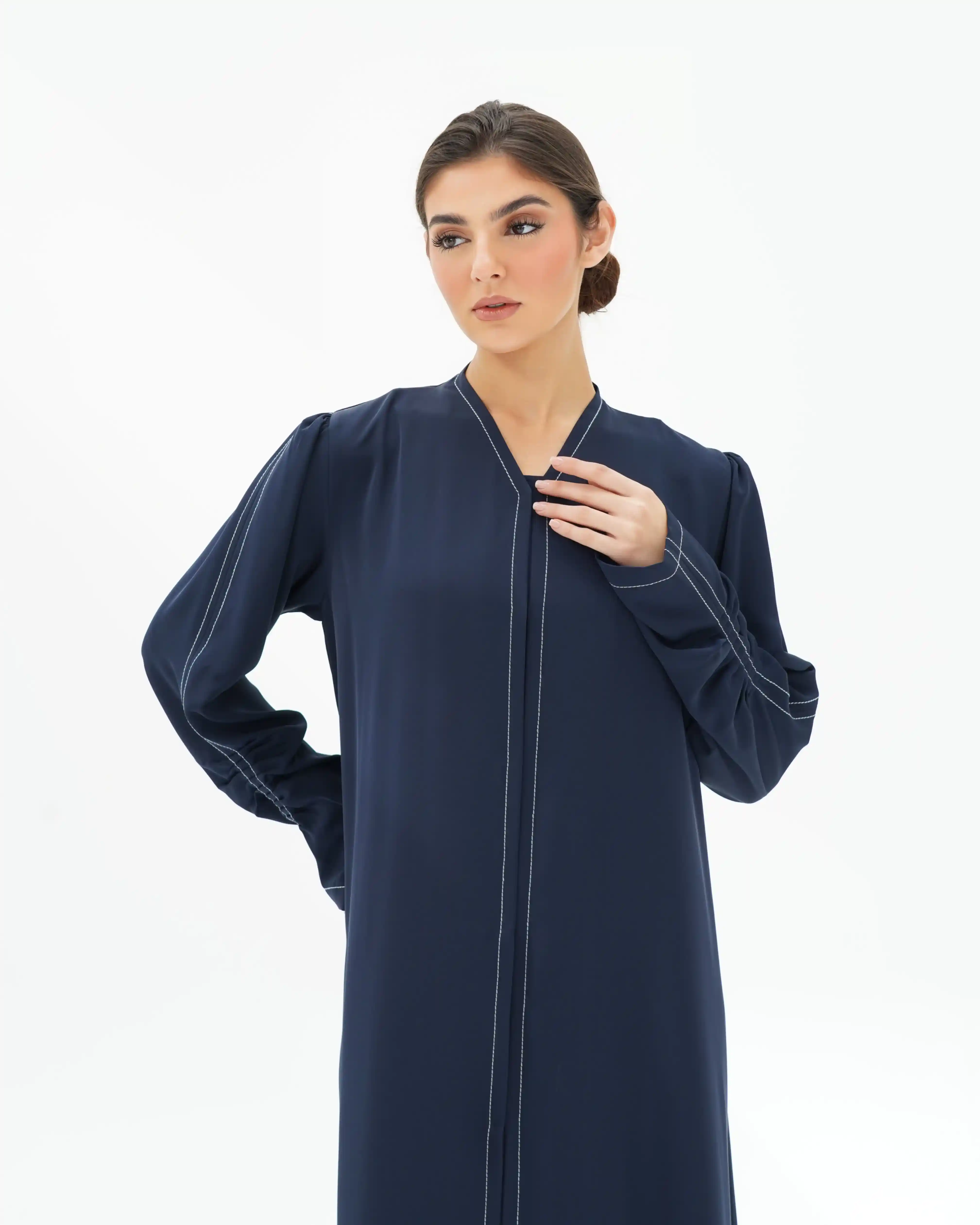 عباية مستقيمة منسدلة بتصميم نقي يعكس أناقة هادئة، من قماش البريميوم كريب بملمس ناعم وانسيابية متزنة. تبرز بياقة V بسيطة مع خياطة بارزة ممتدة من الأعلى حتى أسفل العباية لتعزّز الطول وتمنح القوام حضورًا متوازنًا. في بداية الأكمام، يظهر تجمع تدريجي ناعم عند منطقة الكتف يمنحها استقامة راقية مستوحاة من خطوط البليزر، بينما يتكرر التجمع في منتصف الكم كتموّج خفيف يضيف بعدًا حركيًا أنثويًا هادئًا. تعتمد العباية على إغلاق كامل مخفي بنظام طقطق، وتكتمل بطرحة سادة متناغمة بنفس اللون.