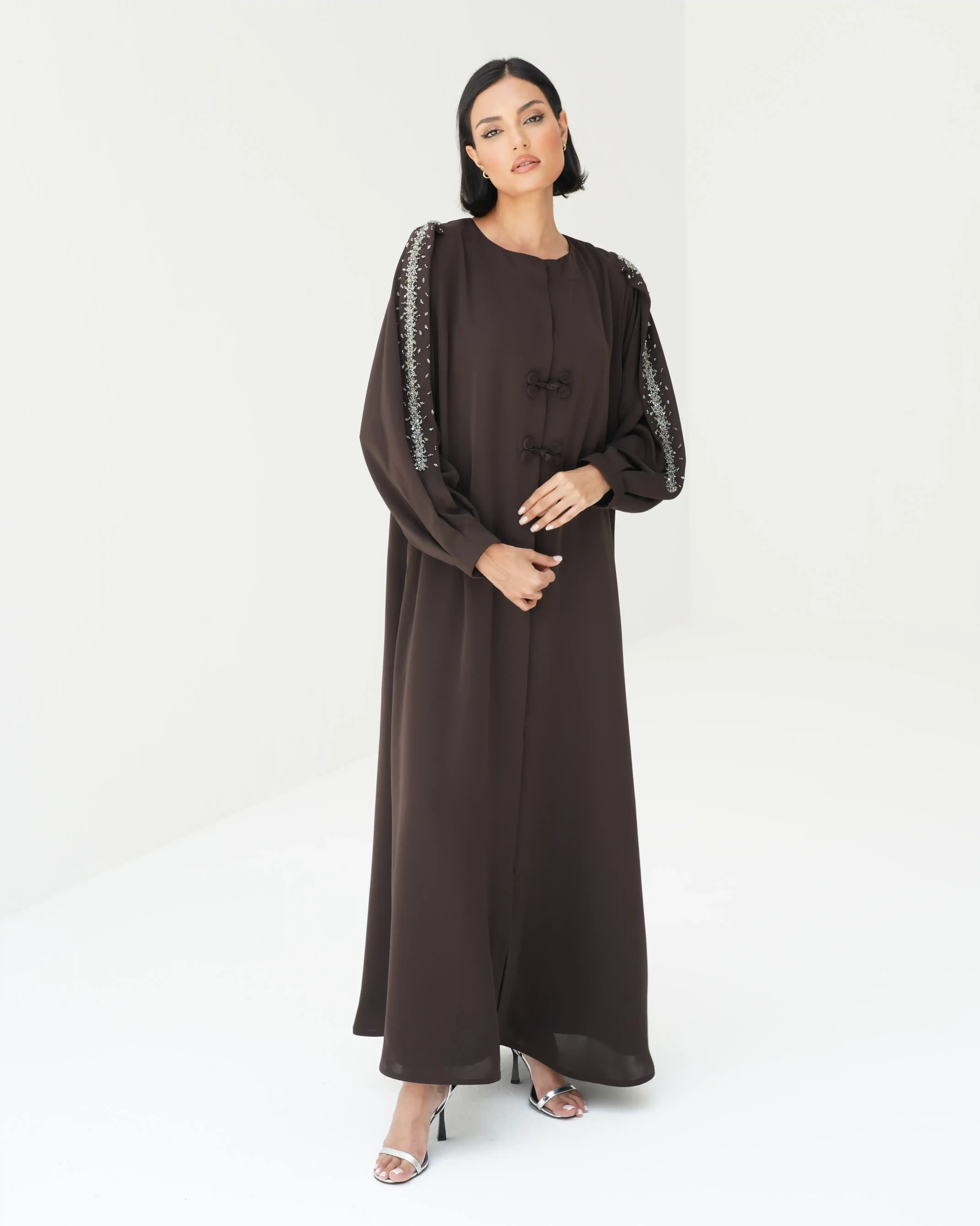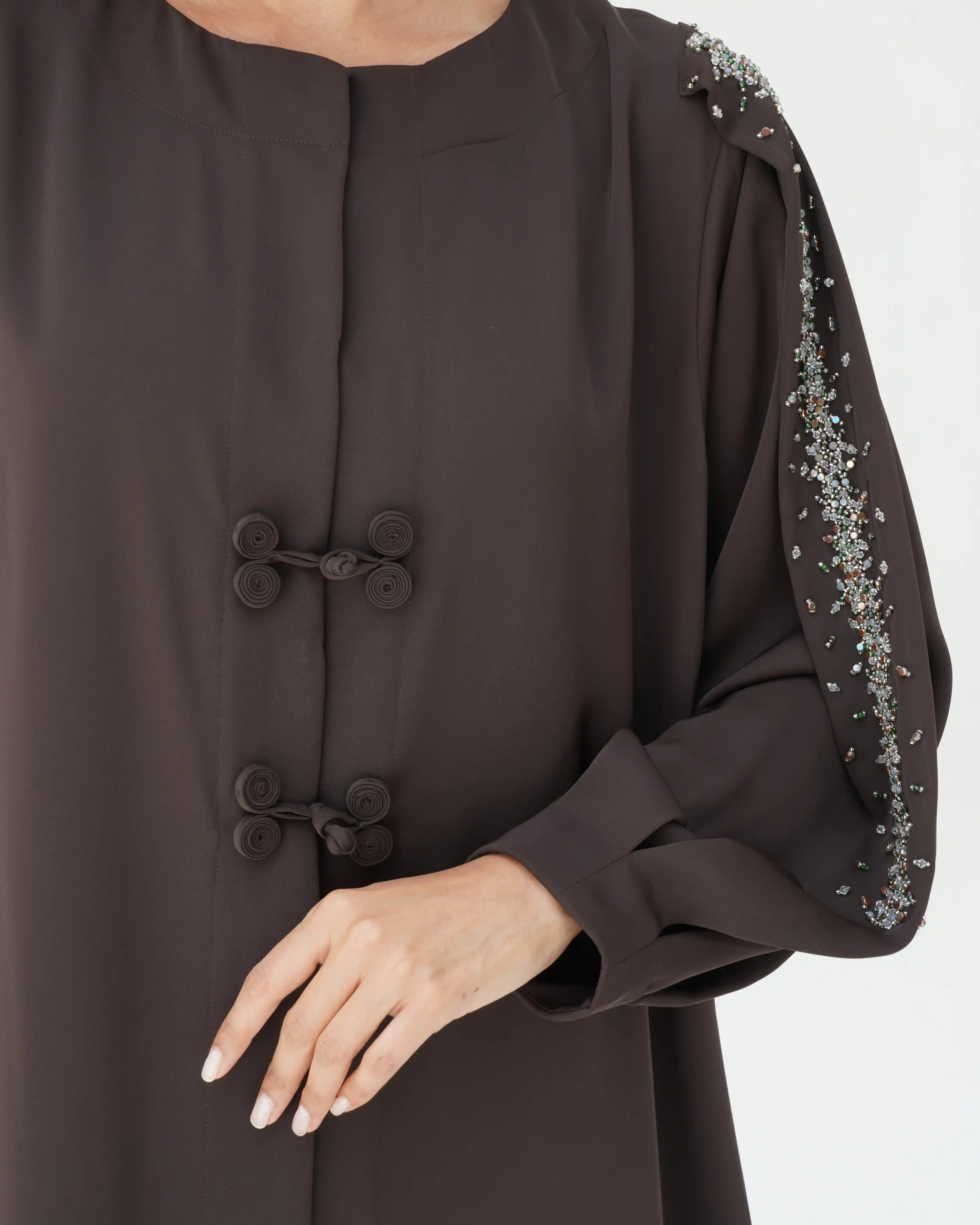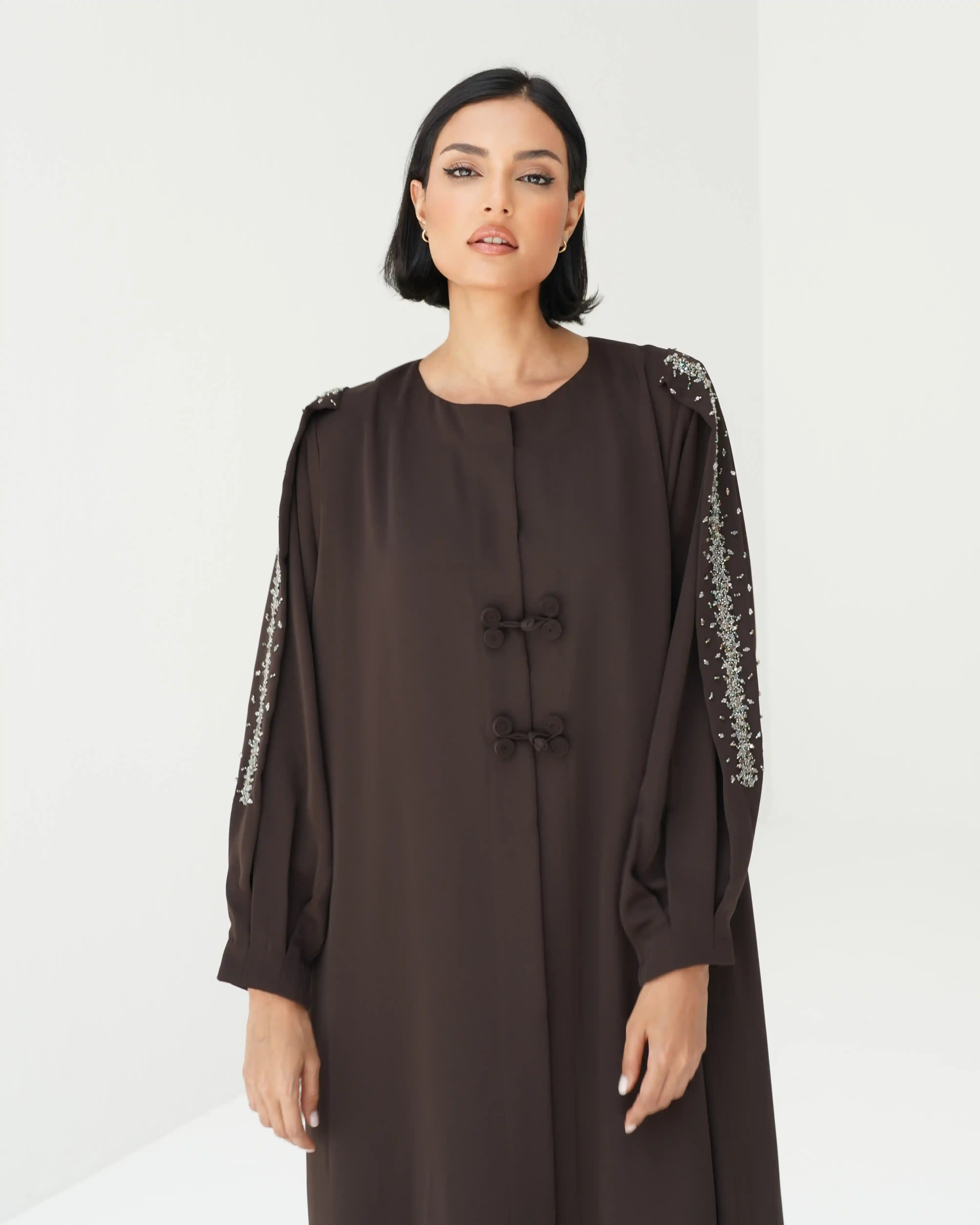 عباية مستقيمة منسدلة بروحٍ معاصرة، من قماش البريميوم كريب بملمس ناعم وحركة متوازنة. مصمّمة بقصّة متوازنة تنساب بانسيابية راقية على القوام. يتوسط التصميم إغلاق كامل مخفي بطقطق كامل يحافظ على نقاء الخط الأمامي، بينما يزيّن الصدر تفصيل فني مبتكر من لفافات قماش مستوحاة من إغلاق الصيني الكلاسيكي. تنتهي بعقدة جانبية تشكّل عنصر إغلاق بصري مميز. تتألّق الأكمام بخط ممتد في منتصفها من أعلى الذراع حتى المعصم، مرصّع بالخرز والكريستال ببريق محسوب، مع تجمعات ناعمة عند نهاية الكم تضفي بعدًا أنثويًا رقيقًا. تكتمل الإطلالة بطرحة متناغمة مزدانة بنفس الاشتغال في منتصف أحد طرفيها، في توازن مدروس بين البساطة الراقية والتفاصيل اللامعة.