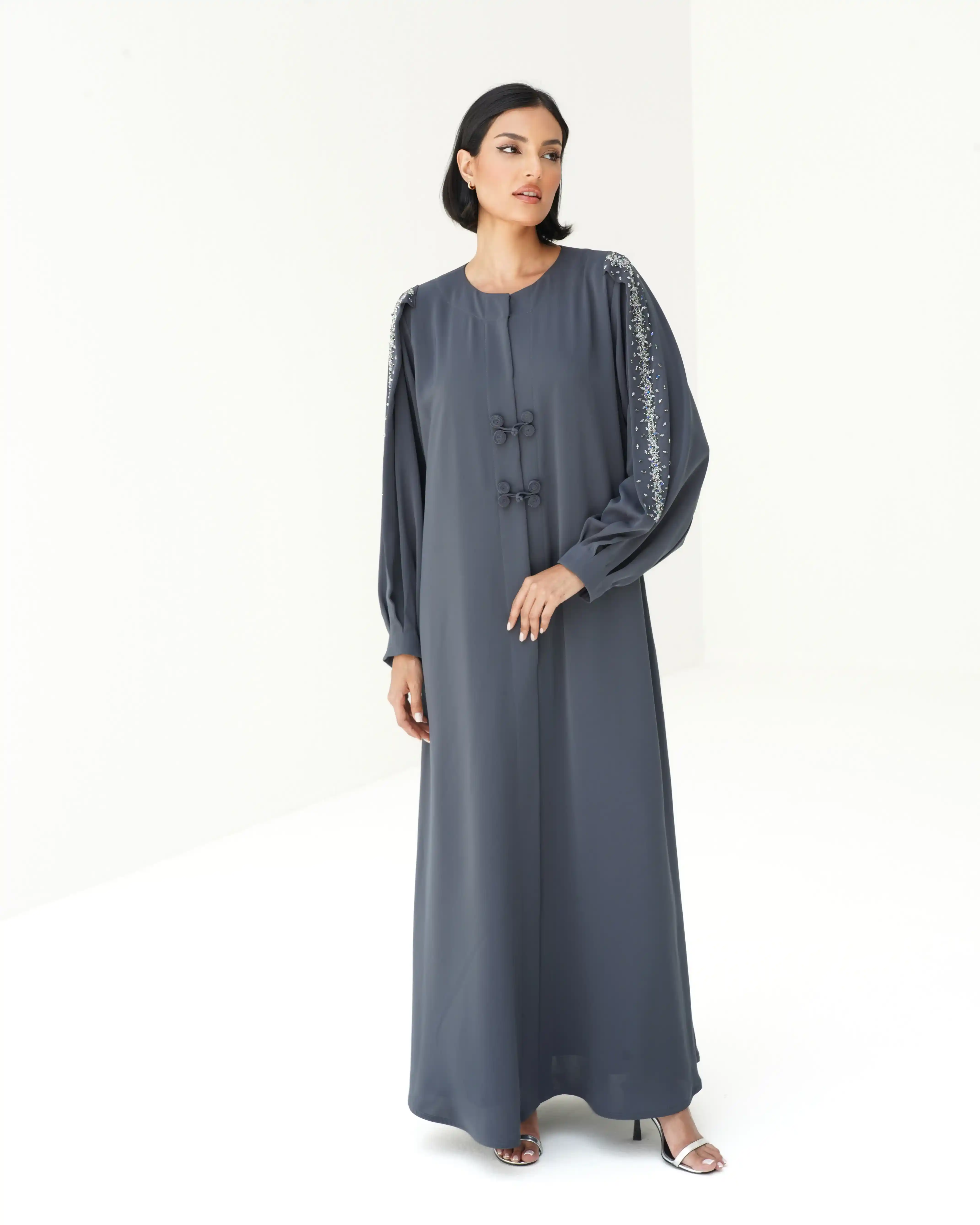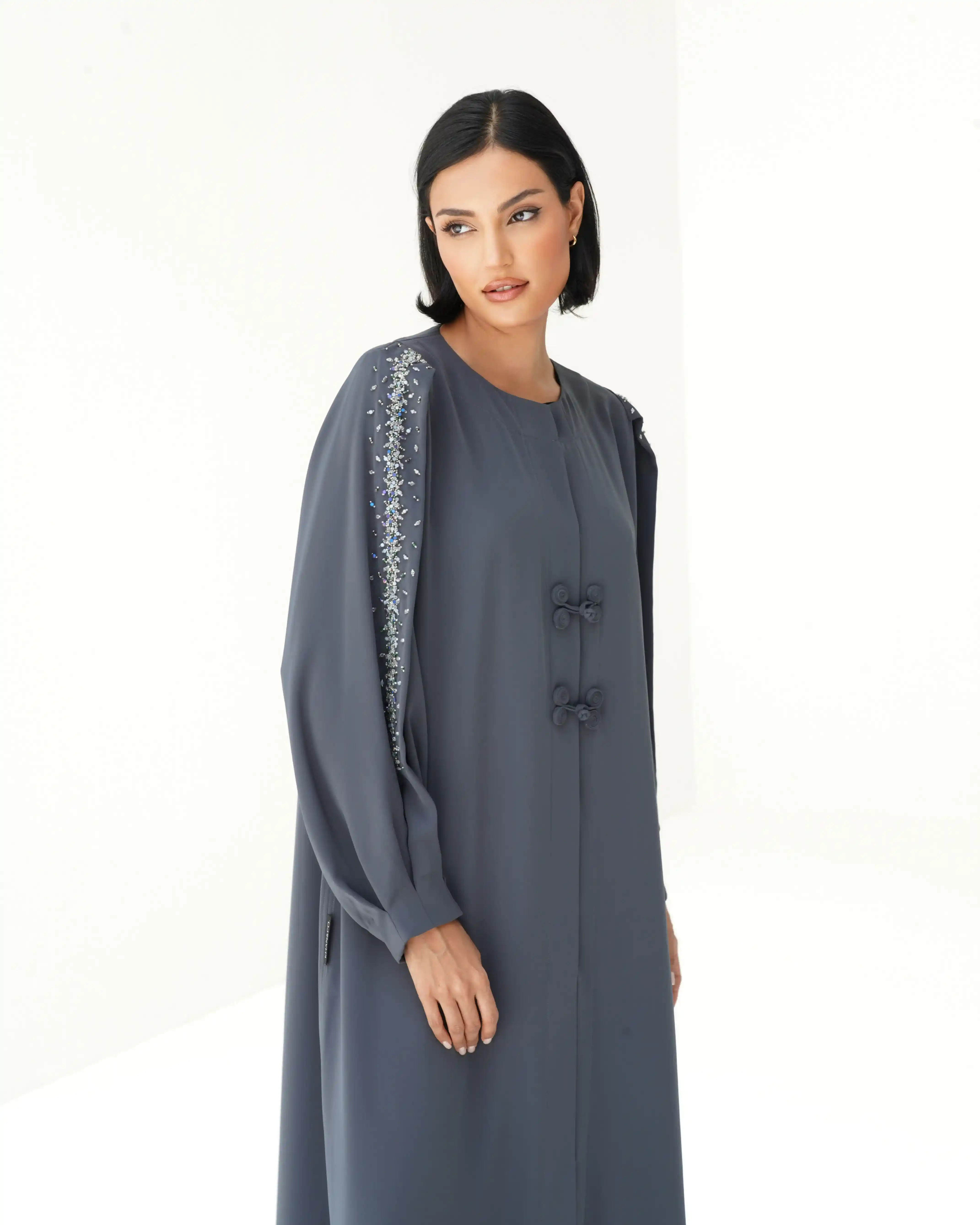 عباية مستقيمة منسدلة بروحٍ معاصرة، من قماش البريميوم كريب بملمس ناعم وحركة متوازنة. مصمّمة بقصّة متوازنة تنساب بانسيابية راقية على القوام. يتوسط التصميم إغلاق كامل مخفي بطقطق كامل يحافظ على نقاء الخط الأمامي، بينما يزيّن الصدر تفصيل فني مبتكر من لفافات قماش مستوحاة من إغلاق الصيني الكلاسيكي. تنتهي بعقدة جانبية تشكّل عنصر إغلاق بصري مميز. تتألّق الأكمام بخط ممتد في منتصفها من أعلى الذراع حتى المعصم، مرصّع بالخرز والكريستال ببريق محسوب، مع تجمعات ناعمة عند نهاية الكم تضفي بعدًا أنثويًا رقيقًا. تكتمل الإطلالة بطرحة متناغمة مزدانة بنفس الاشتغال في منتصف أحد طرفيها، في توازن مدروس بين البساطة الراقية والتفاصيل اللامعة.