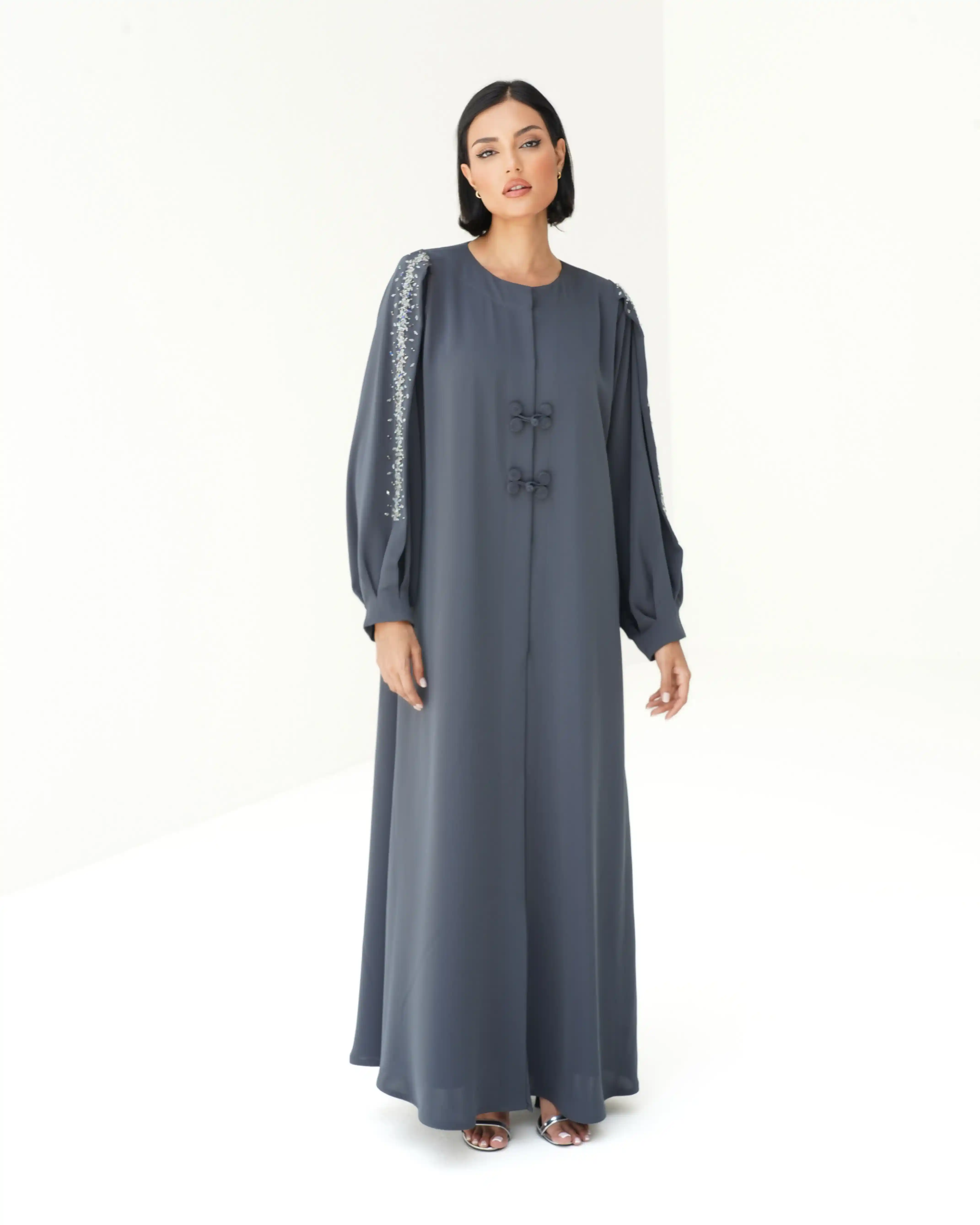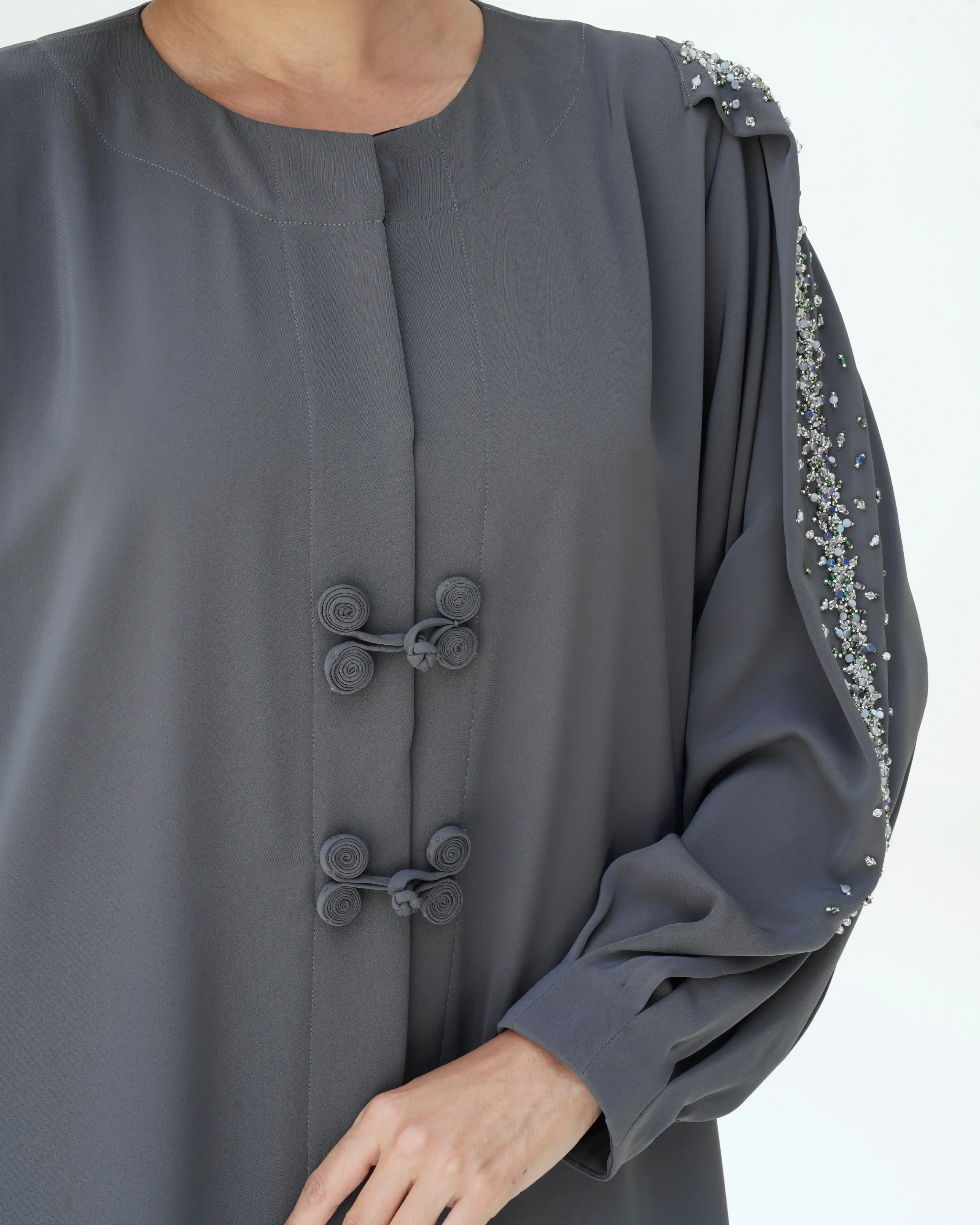 قماش البريميوم كريب مشتغلة بالكرستال والخرز واغلاق امامي مبتكر