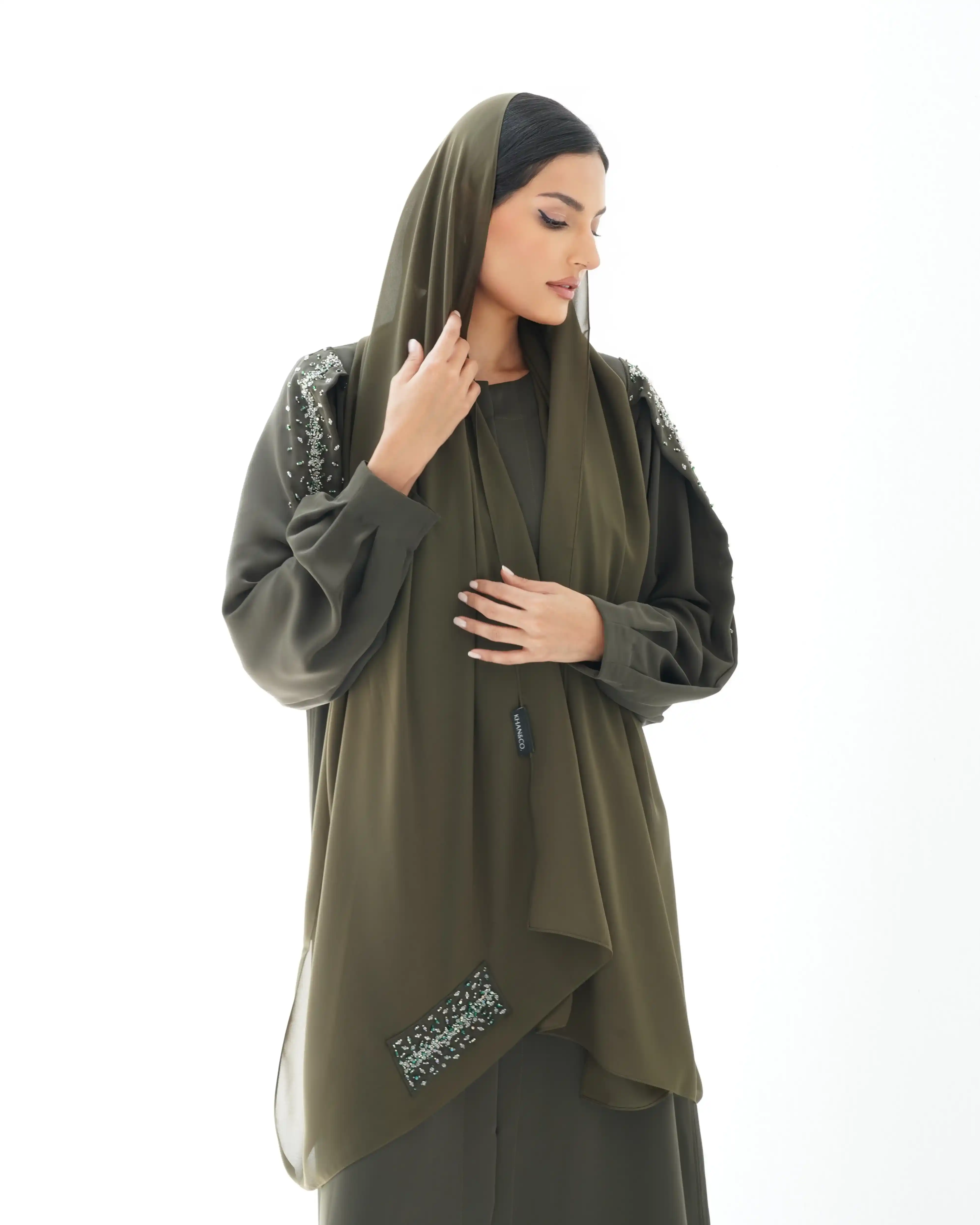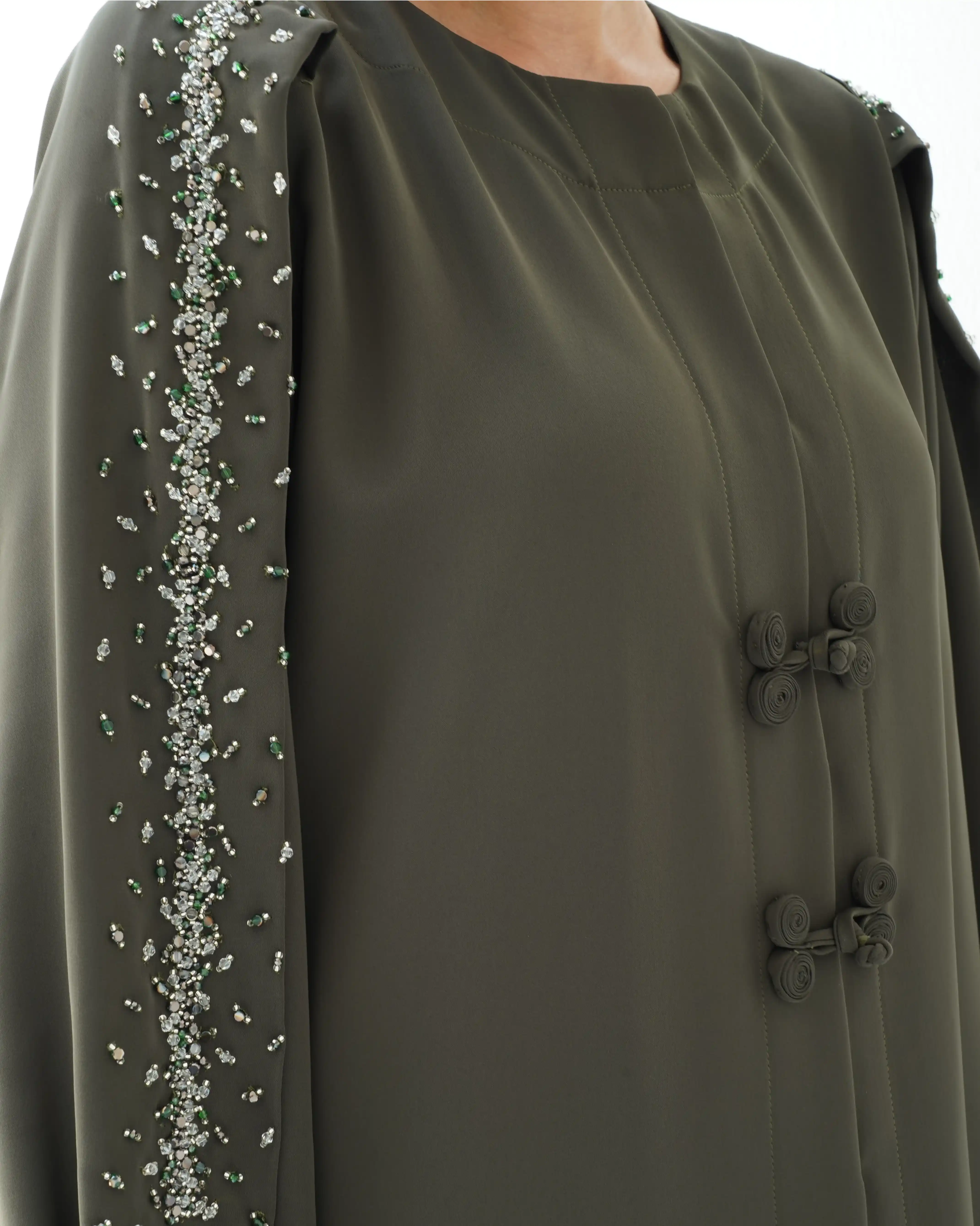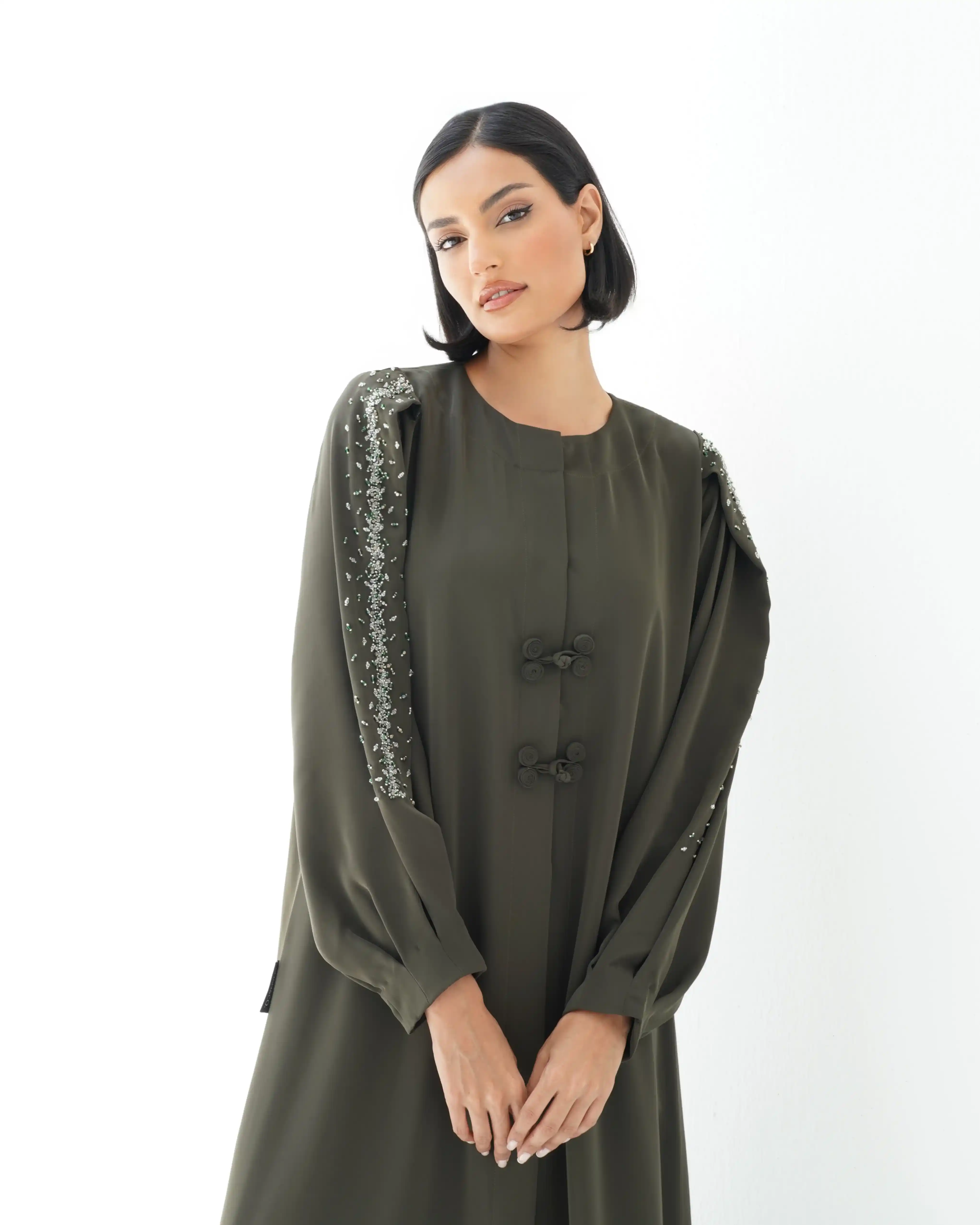 عباية مستقيمة منسدلة بروحٍ معاصرة، من قماش البريميوم كريب بملمس ناعم وحركة متوازنة. مصمّمة بقصّة متوازنة تنساب بانسيابية راقية على القوام. يتوسط التصميم إغلاق كامل مخفي بطقطق كامل يحافظ على نقاء الخط الأمامي، بينما يزيّن الصدر تفصيل فني مبتكر من لفافات قماش مستوحاة من إغلاق الصيني الكلاسيكي. تنتهي بعقدة جانبية تشكّل عنصر إغلاق بصري مميز. تتألّق الأكمام بخط ممتد في منتصفها من أعلى الذراع حتى المعصم، مرصّع بالخرز والكريستال ببريق محسوب، مع تجمعات ناعمة عند نهاية الكم تضفي بعدًا أنثويًا رقيقًا. تكتمل الإطلالة بطرحة متناغمة مزدانة بنفس الاشتغال في منتصف أحد طرفيها، في توازن مدروس بين البساطة الراقية والتفاصيل اللامعة.