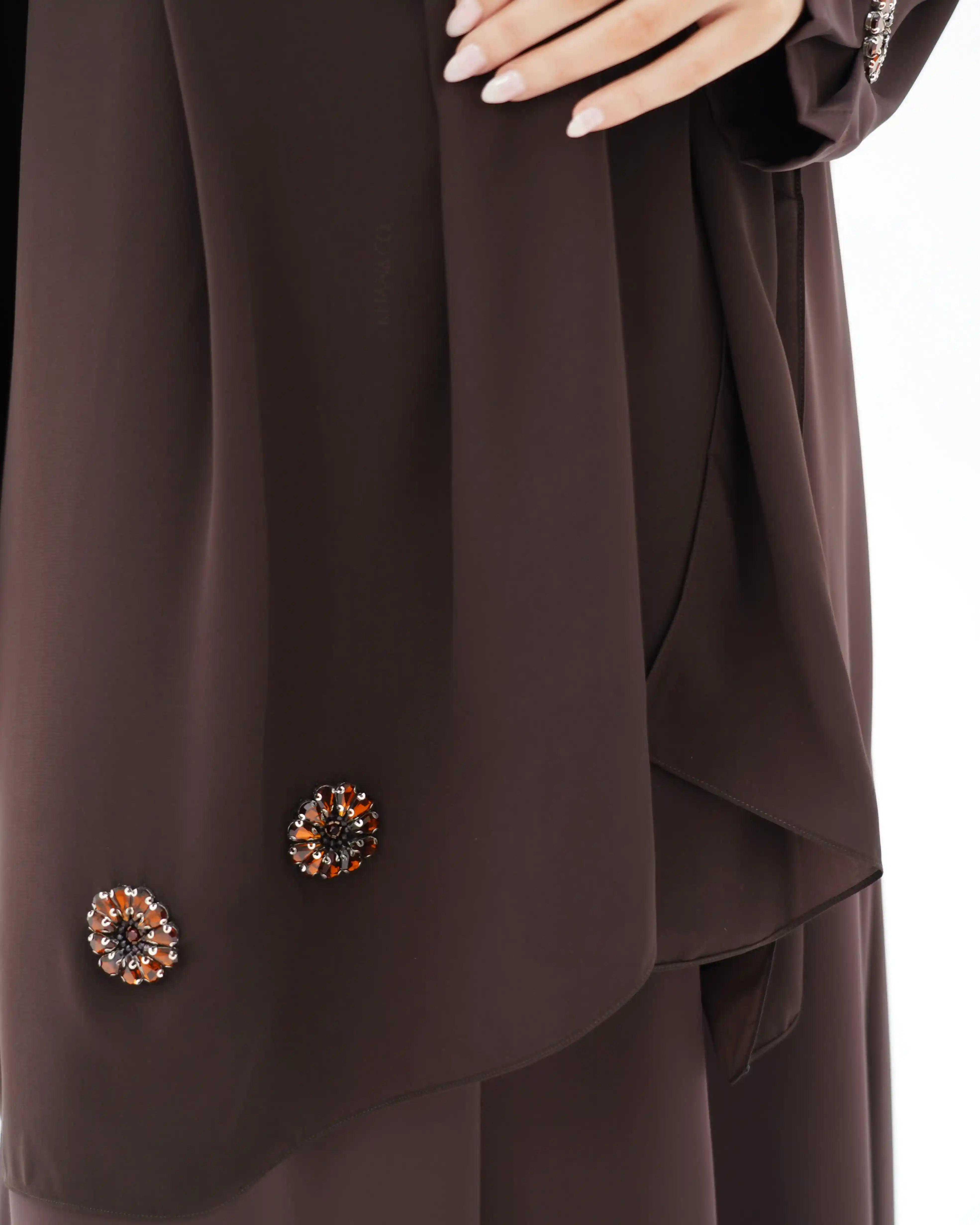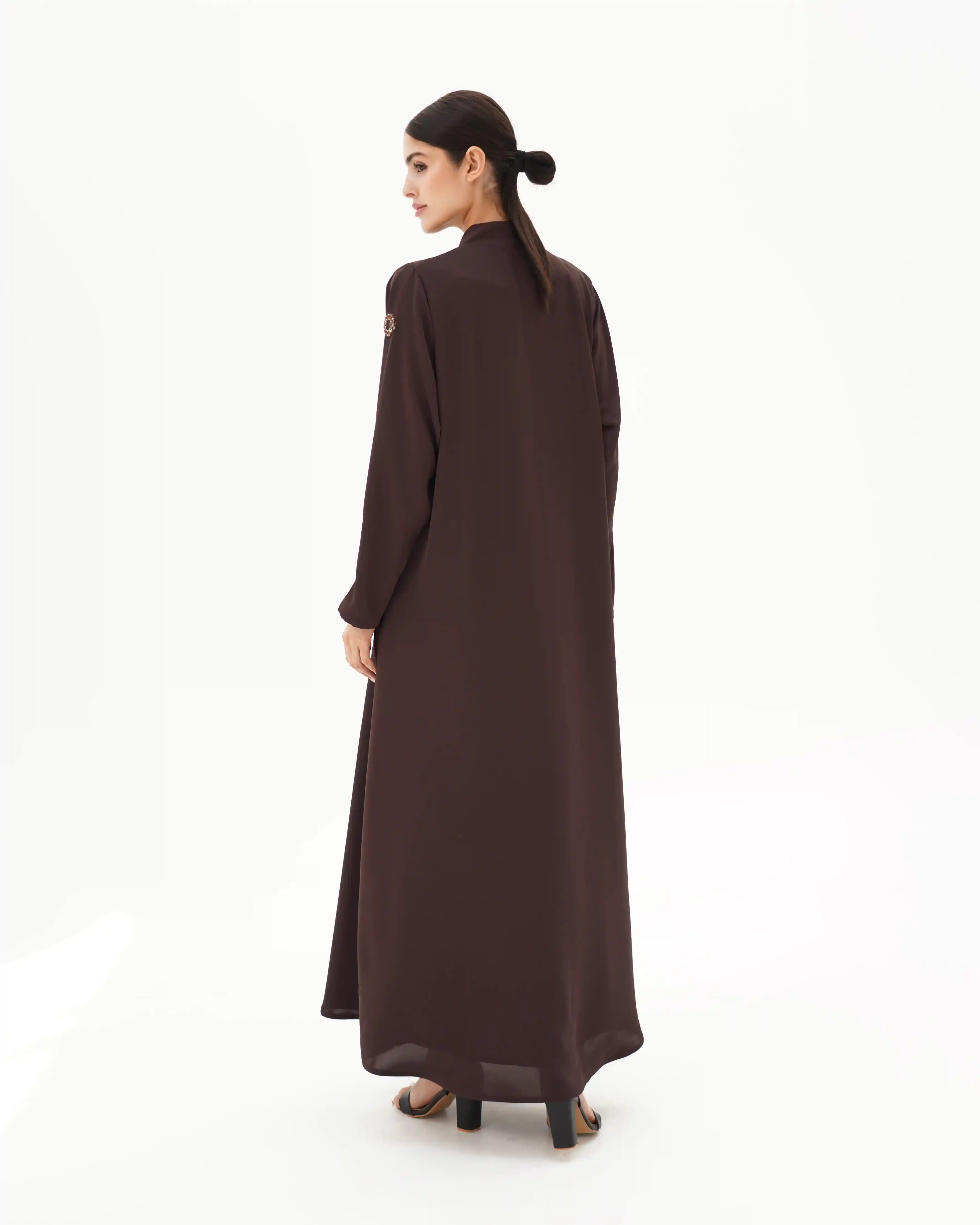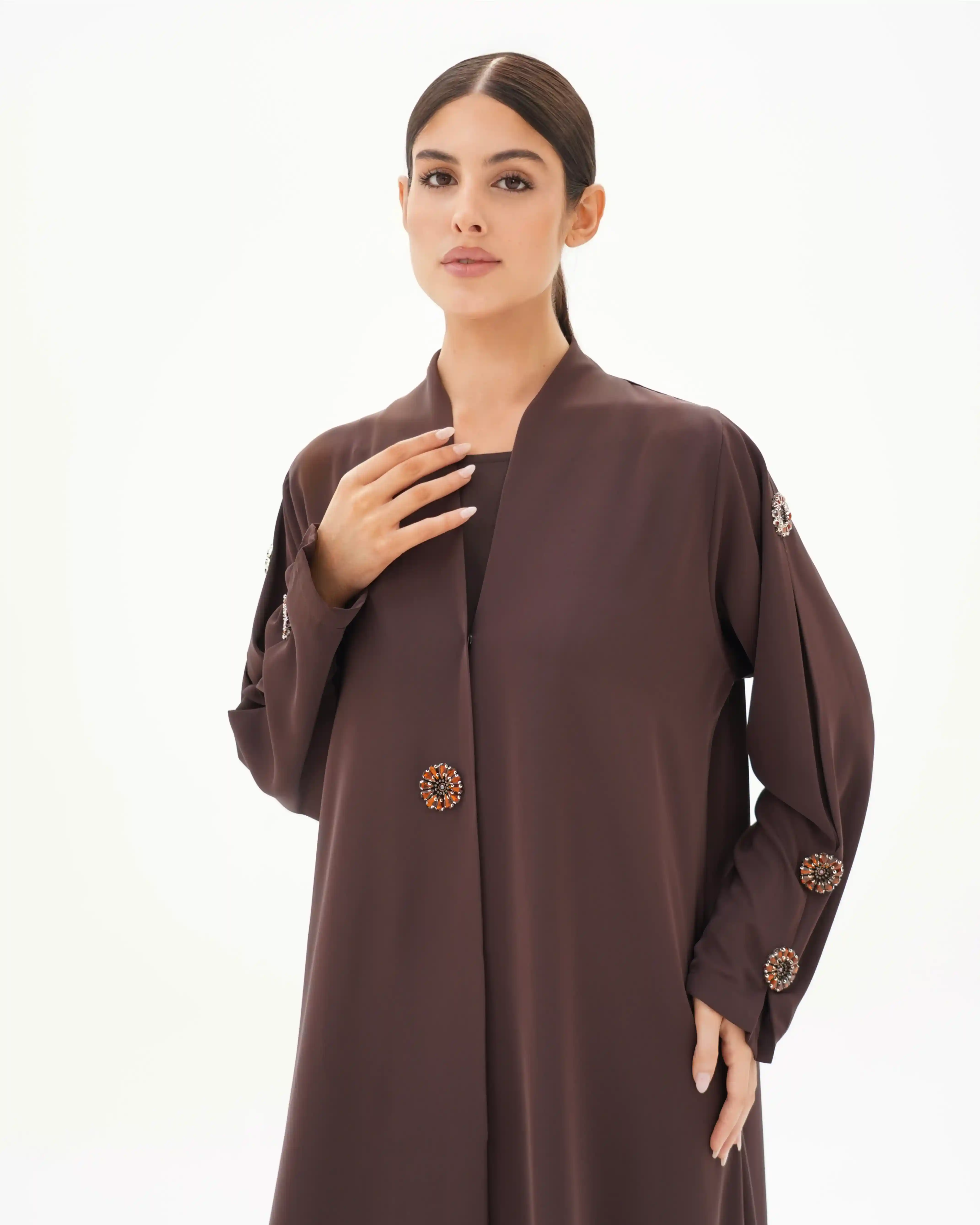 تصميم العباية يرتكز على البساطة الفاخرة بخطوط انسيابية وتفاصيل معدنية/كريستالية تضيف قيمة بصرية راقية دون مبالغة. صُنعت من قماش بريميوم كريب الذي ينسدل بخفة ويعزز نقاء الخطوط وانسيابية القَصّة. الأكمام تأتي بخط مستقيم ناعم يتزيّن بكريستالات دائرية موزعة بدقة لتمنح توازناً بصرياً وتحوّلها إلى عنصر جمالي بارز. الكريستالات المعدنية الداكنة بلمعتها الراقية تشبه نجمة أو زهرة صغيرة، فتمنح التصميم لمسة أشبه بالمجوهرات وتعكس هوية واضحة للعباية. أما الياقة المستقيمة البسيطة فتضفي مظهراً أنيقاً وتوجّه التركيز نحو تفاصيل الأكمام.