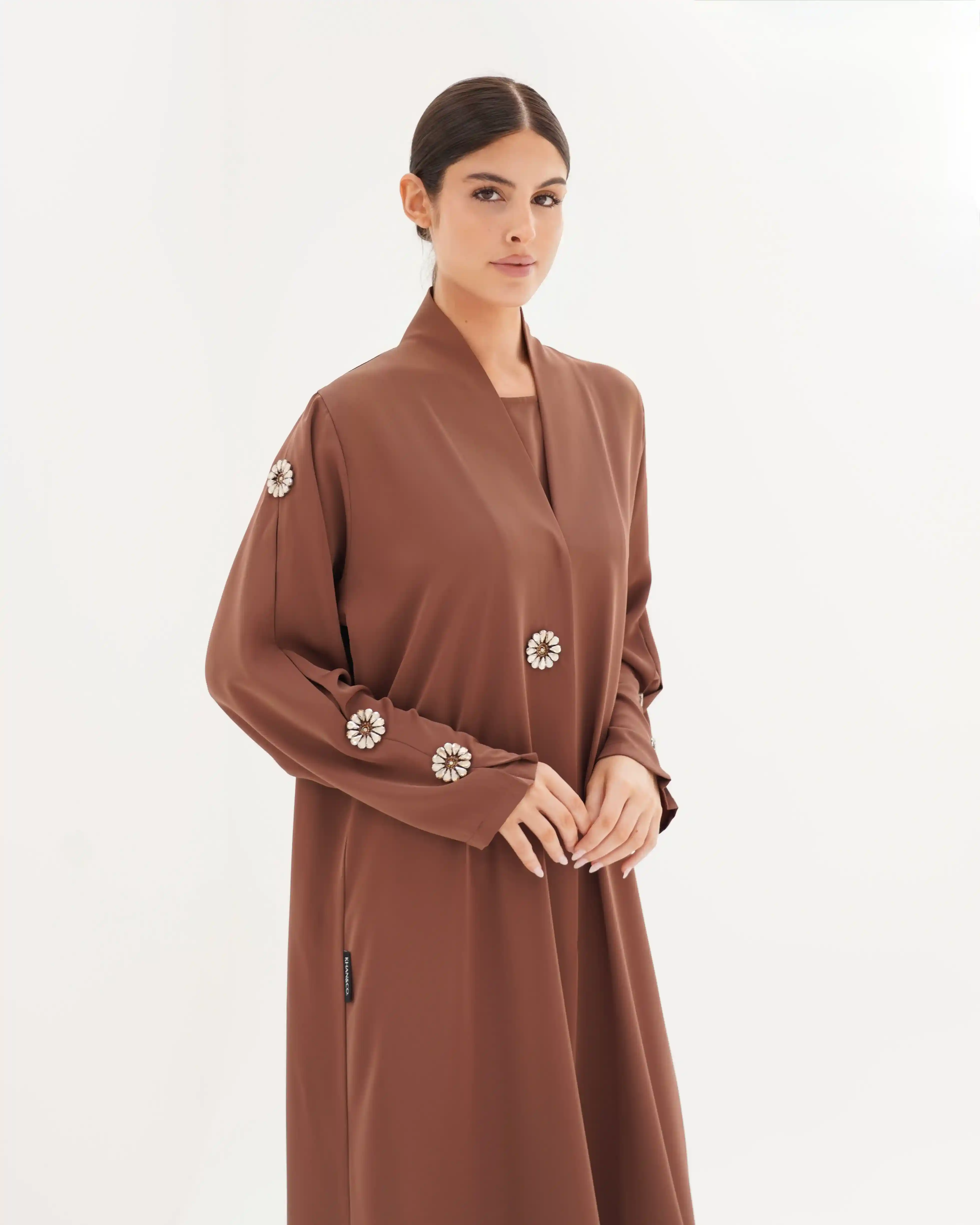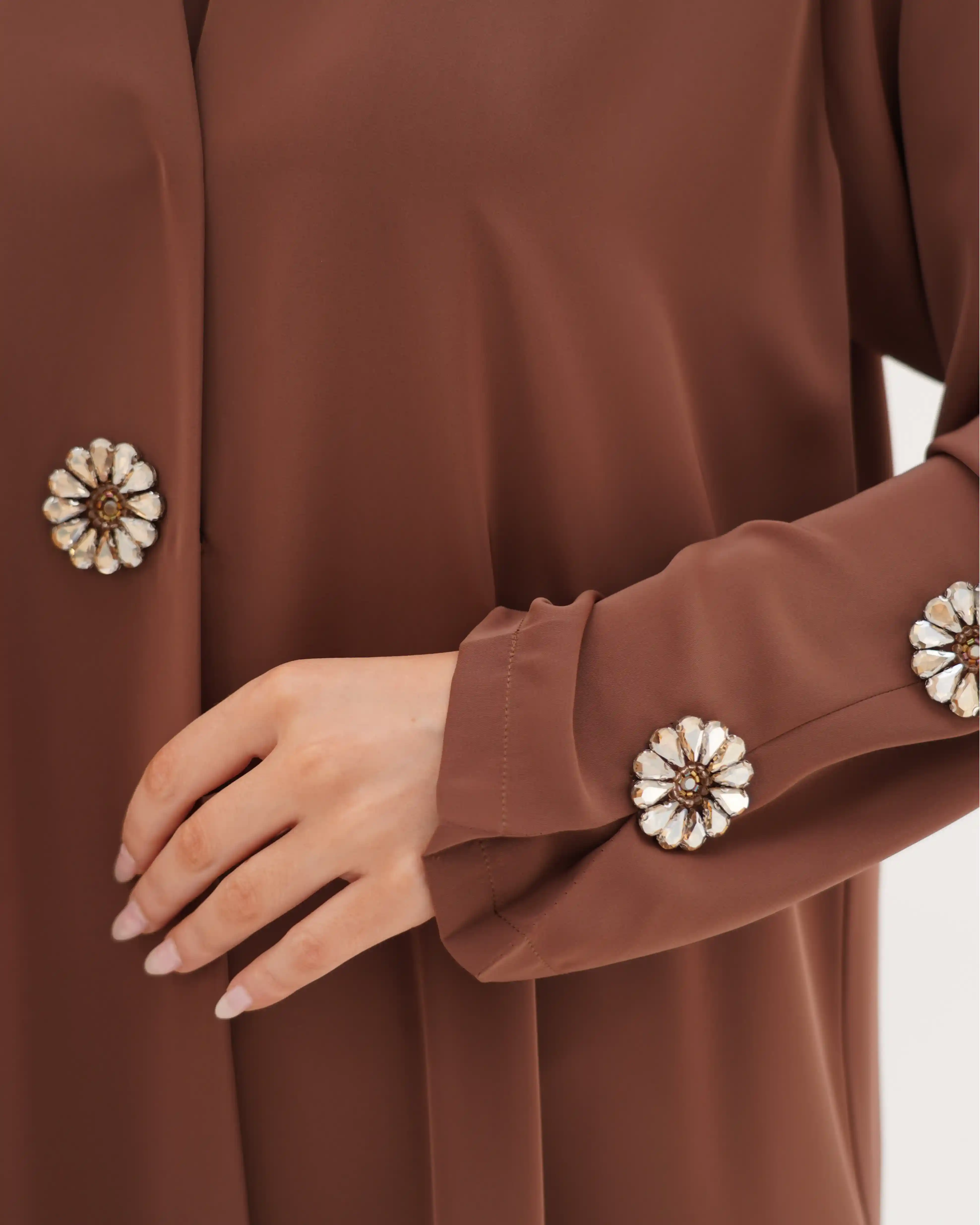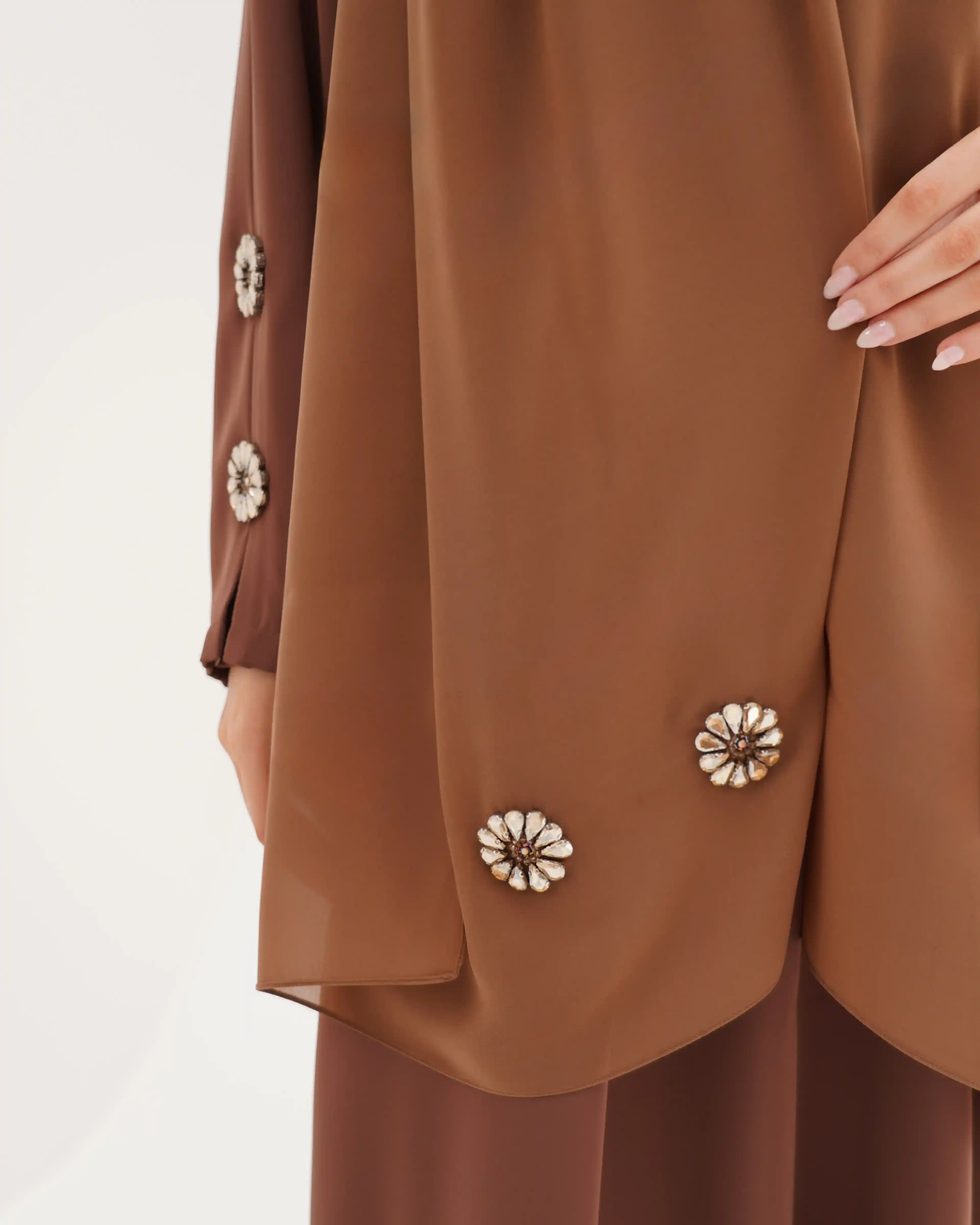 • الأكمام مزينة بكرستال معدني دائري بتصميم زهري أنيق، باللون كراميل موزع بتناسق على الأكمام والصدر.