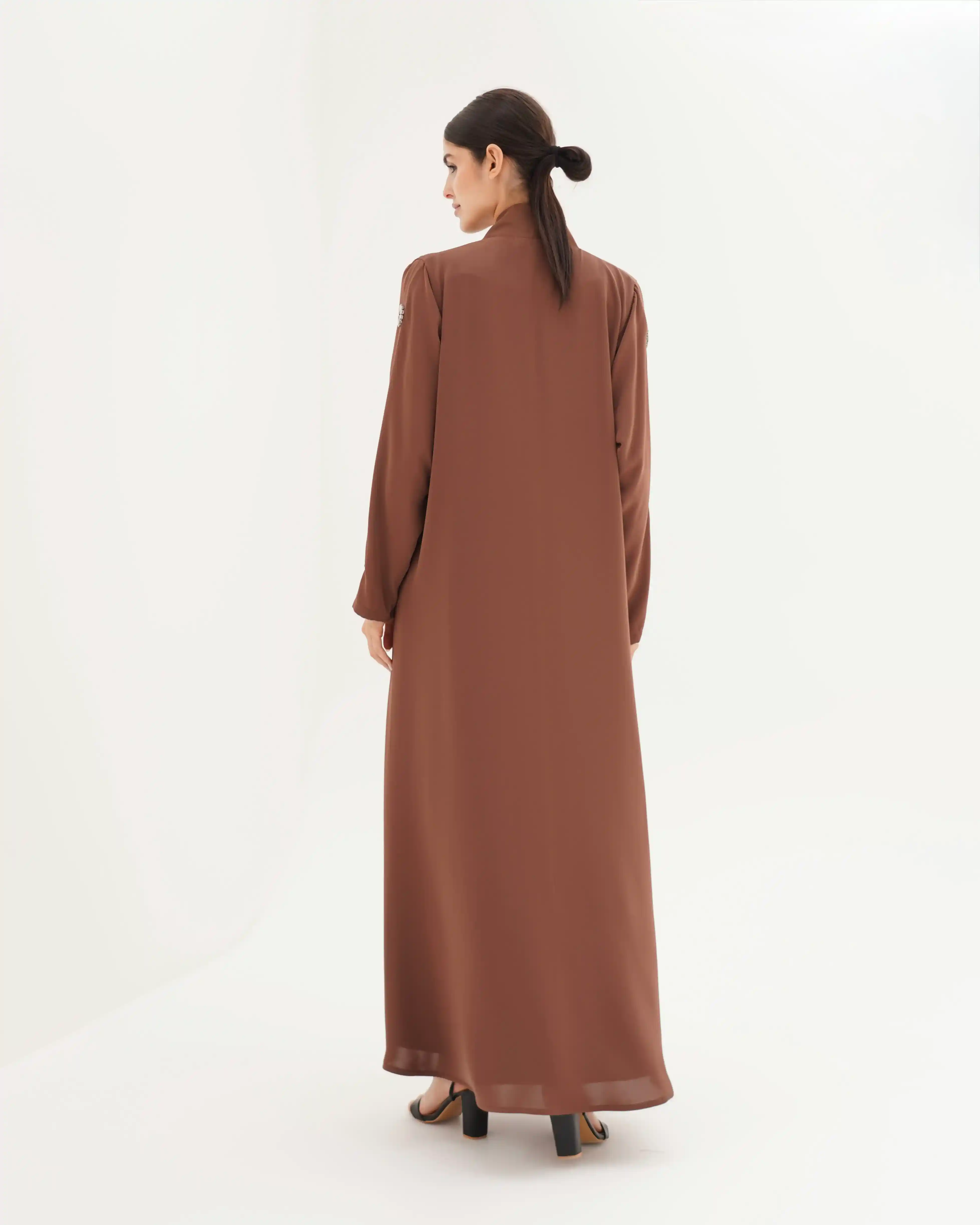 تصميم العباية يرتكز على البساطة الفاخرة بخطوط انسيابية وتفاصيل معدنية/كريستالية تضيف قيمة بصرية راقية دون مبالغة. صُنعت من قماش بريميوم كريب الذي ينسدل بخفة ويعزز نقاء الخطوط وانسيابية القَصّة. الأكمام تأتي بخط مستقيم ناعم يتزيّن بكريستالات دائرية موزعة بدقة لتمنح توازناً بصرياً وتحوّلها إلى عنصر جمالي بارز. الكريستالات المعدنية الداكنة بلمعتها الراقية تشبه نجمة أو زهرة صغيرة، فتمنح التصميم لمسة أشبه بالمجوهرات وتعكس هوية واضحة للعباية. أما الياقة المستقيمة البسيطة فتضفي مظهراً أنيقاً وتوجّه التركيز نحو تفاصيل الأكمام.