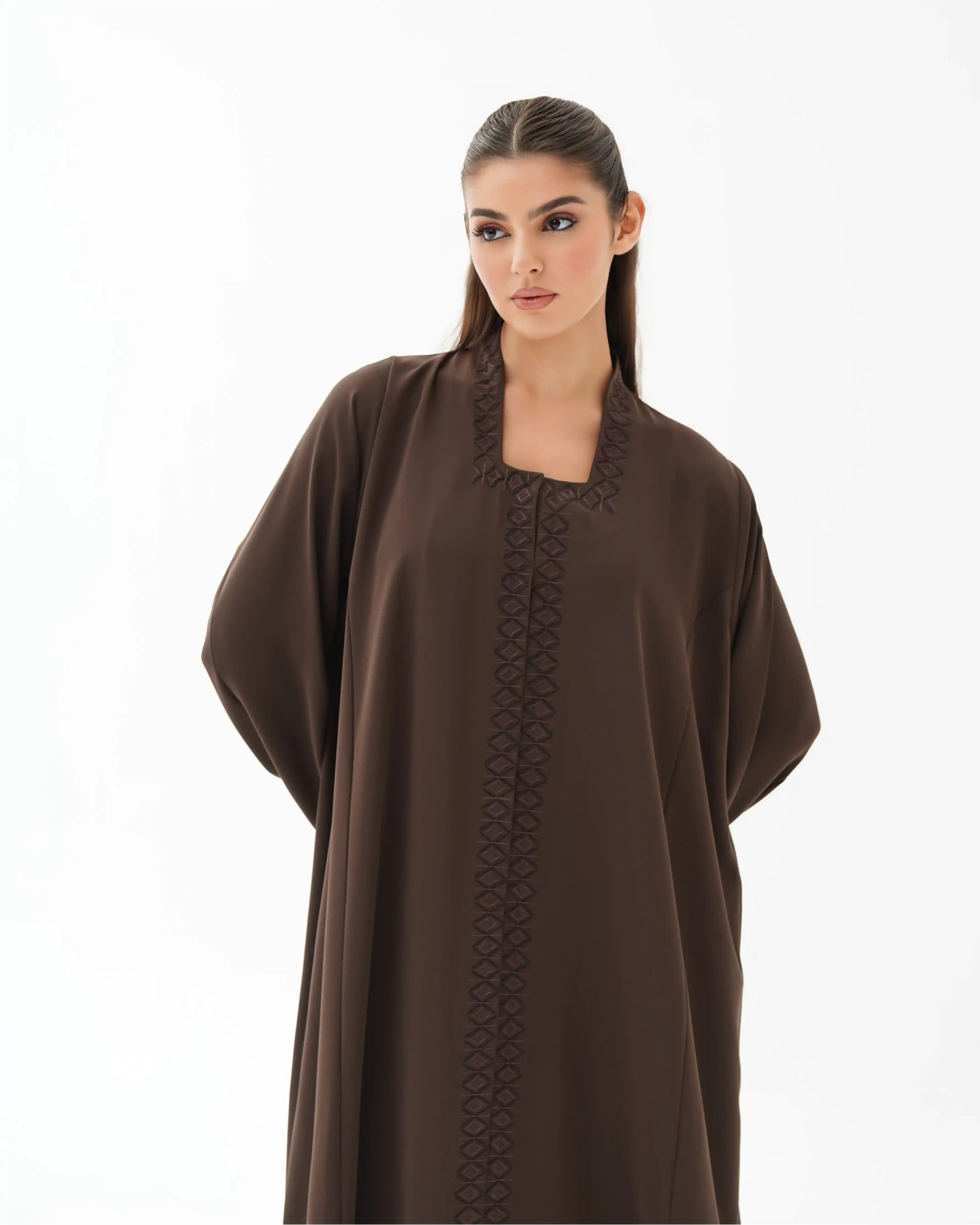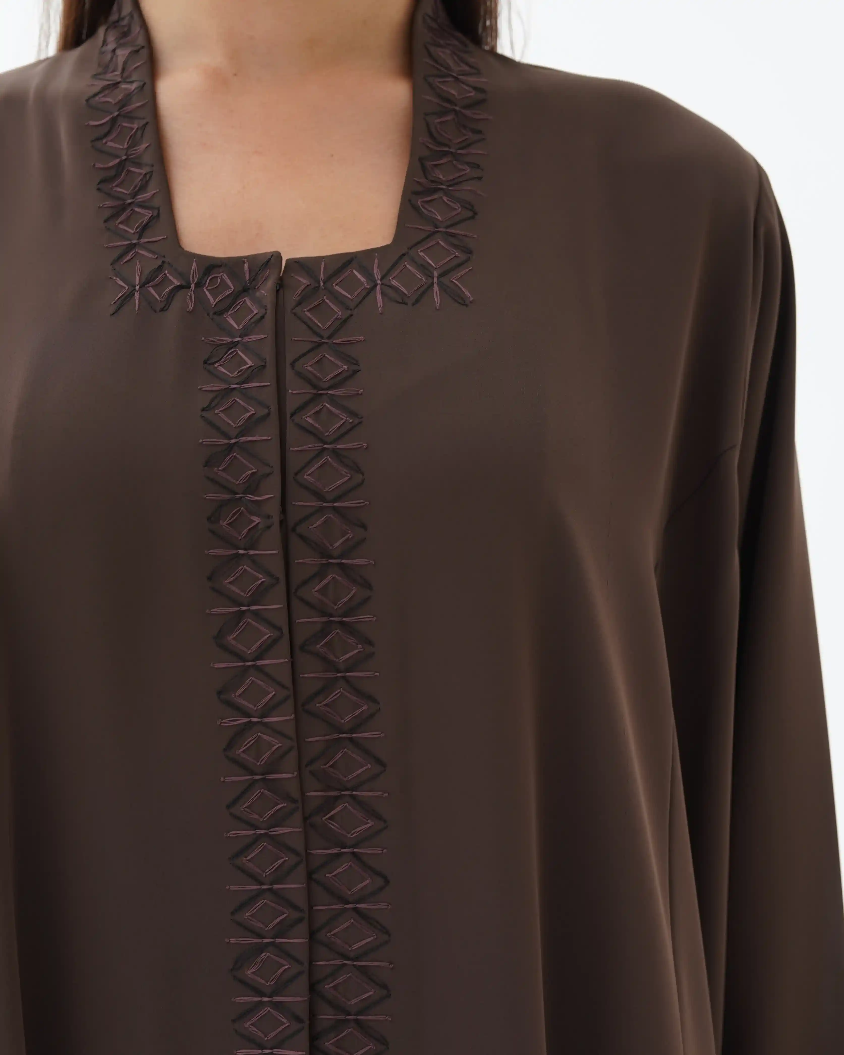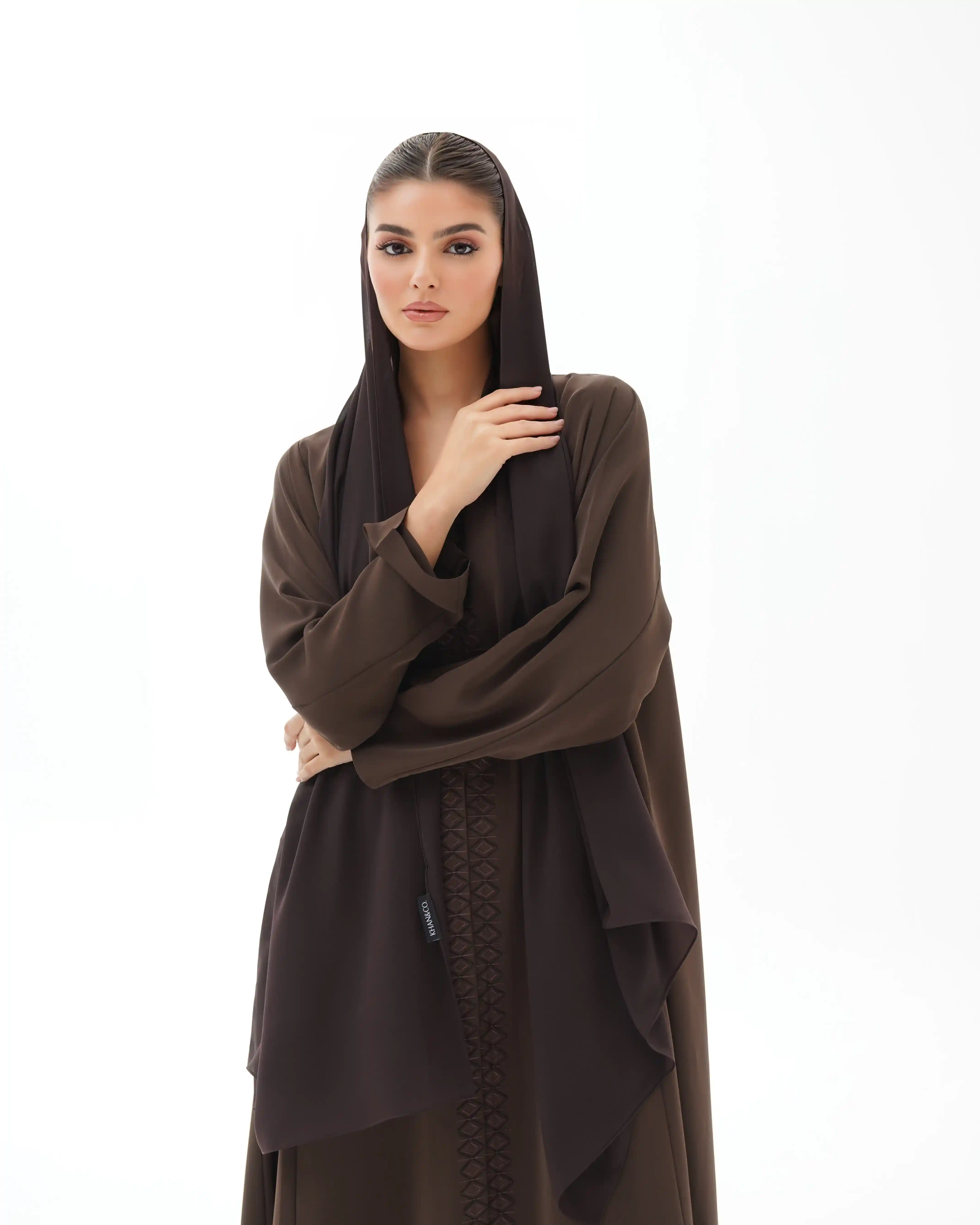 عباية فاخرة مستوحاة من جمال الفن الاسلامي تعيد إحياء روح الموازييك العربي الاسلامي في قالب معاصر. تتميز بقصة رقبة مربعة في شكل هندسي مطرزة بخيوط من الحرير تتشابك في انماط هندسية تحاكي نقوش الاراربيسك التاريخية وتلتف من خلف ياقة الرقبة وتنحدر بانسيابية من الاعلى الى اسفل العباية، صنعت من قماش كريب فاخر وناعم الملمس ينسدل بخفة ويبرز تفاصيل التطريز الحريري. تأتي واسعة من عند الصدر حتى الذيل بانسيابية راقية تمنح حرية في الحركة واناقة في الحضور كما انها مقفلة بالكامل بطقطق مخفي من الامام ليحافظ التصميم على الستر والعملية.