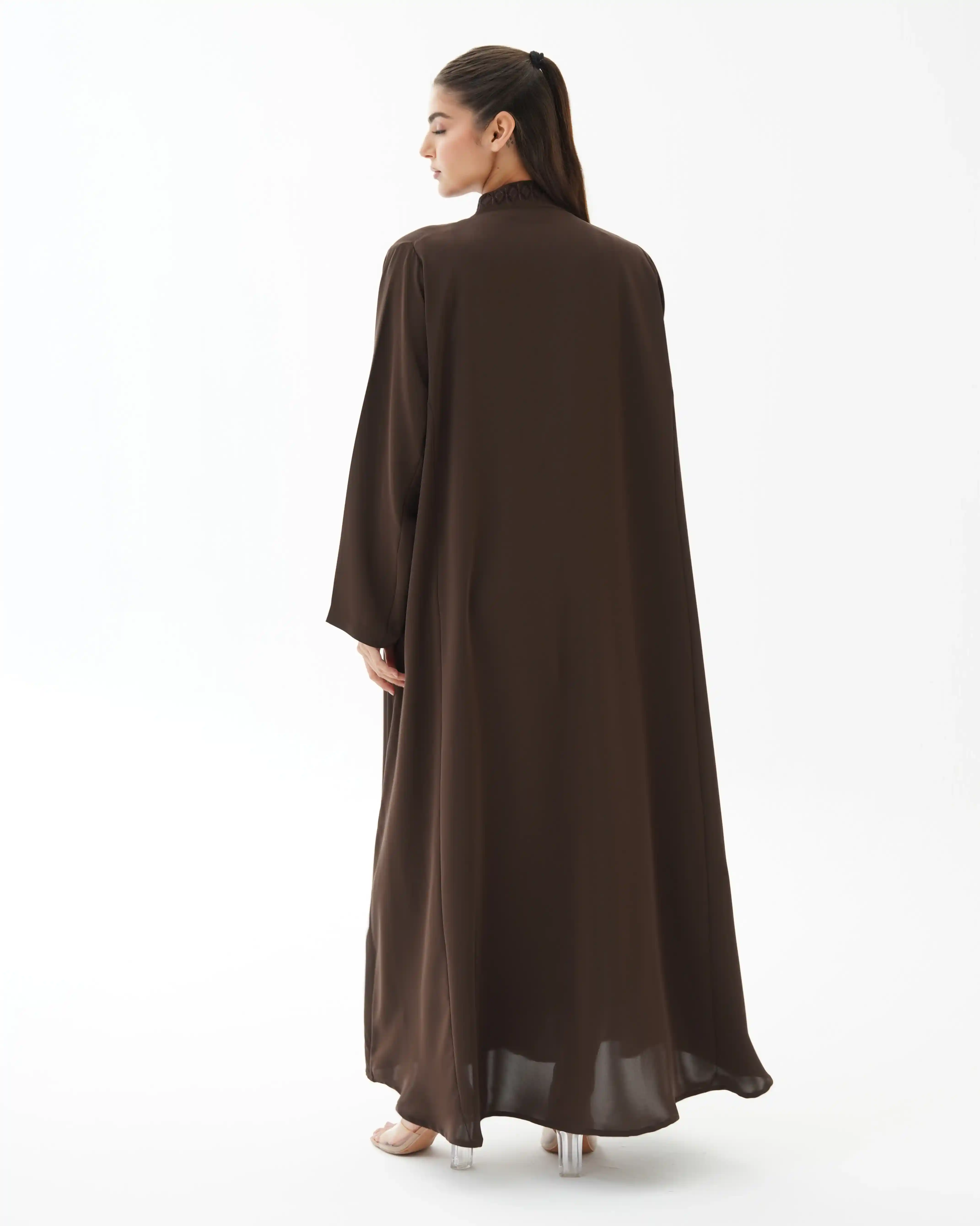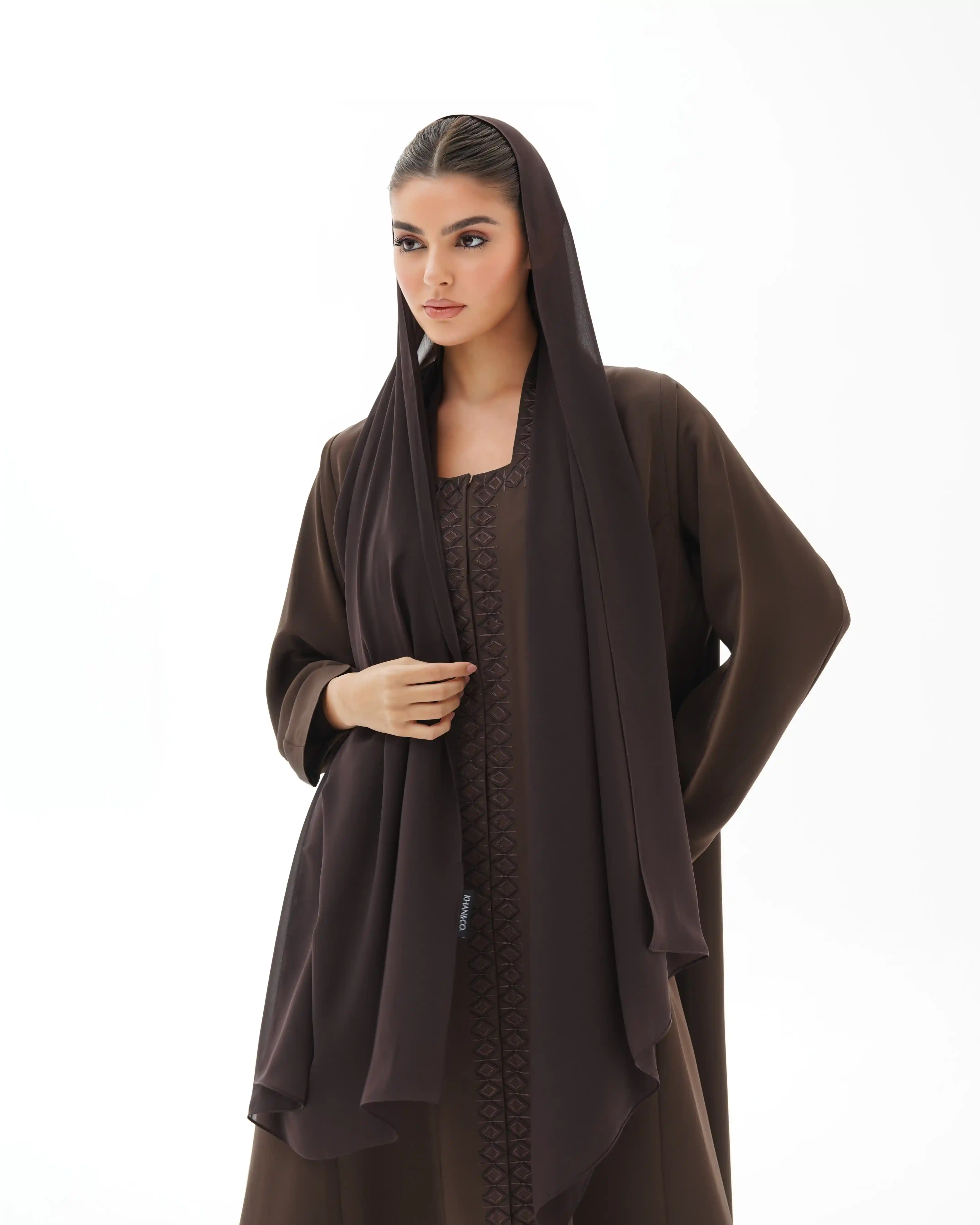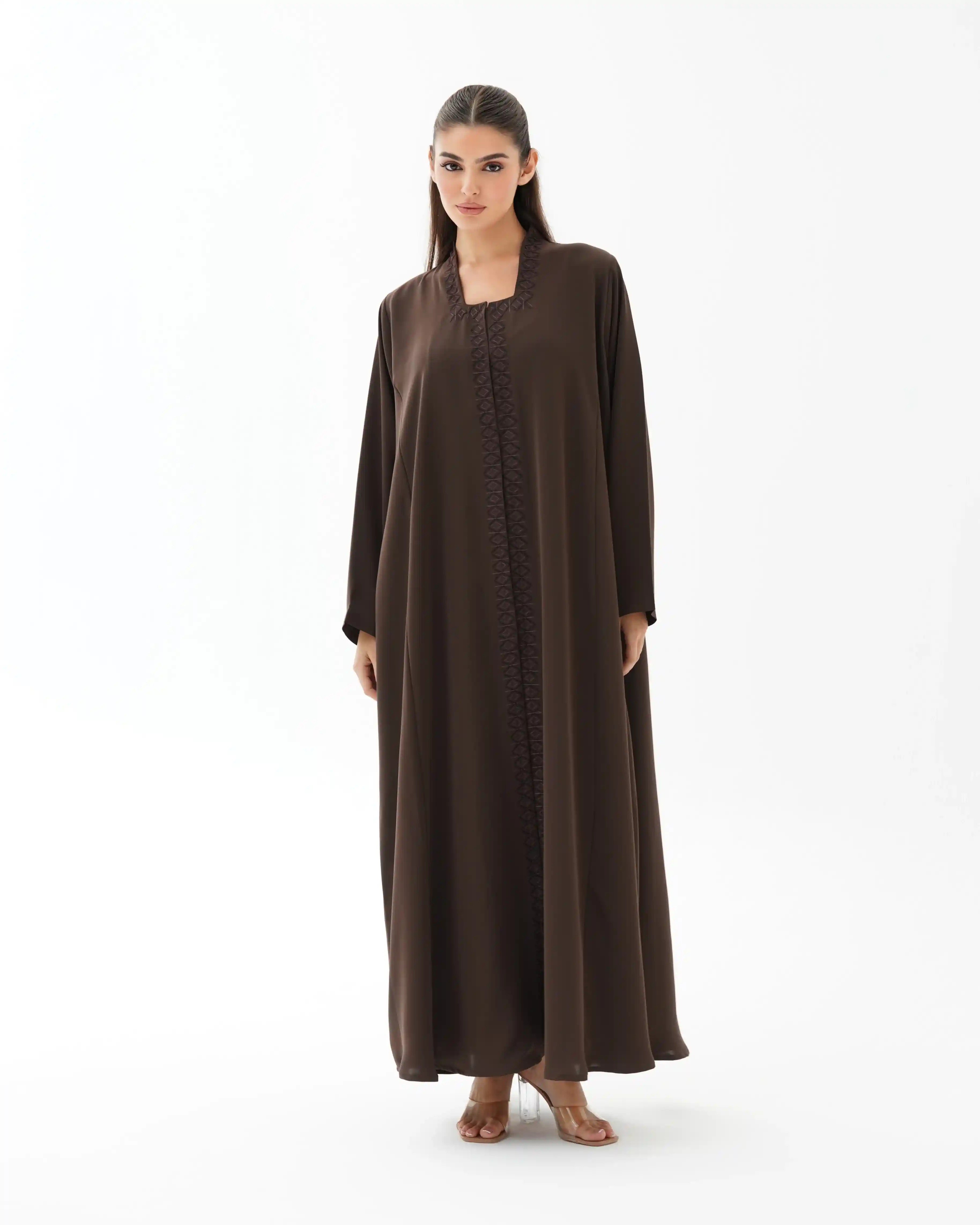 عباية فاخرة مستوحاة من جمال الفن الاسلامي تعيد إحياء روح الموازييك العربي الاسلامي في قالب معاصر. تتميز بقصة رقبة مربعة في شكل هندسي مطرزة بخيوط من الحرير تتشابك في انماط هندسية تحاكي نقوش الاراربيسك التاريخية وتلتف من خلف ياقة الرقبة وتنحدر بانسيابية من الاعلى الى اسفل العباية، صنعت من قماش كريب فاخر وناعم الملمس ينسدل بخفة ويبرز تفاصيل التطريز الحريري. تأتي واسعة من عند الصدر حتى الذيل بانسيابية راقية تمنح حرية في الحركة واناقة في الحضور كما انها مقفلة بالكامل بطقطق مخفي من الامام ليحافظ التصميم على الستر والعملية.