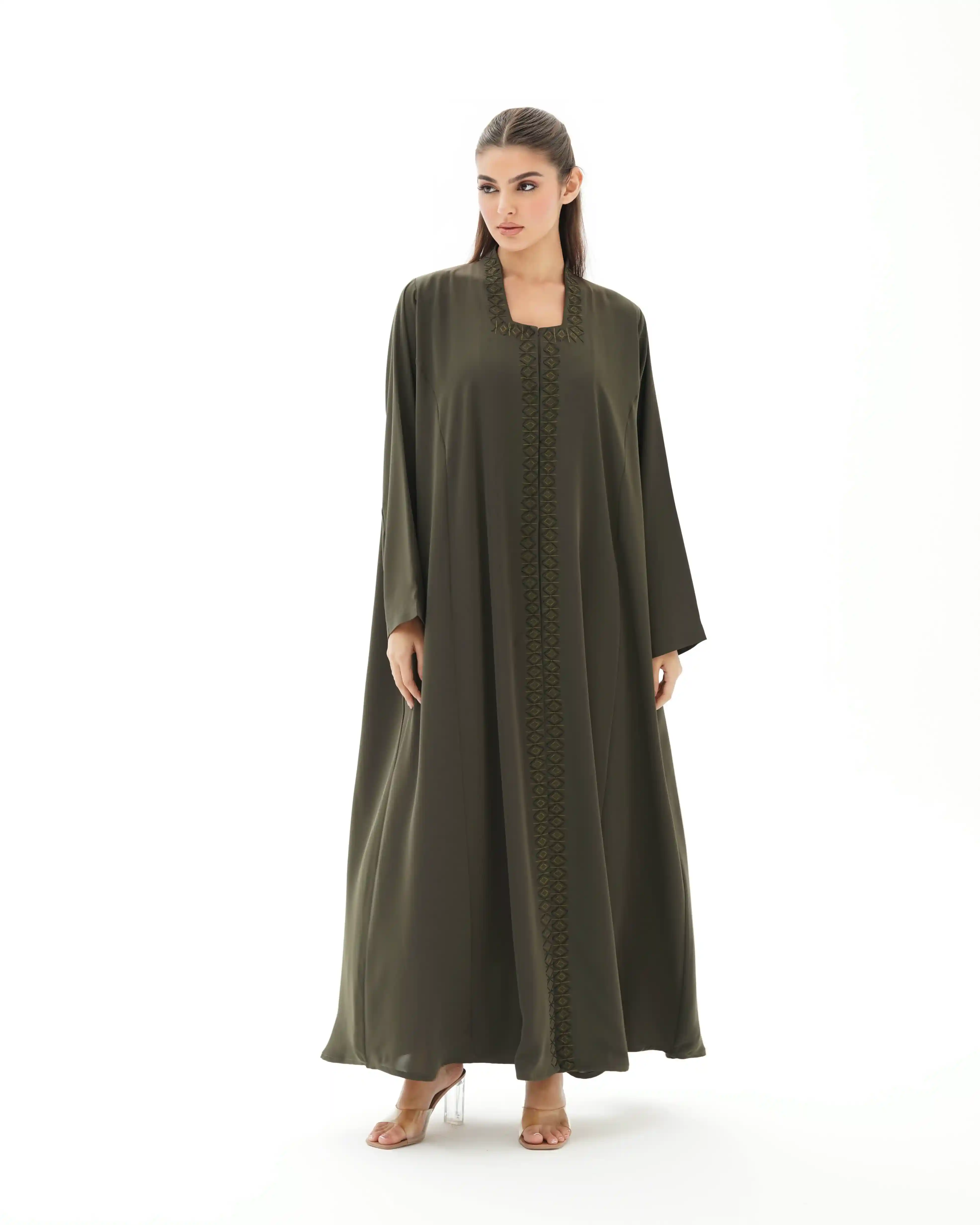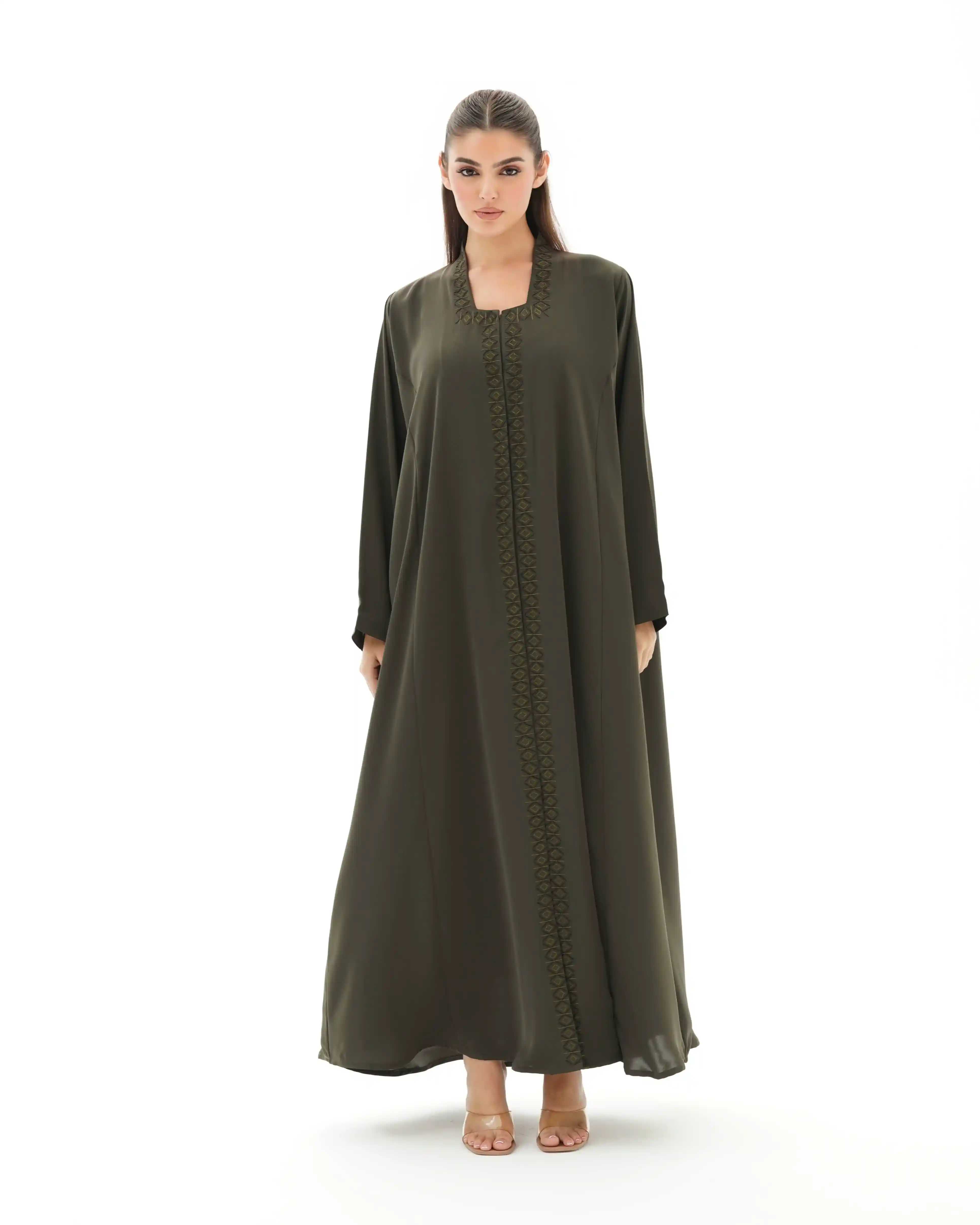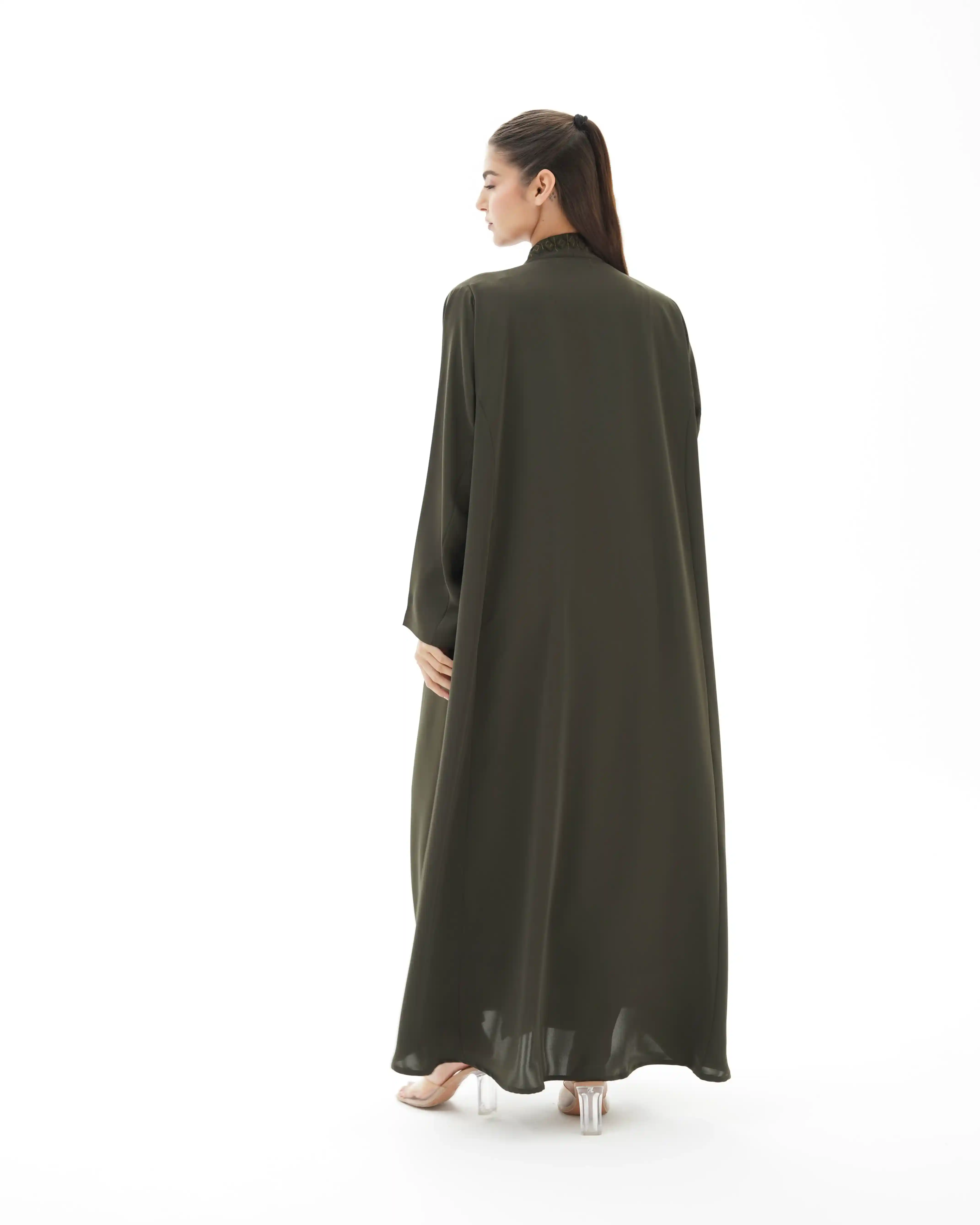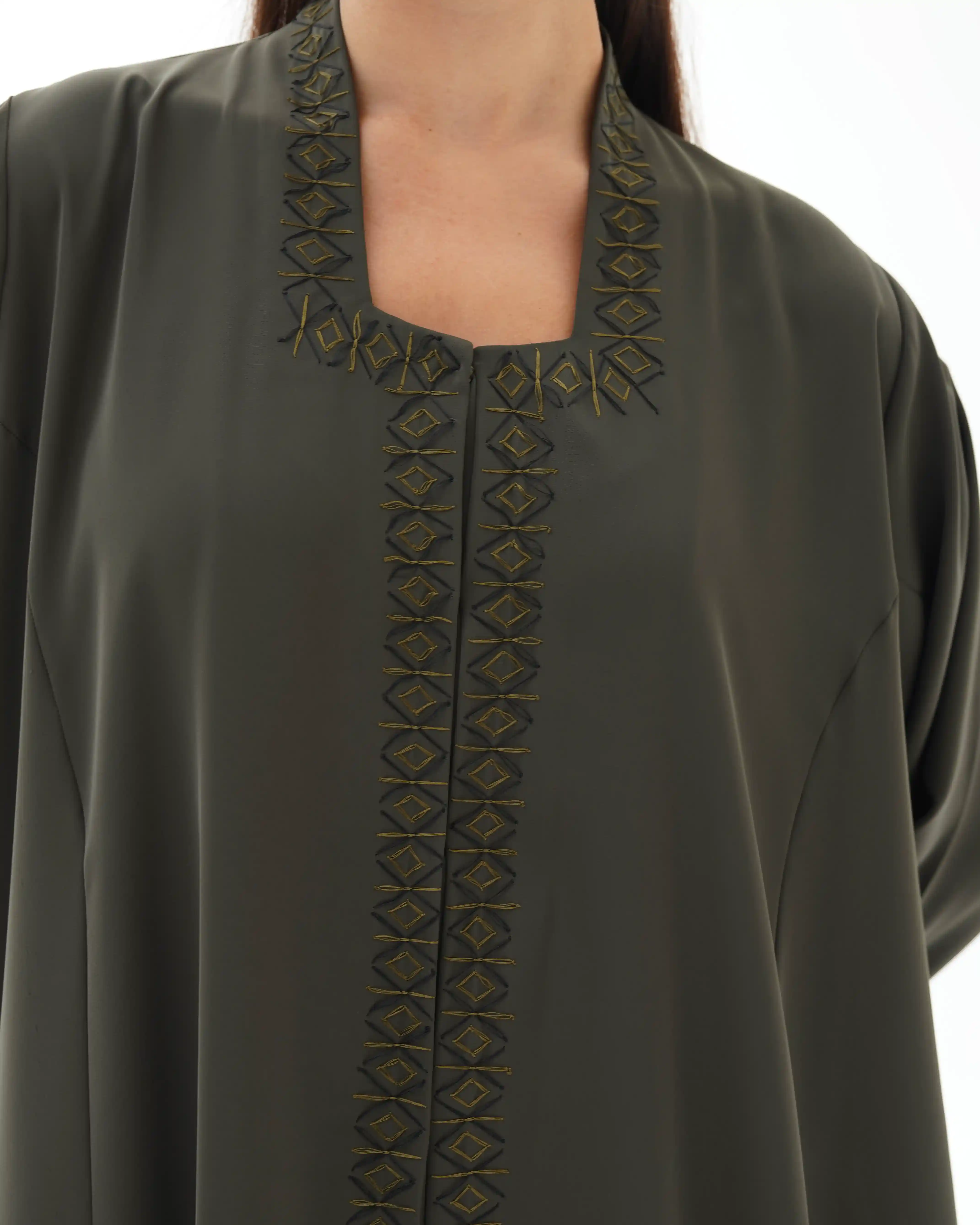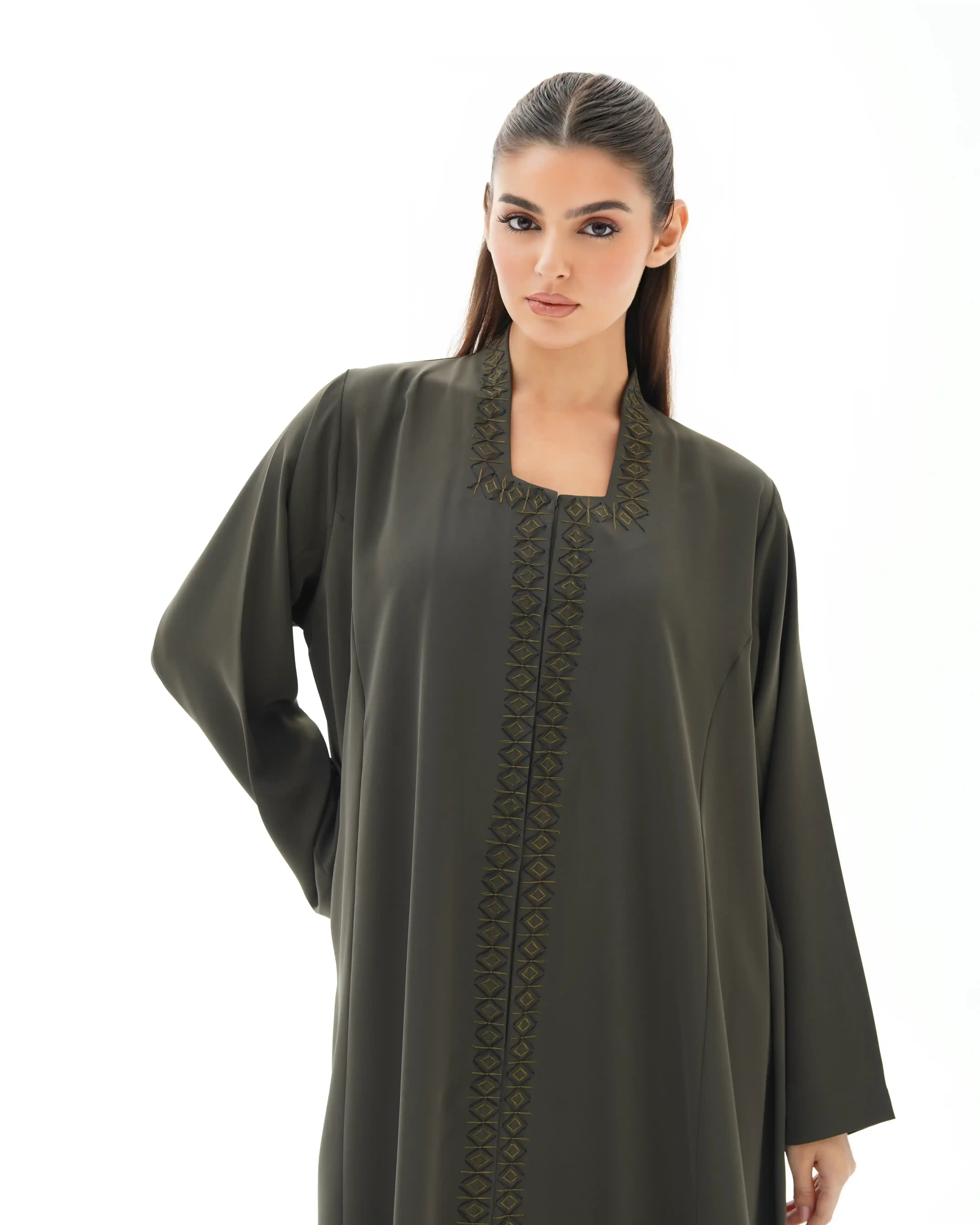 عباية فاخرة مستوحاة من جمال الفن الاسلامي تعيد إحياء روح الموازييك العربي الاسلامي في قالب معاصر. تتميز بقصة رقبة مربعة في شكل هندسي مطرزة بخيوط من الحرير تتشابك في انماط هندسية تحاكي نقوش الاراربيسك التاريخية وتلتف من خلف ياقة الرقبة وتنحدر بانسيابية من الاعلى الى اسفل العباية، صنعت من قماش كريب فاخر وناعم الملمس ينسدل بخفة ويبرز تفاصيل التطريز الحريري. تأتي واسعة من عند الصدر حتى الذيل بانسيابية راقية تمنح حرية في الحركة واناقة في الحضور كما انها مقفلة بالكامل بطقطق مخفي من الامام ليحافظ التصميم على الستر والعملية.