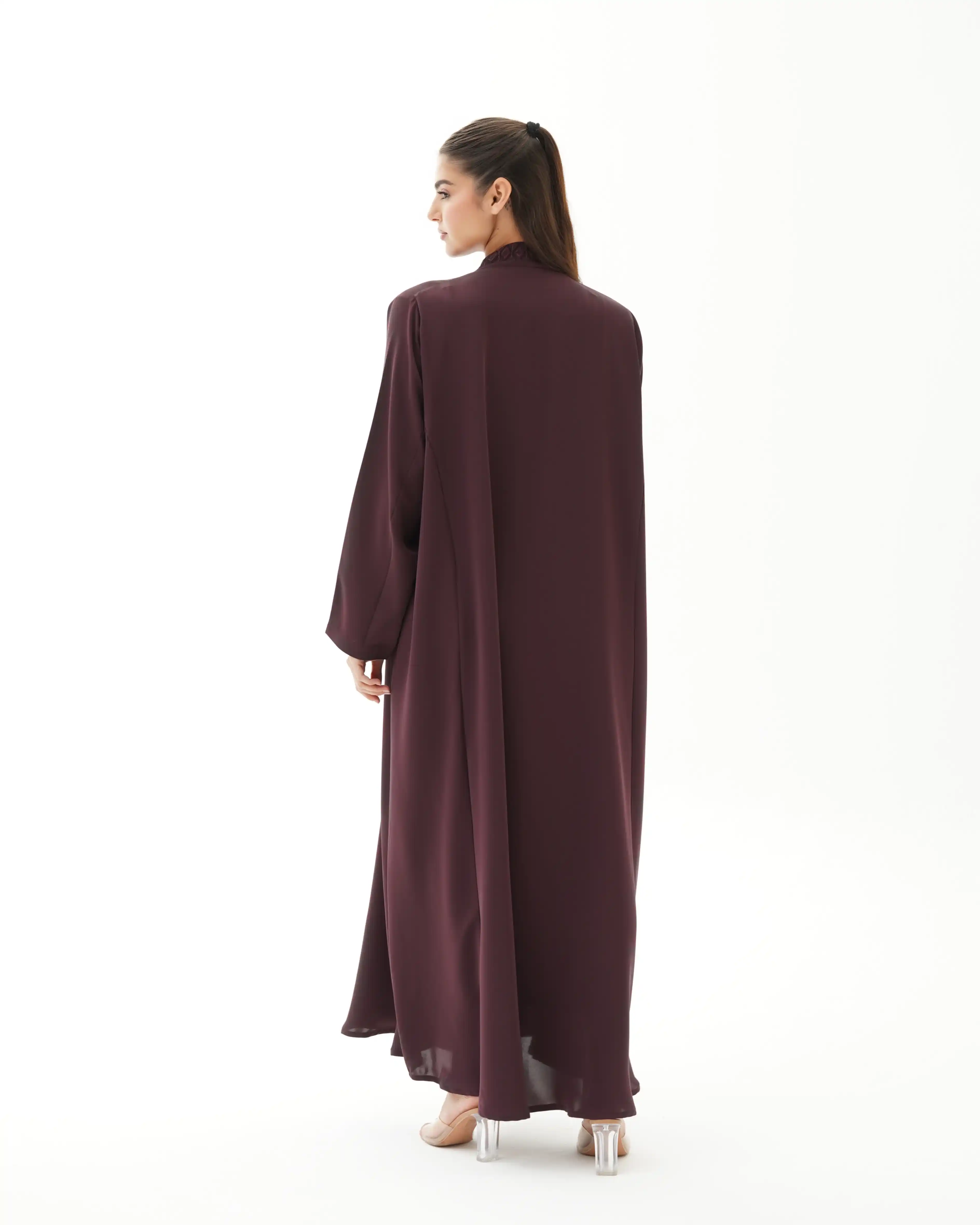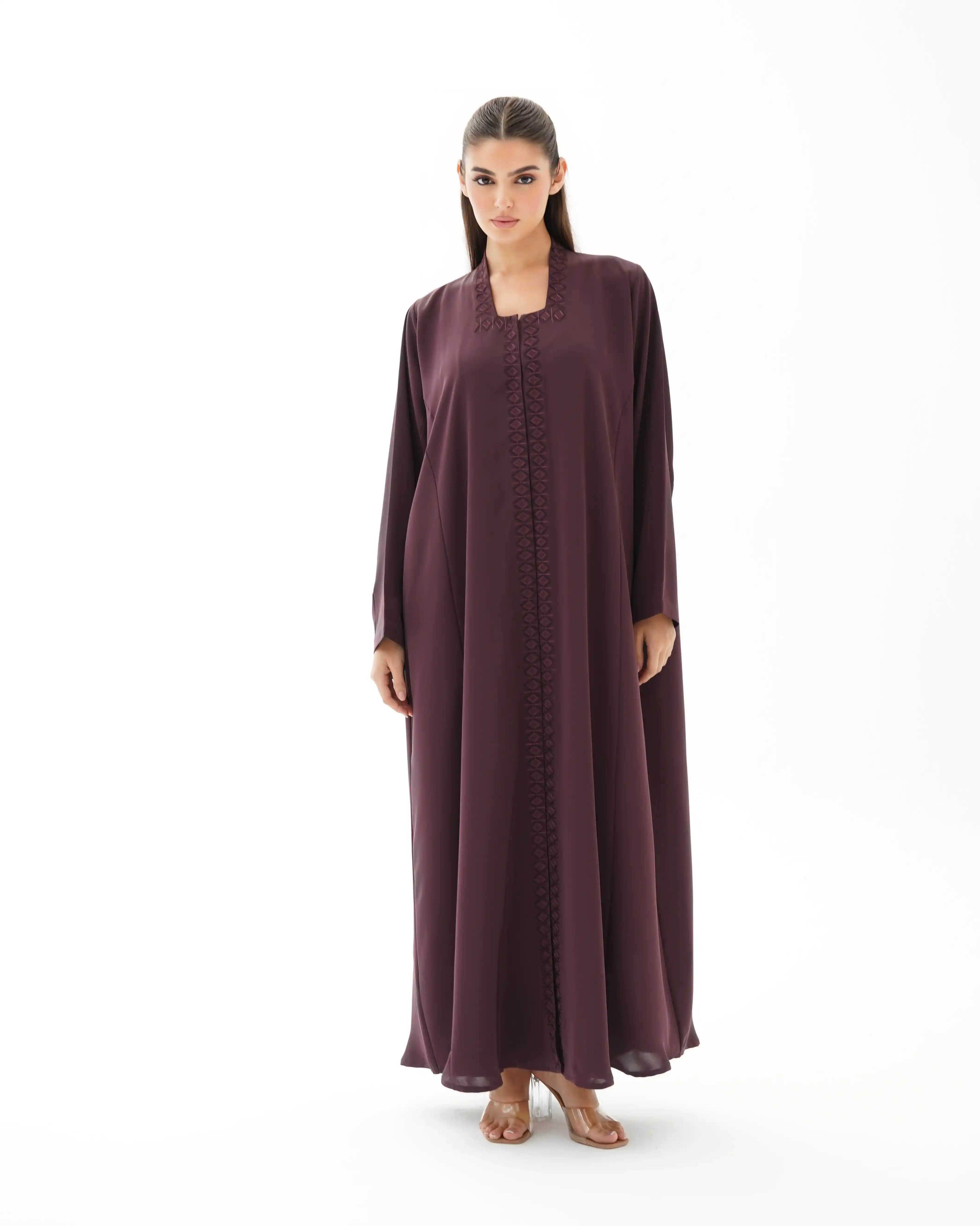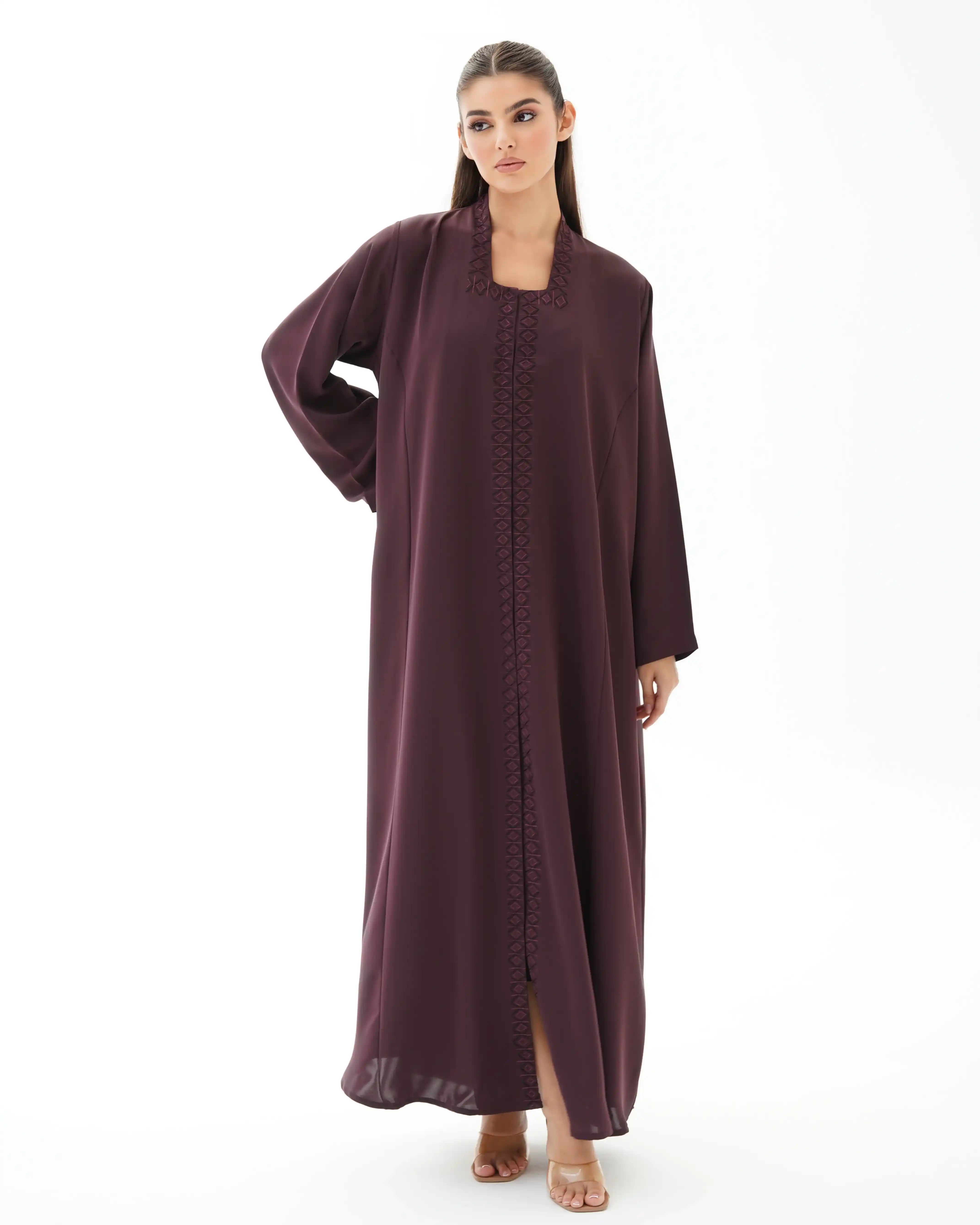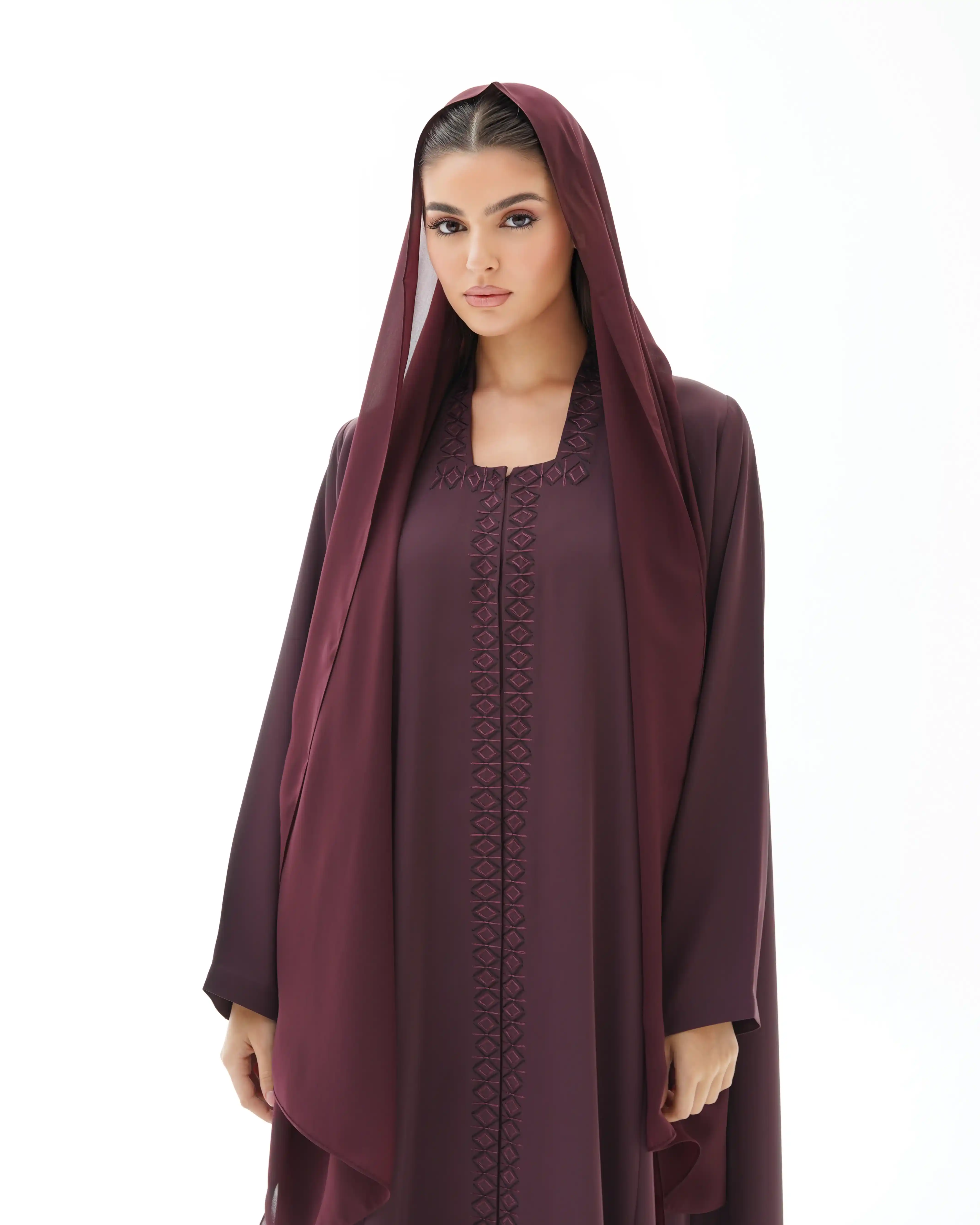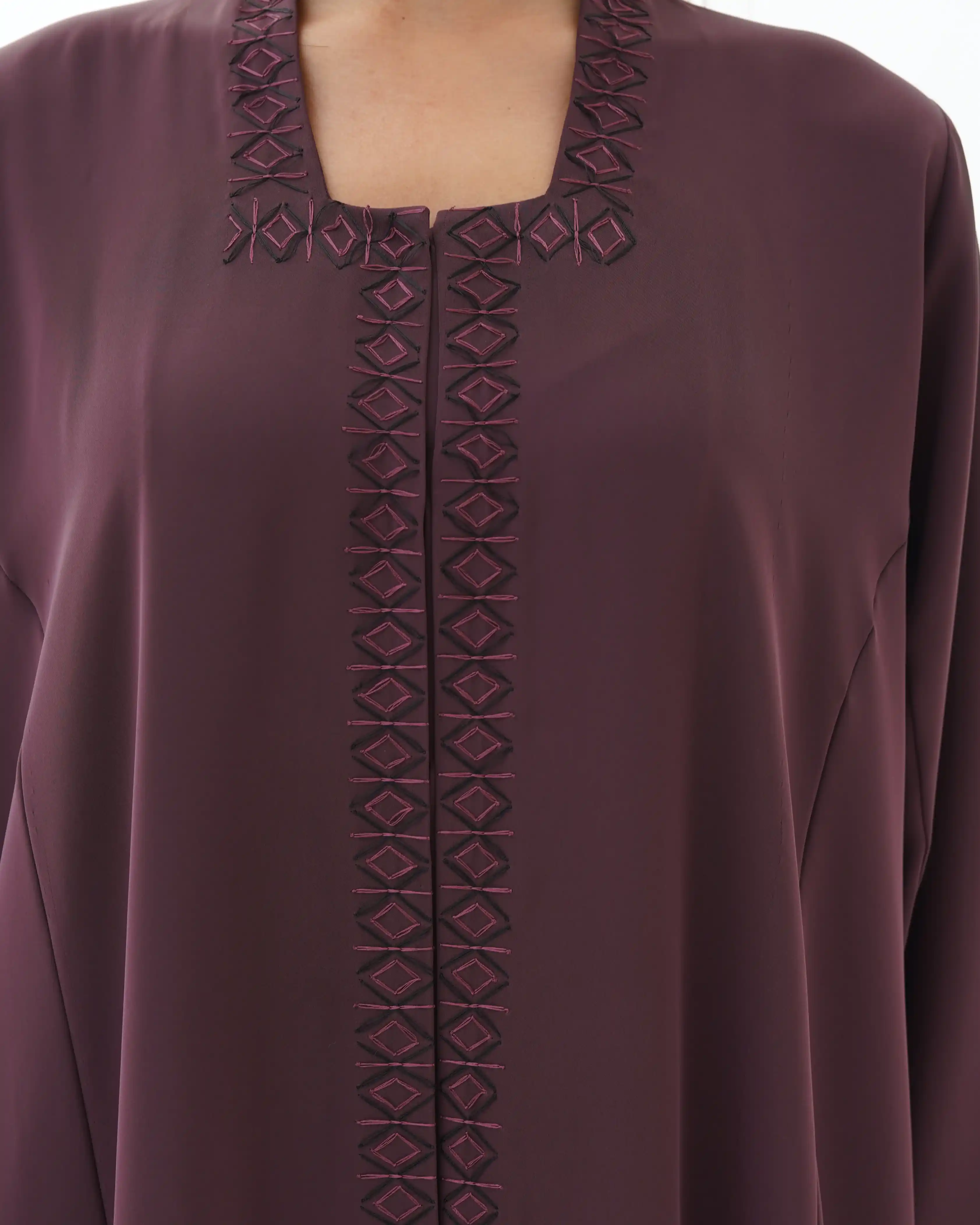 عباية فاخرة مستوحاة من جمال الفن الاسلامي تعيد إحياء روح الموازييك العربي الاسلامي في قالب معاصر. تتميز بقصة رقبة مربعة في شكل هندسي مطرزة بخيوط من الحرير تتشابك في انماط هندسية تحاكي نقوش الاراربيسك التاريخية وتلتف من خلف ياقة الرقبة وتنحدر بانسيابية من الاعلى الى اسفل العباية، صنعت من قماش كريب فاخر وناعم الملمس ينسدل بخفة ويبرز تفاصيل التطريز الحريري. تأتي واسعة من عند الصدر حتى الذيل بانسيابية راقية تمنح حرية في الحركة واناقة في الحضور كما انها مقفلة بالكامل بطقطق مخفي من الامام ليحافظ التصميم على الستر والعملية.