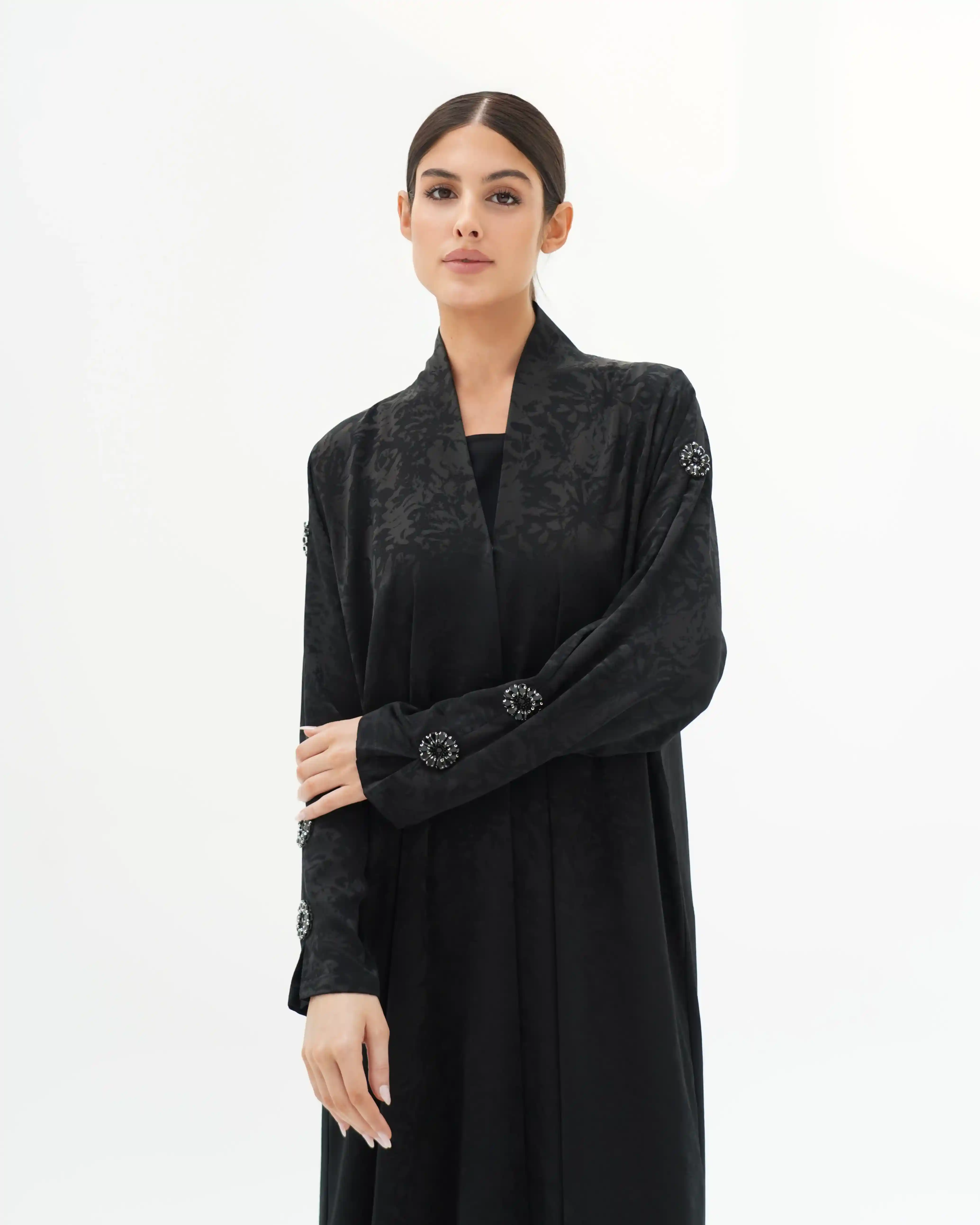 تصميم العباية يرتكز على البساطة الفاخرة بخطوط انسيابية وتفاصيل معدنية/كريستالية تضيف قيمة بصرية راقية دون مبالغة. صُنعت من قماش اسنشيل جاكارد بنقوش ناعمة غير لامعة تظهر وتختفي مع الحركة. الأكمام تأتي بخط مستقيم ناعم يتزيّن بكريستالات دائرية موزعة بدقة لتمنح توازناً بصرياً وتحوّلها إلى عنصر جمالي بارز. الكريستالات المعدنية الداكنة بلمعتها الراقية تشبه نجمة أو زهرة صغيرة، فتمنح التصميم لمسة أشبه بالمجوهرات وتعكس هوية واضحة للعباية. أما الياقة المستقيمة البسيطة فتضفي مظهراً أنيقاً وتوجّه التركيز نحو تفاصيل الأكمام.