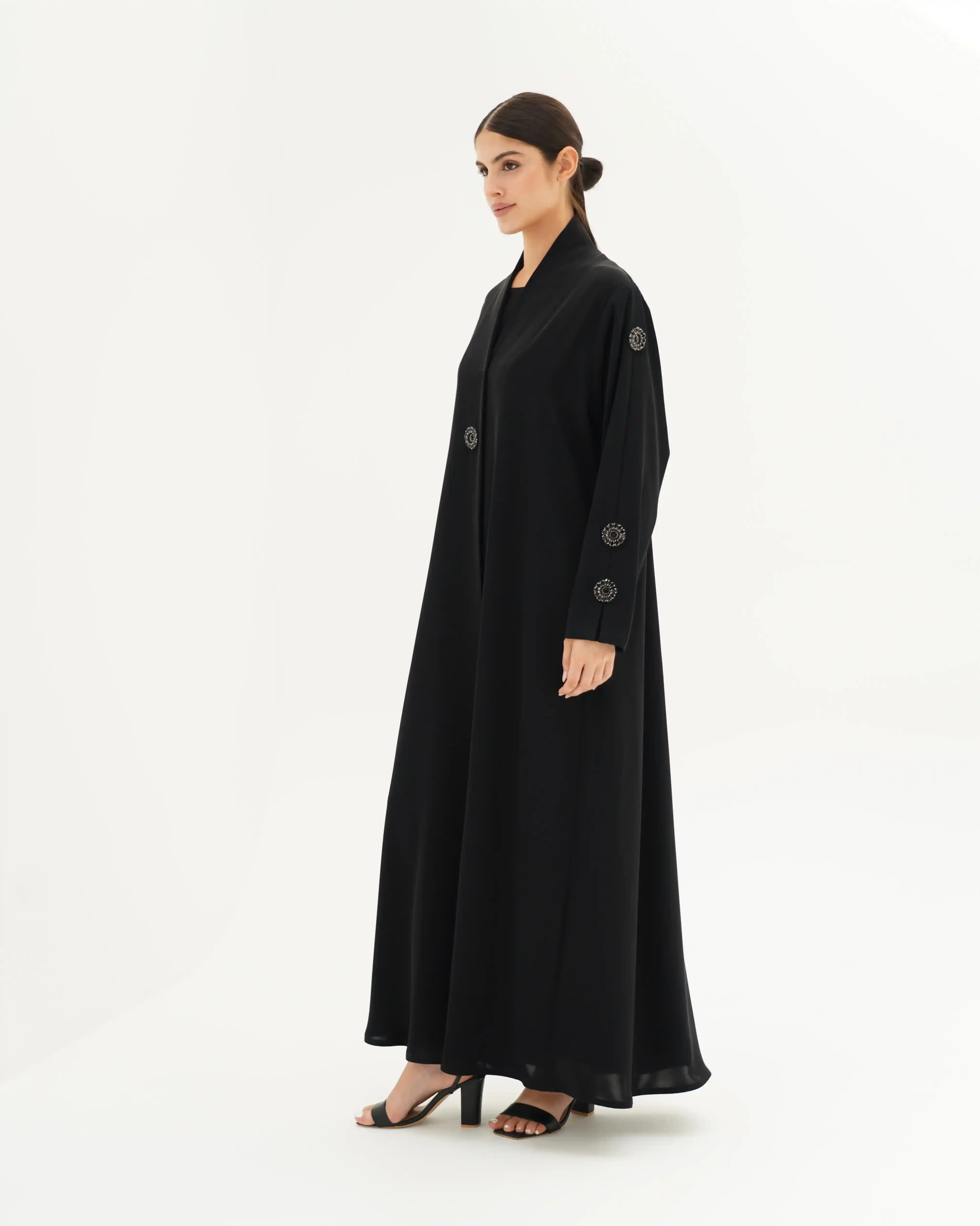 عباية بتصميم هادئ ينتمي إلى فخامة التفاصيل المدروسة، تنسدل بقصّة مستقيمة وانسيابية نقية توازن بين البساطة والرقي. الأكمام تأتي بخط نظيف مع ثنية ناعمة في منتصف الكم، مزدانة بعناصر معدنية/كريستالية دائرية داكنة تشبه زهرة أو نجمة صغيرة، موزعة بتوازن مدروس على الأكمام ذات الثنية الناعمة في منتصف الكم، وعلى الصدر والطرحة. لتمنح حضورًا بصريًا أشبه بالمجوهرات ، في انسجام متكامل يعكس هوية التصميم. ما الياقة المستقيمة البسيطة فتضفي مظهراً أنيقاً وتوجّه التركيز نحو تفاصيل الأكمام.
