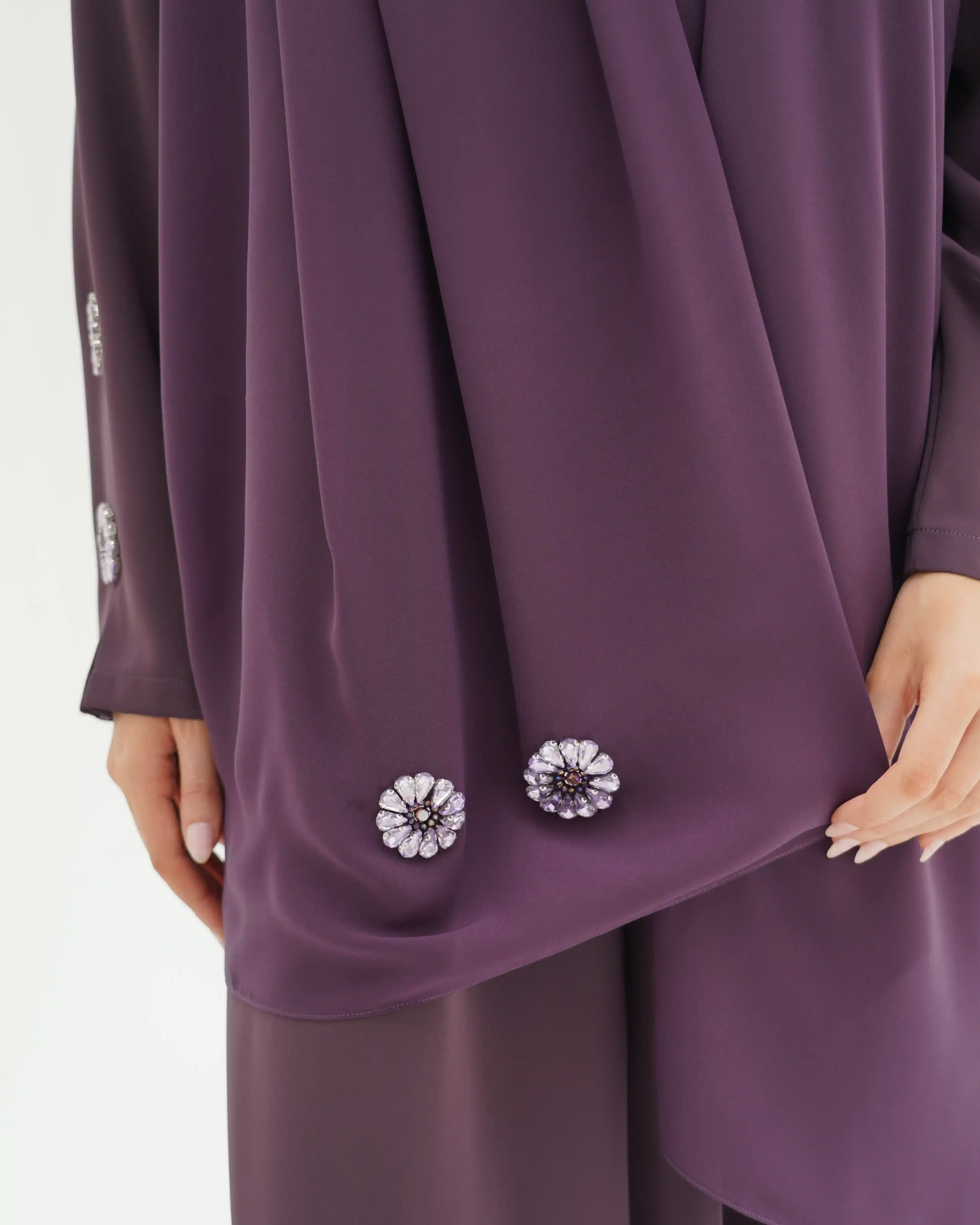 • الأكمام مزينة بكرستال معدني دائري بتصميم زهري أنيق، باللون بنفسجي داكن موزع بتناسق على الأكمام والصدر.