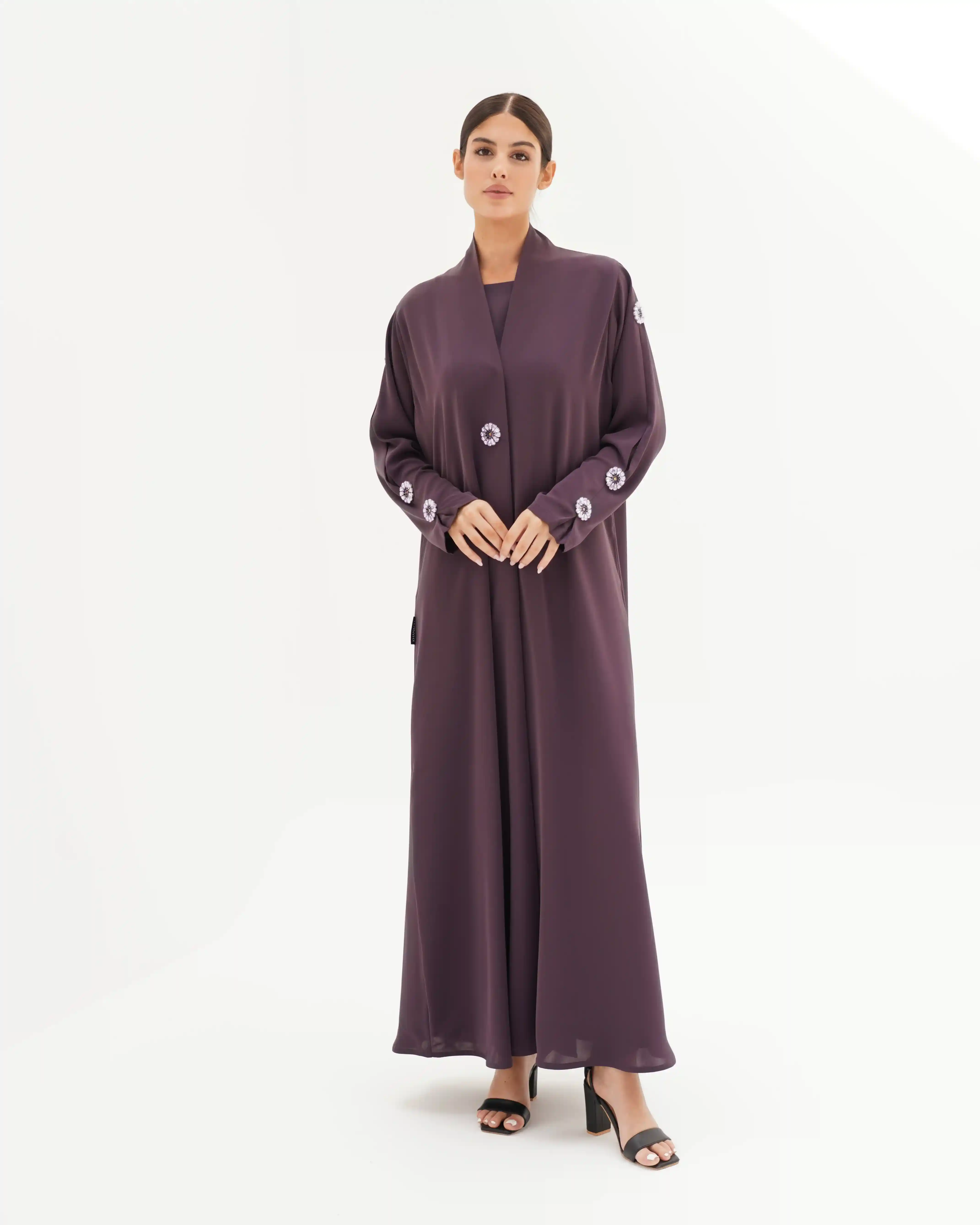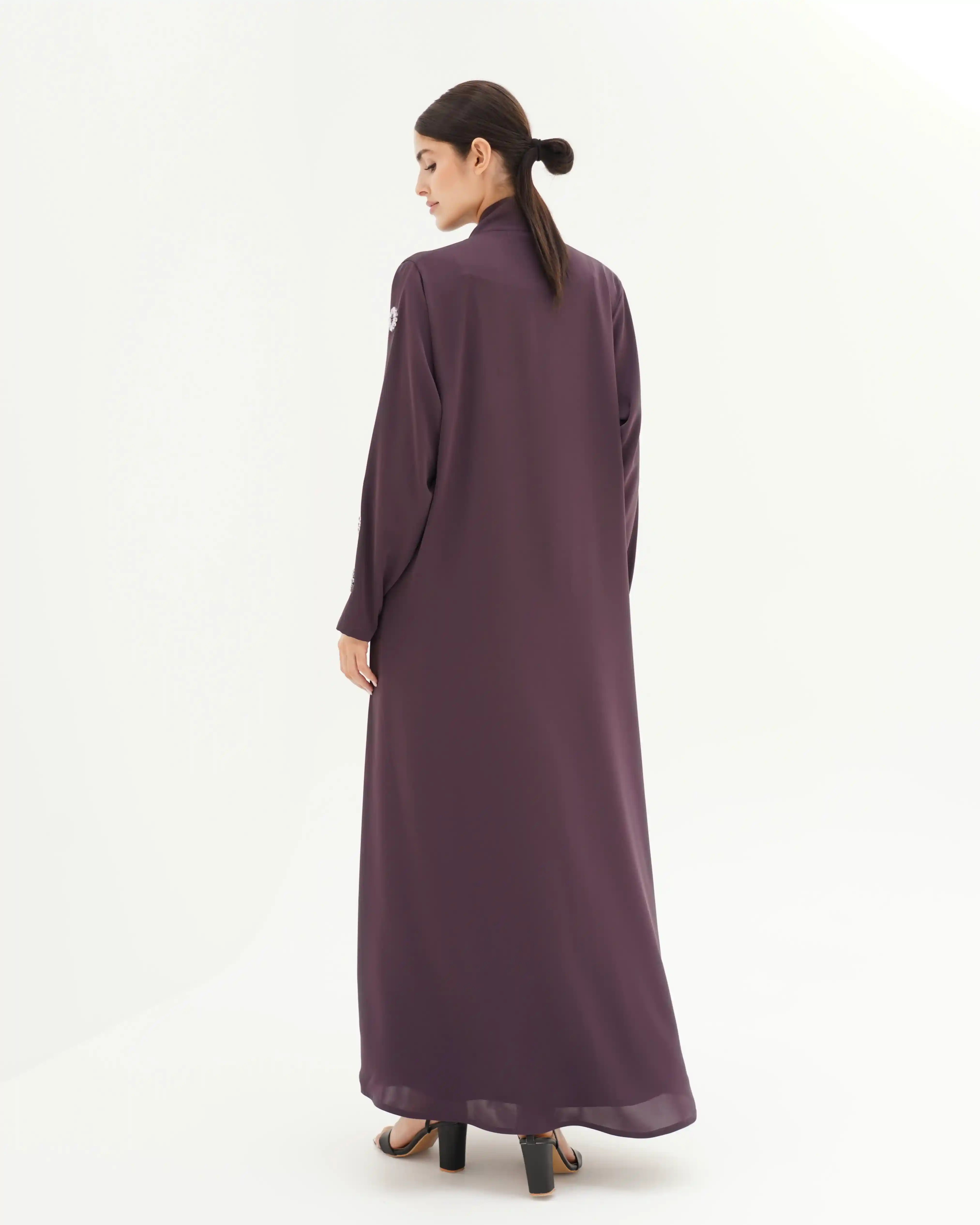 • لون بنفسجي داكن كامل العباية مع كرستال باللون بنفسجي داكن.