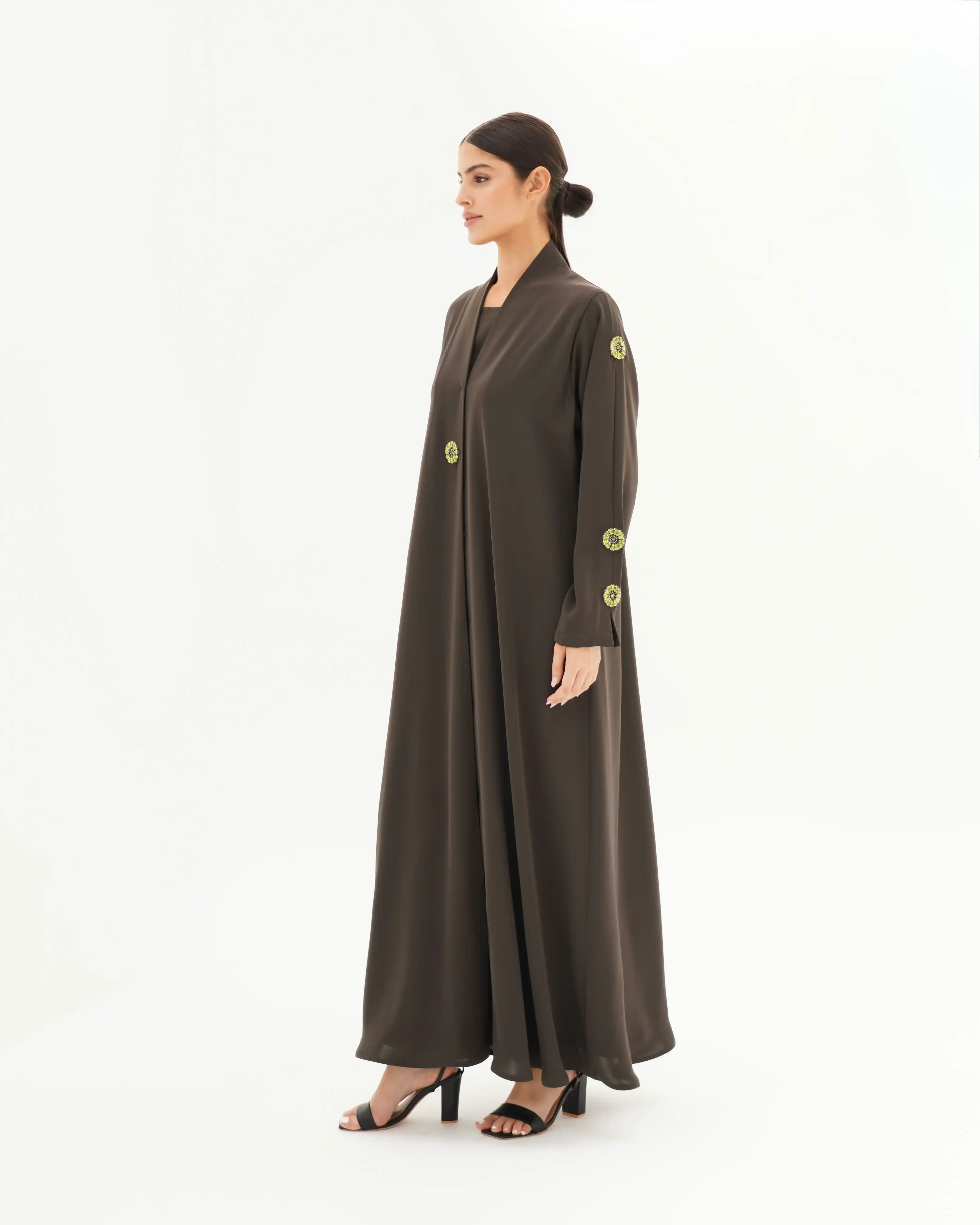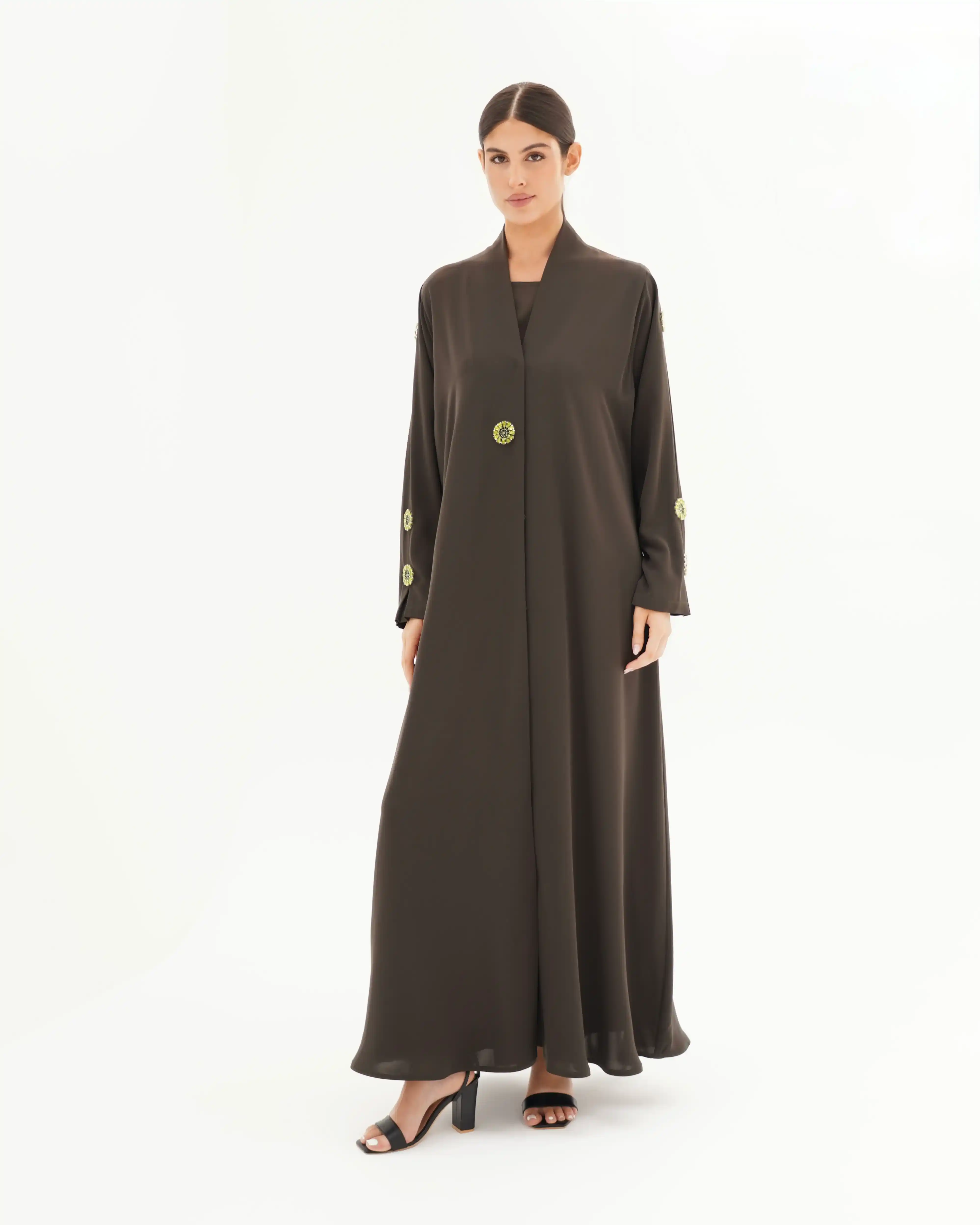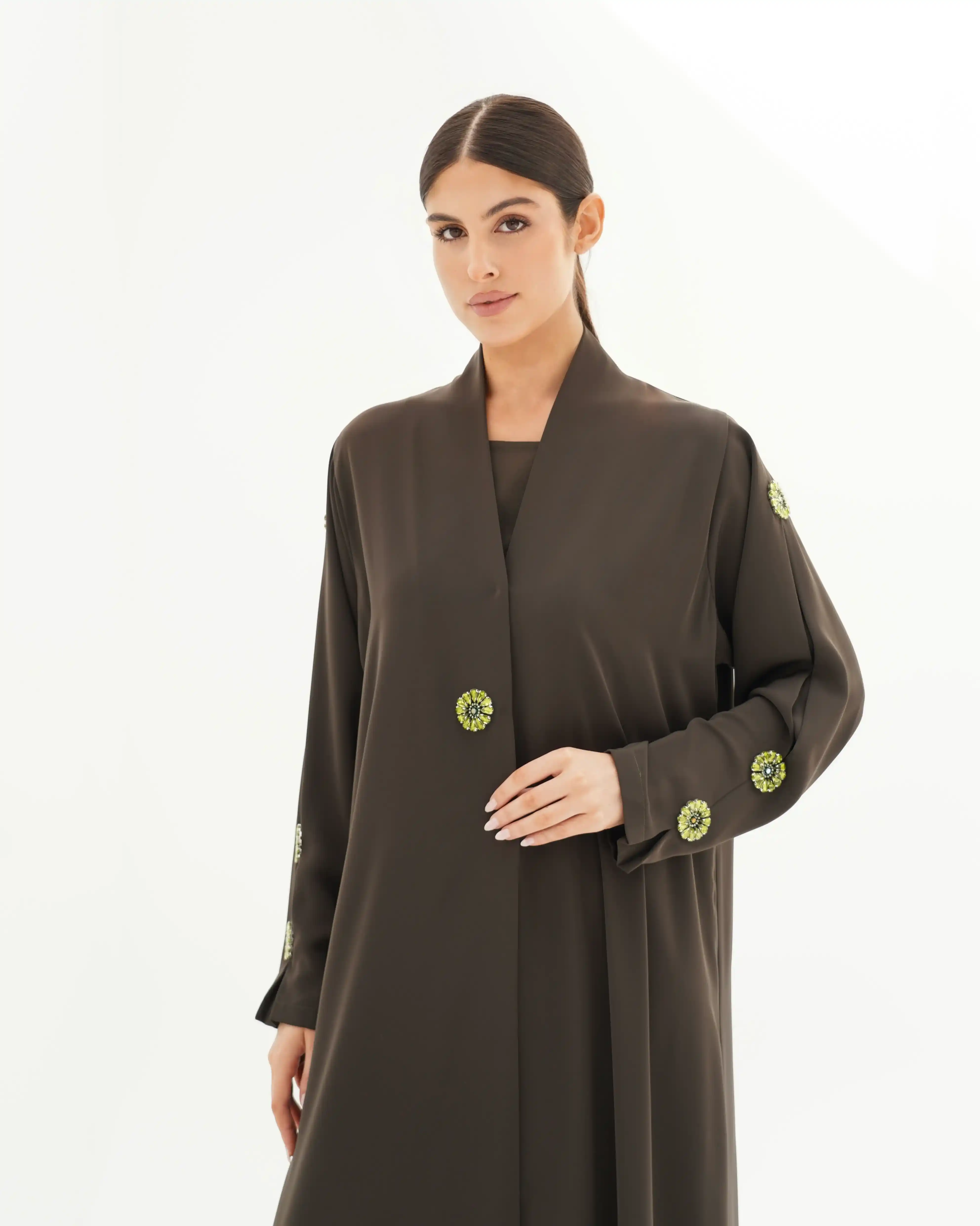 • الأكمام مزينة بكرستال معدني دائري بتصميم زهري أنيق، باللون الزيتوني موزع بتناسق على الأكمام والصدر.