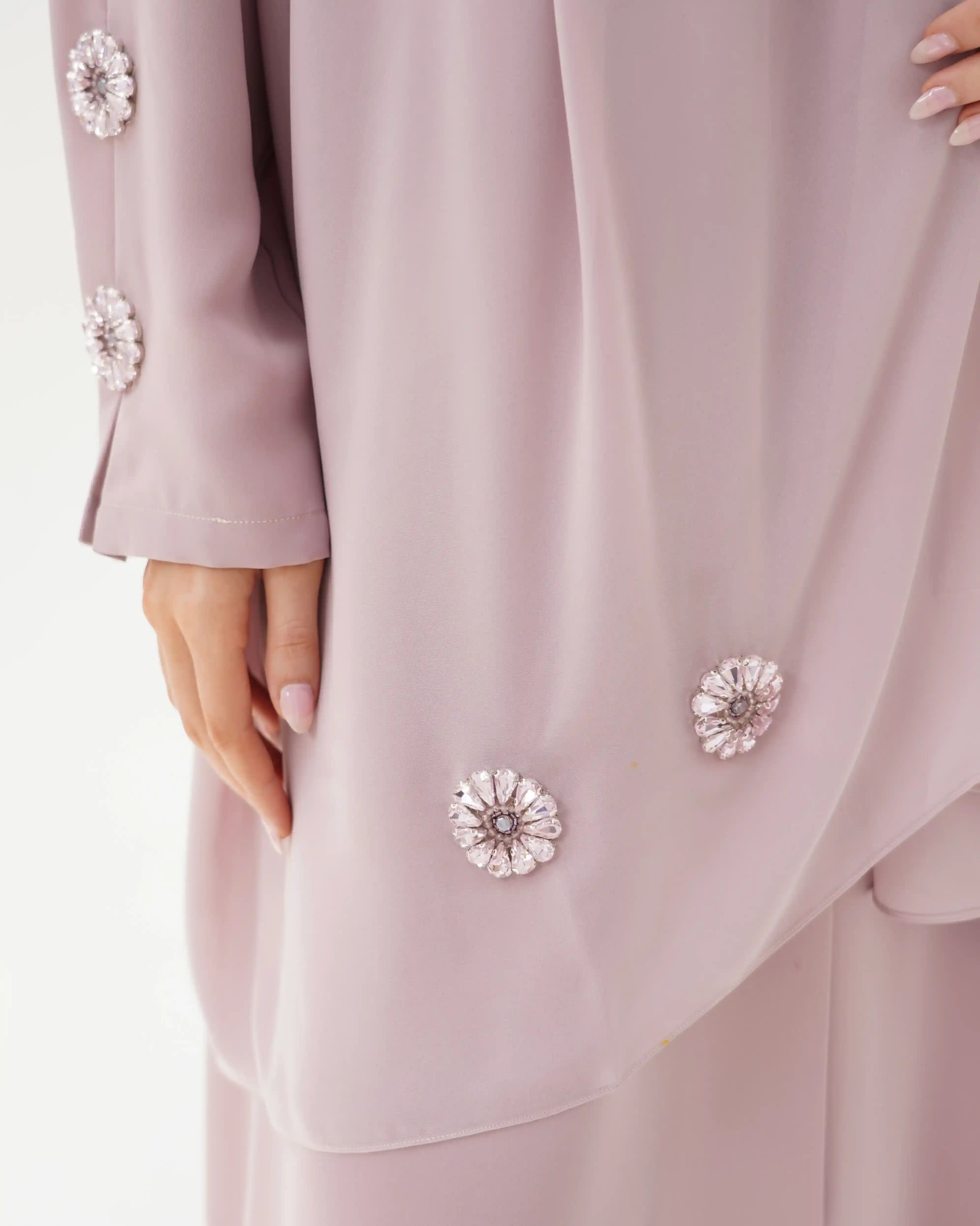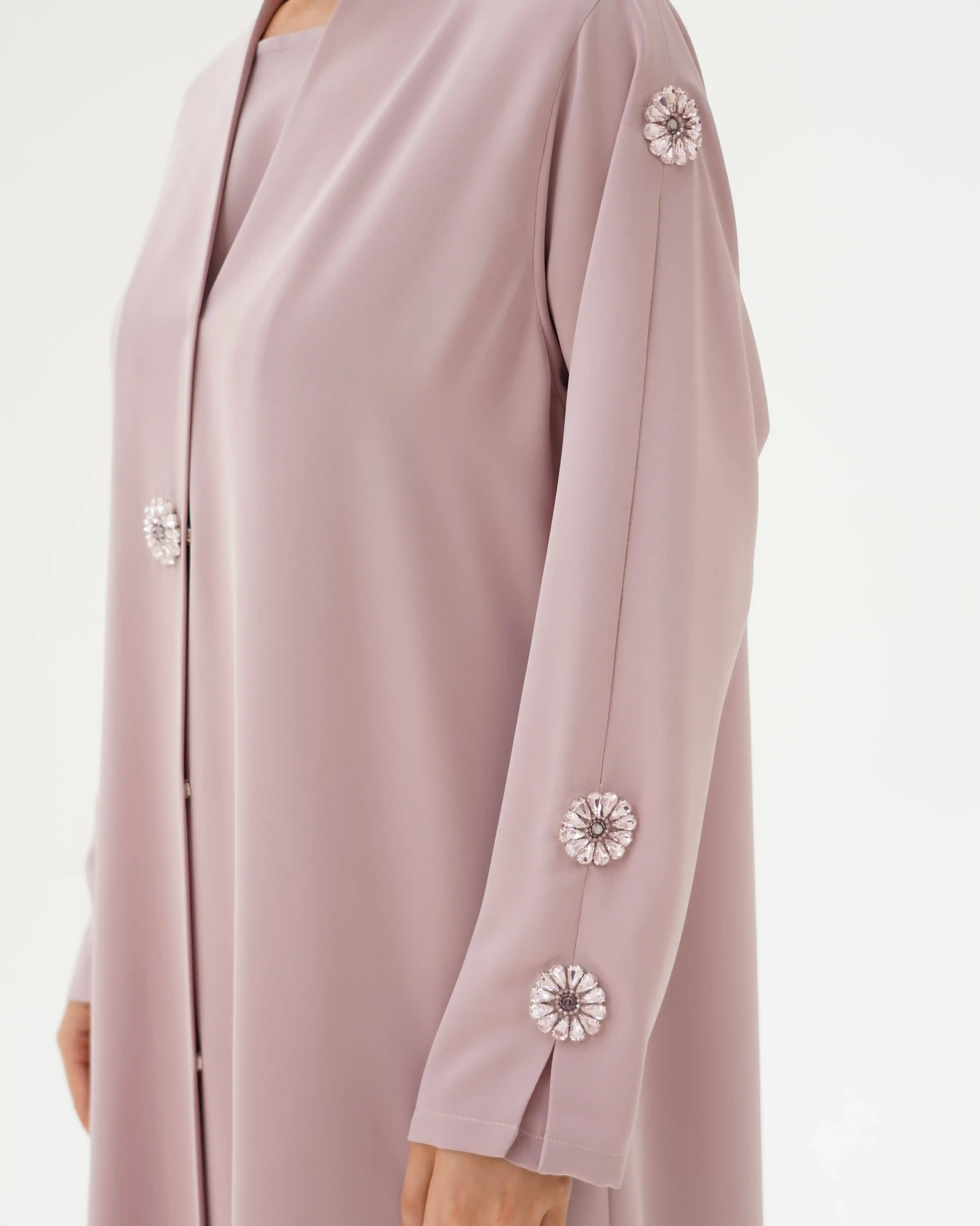 • الأكمام مزينة بكرستال معدني دائري بتصميم زهري أنيق، باللون روز موزع بتناسق على الأكمام والصدر.