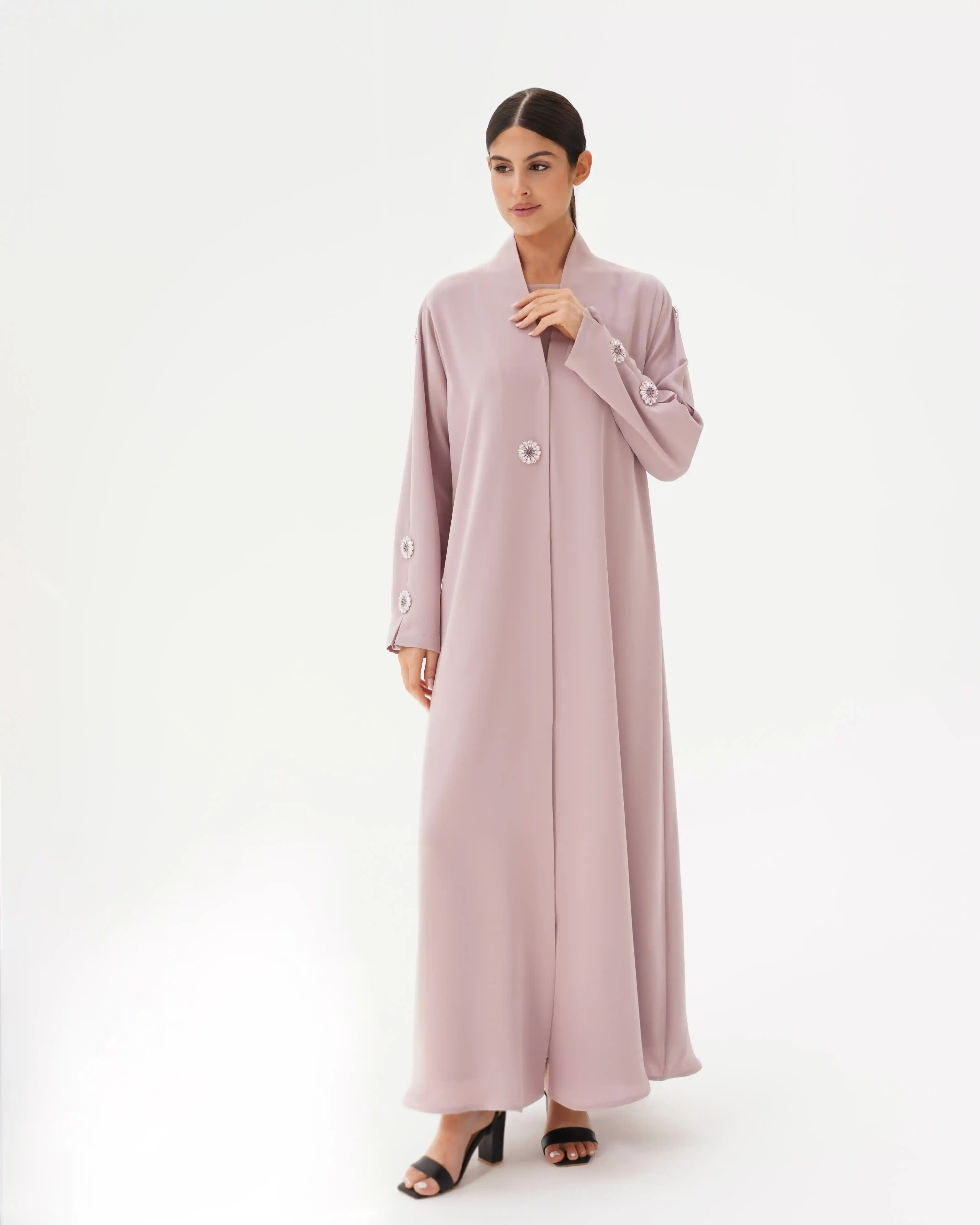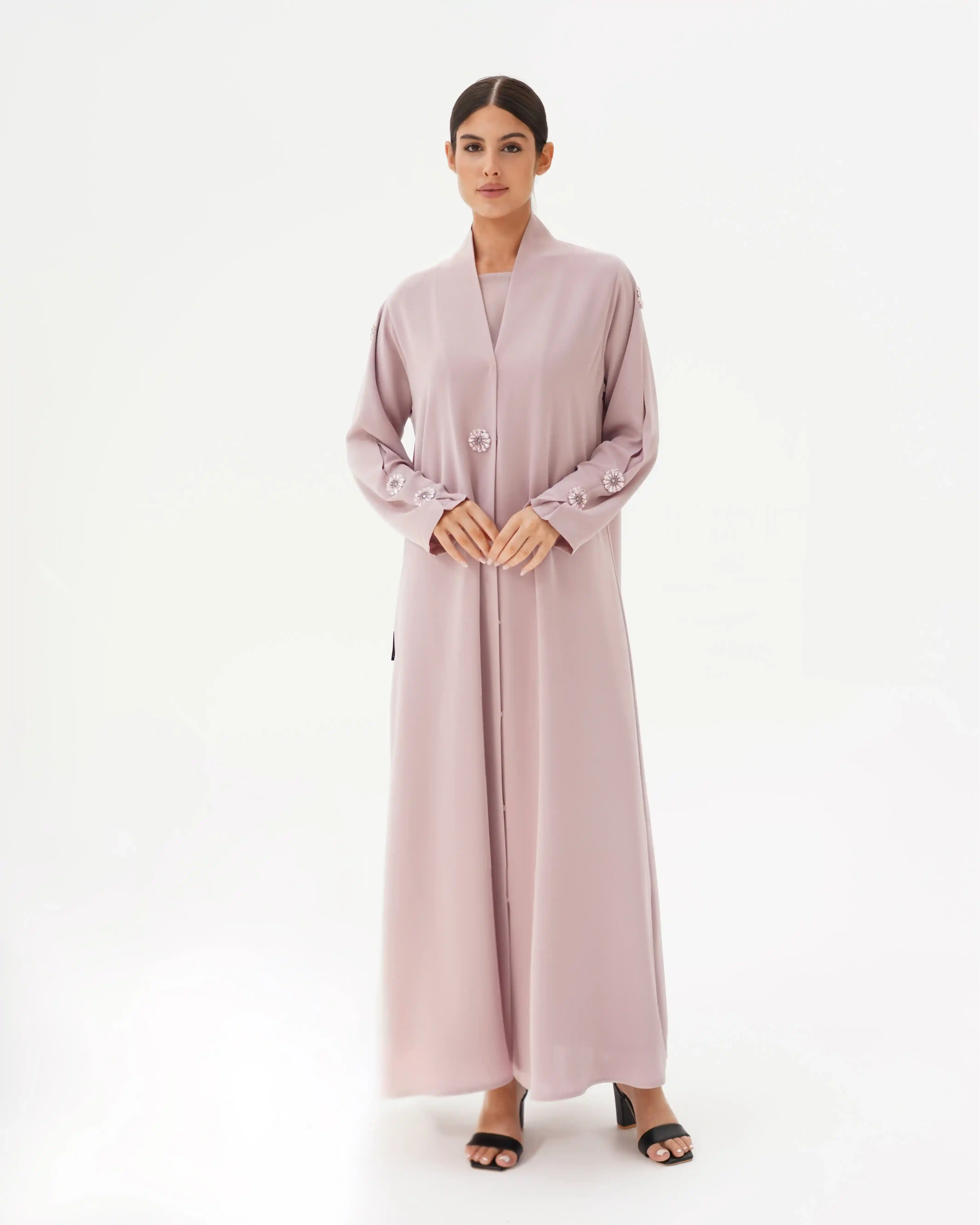 تصميم العباية يرتكز على البساطة الفاخرة بخطوط انسيابية وتفاصيل معدنية/كريستالية تضيف قيمة بصرية راقية دون مبالغة. صُنعت من قماش بريميوم كريب الذي ينسدل بخفة ويعزز نقاء الخطوط وانسيابية القَصّة. الأكمام تأتي بخط مستقيم ناعم يتزيّن بكريستالات دائرية موزعة بدقة لتمنح توازناً بصرياً وتحوّلها إلى عنصر جمالي بارز. الكريستالات المعدنية الداكنة بلمعتها الراقية تشبه نجمة أو زهرة صغيرة، فتمنح التصميم لمسة أشبه بالمجوهرات وتعكس هوية واضحة للعباية. أما الياقة المستقيمة البسيطة فتضفي مظهراً أنيقاً وتوجّه التركيز نحو تفاصيل الأكمام.