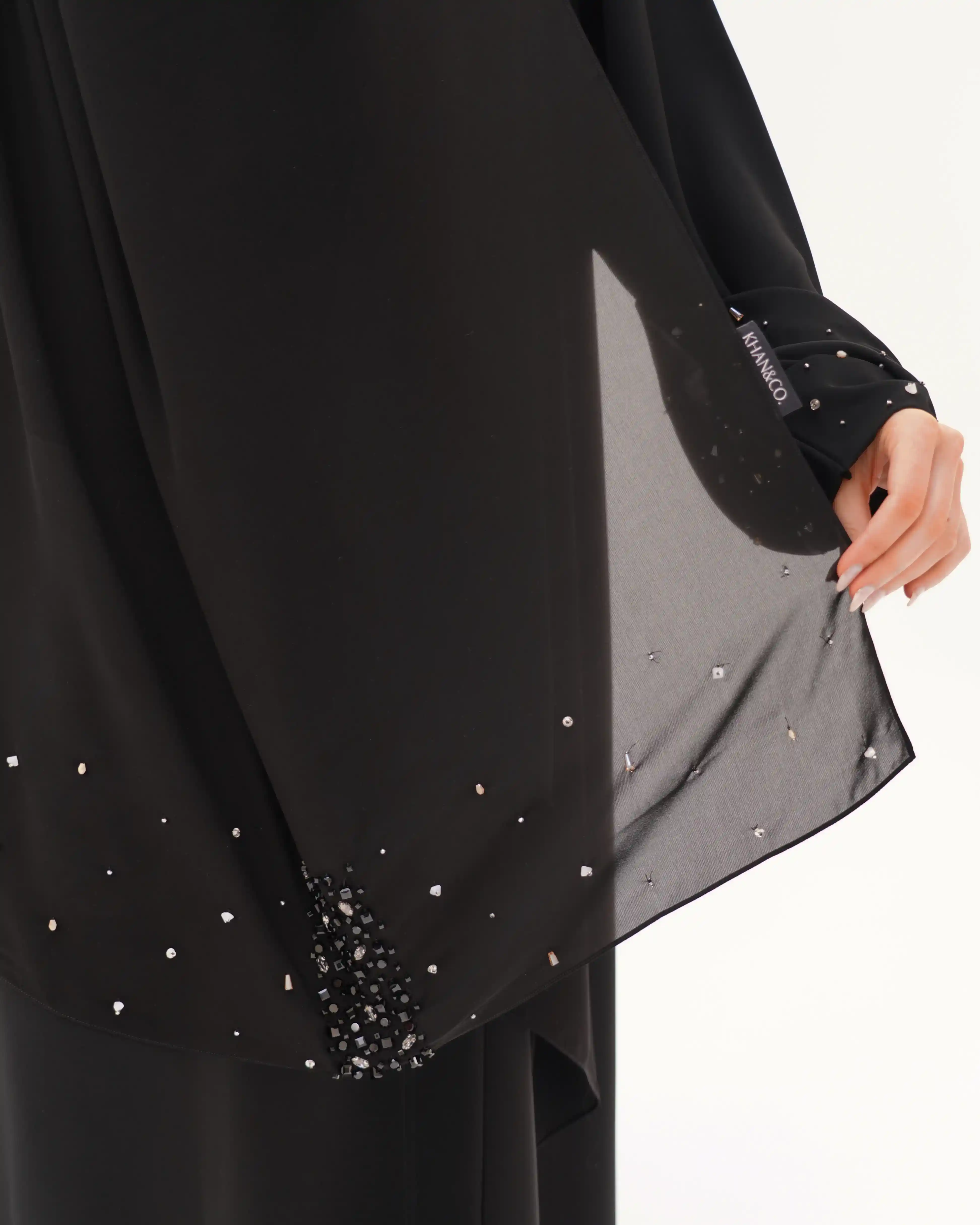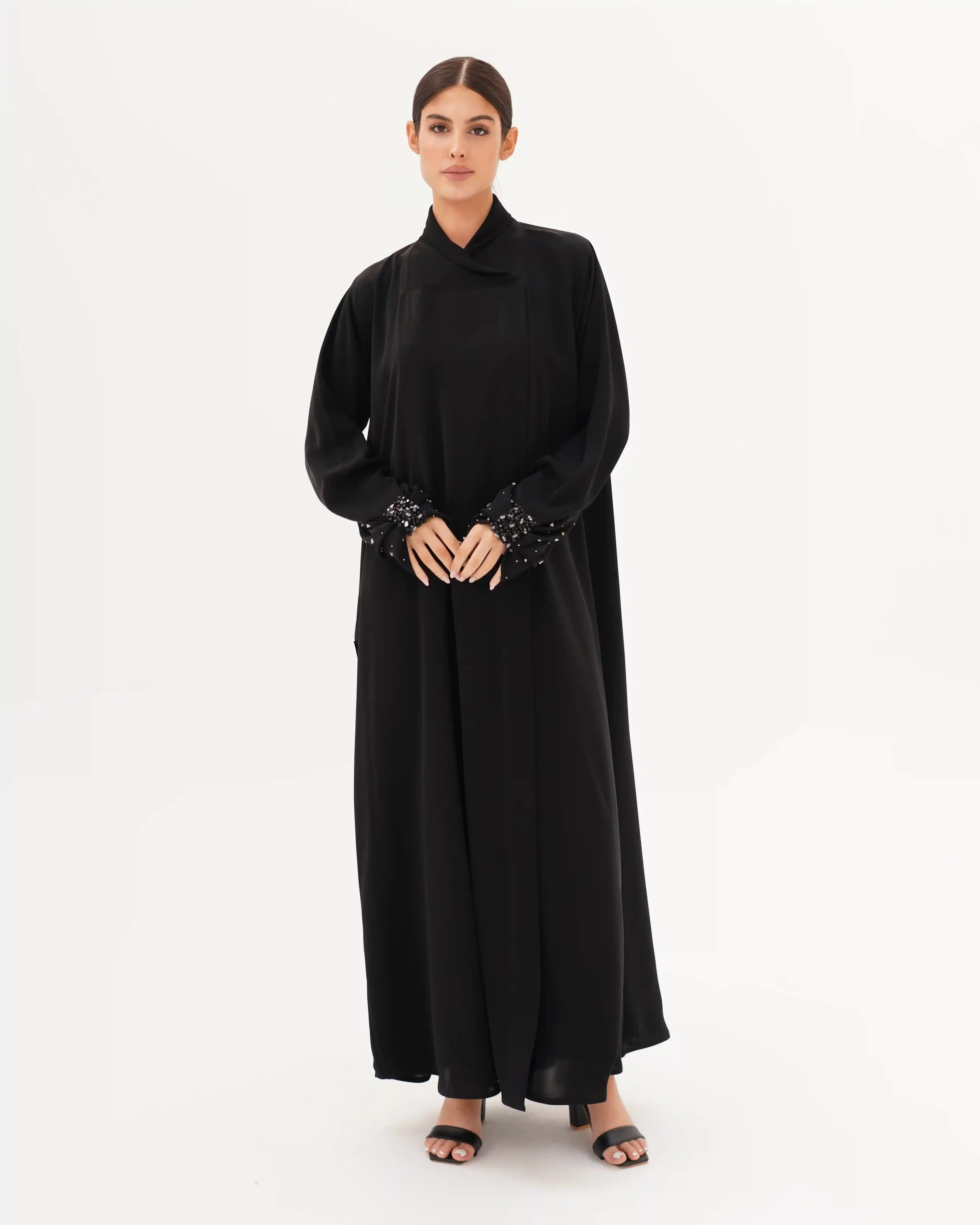 عباية بقصّة مستقيمة تنسدل بانسيابية متوازنة، مصنوعة من قماش البريميوم كريب بملمس ناعم وحركة طبيعية. تأتي بياقة هاي نيك أنيقة بخط نظيف يعزز توازن التصميم، بينما تبرز الأكمام بتكوين واسع ينتهي بتجميع ناعم عند المعصم، مزين بخرز أسود كثيف موزع بدقة يضفي عمقًا بصريًا راقيًا. تكتمل القطعة بطرحة من نفس القماش، مشتغلة بانتثار خفيف للخرز على الأطراف، لتجسّد وحدة التصميم وأناقة التفاصيل المدروسة.