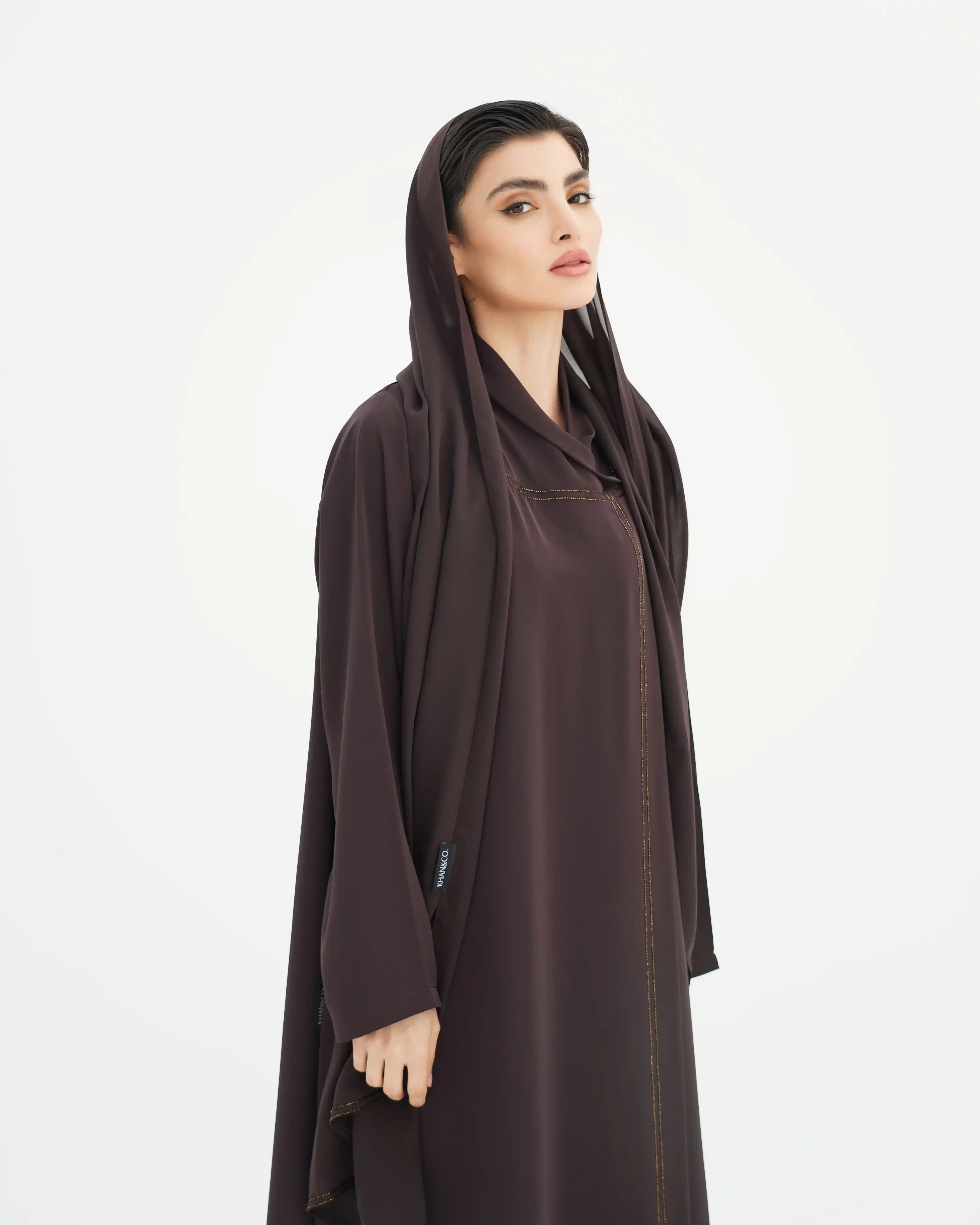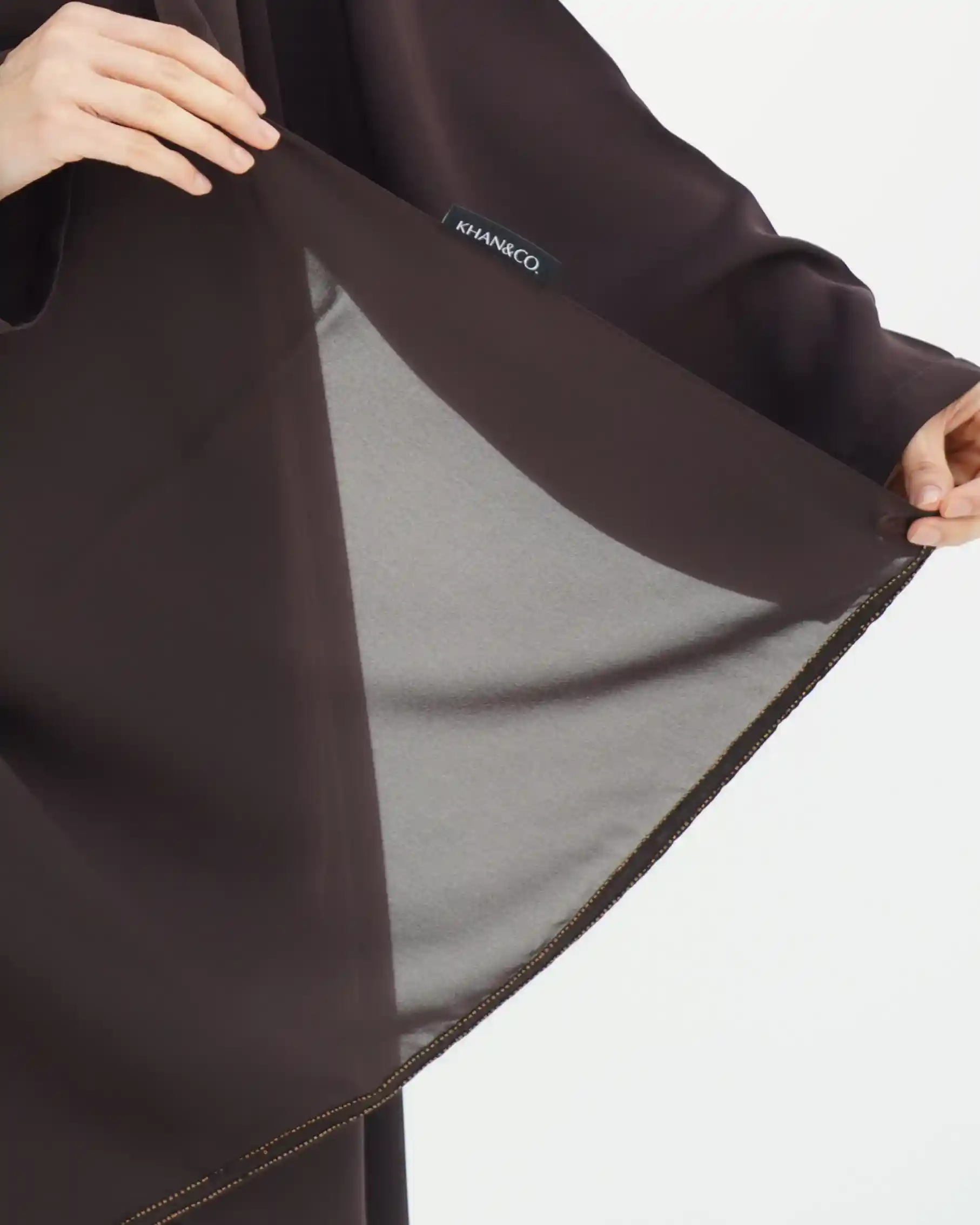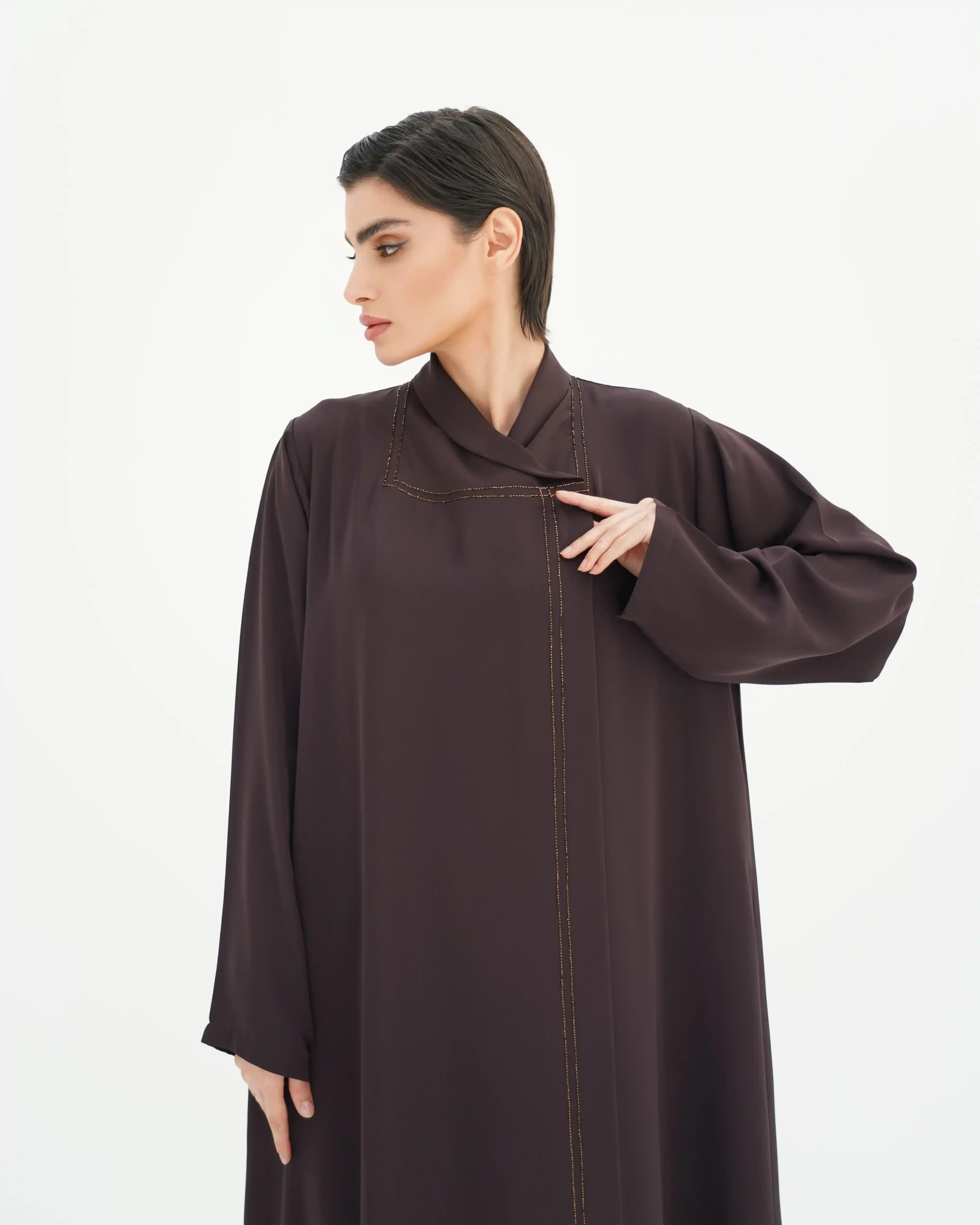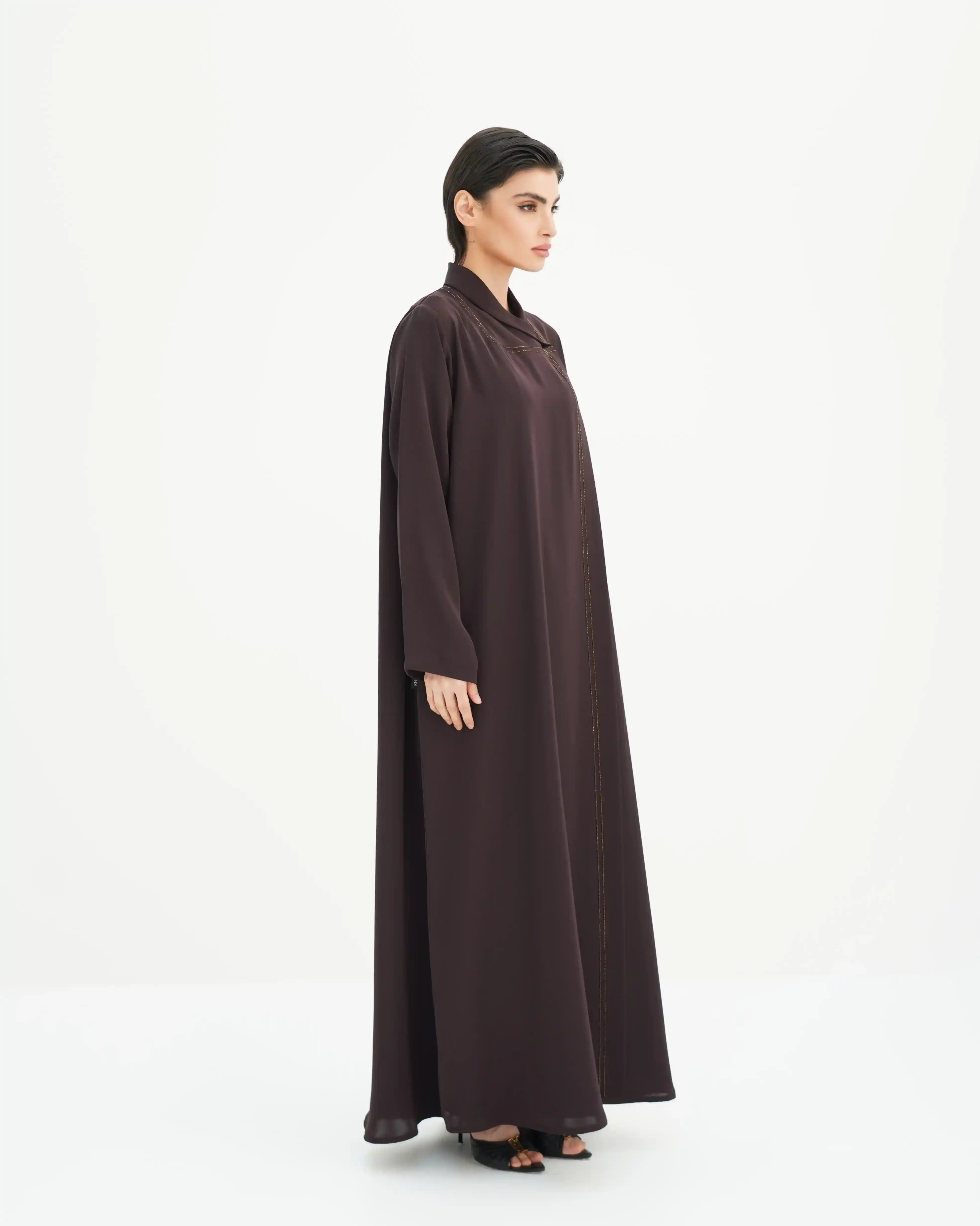 • خطوط دقيقة من الخرز بني اللامع تمتد من خلف شريط الرقبة حتى أسفل العباية.