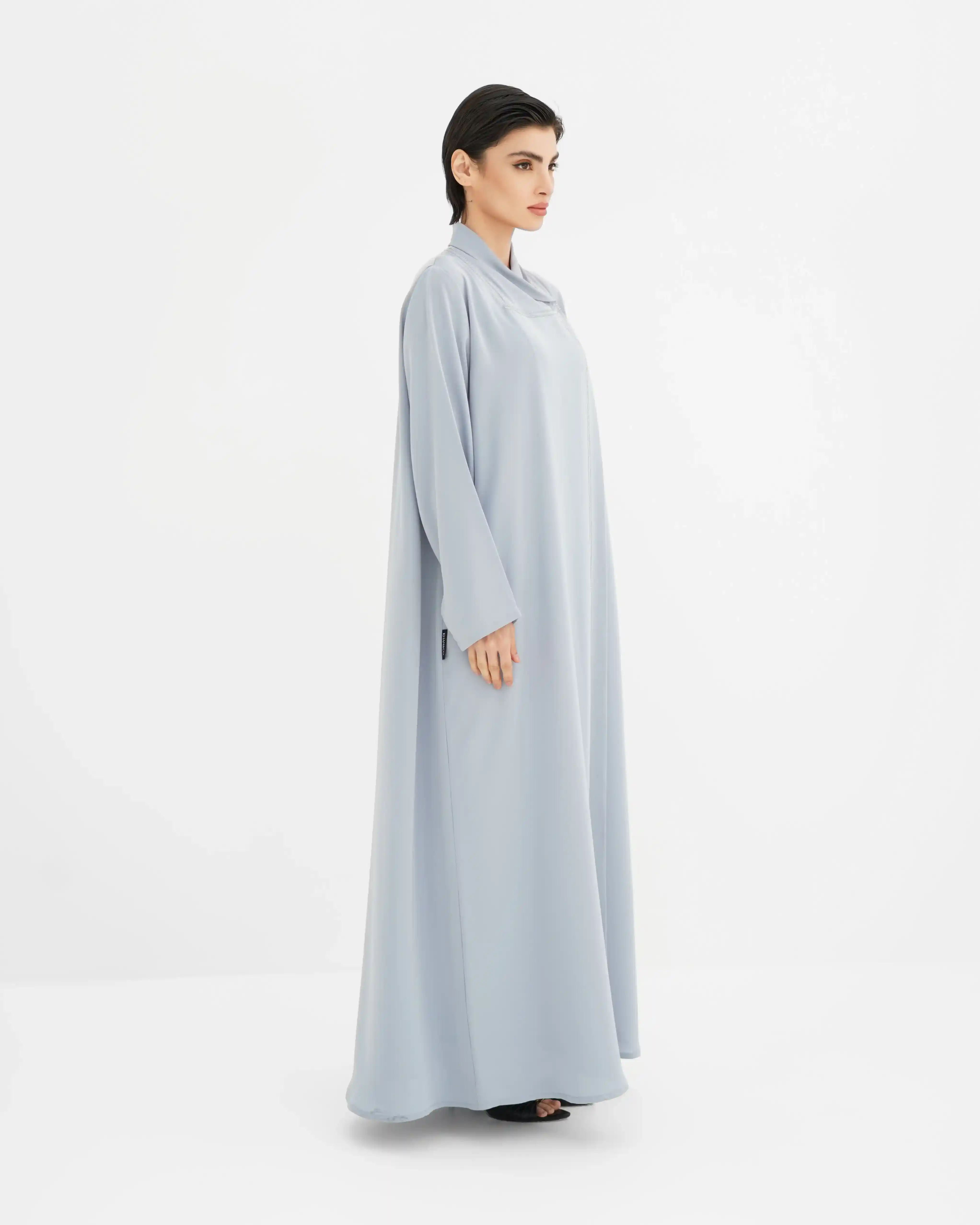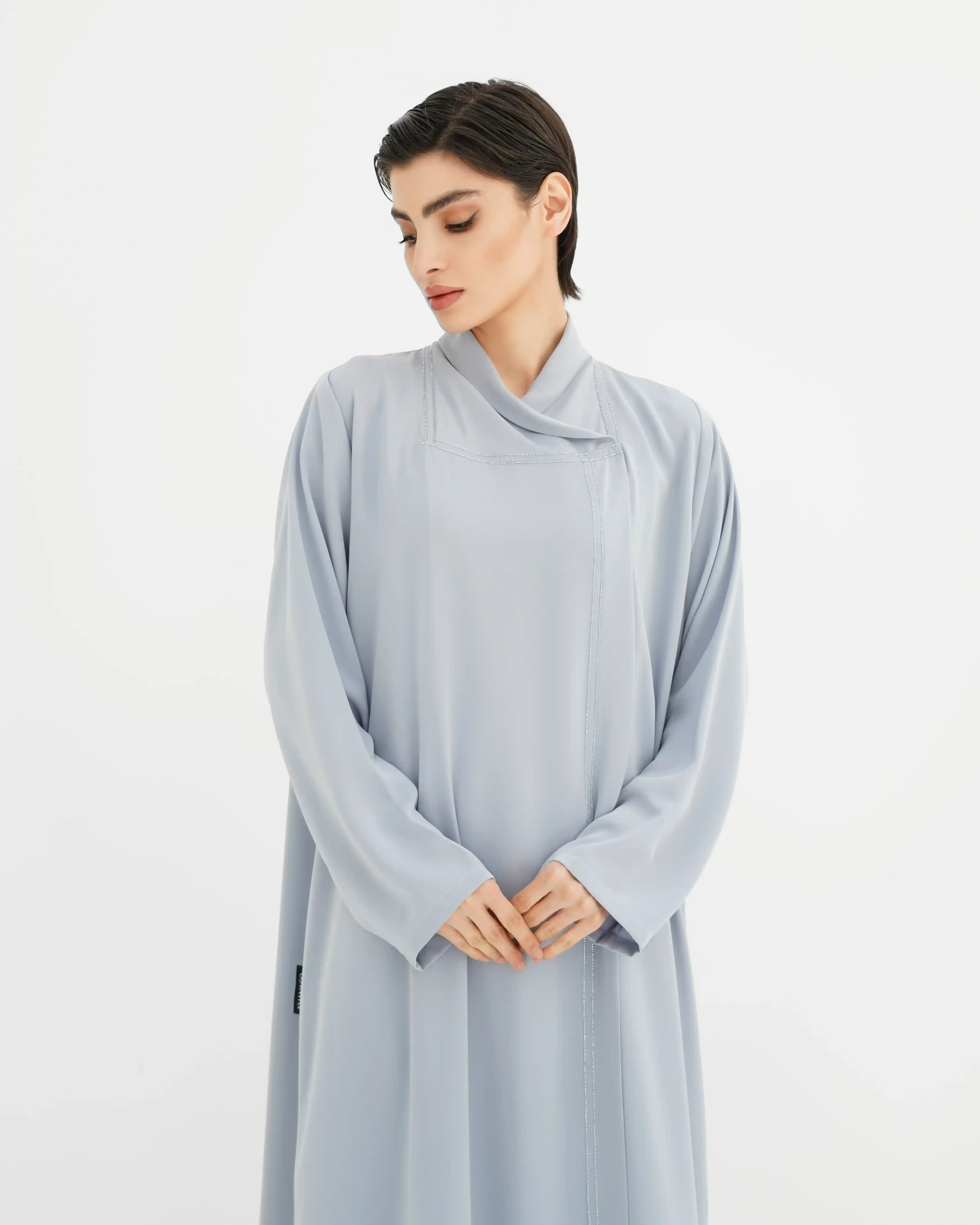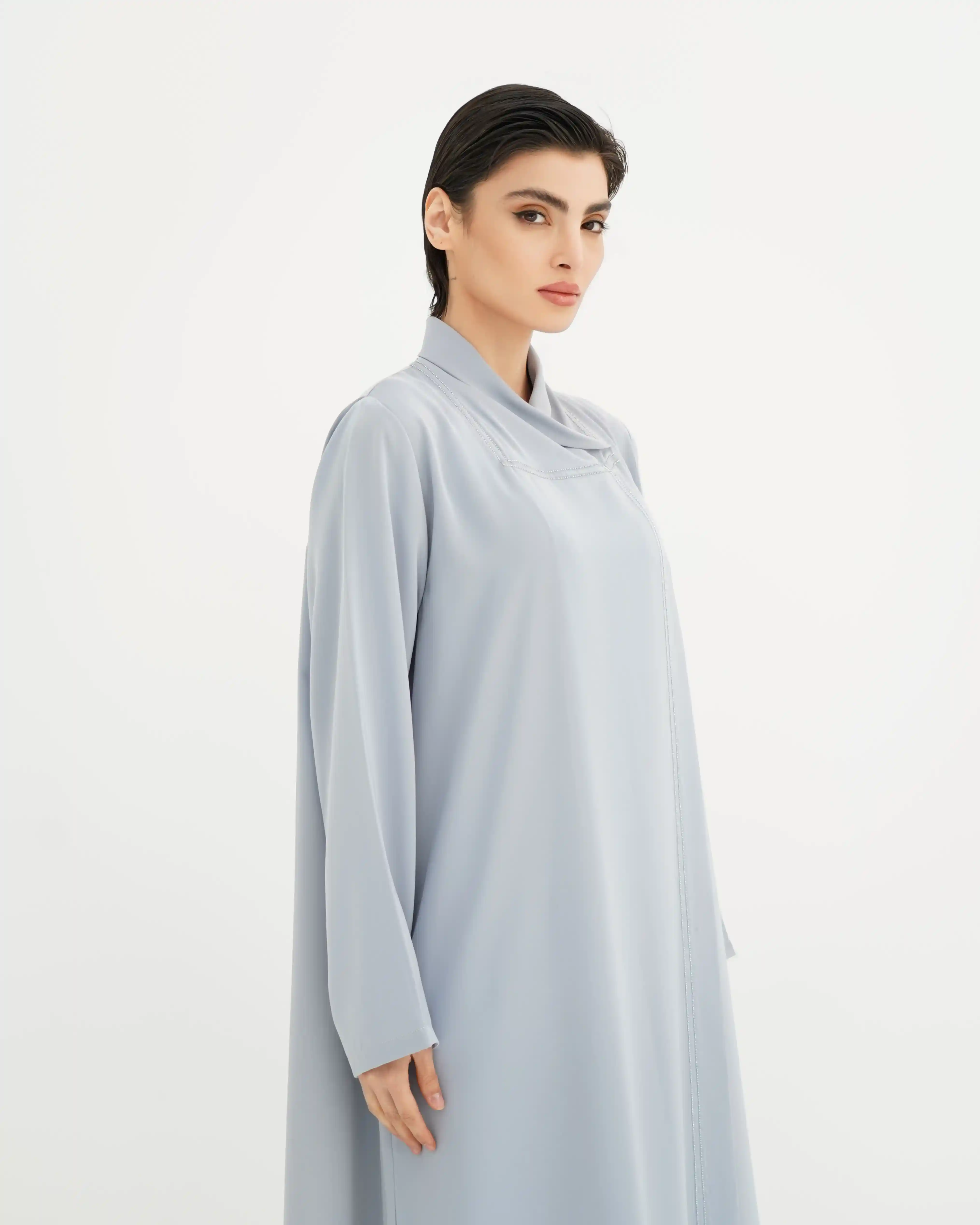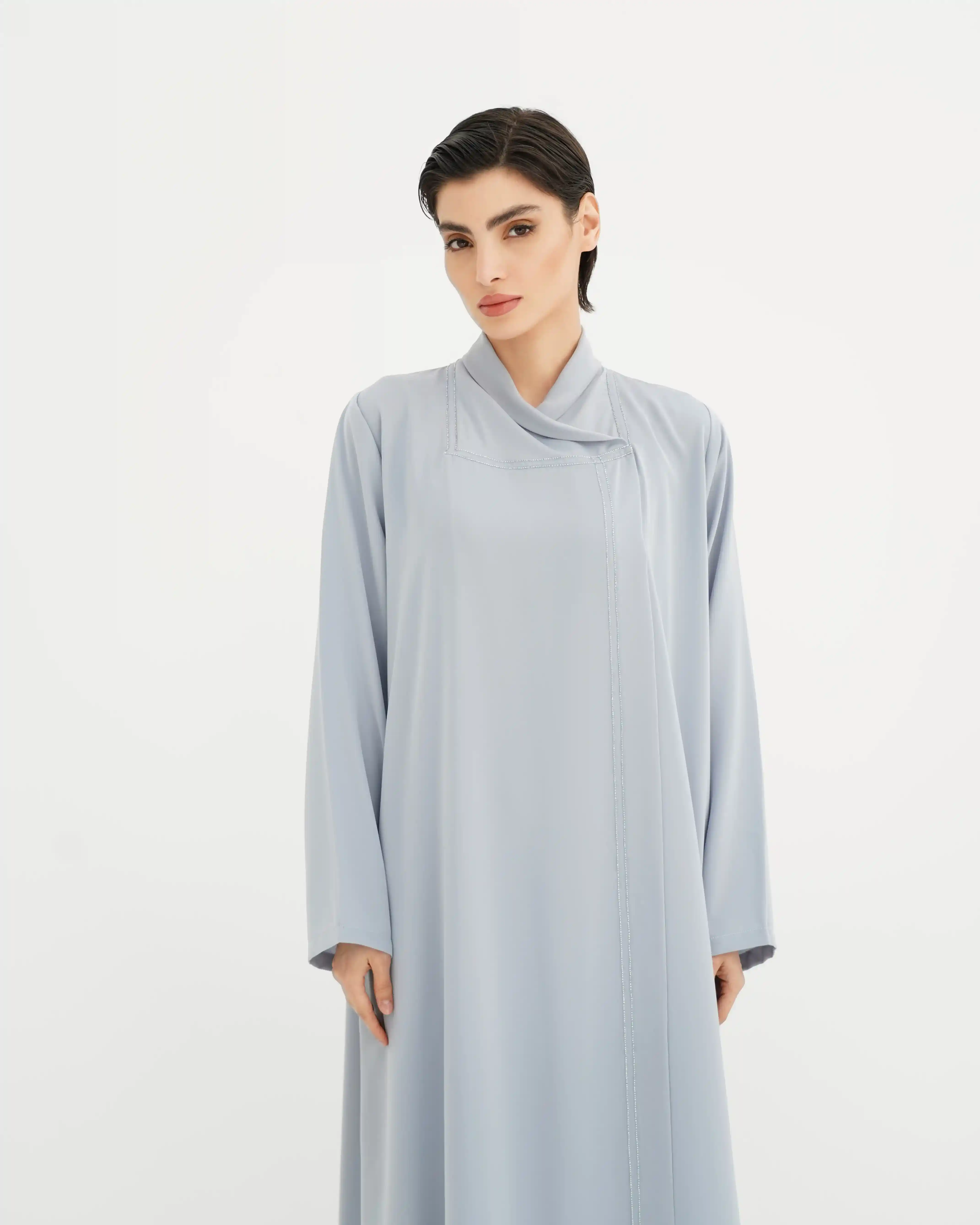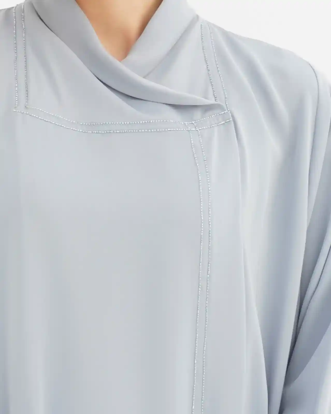 عباية بقصّة مستقيمة وانسيابية ناعمة، مصنوعة من قماش البريميوم كريب بملمس ناعم وحركة طبيعية. تتميّز بياقة هاي نيك متقاطعة تنسدل بخفة حول الرقبة، مع خطوط دقيقة من الخرز اللامع تمتد من خلف شريط الرقبة حتى ذيل العباية. الأكمام بتصميم نظيف دون خرز، والطرحة من نفس القماش، مع خرز رفيع على الأطراف, بتناغم هادئ يعكس أسلوب .KHAN&CO المعماري المختزل.