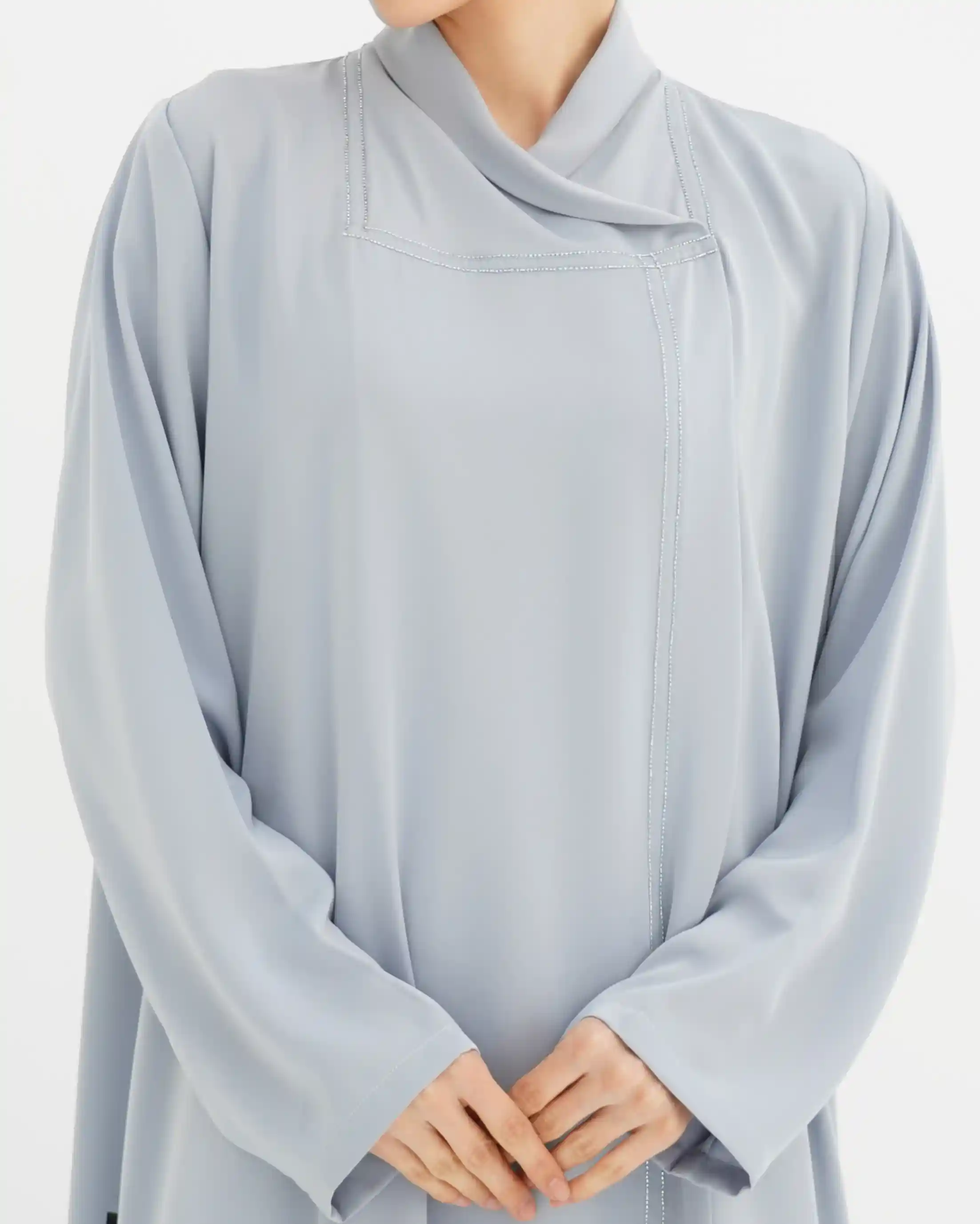 • خطوط دقيقة من الخرز اللامع تمتد من خلف شريط الرقبة حتى أسفل العباية.