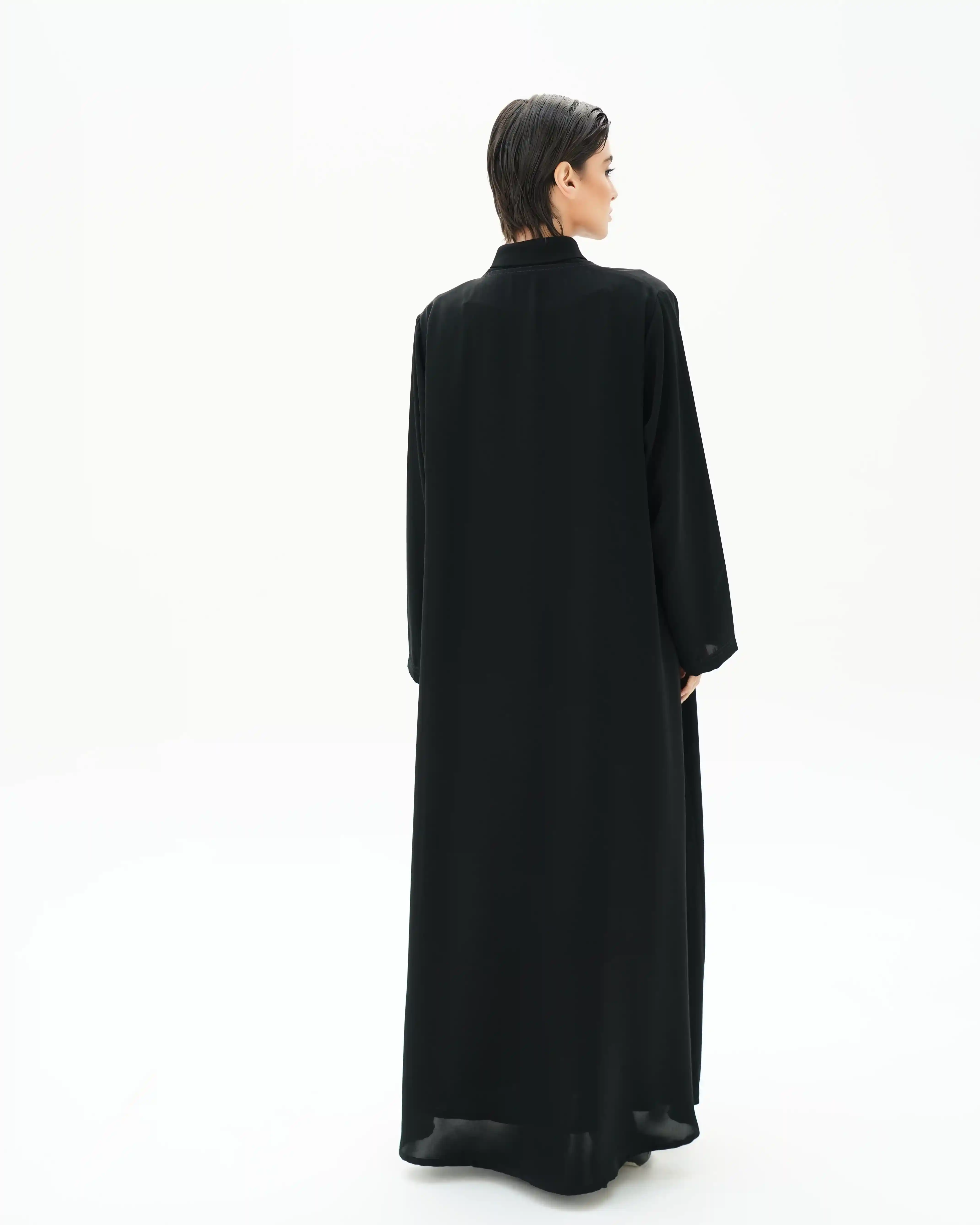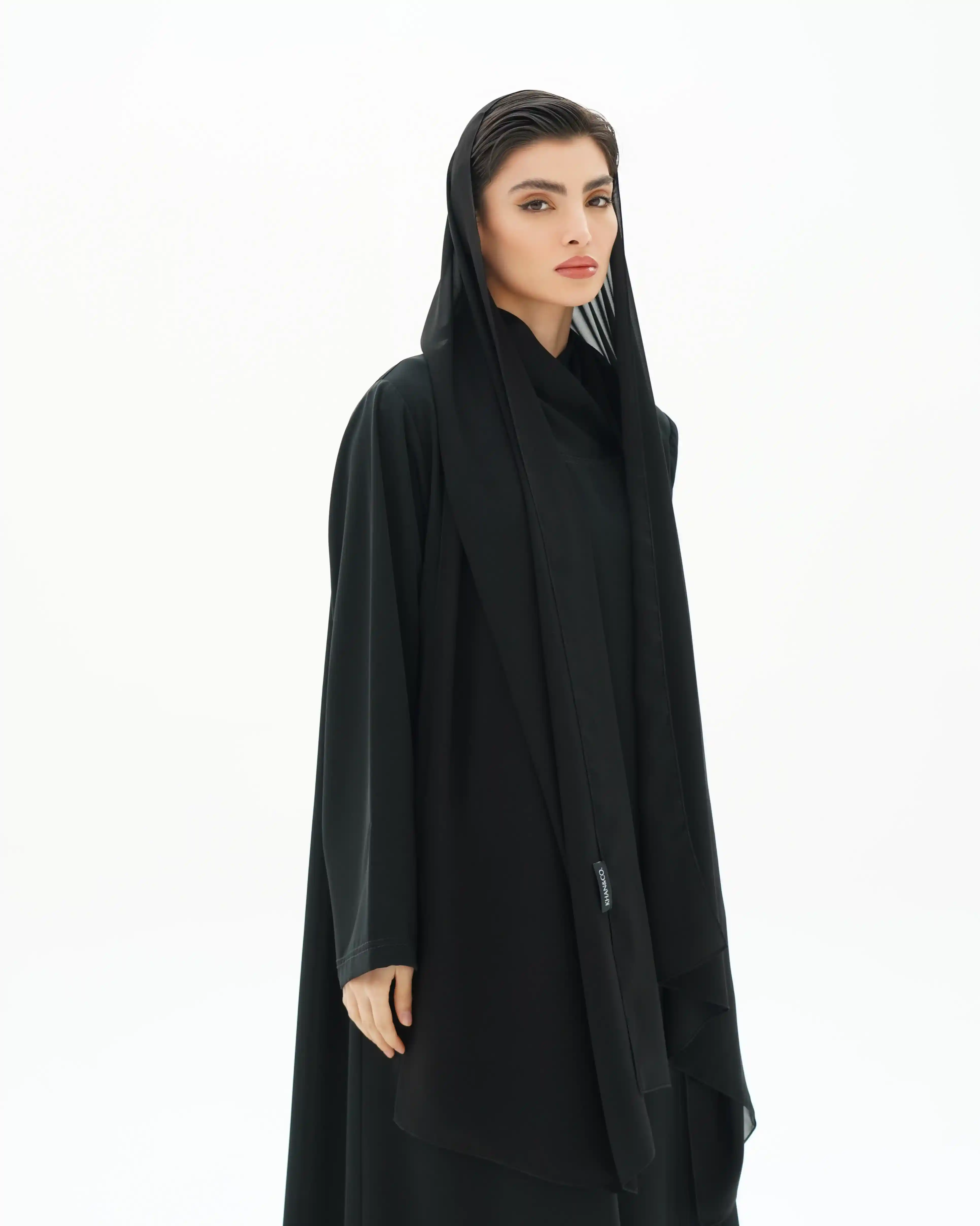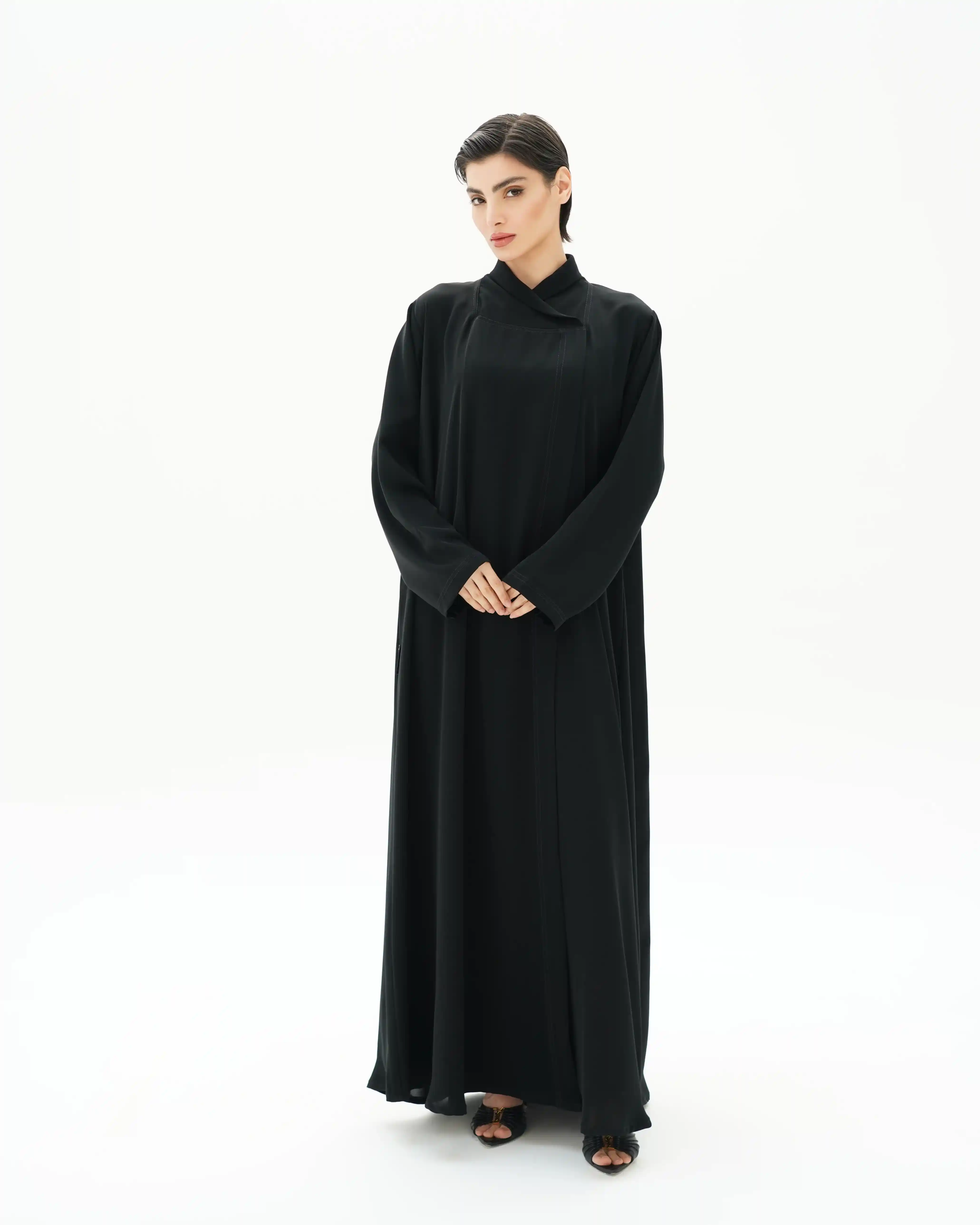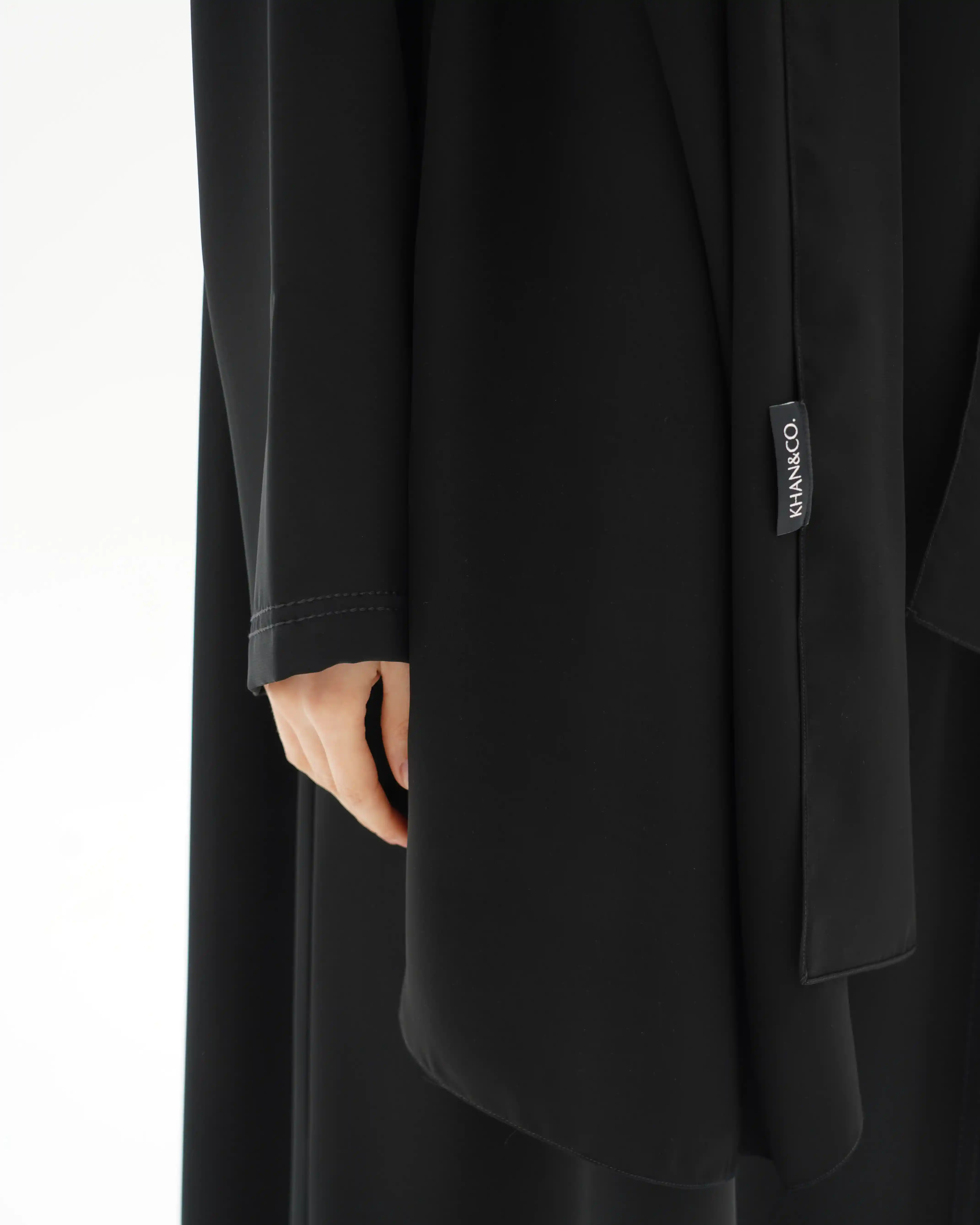 عباية بقصّة مستقيمة وانسيابية ناعمة، مصنوعة من قماش البريميوم كريب بملمس ناعم وحركة طبيعية. تتميّز بياقة هاي نيك متقاطعة تنسدل بخفة حول الرقبة، الأكمام بتصميم نظيف دون خرز، والطرحة من نفس القماش، بتناغم هادئ يعكس أسلوب .KHAN&CO المعماري المختزل.