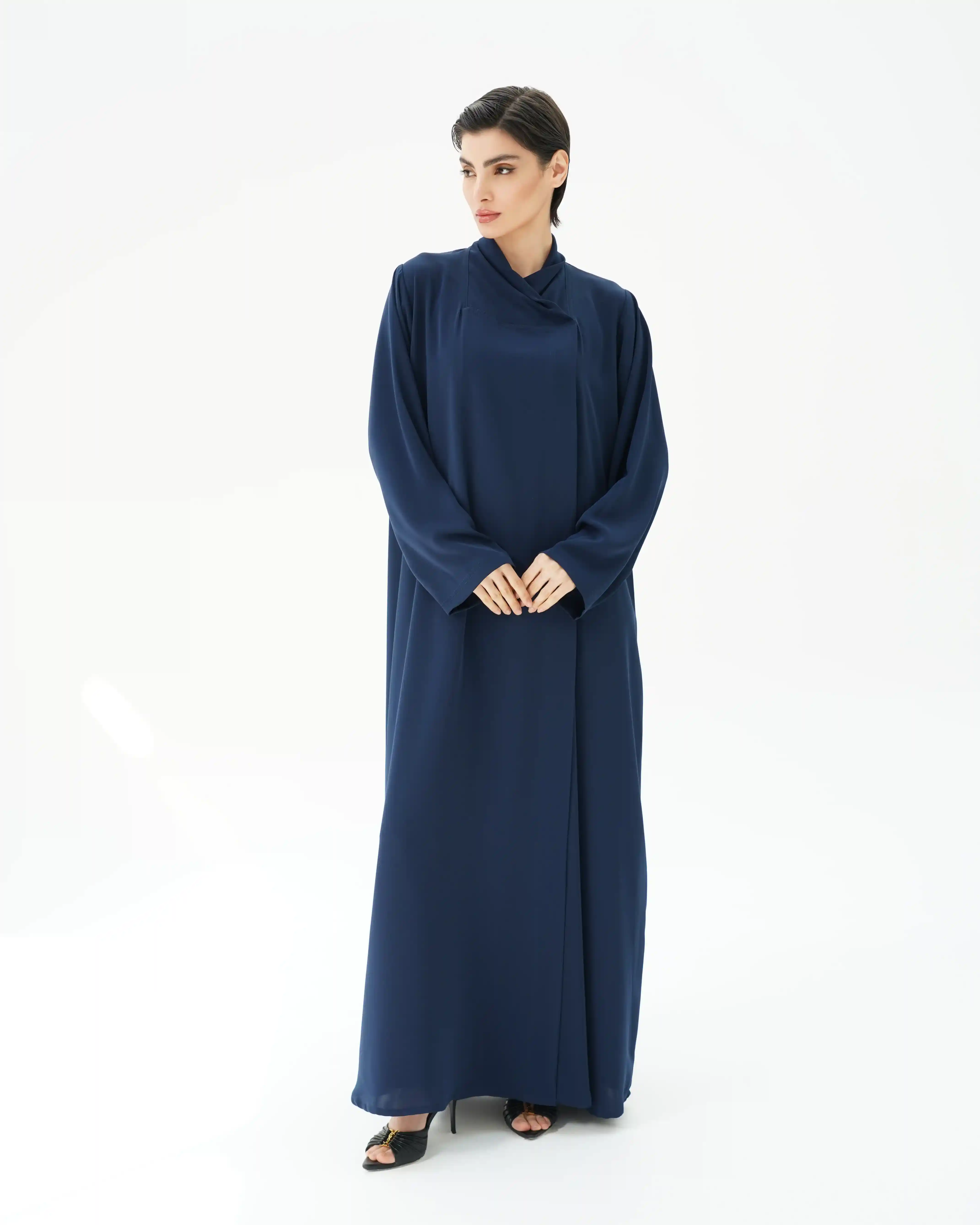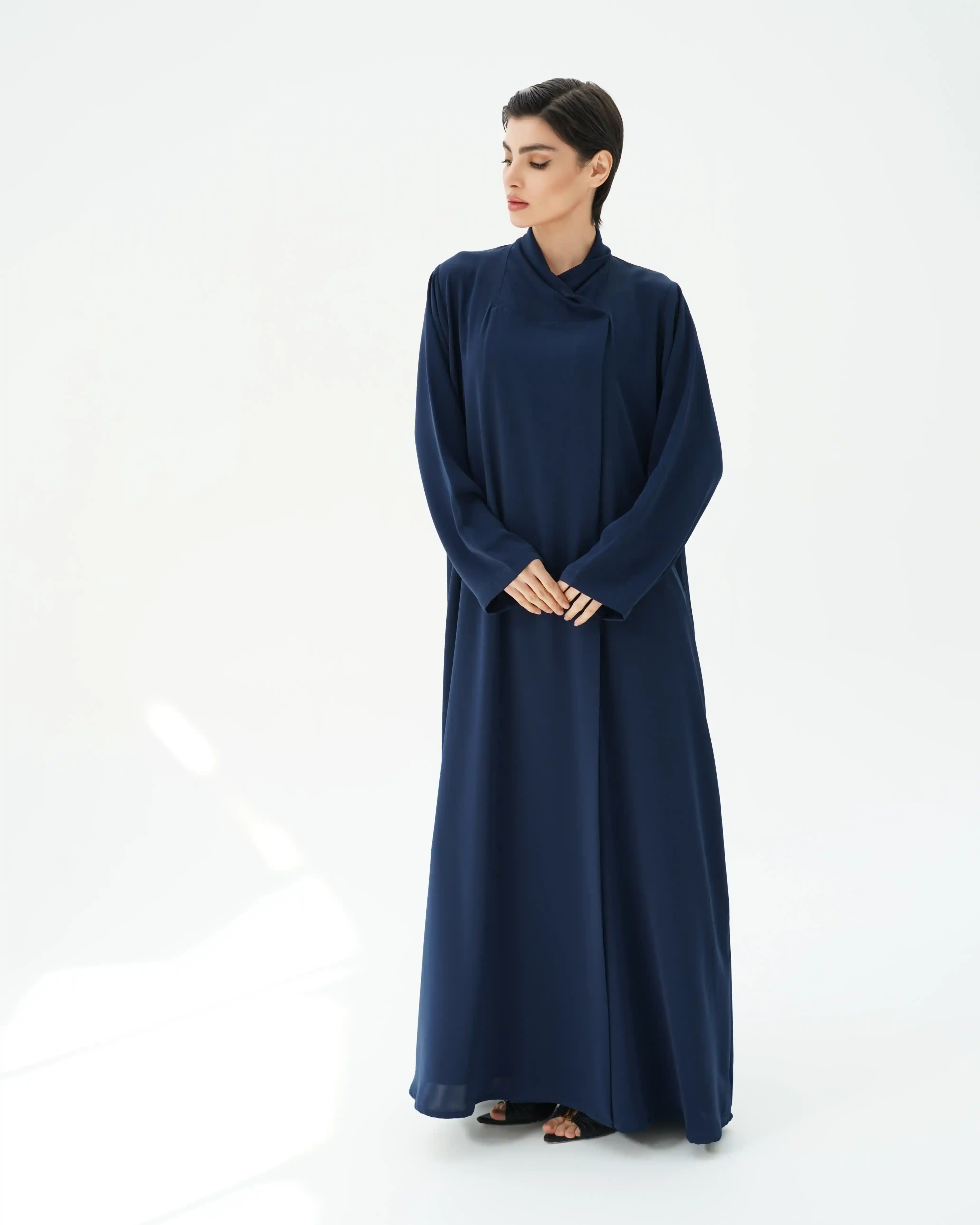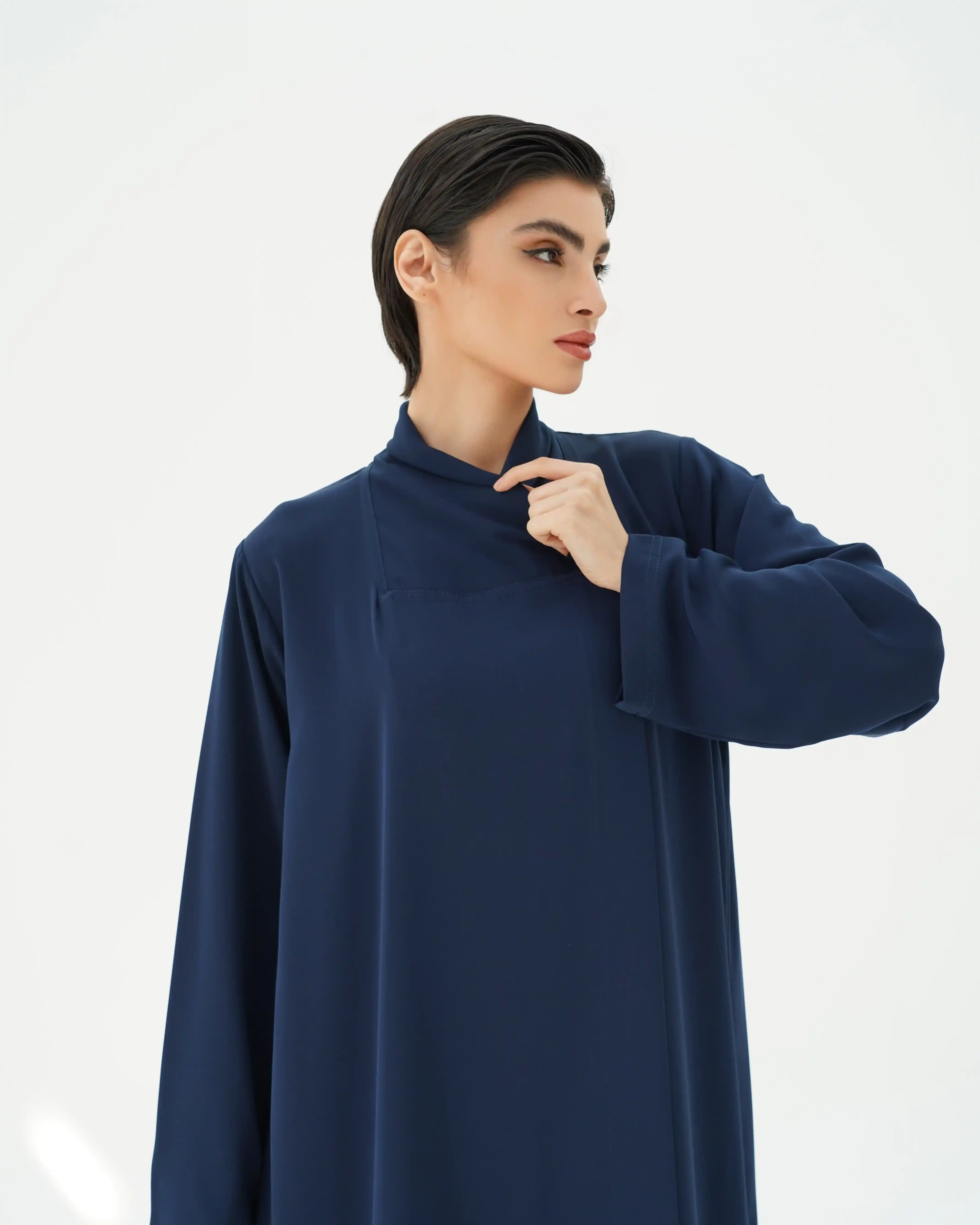 عباية بقصّة مستقيمة وانسيابية ناعمة، مصنوعة من قماش البريميوم كريب بملمس ناعم وحركة طبيعية. تتميّز بياقة هاي نيك متقاطعة تنسدل بخفة حول الرقبة، الأكمام بتصميم نظيف دون خرز، والطرحة من نفس القماش، بتناغم هادئ يعكس أسلوب .KHAN&CO المعماري المختزل.